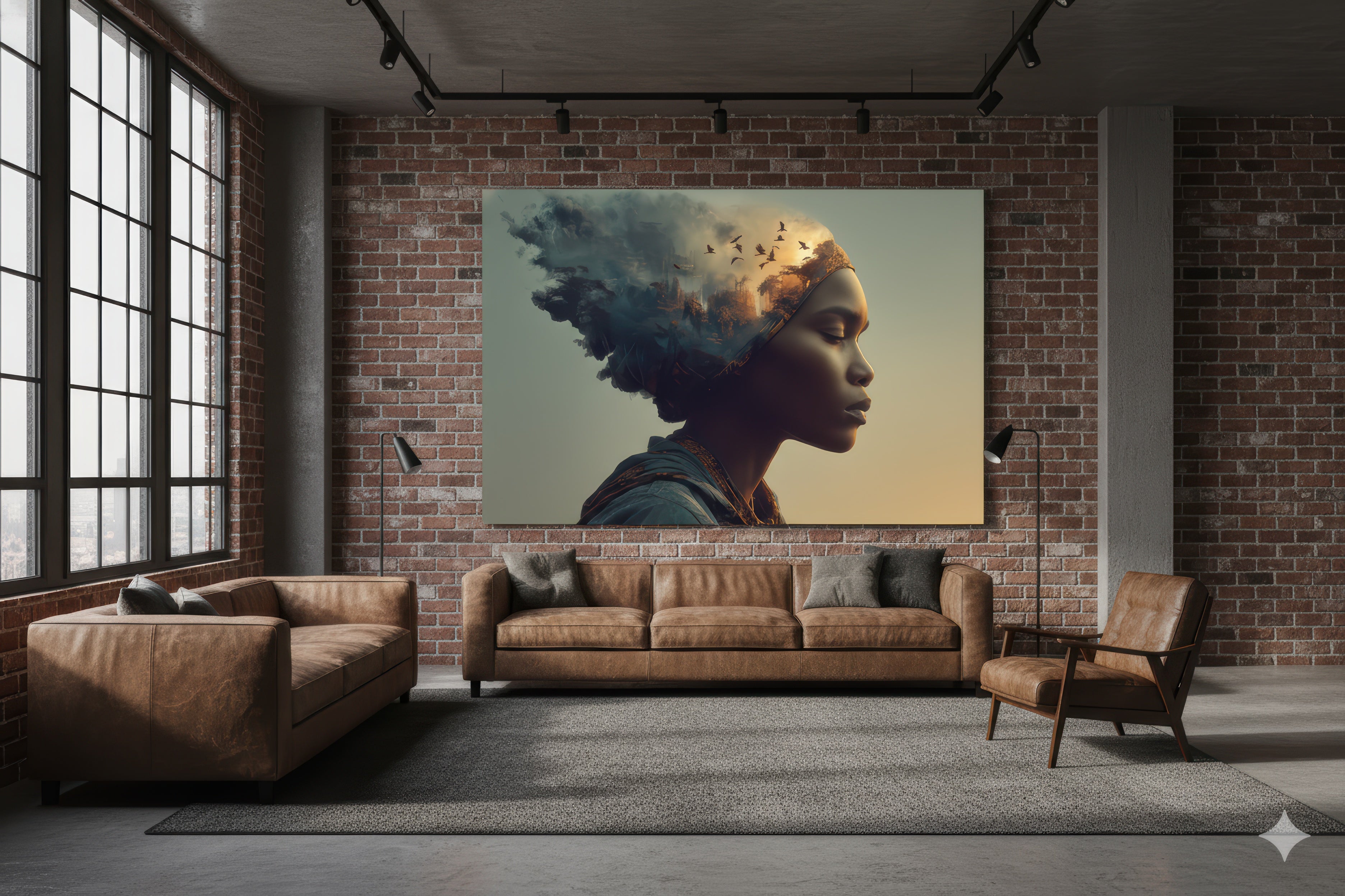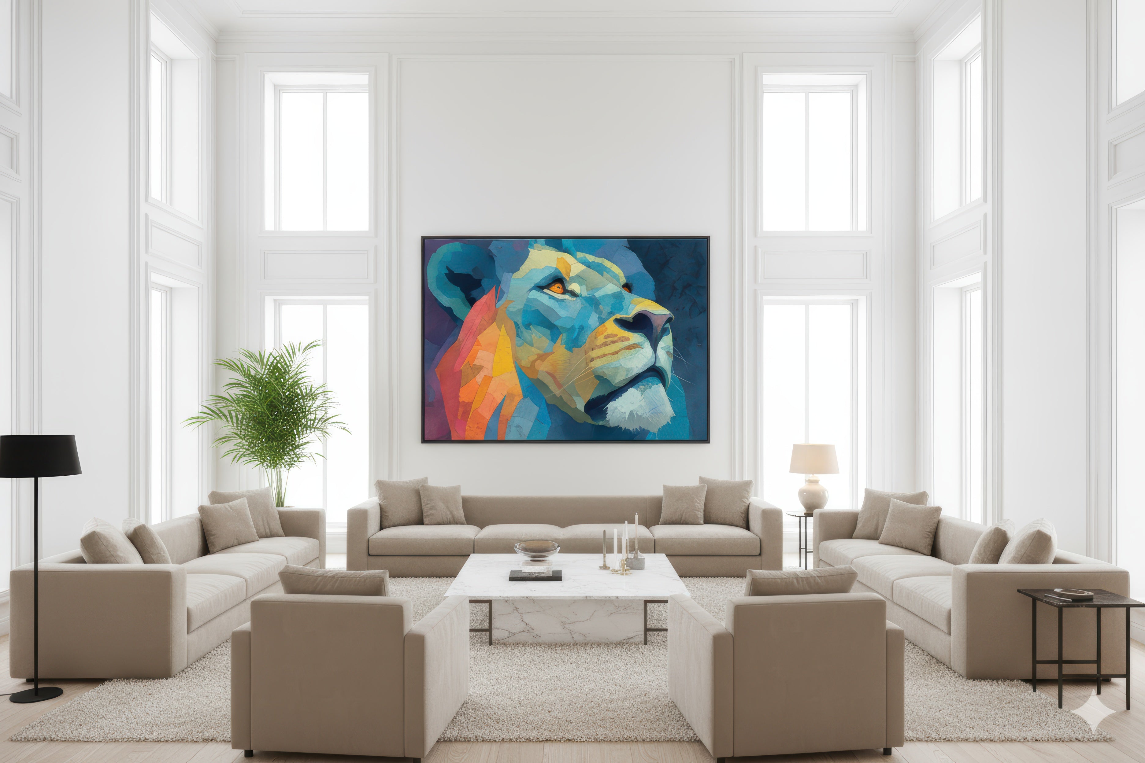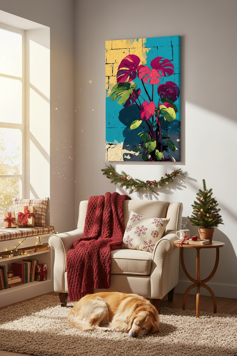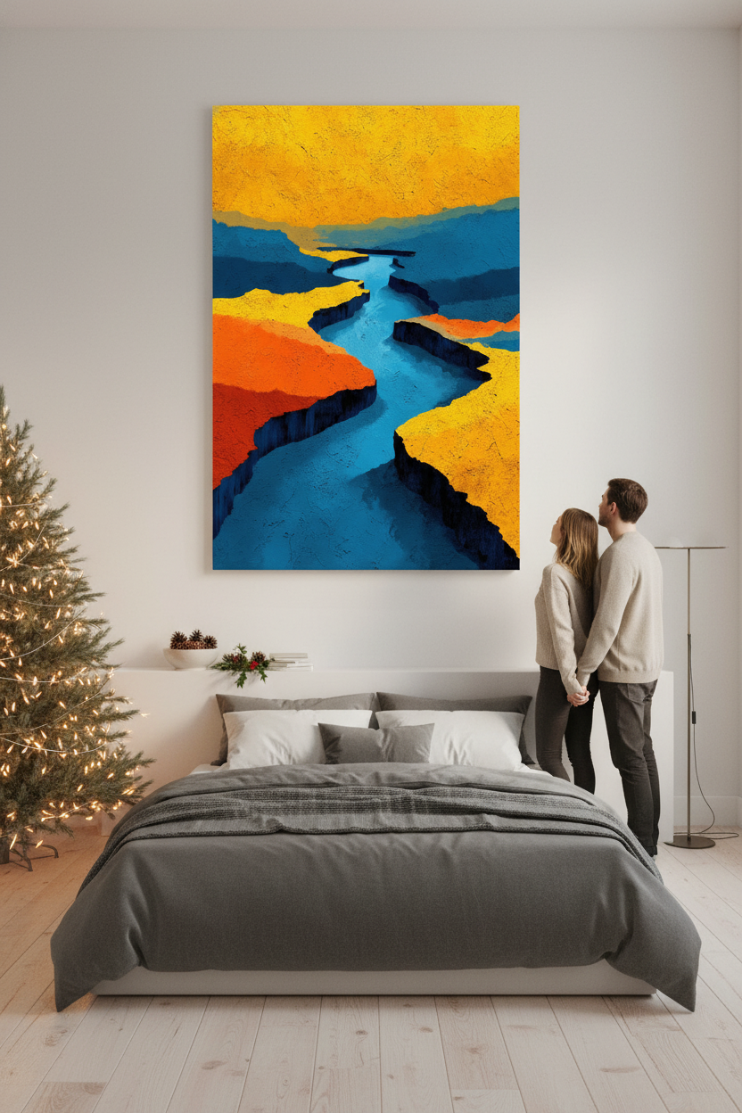The commanding presence of River Pulse meets the luminous vibrancy of Neon Monstera Reverie, creating a visual harmony that feels both grounded and ethereal. These artworks bring texture, color and poetic energy to any living space, inviting contemplation and effortless elegance.
