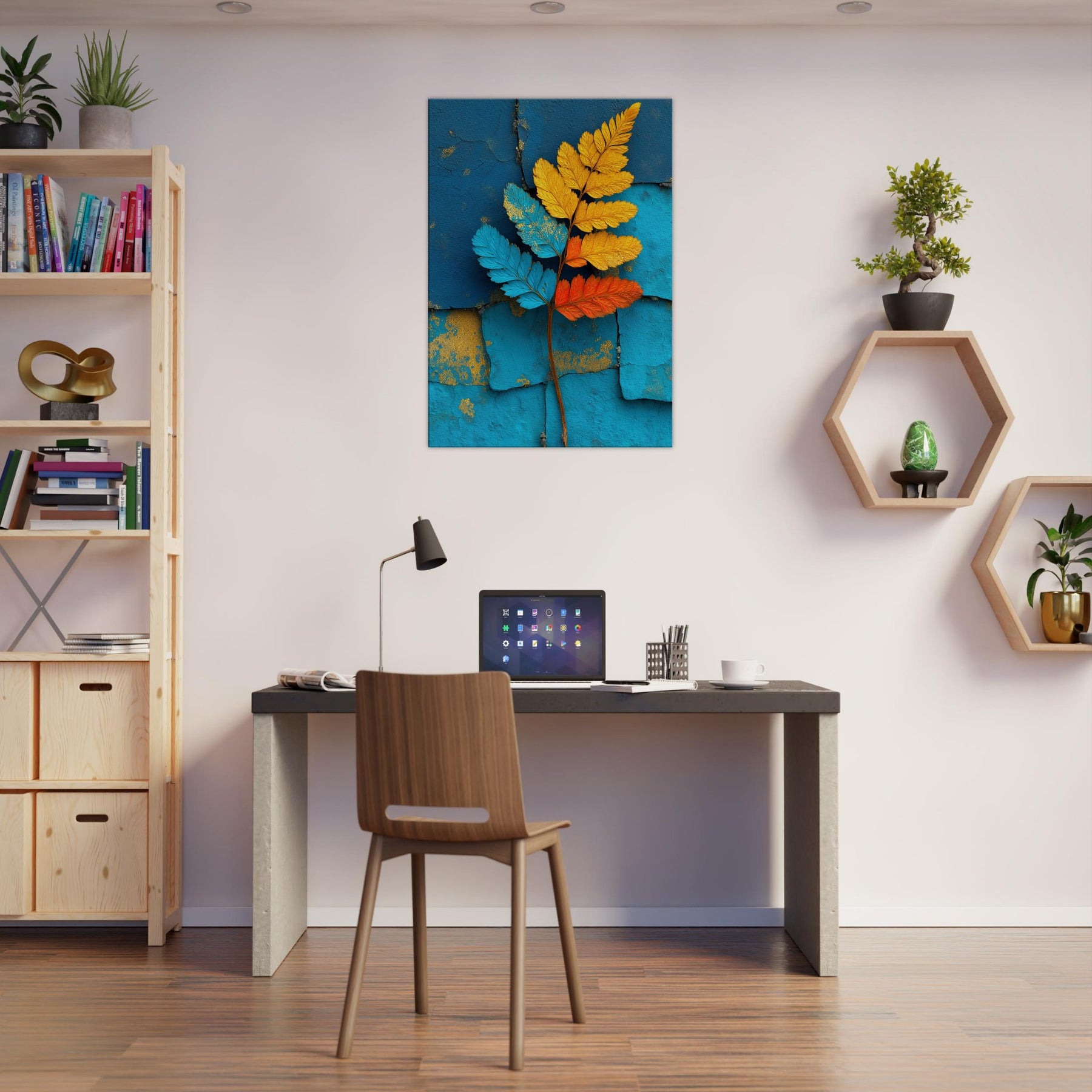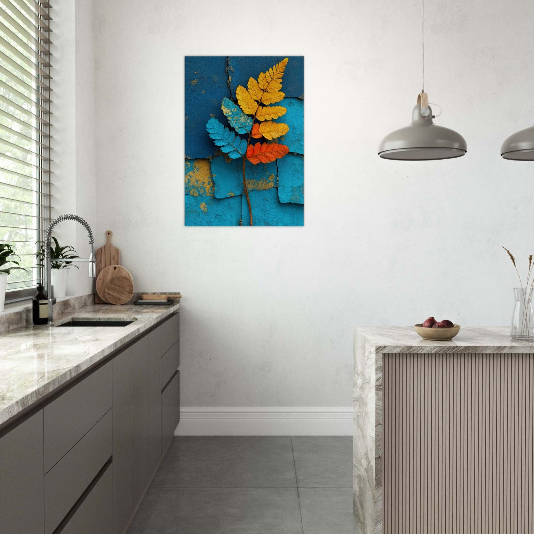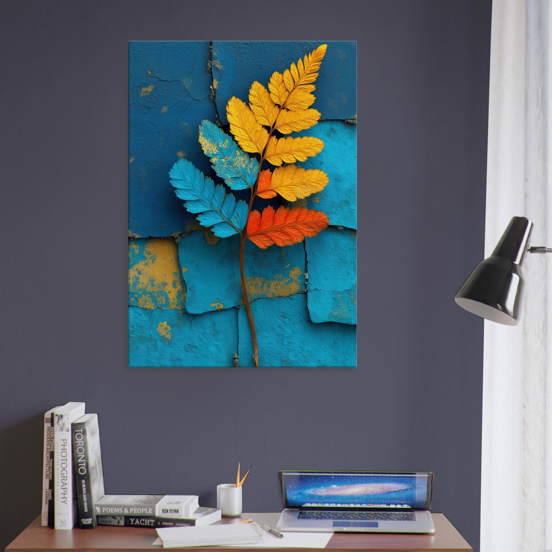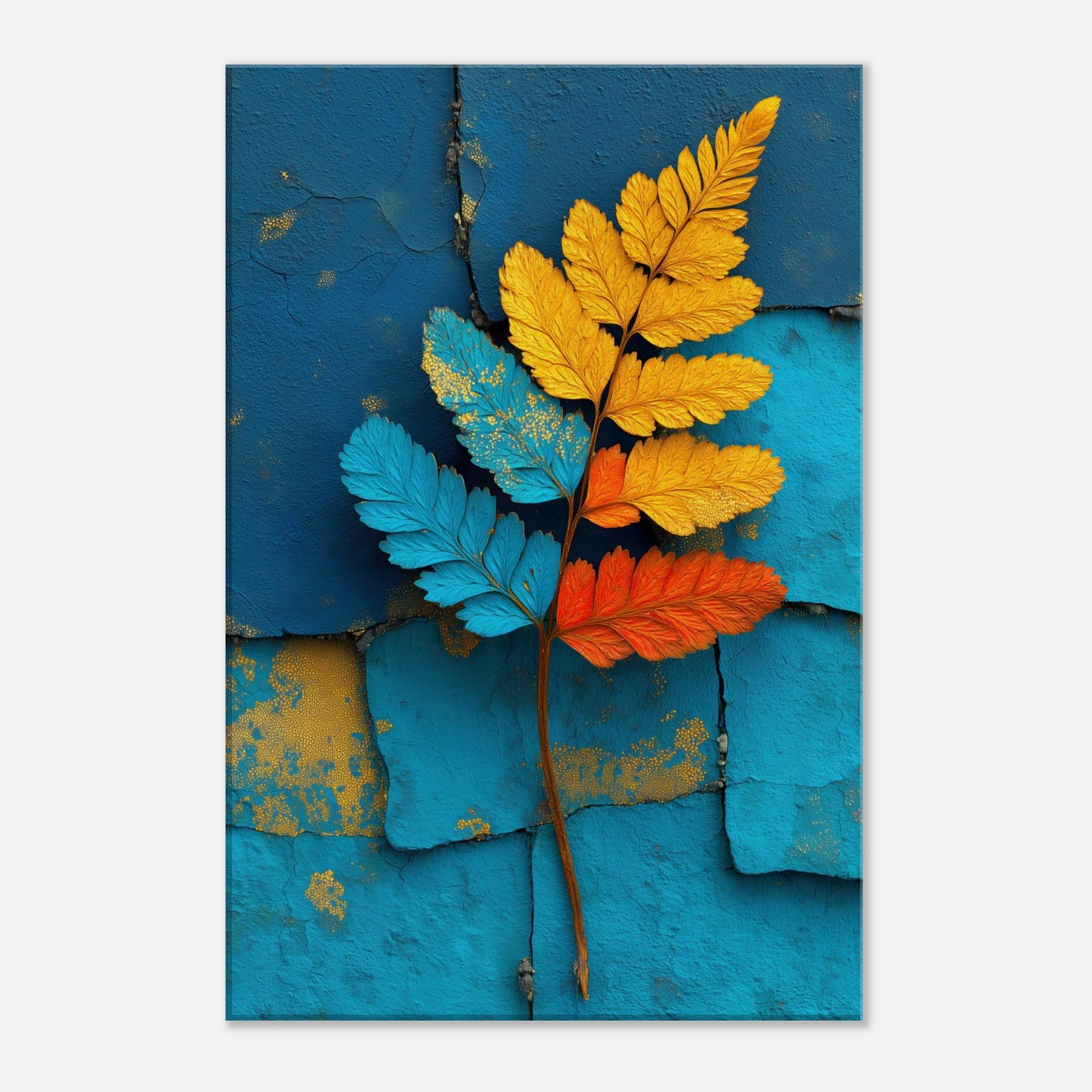 Let the fern unfold across your wall in a breath of color and quiet motion. This abstract study of nature pairs electric blues, sunlit yellows, and warm oranges against a textured turquoise backdrop, inviting daylight to wander and soften every edge. The piece exudes a contemporary stillness that soothes bustling rooms, creating a focal point that feels both organic and sculptural. Ideal for a living room or bedroom, it transforms a quiet corner into a living breeze of atmosphere, grace, and refreshed perspective.