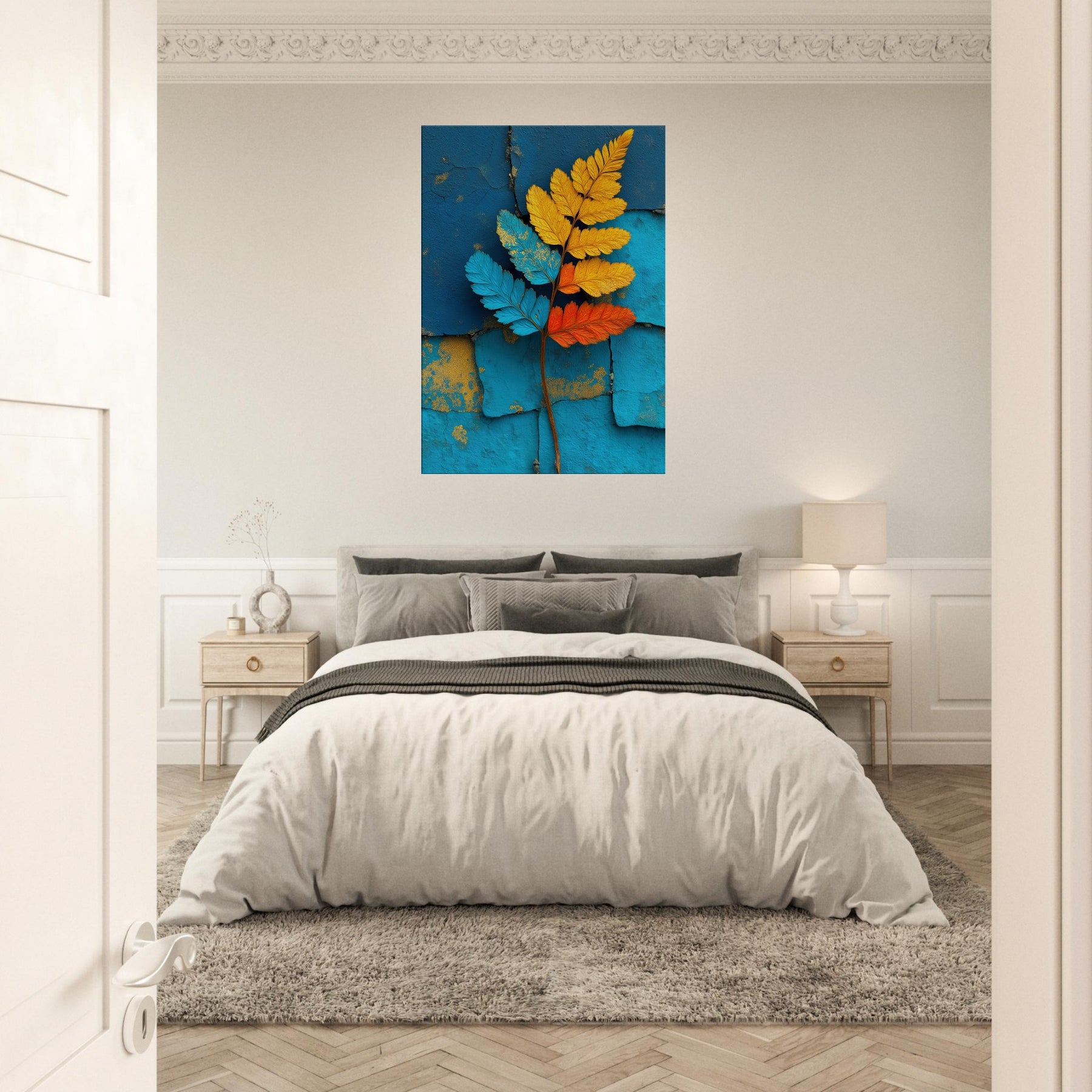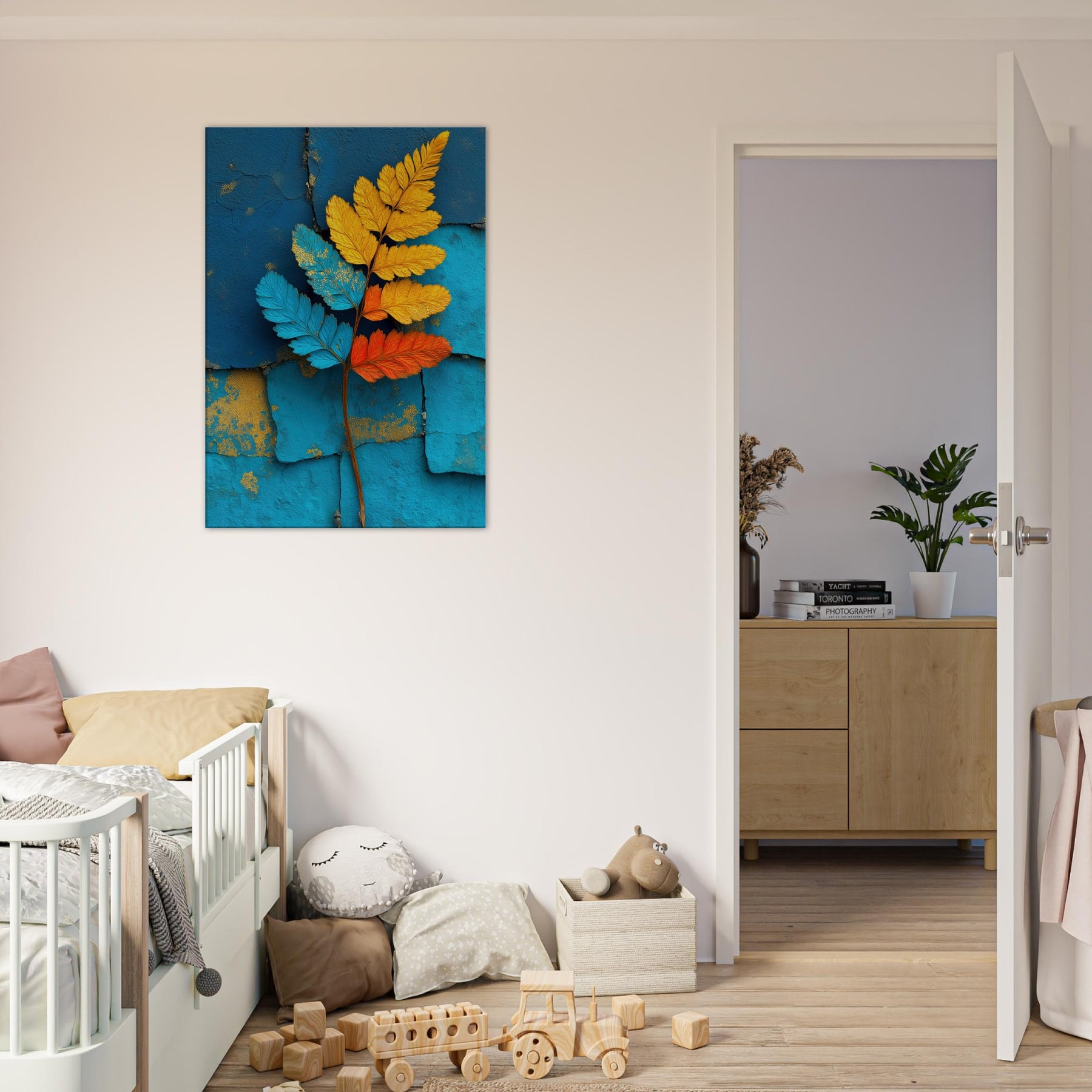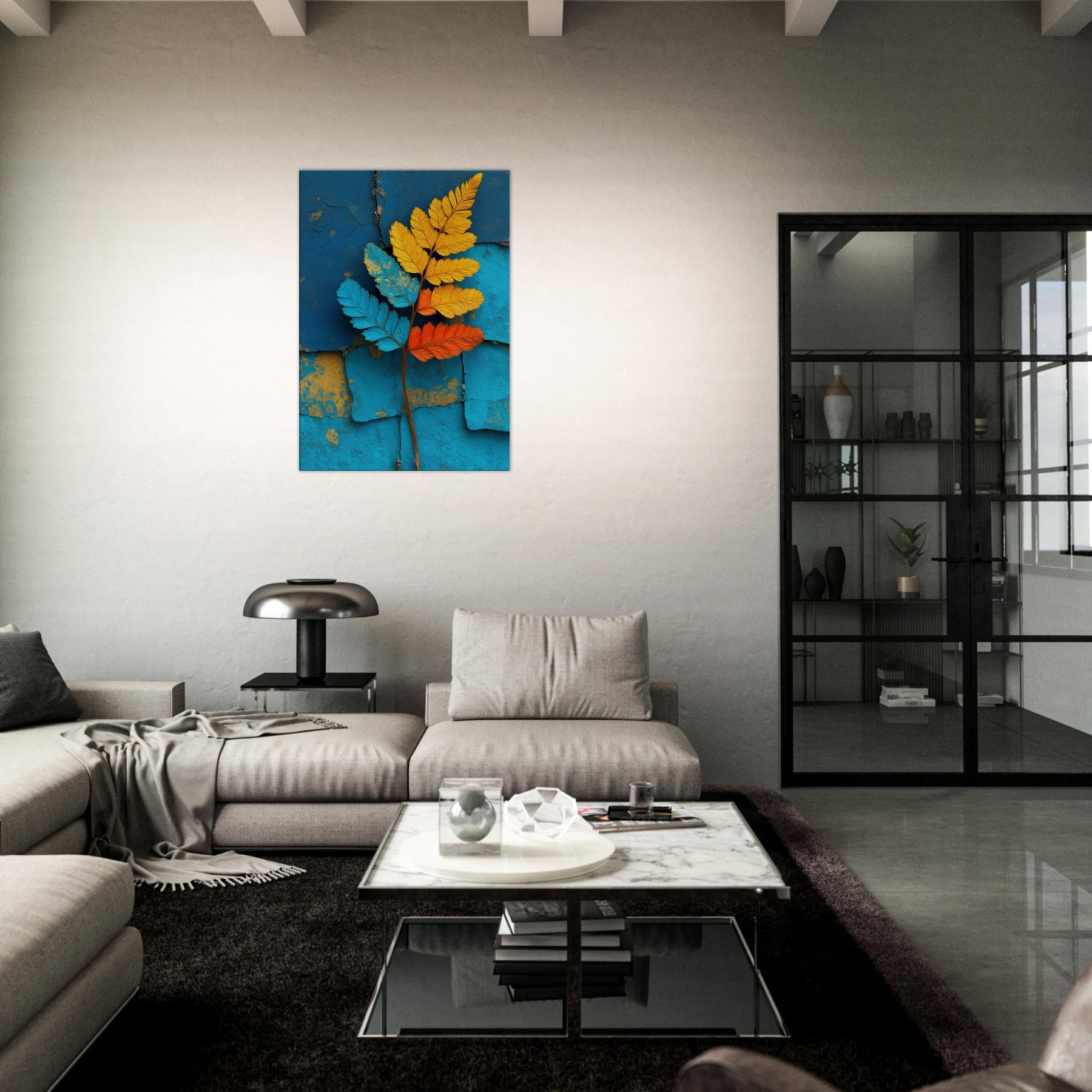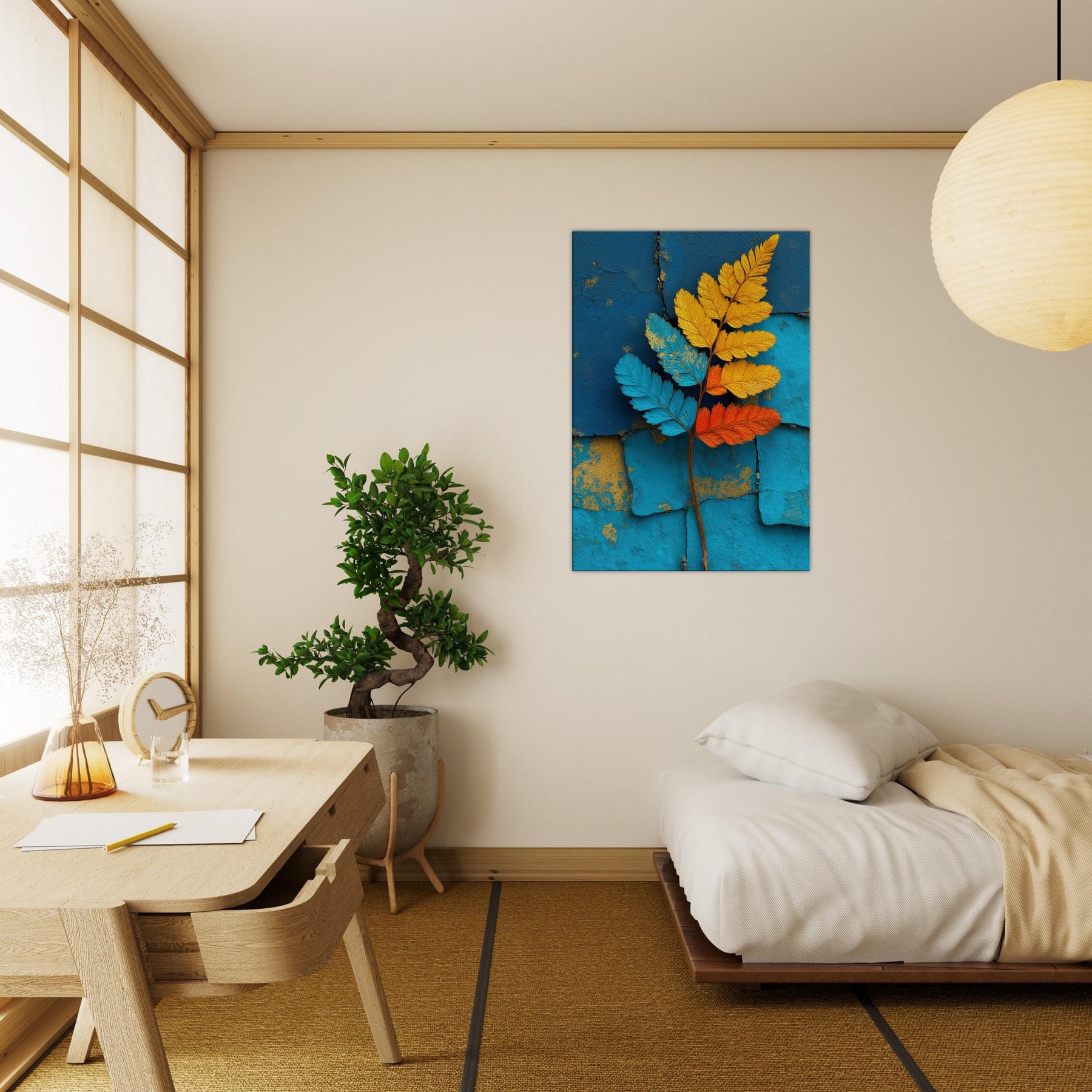 Let the fern unfold across your wall in a breath of color and quiet motion. This abstract study of nature pairs electric blues, sunlit yellows, and warm oranges against a textured turquoise backdrop, inviting daylight to wander and soften every edge. The piece exudes a contemporary stillness that soothes bustling rooms, creating a focal point that feels both organic and sculptural. Ideal for a living room or bedroom, it transforms a quiet corner into a living breeze of atmosphere, grace, and refreshed perspective.