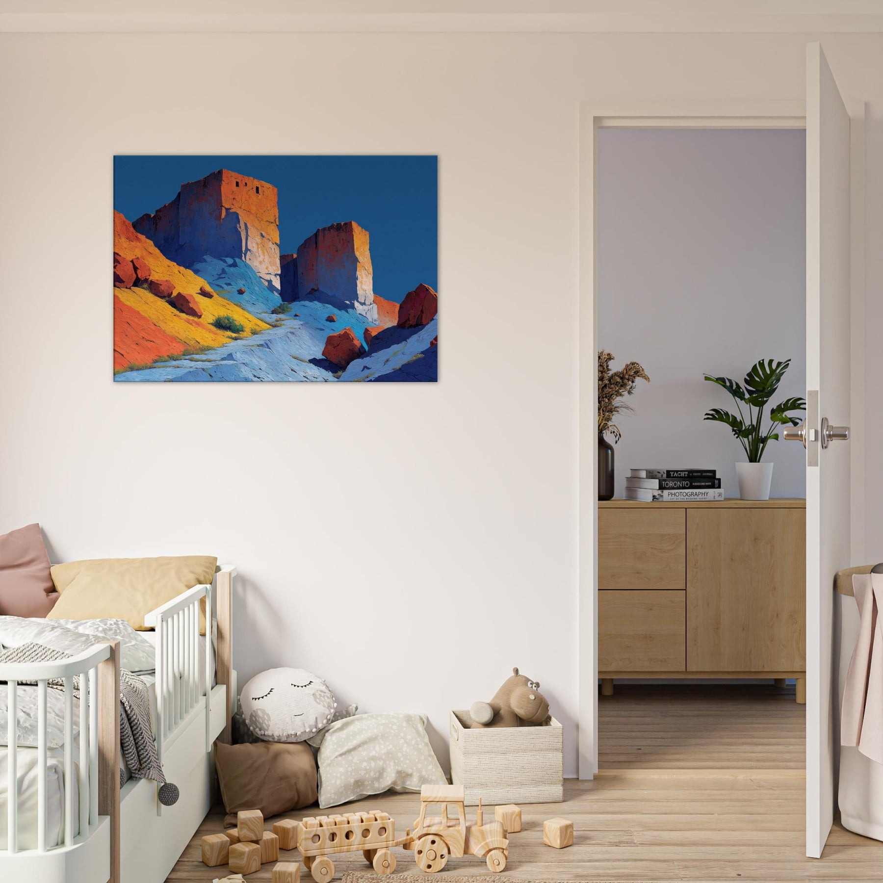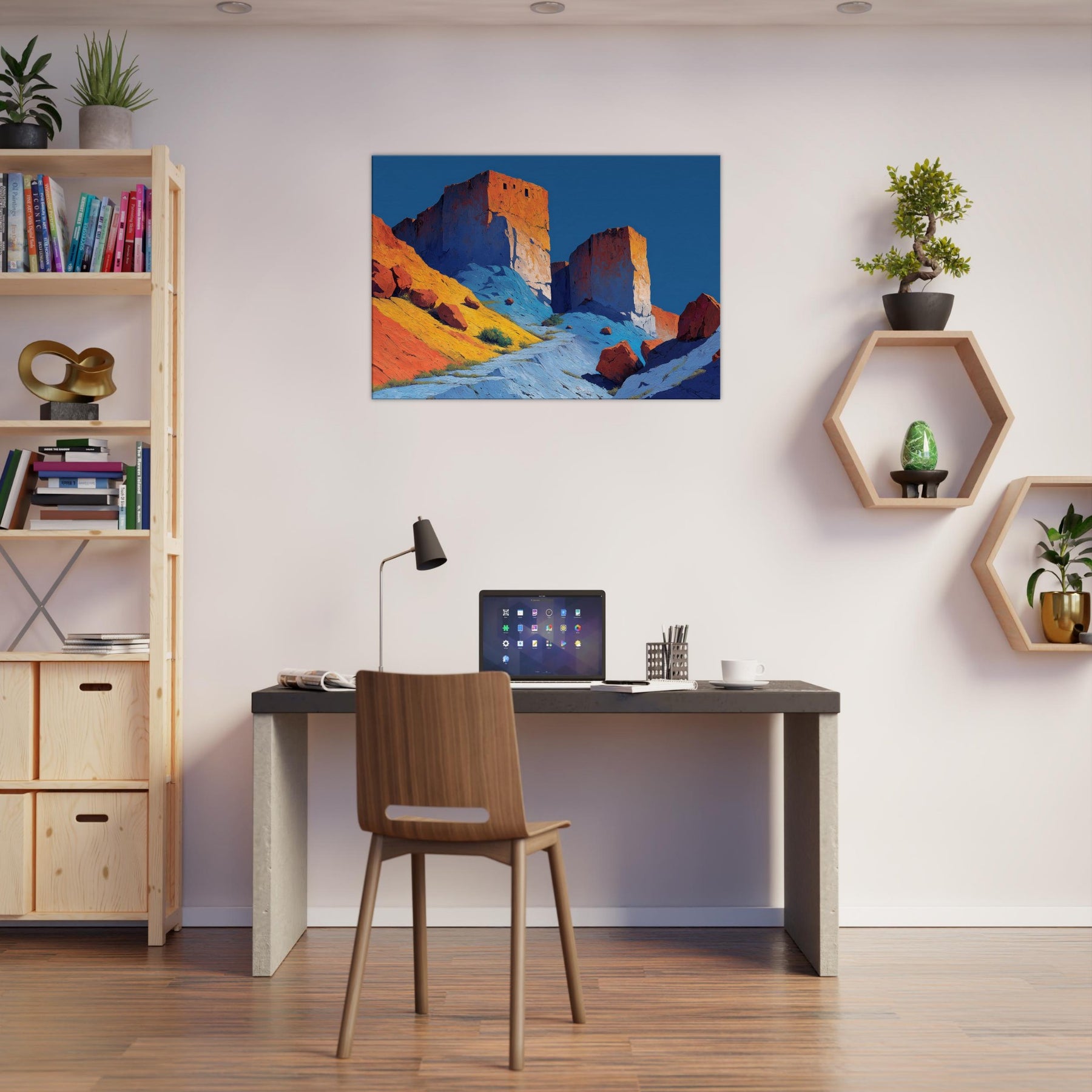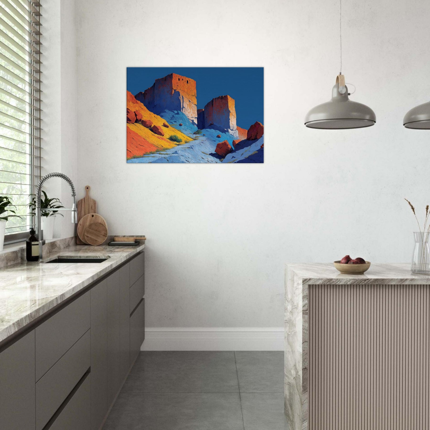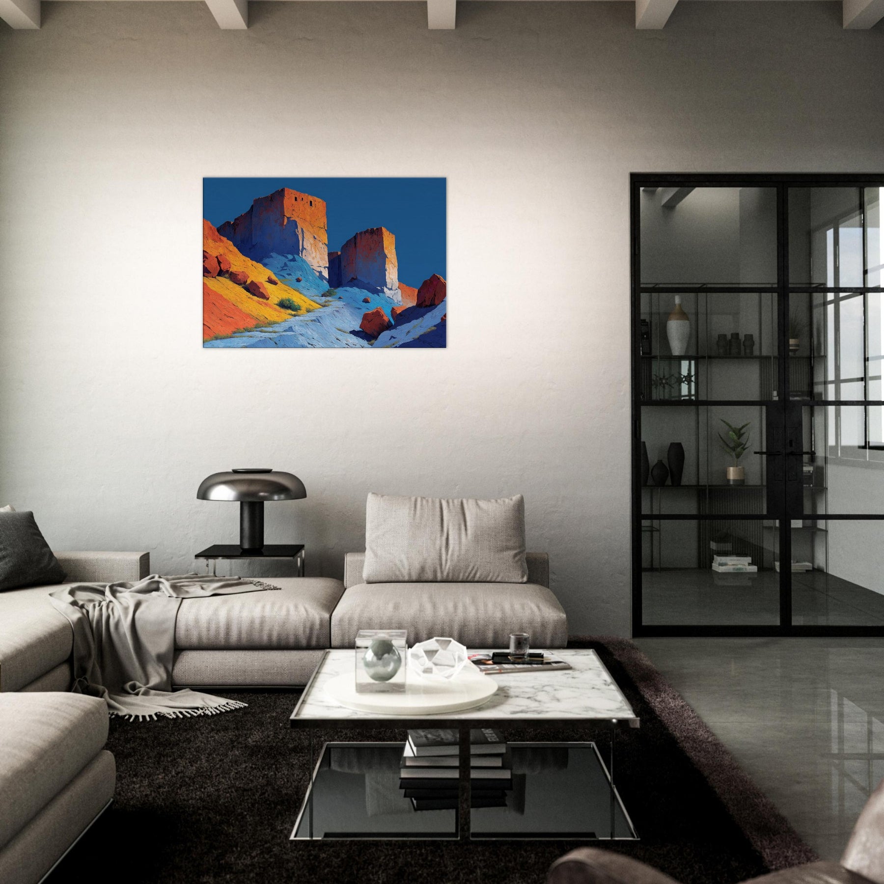 Cliffs rise in a riot of color, a kinetic shoreline captured in quiet, breathless light. This abstract invites the room to exhale cool blues easing into sunburnt oranges, granular textures that feel almost tangible. The composition channels endurance and awe, turning walls into a horizon you can walk toward. Perfect for a living space that longs for drama and calm in equal measure, it pairs with natural fibers and modern furniture, grounding bright accents while elevating everyday moments into quiet ceremony.