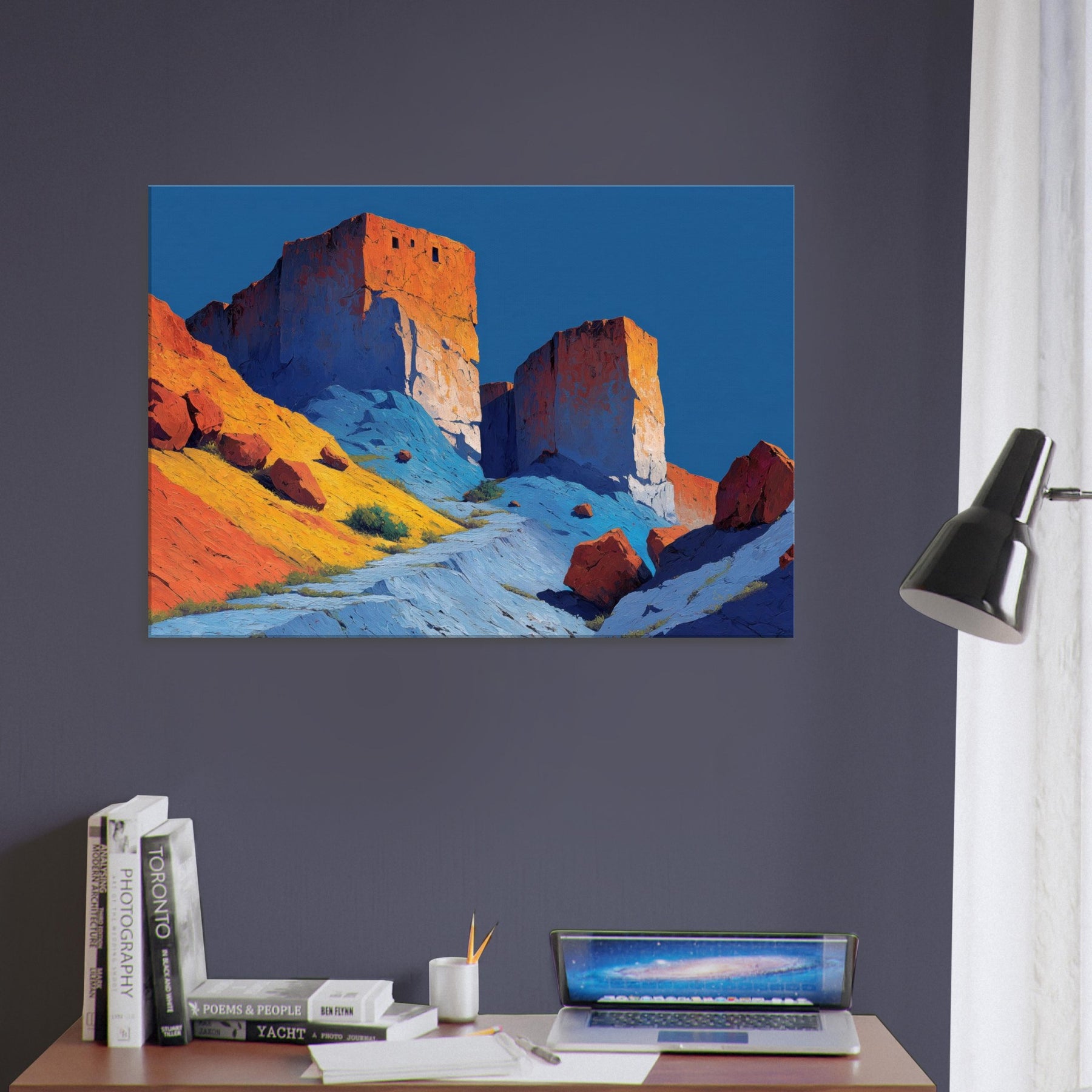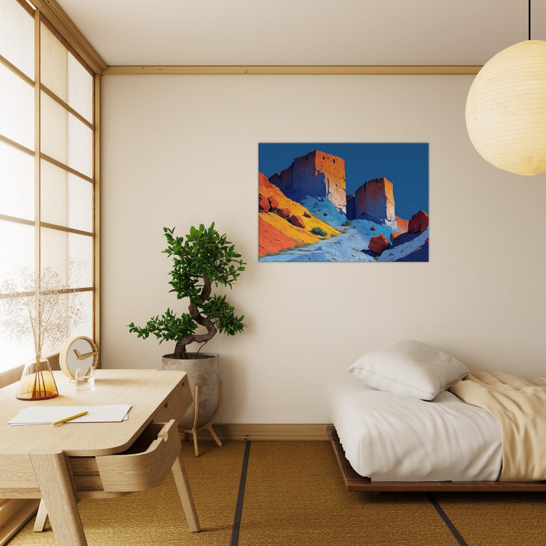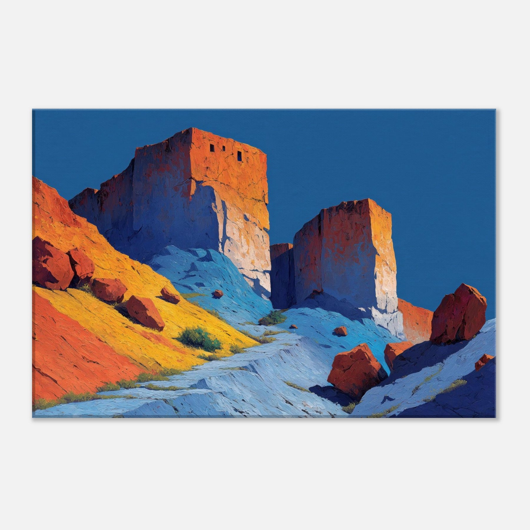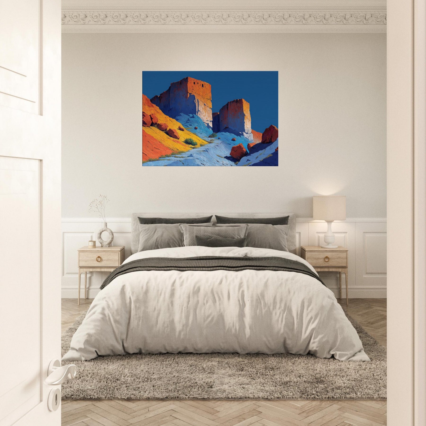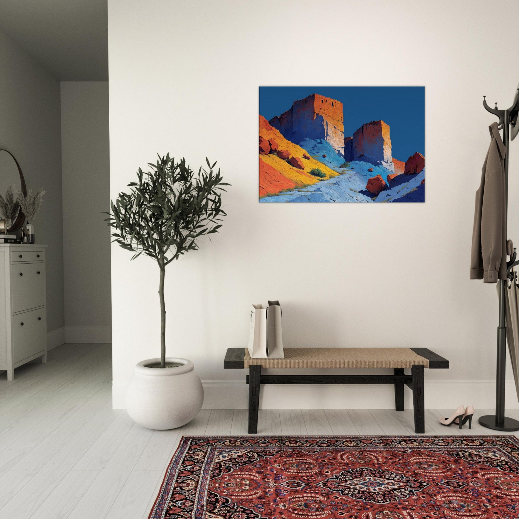 Cliffs rise in a riot of color, a kinetic shoreline captured in quiet, breathless light. This abstract invites the room to exhale cool blues easing into sunburnt oranges, granular textures that feel almost tangible. The composition channels endurance and awe, turning walls into a horizon you can walk toward. Perfect for a living space that longs for drama and calm in equal measure, it pairs with natural fibers and modern furniture, grounding bright accents while elevating everyday moments into quiet ceremony.