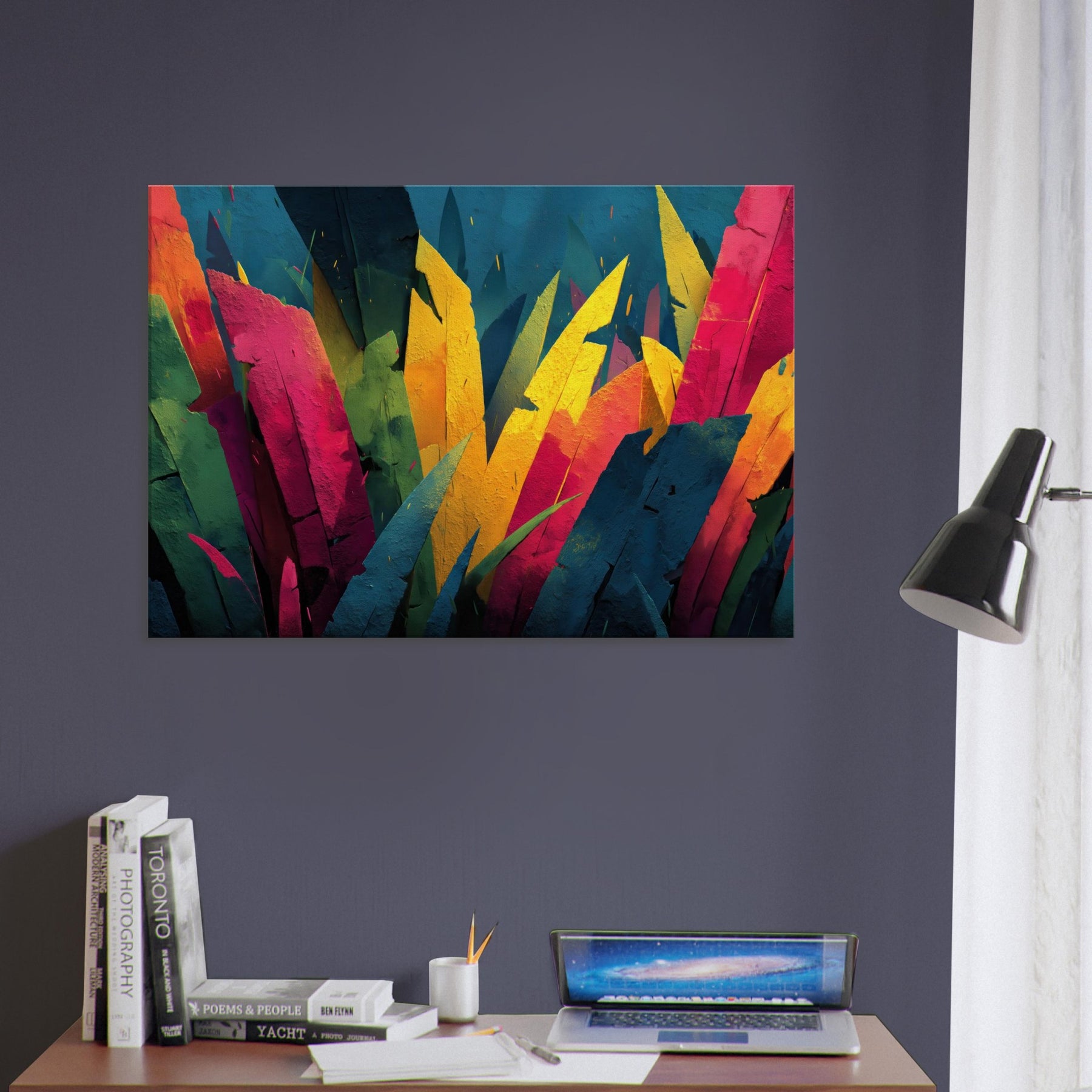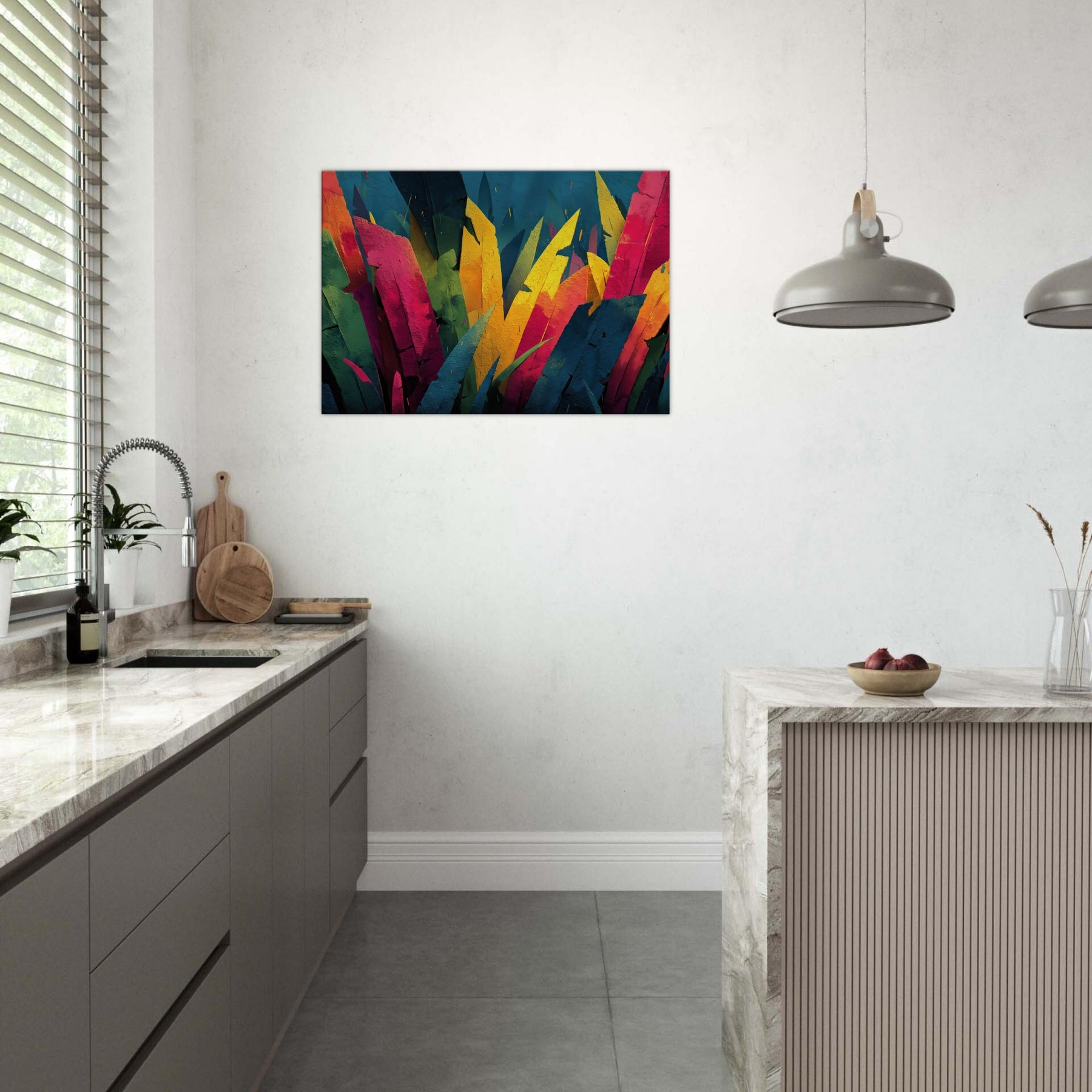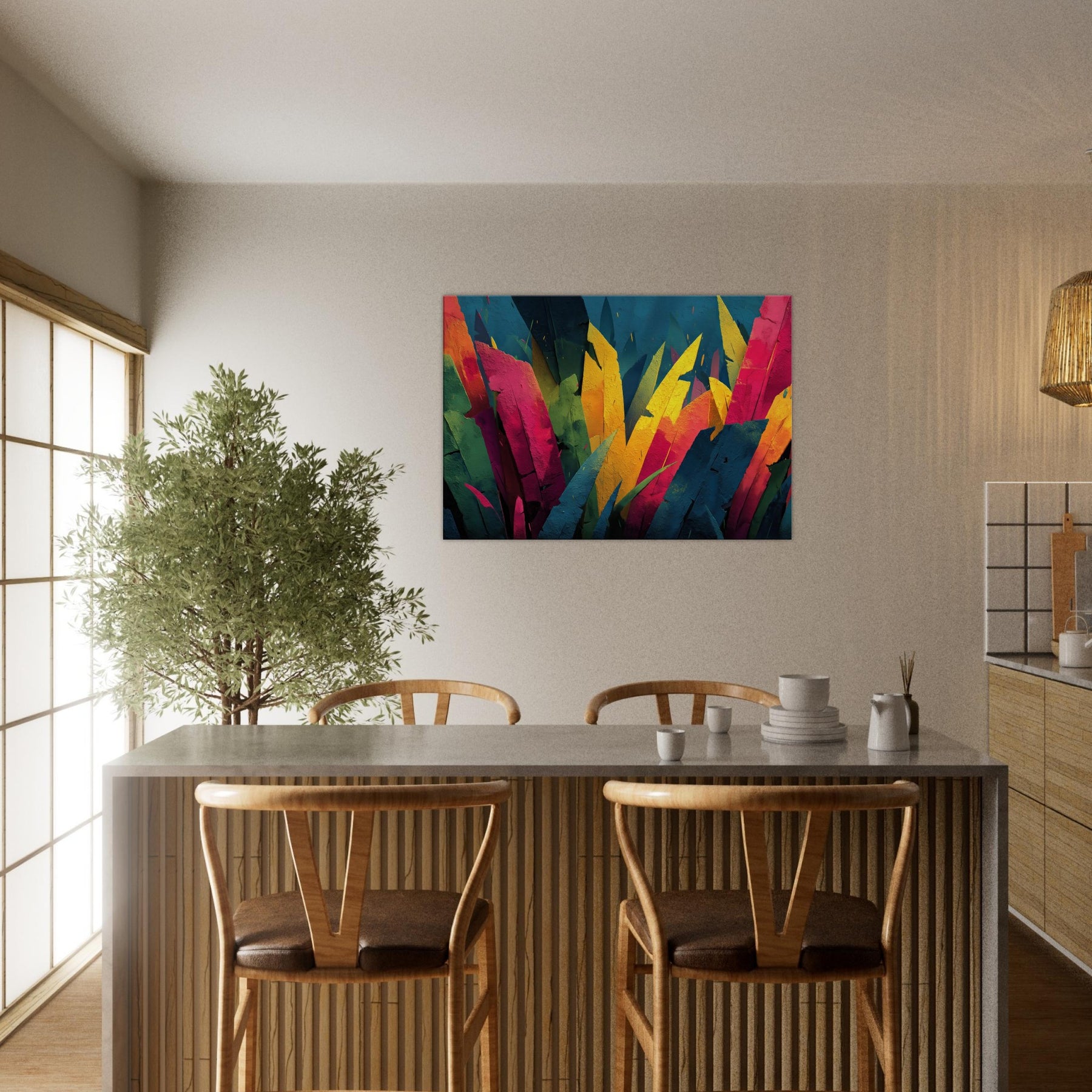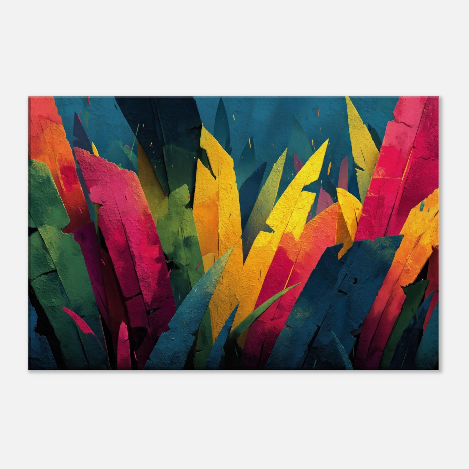 Step into a Jungle inspired dream where color outruns form. This Jungle adjacent piece floods the room with electric greens, sunlit yellows, and tropical pinks, turning walls into a living canopy. The layered shards evoke leaves tilting toward light, inviting quiet reflection or animated conversation. Its pulse of color breathes warmth into a neutral living room, awakening cushions, textures, and art loving guests alike. A statement centerpiece that pairs with modern furniture, this piece tempts you to linger, breathe, and see the wild reimagined.