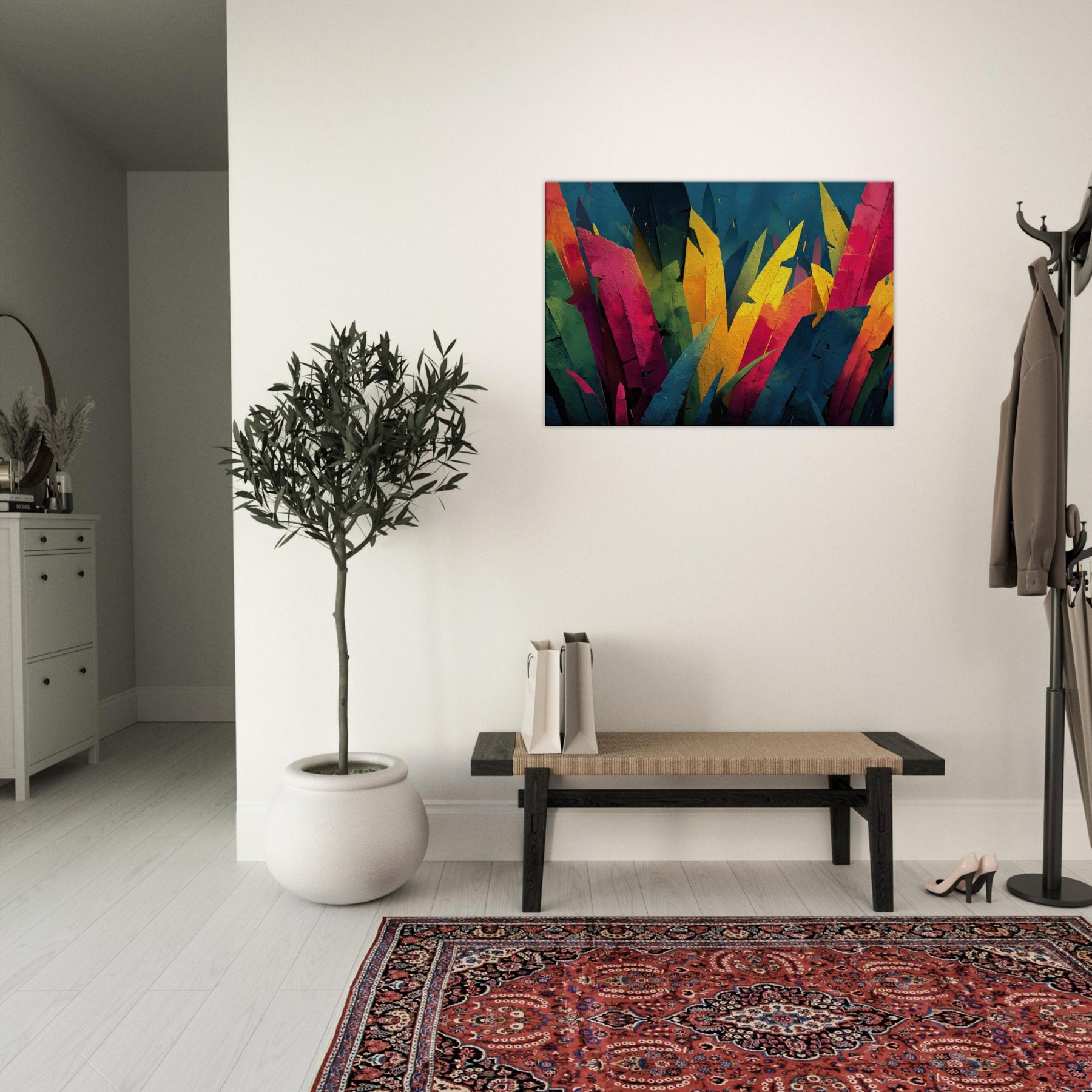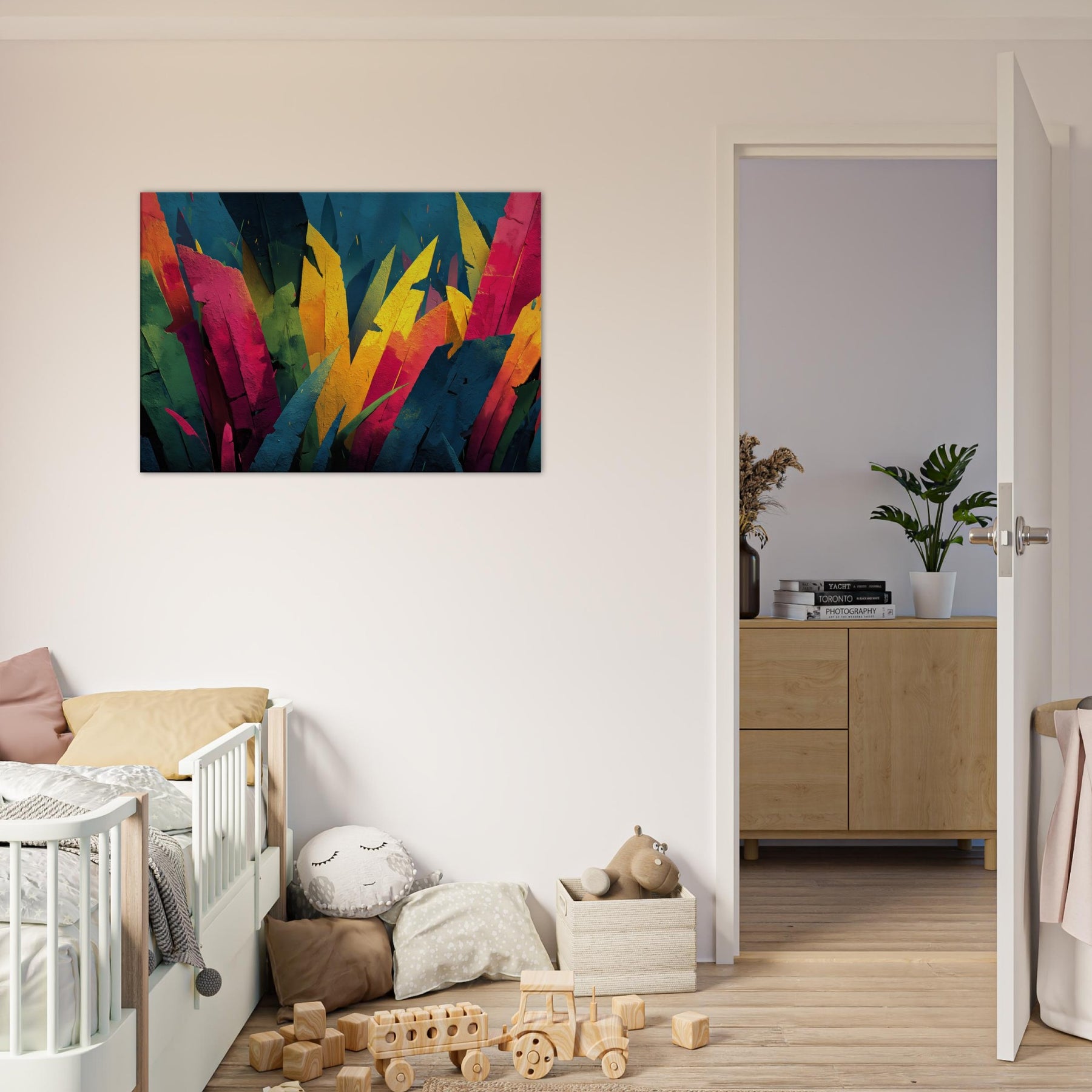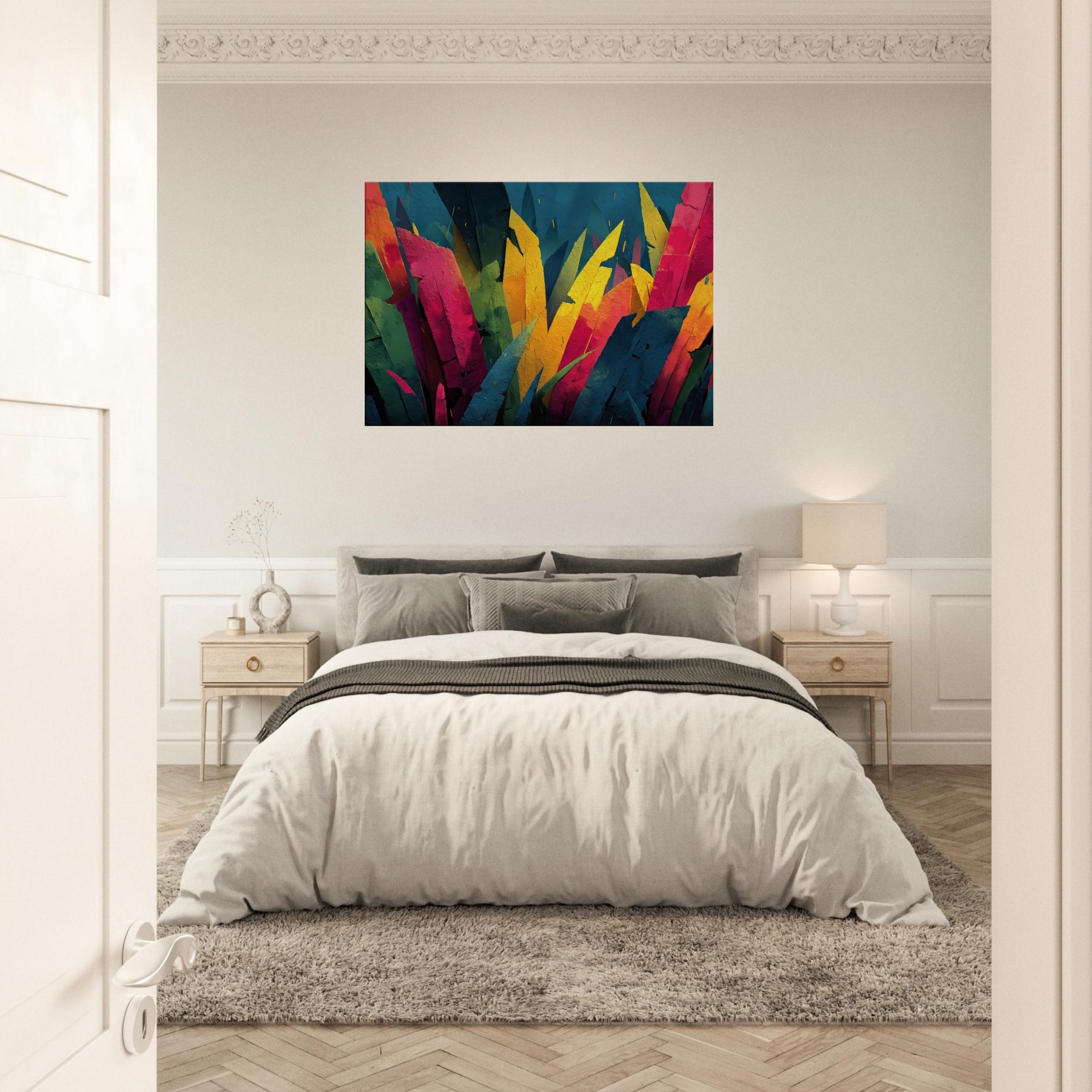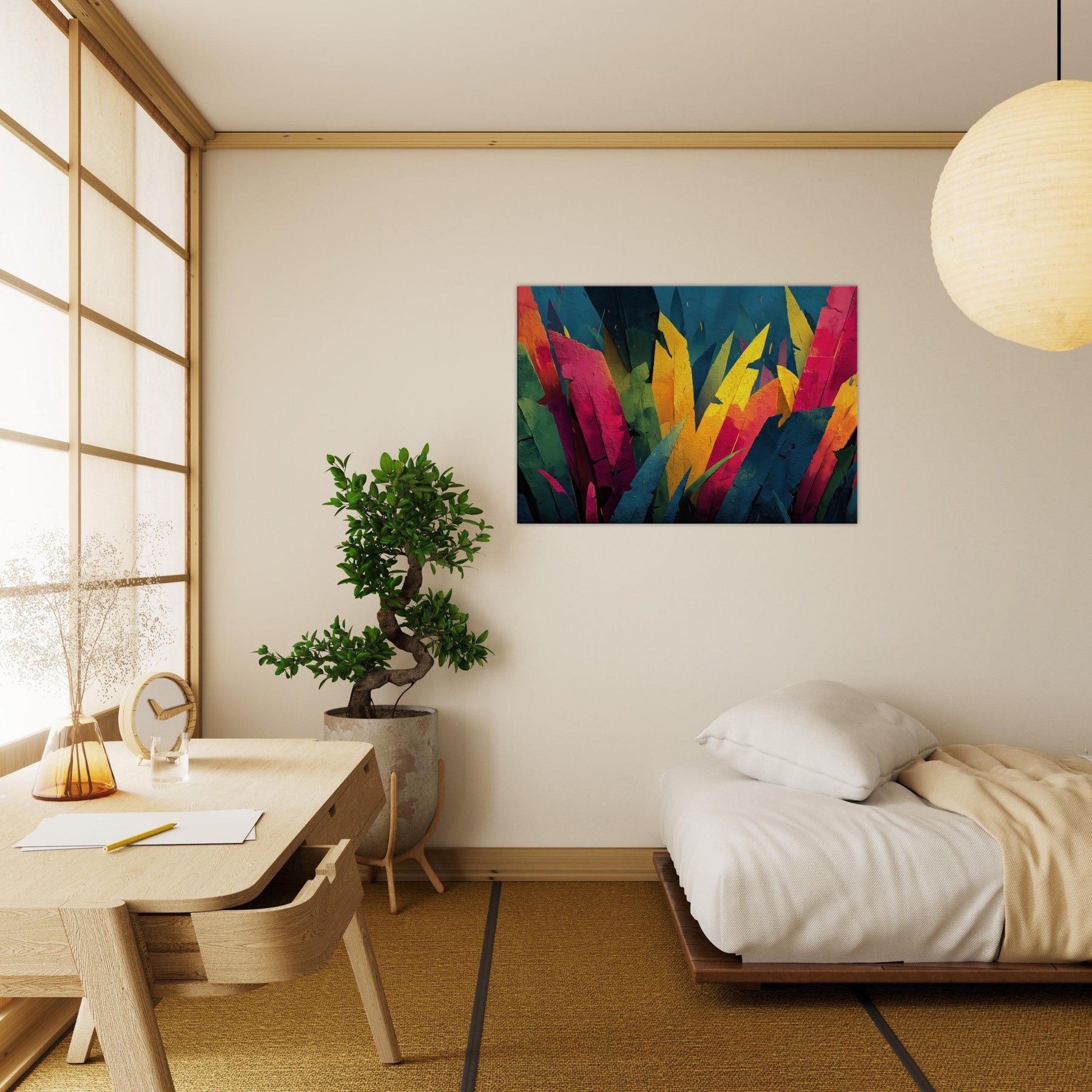 Step into a Jungle inspired dream where color outruns form. This Jungle adjacent piece floods the room with electric greens, sunlit yellows, and tropical pinks, turning walls into a living canopy. The layered shards evoke leaves tilting toward light, inviting quiet reflection or animated conversation. Its pulse of color breathes warmth into a neutral living room, awakening cushions, textures, and art loving guests alike. A statement centerpiece that pairs with modern furniture, this piece tempts you to linger, breathe, and see the wild reimagined.