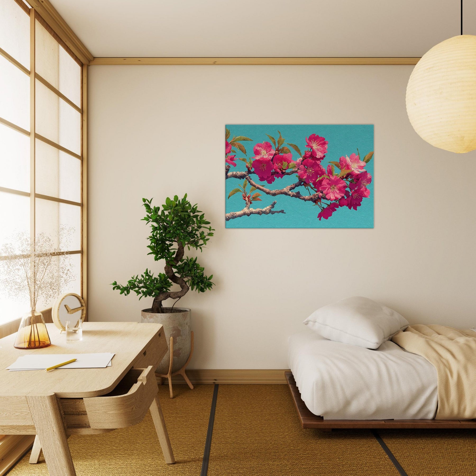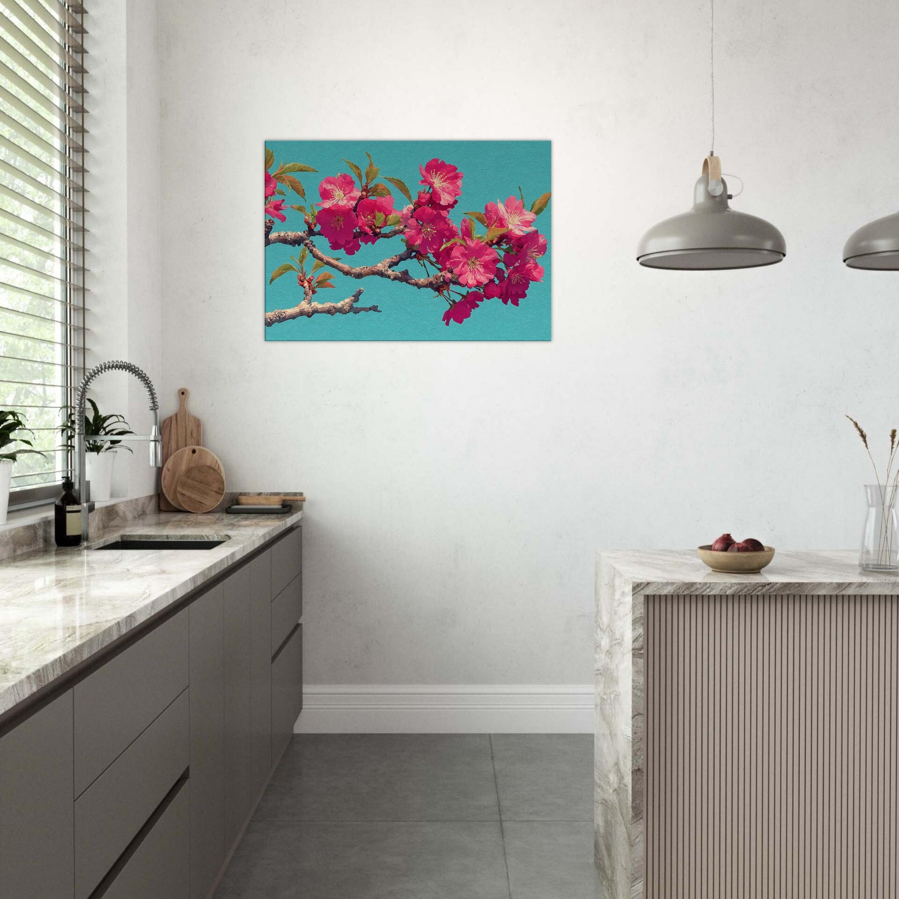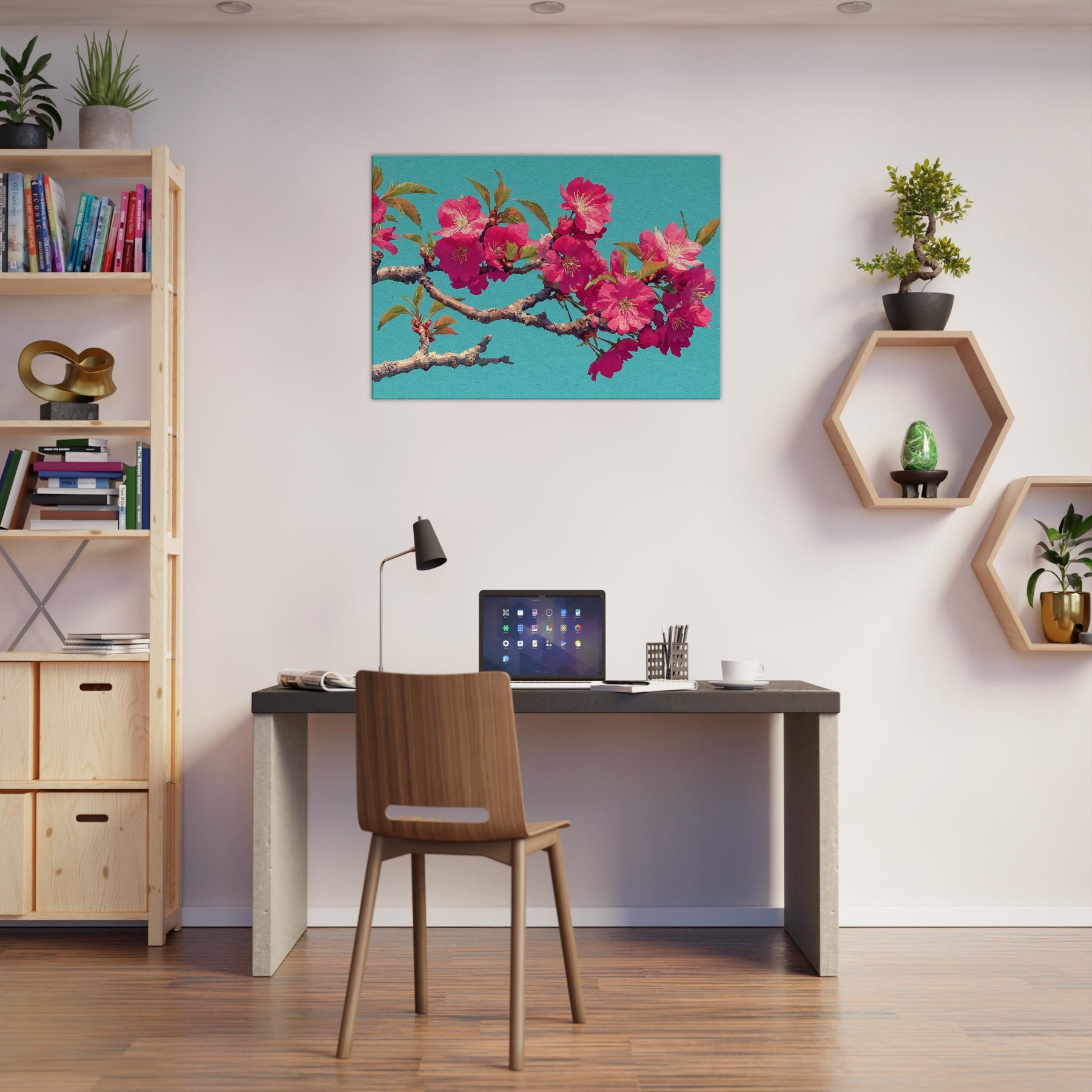 Over a turquoise sky, a Sakura Branch unfurls its blossoms in a dance of bold, mosaic petals. This abstract composition distills spring into color and rhythm, where rugged bark contrasts with the softness of pink blooms. The scene breathes warmth into a room, inviting quiet contemplation as light plays across walls. Let the Sakura Branch anchor your space, while the luminous branches guide the eye, evoking movement and calm. It’s ideal for living rooms, bedrooms, or studios seeking nature’s poetry.