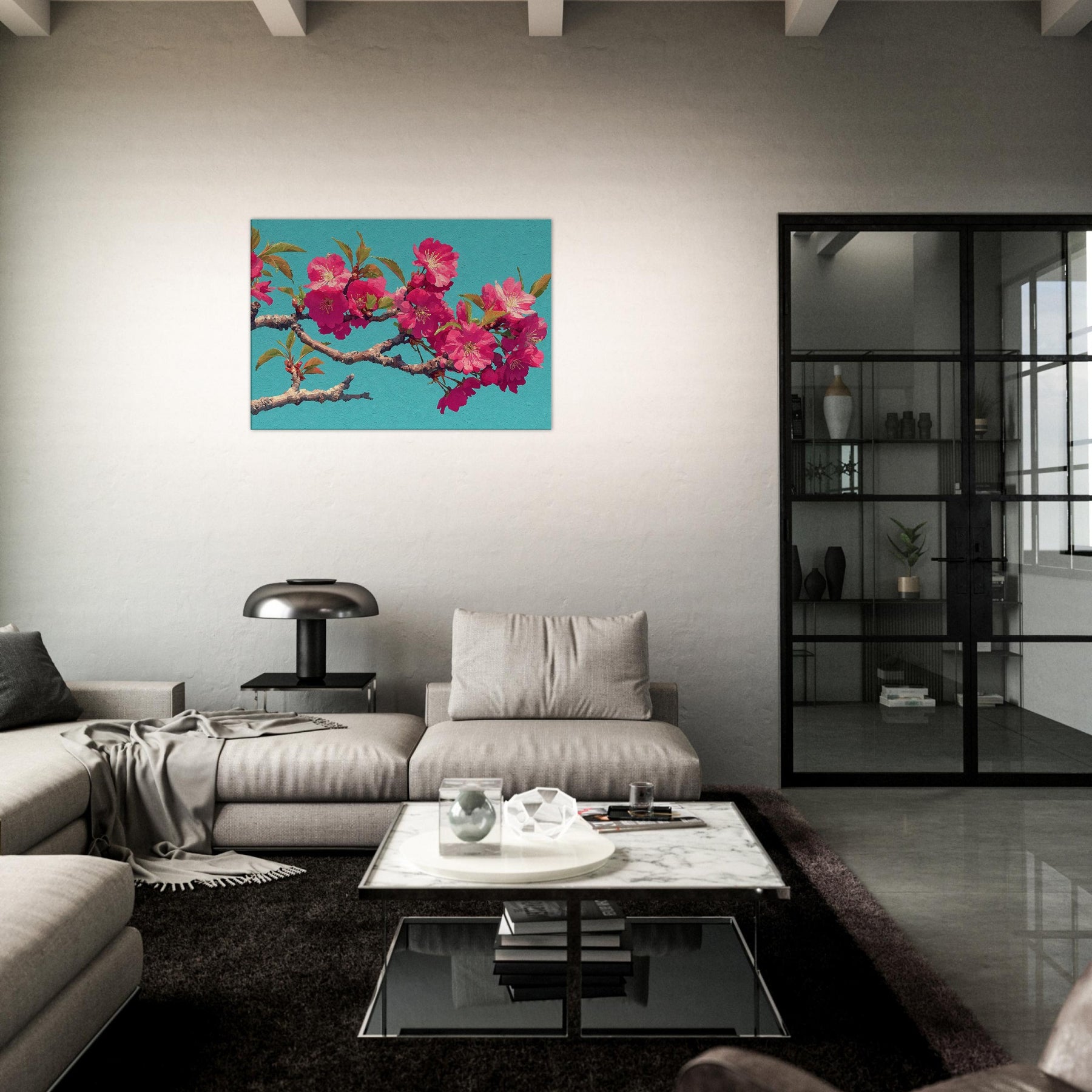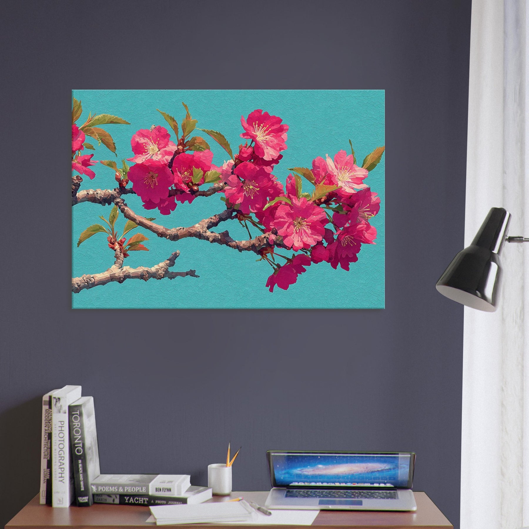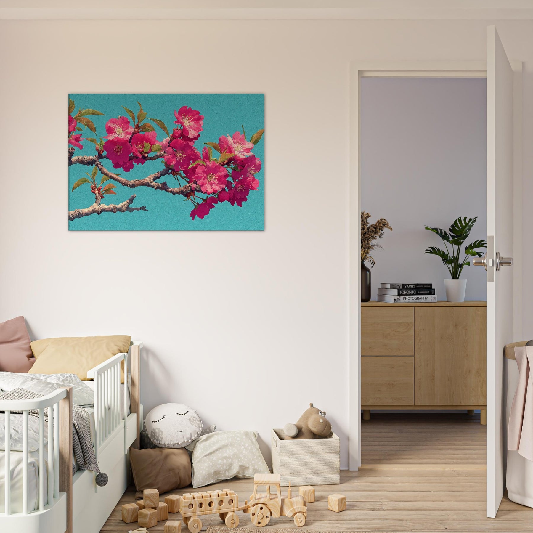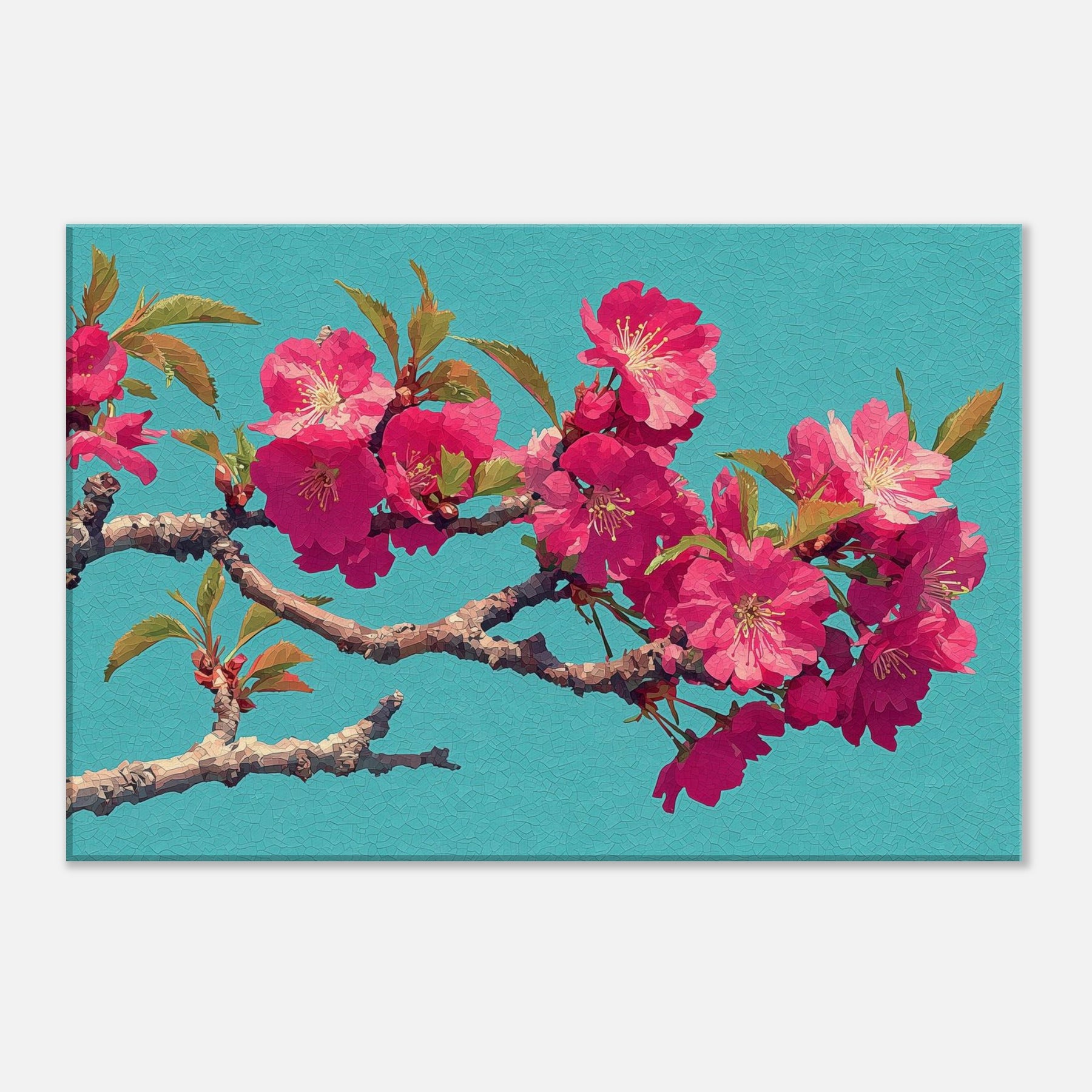 Over a turquoise sky, a Sakura Branch unfurls its blossoms in a dance of bold, mosaic petals. This abstract composition distills spring into color and rhythm, where rugged bark contrasts with the softness of pink blooms. The scene breathes warmth into a room, inviting quiet contemplation as light plays across walls. Let the Sakura Branch anchor your space, while the luminous branches guide the eye, evoking movement and calm. It’s ideal for living rooms, bedrooms, or studios seeking nature’s poetry.