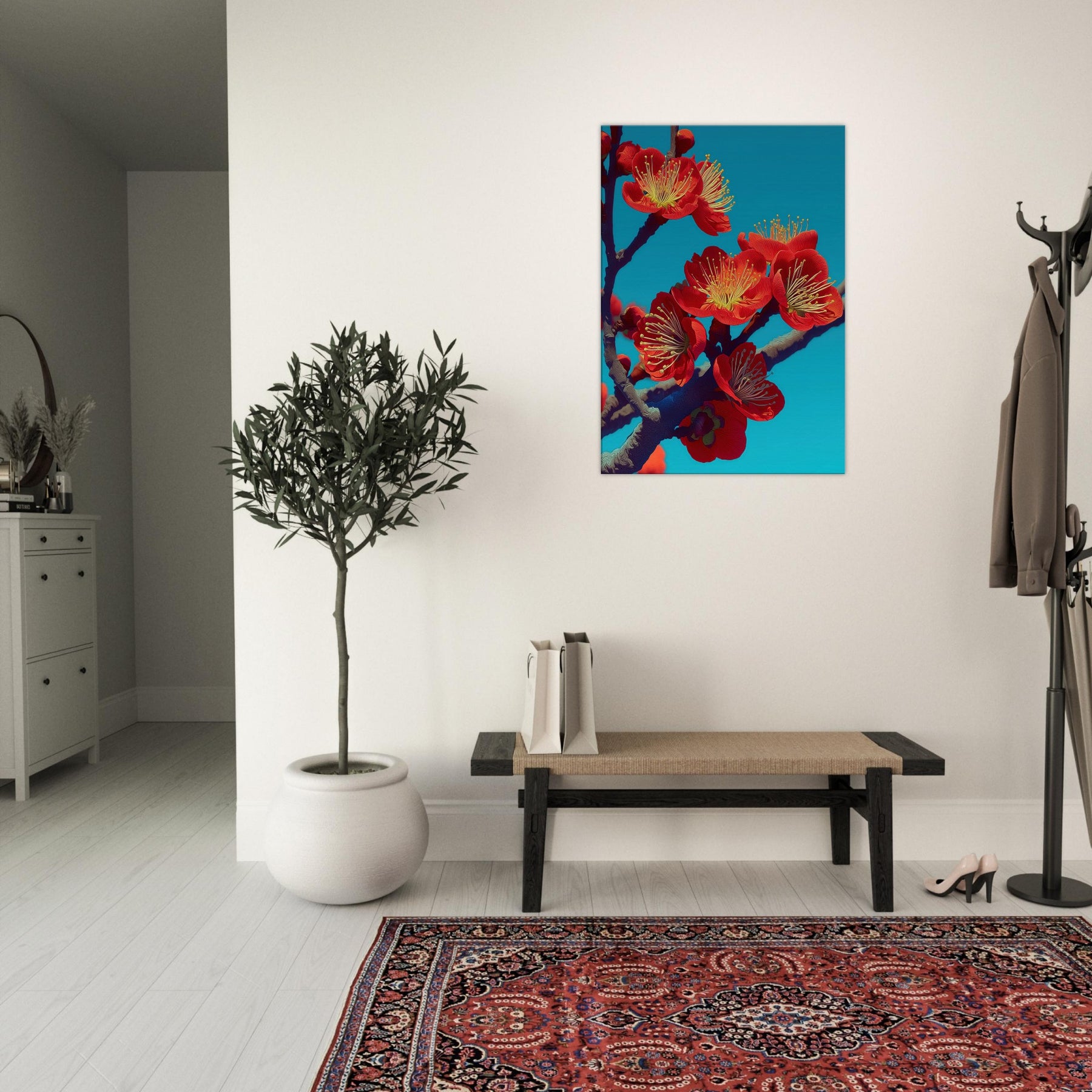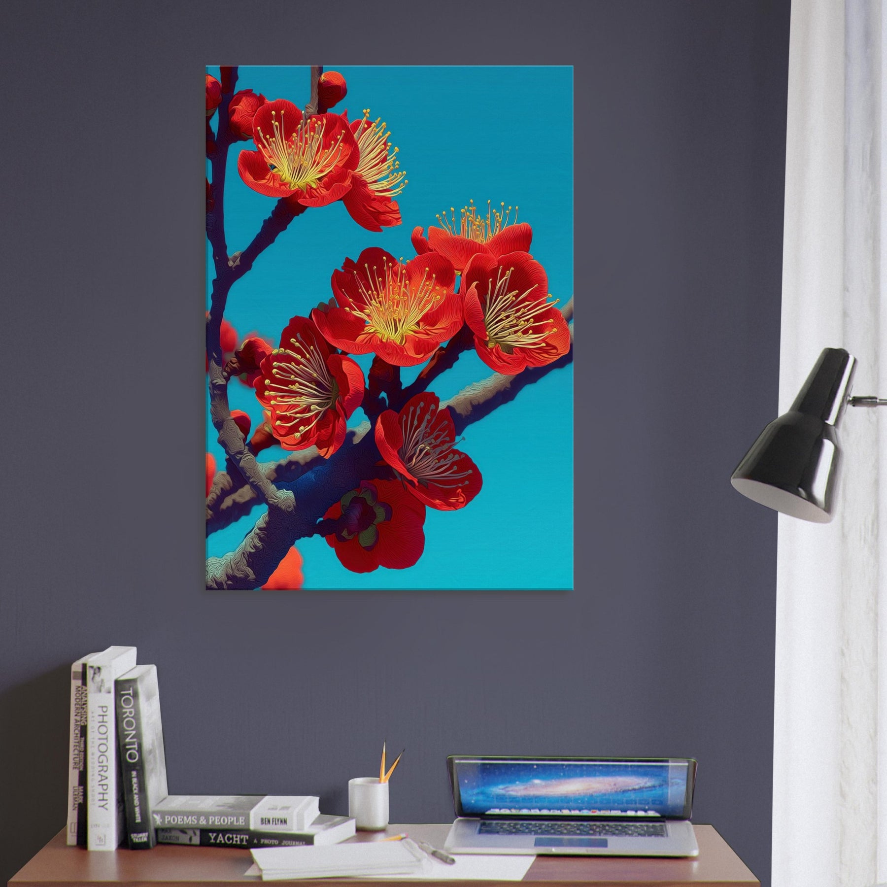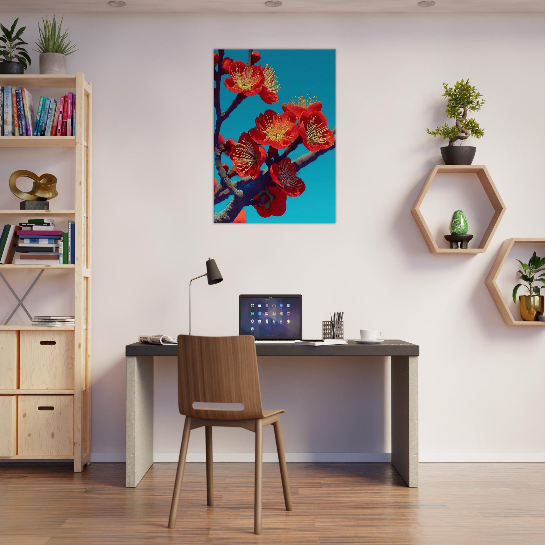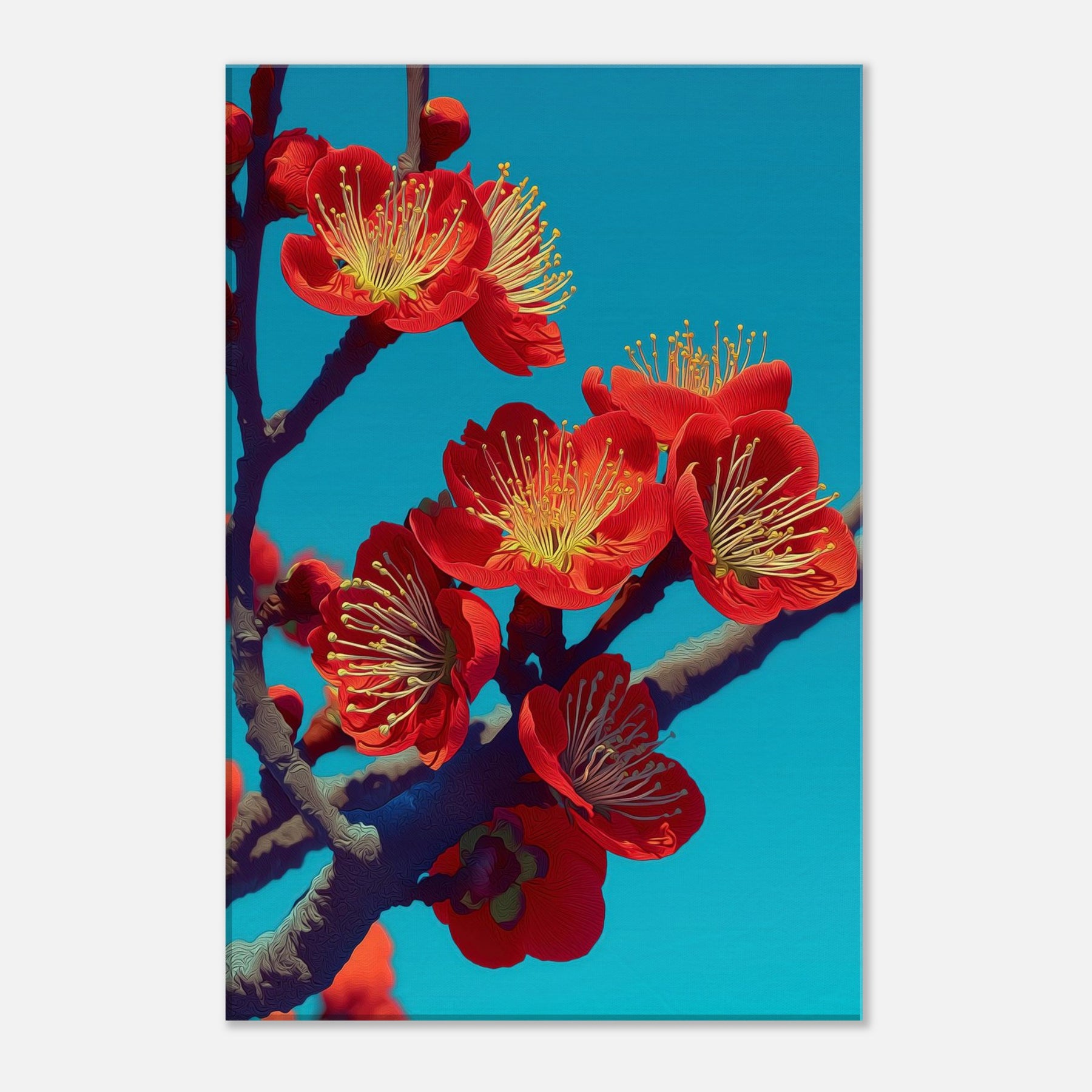 Plum Blossom unfolds in luminous strokes across a cobalt field, inviting the eye to trace red petals and golden stamens. This abstract celebration of nature captures a moment of quiet drama, where tension and softness coexist in brilliant contrast. Hung in a living room or studio, it bathes the space in warm energy, turning walls into a horizon of color and calm. The Plum Blossom becomes a memory you carry an artful reminder that beauty can bloom in everyday life.