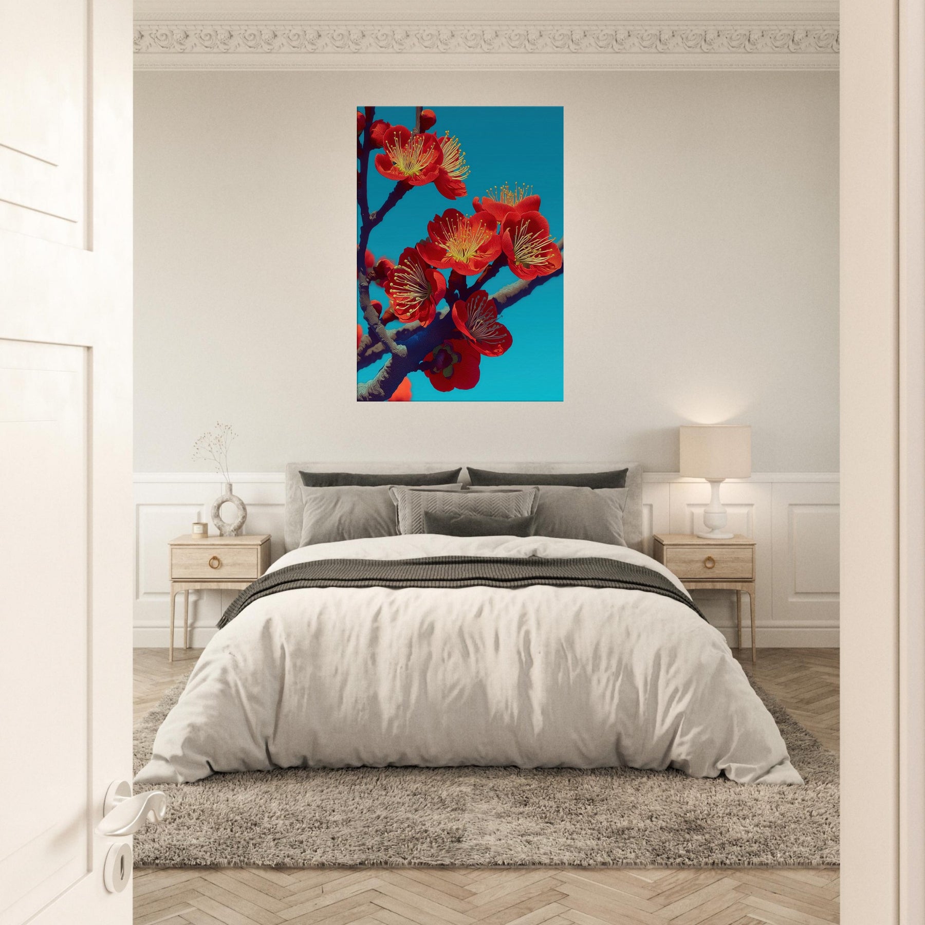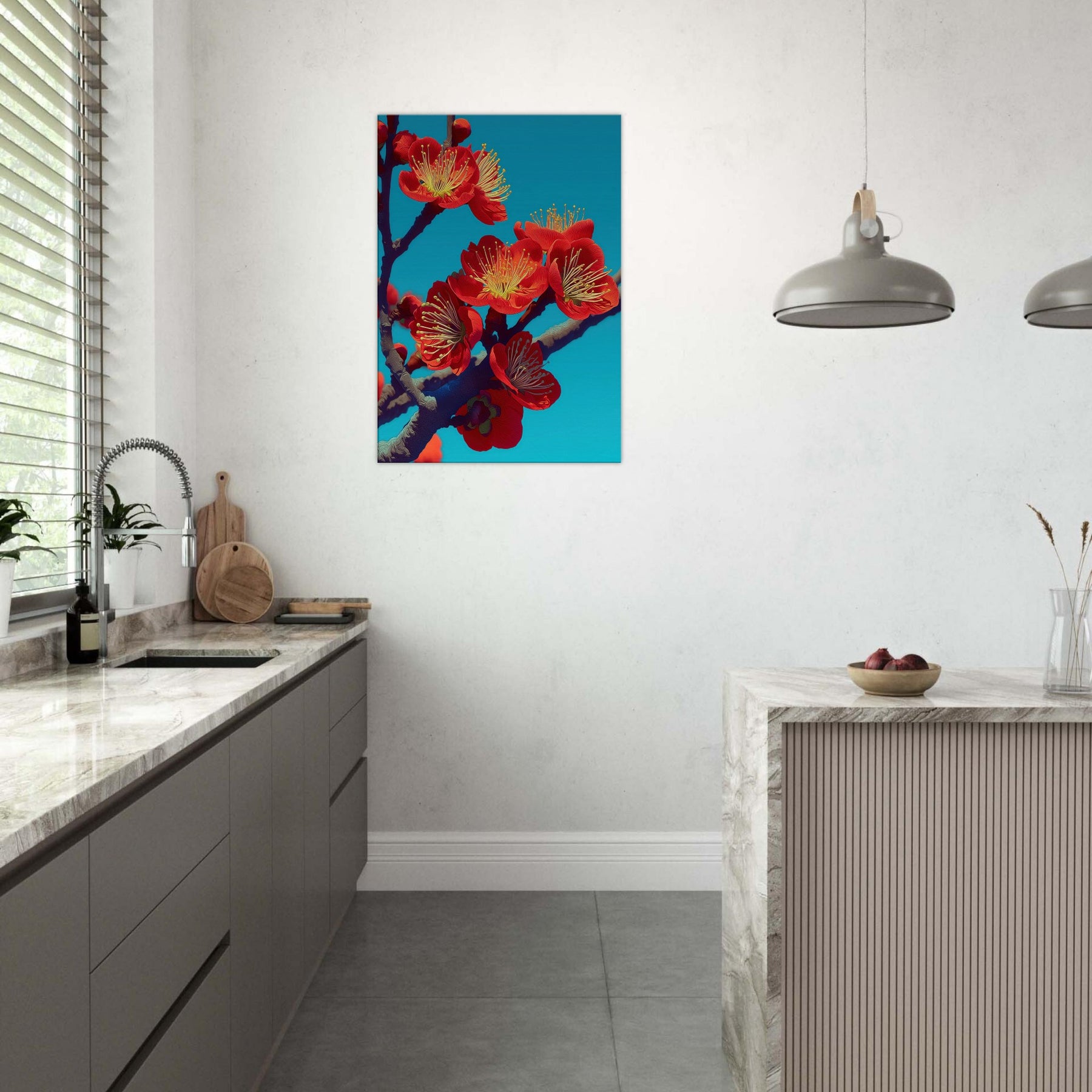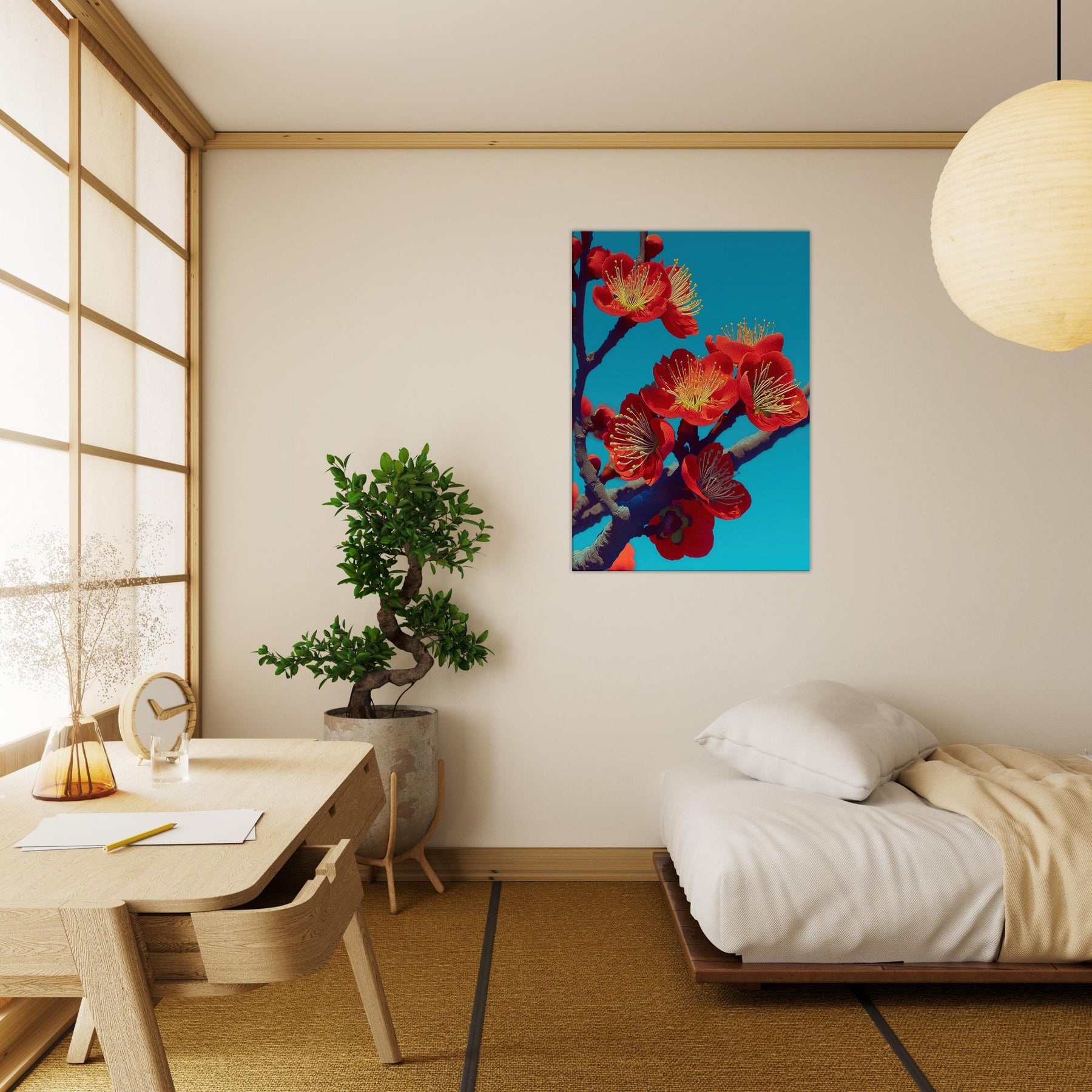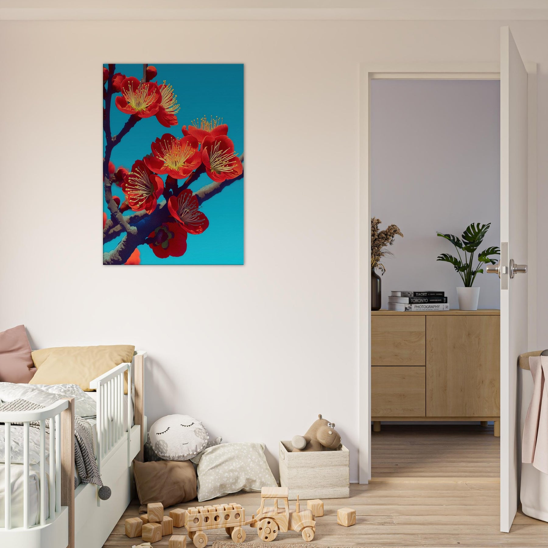 Plum Blossom unfolds in luminous strokes across a cobalt field, inviting the eye to trace red petals and golden stamens. This abstract celebration of nature captures a moment of quiet drama, where tension and softness coexist in brilliant contrast. Hung in a living room or studio, it bathes the space in warm energy, turning walls into a horizon of color and calm. The Plum Blossom becomes a memory you carry an artful reminder that beauty can bloom in everyday life.