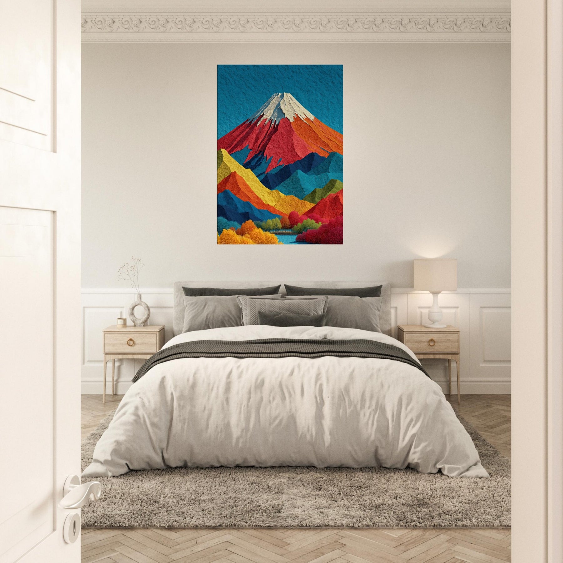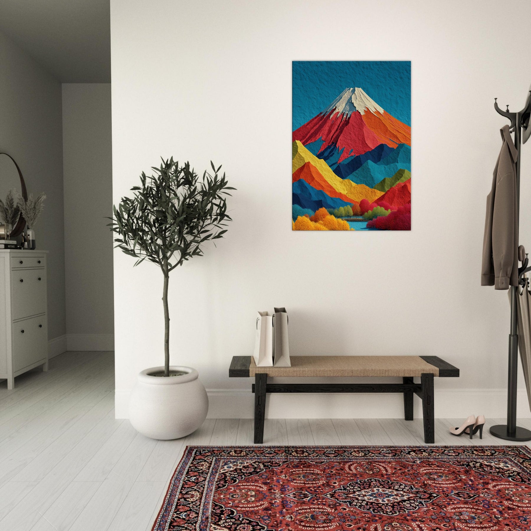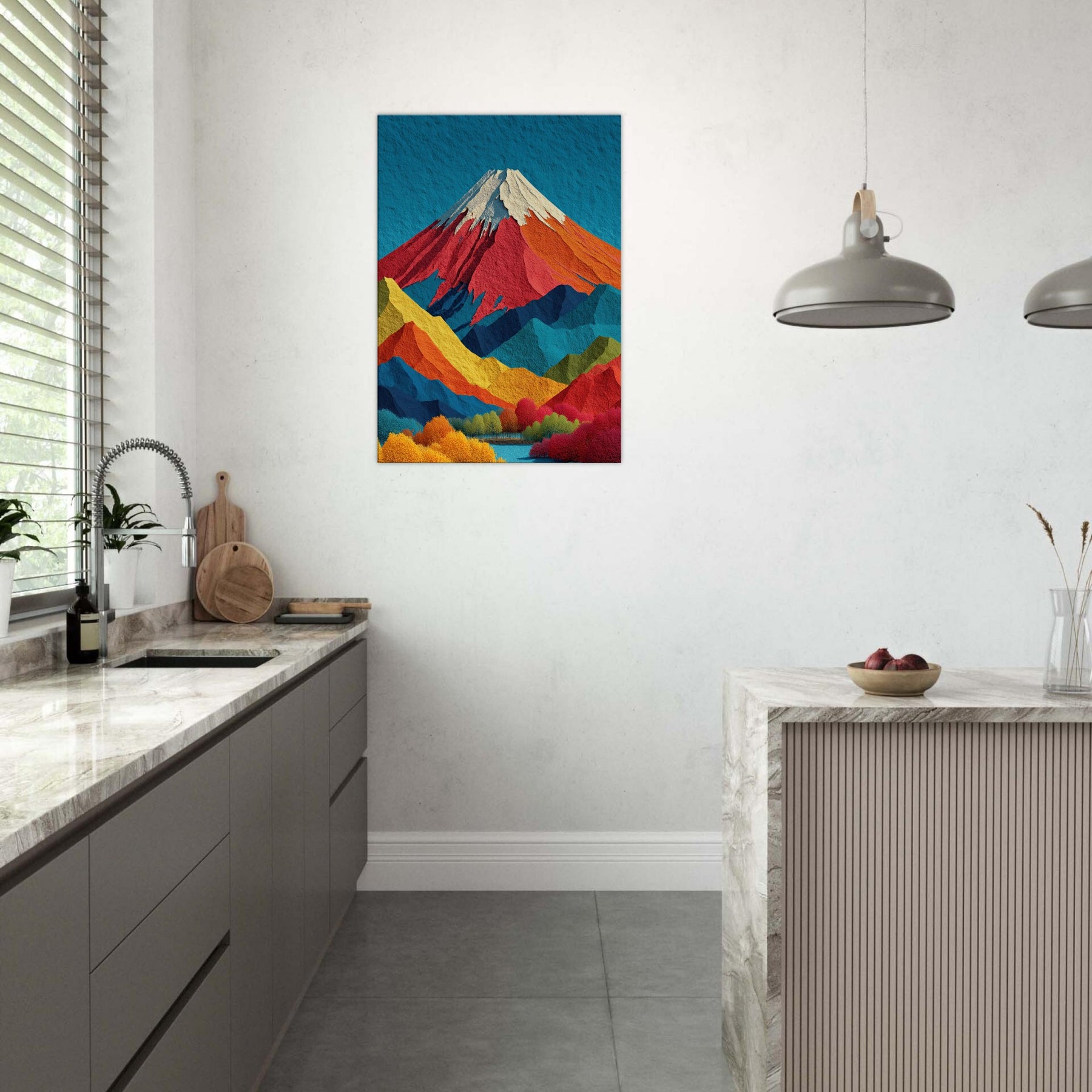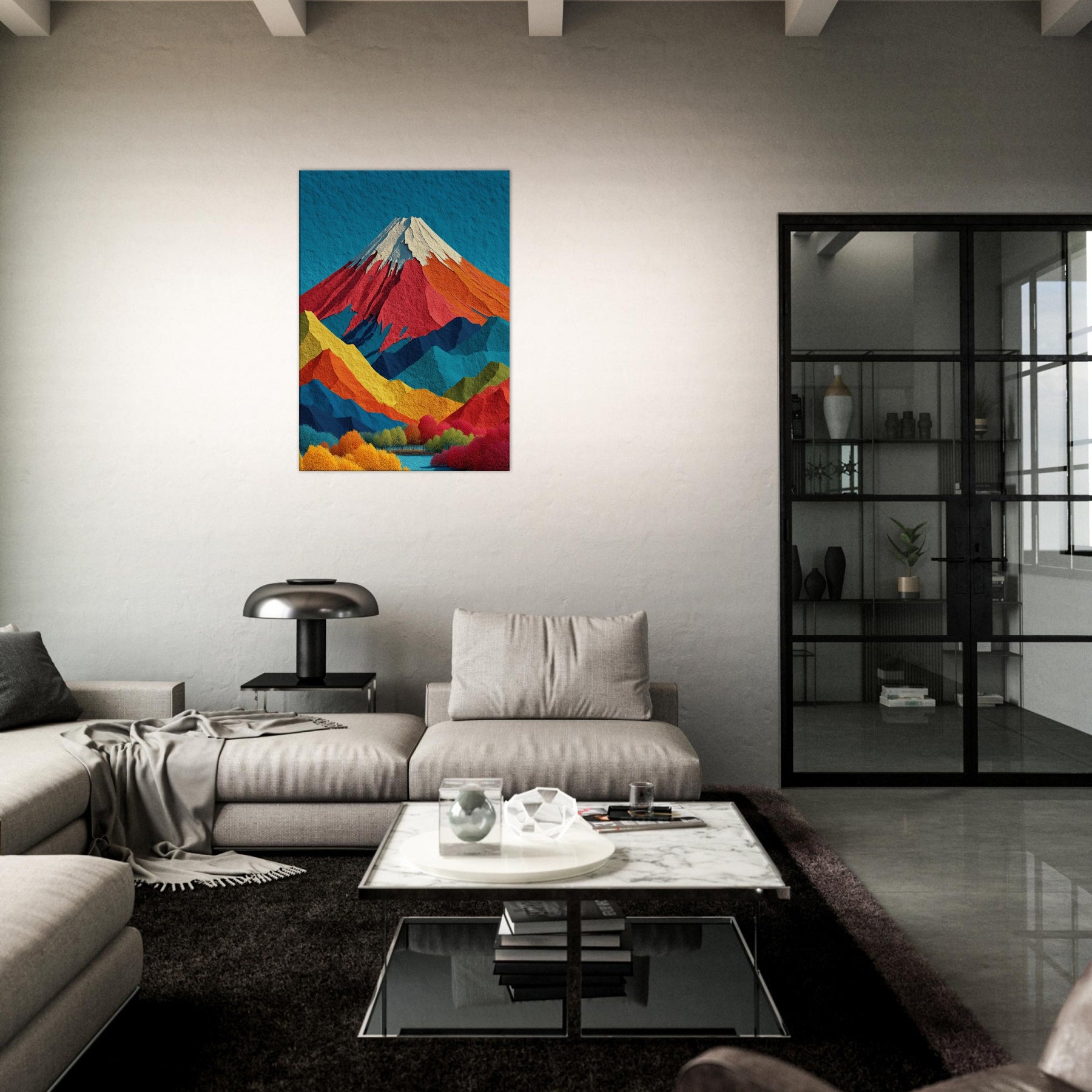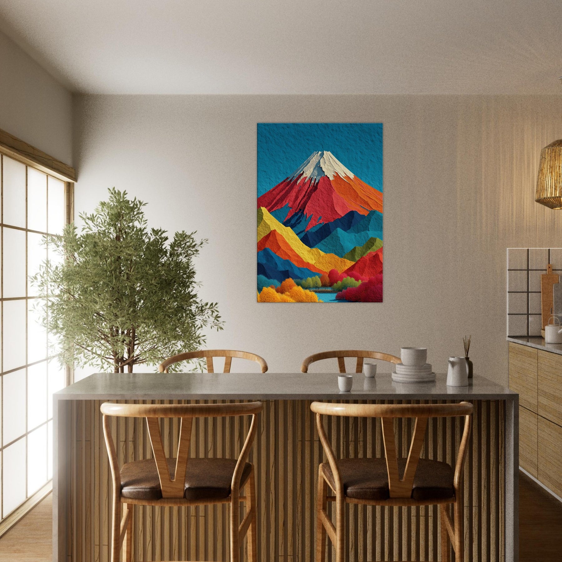 Mount Fuji rises in a radiant sweep of color, where peaks become poetic shapes and light breathes through the . This abstract interpretation invites a calm, meditative mood, guiding the eye upward and letting the room exhale. Layered blues, fiery reds, and soft greens mingle like a memory of dawn, adding warmth, texture, and depth. In a living space, it becomes a luminous focal point a subtle drama that enhances conversations, slows time, and elevates everyday moments with nature’s quiet grandeur.