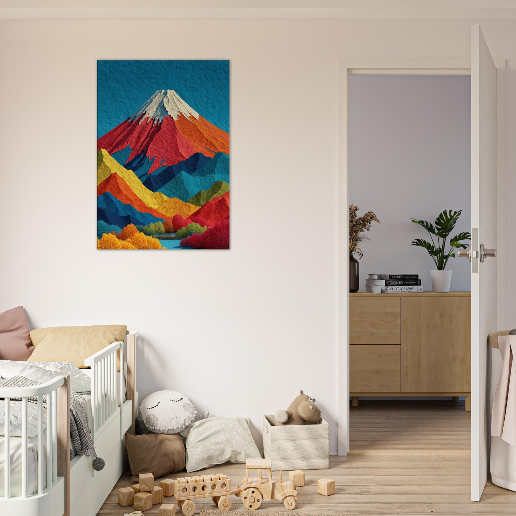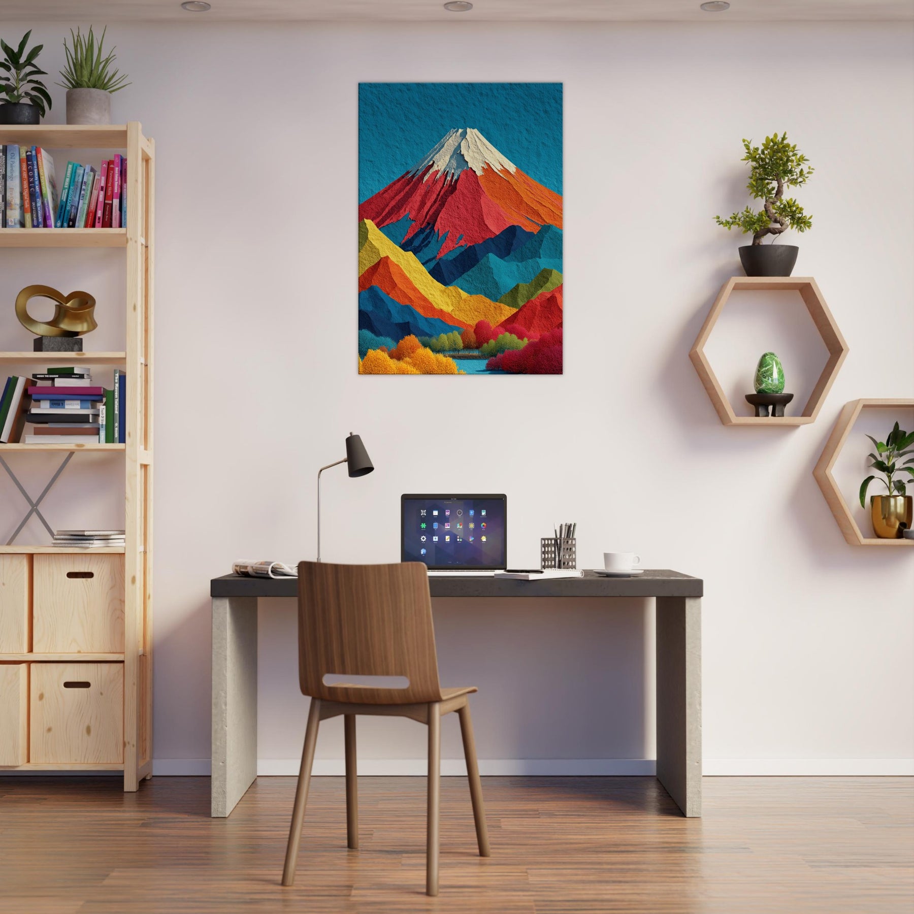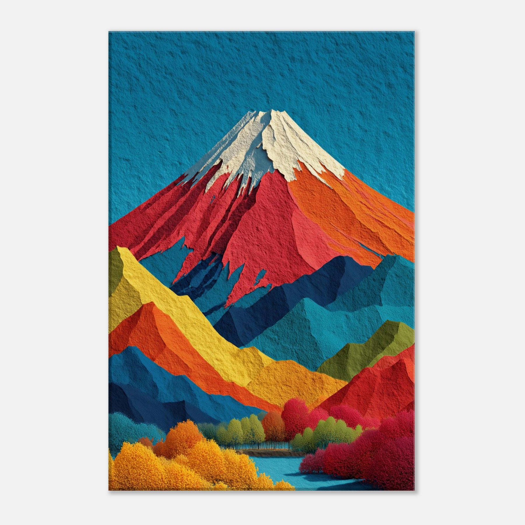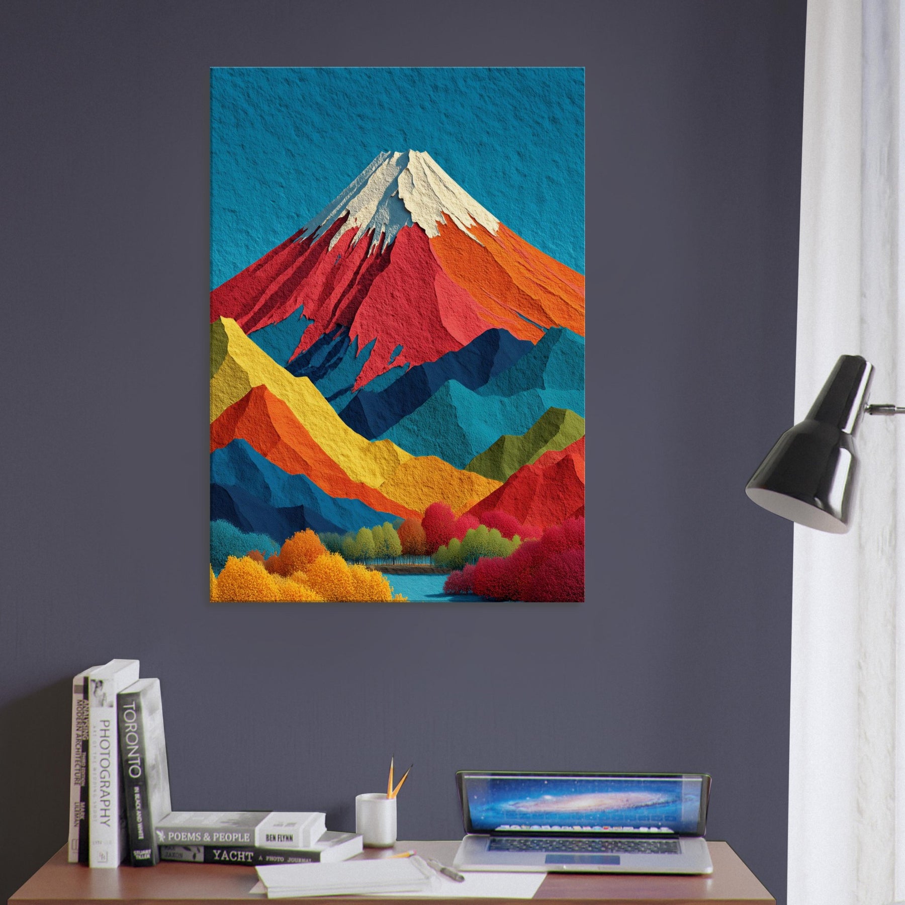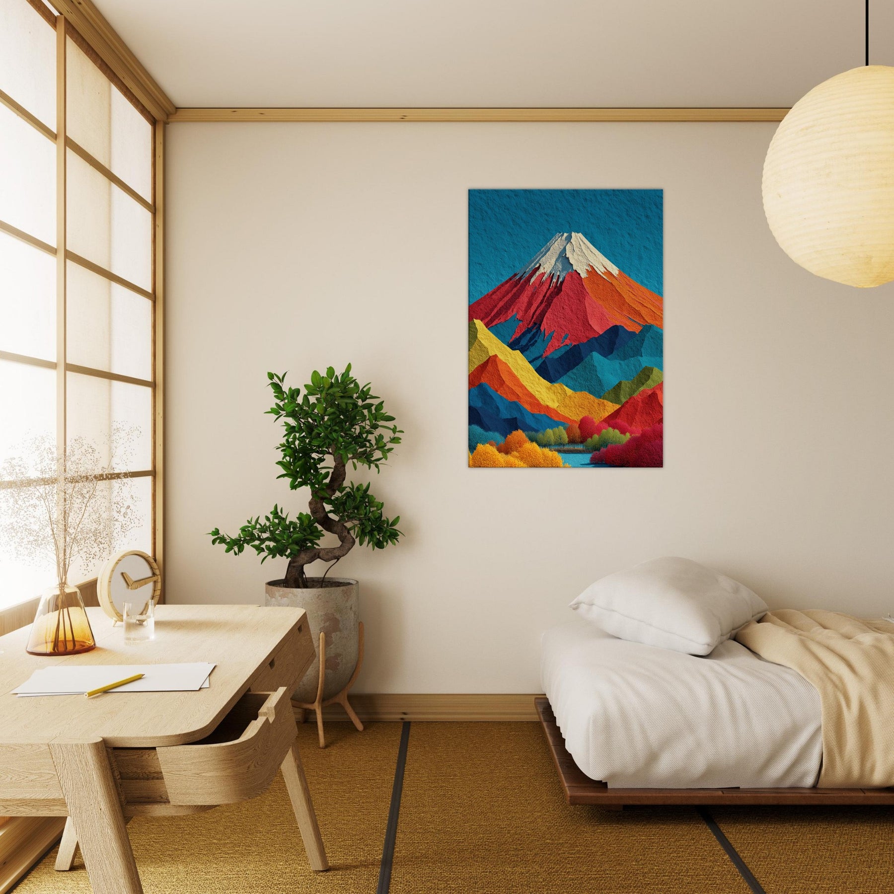 Mount Fuji rises in a radiant sweep of color, where peaks become poetic shapes and light breathes through the . This abstract interpretation invites a calm, meditative mood, guiding the eye upward and letting the room exhale. Layered blues, fiery reds, and soft greens mingle like a memory of dawn, adding warmth, texture, and depth. In a living space, it becomes a luminous focal point a subtle drama that enhances conversations, slows time, and elevates everyday moments with nature’s quiet grandeur.