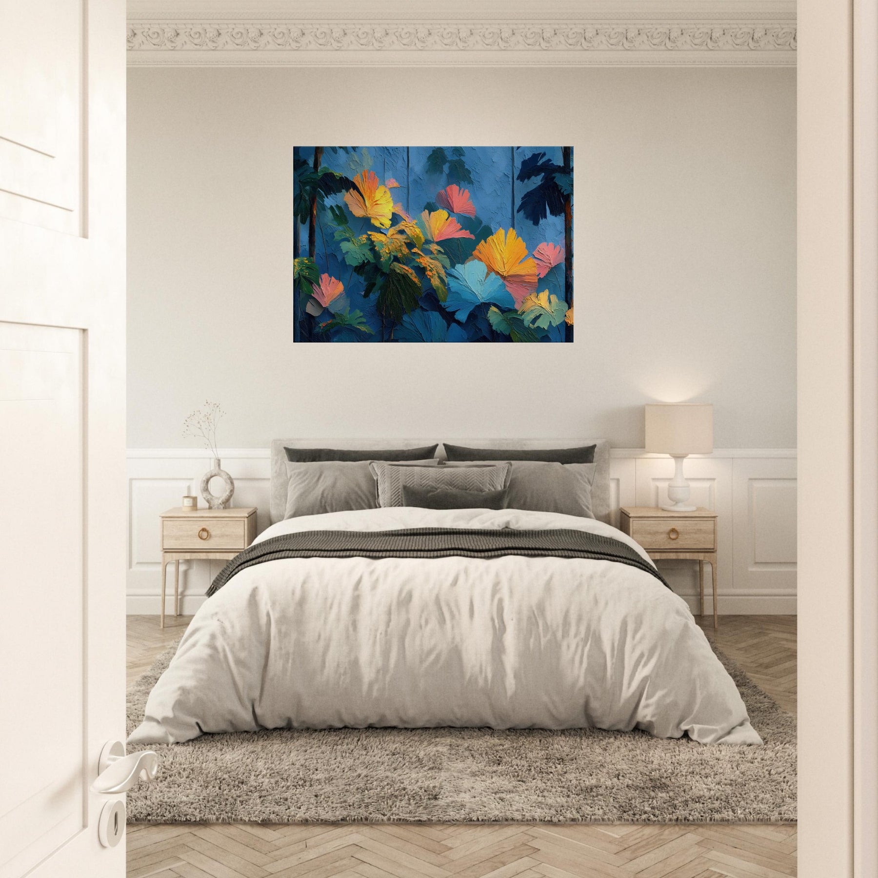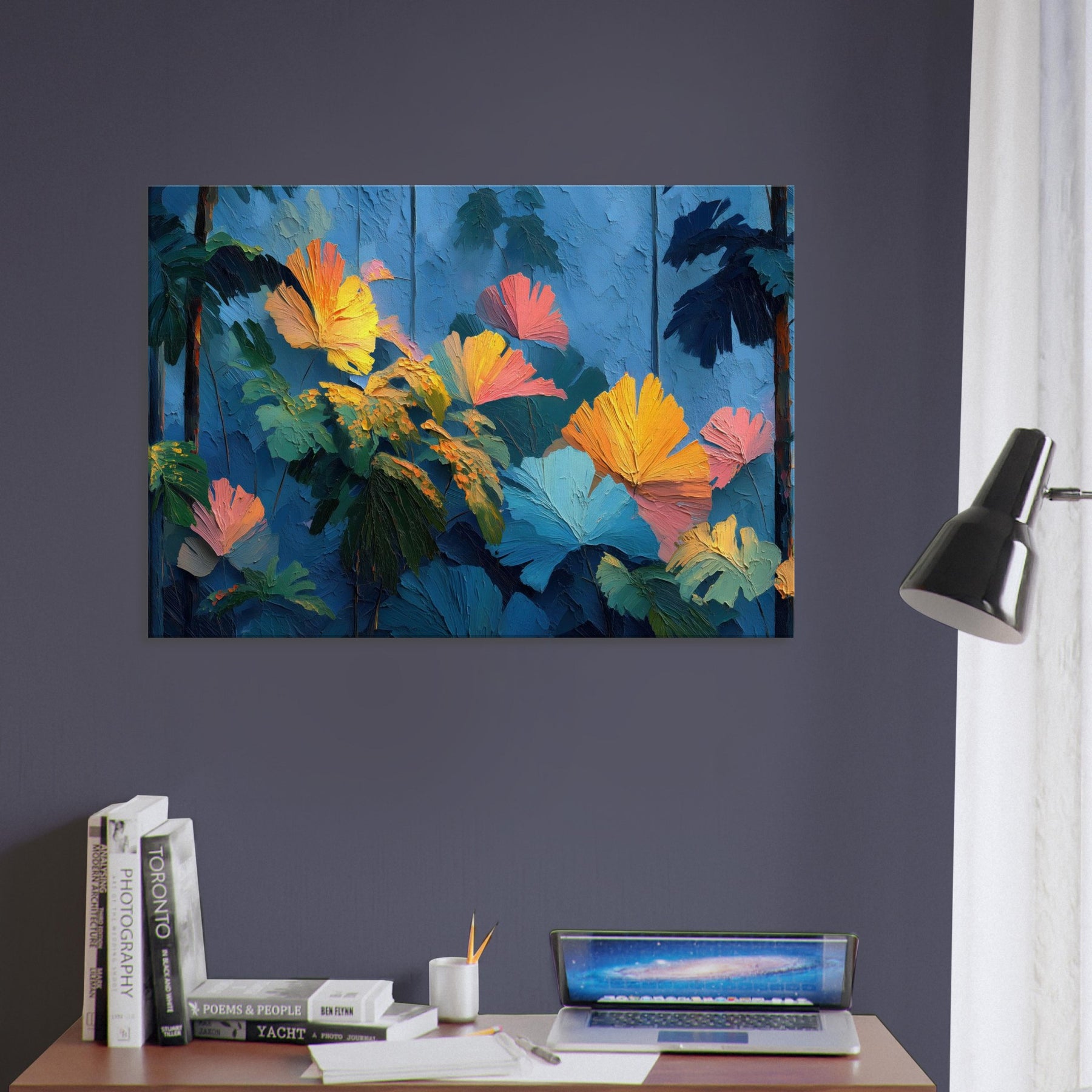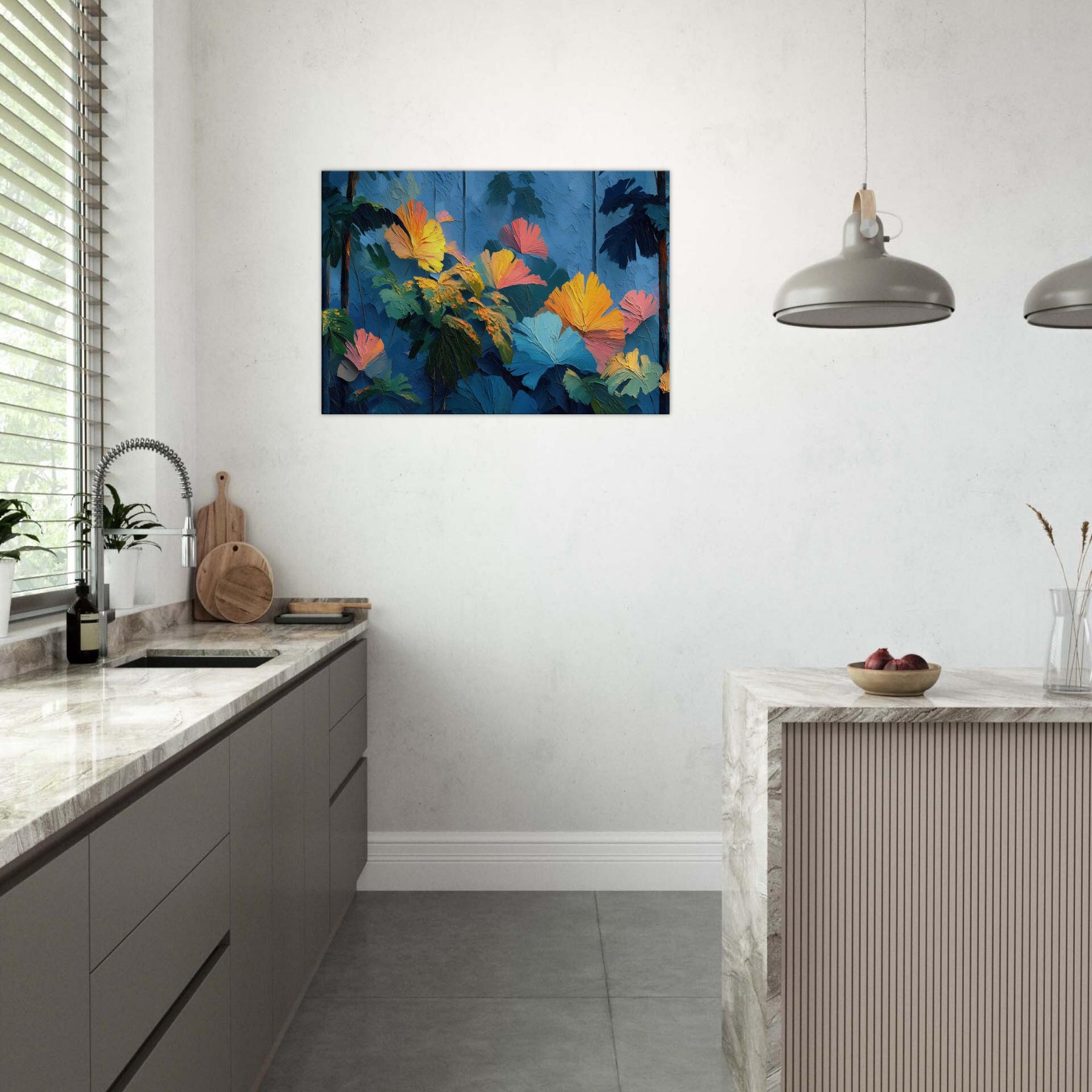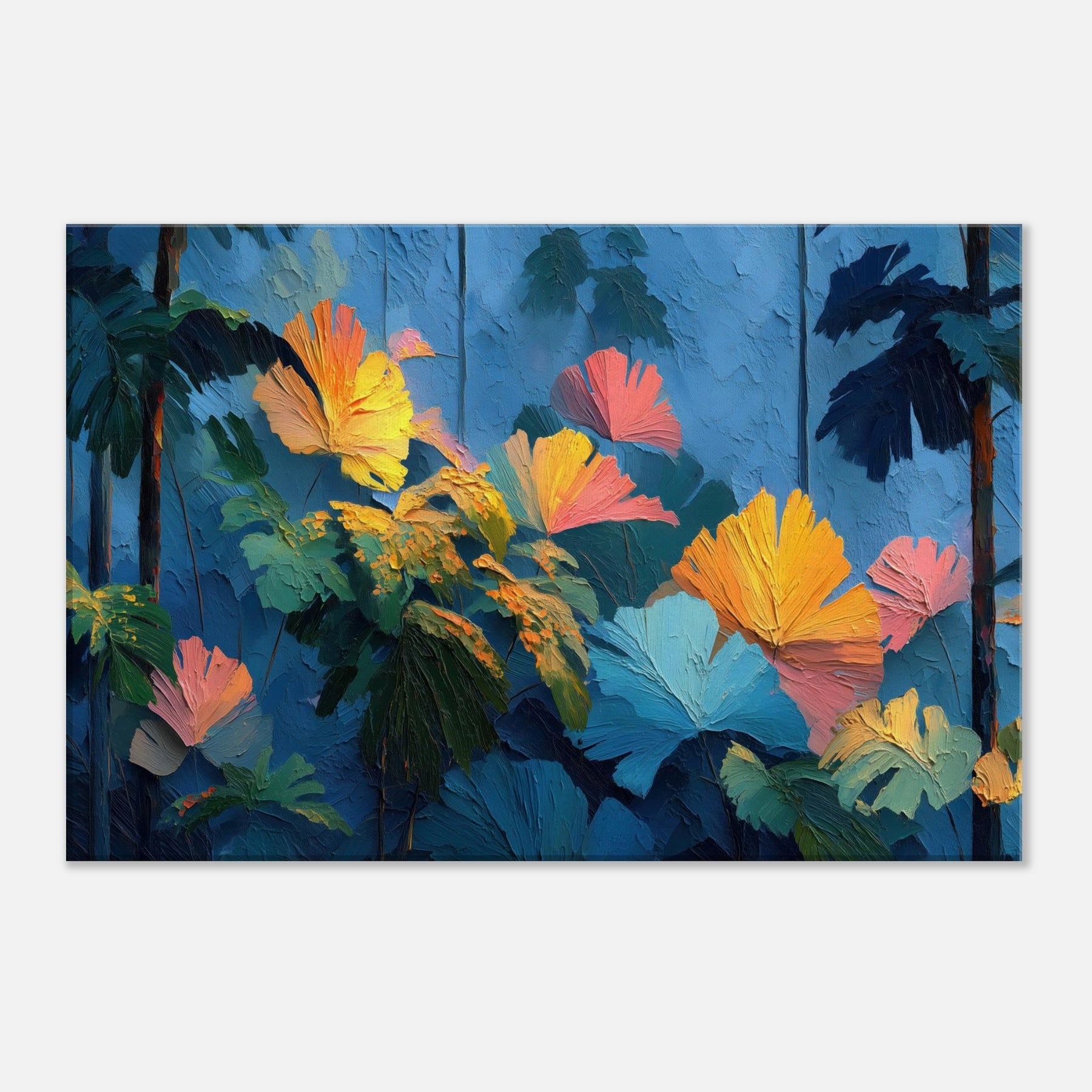 Let your space breathe with the Tropical Forest reimagined in lush, crystalline strokes. This abstract rich composition swells with cobalt skies, emerald leaves, and bursts of sunset orange that feel like sunlight pooled on a soft canvas. The texture invites a tactile glance, while the color chorus elevates a room with warmth and depth, turning a quiet corner into a sanctuary. Perfect above a sofa or in a reading nook, it whispers of distant jungles and the quiet pulse of nature indoors.