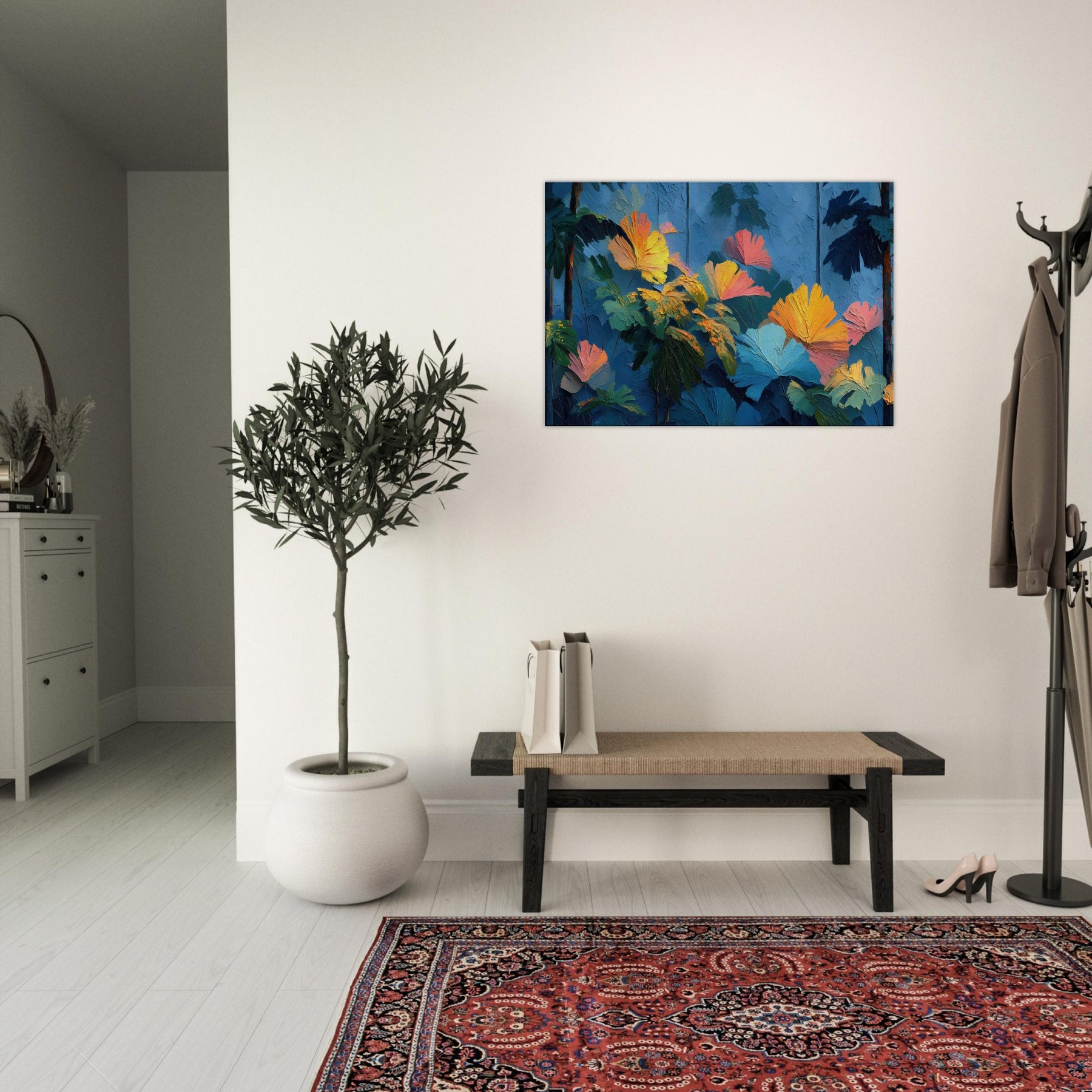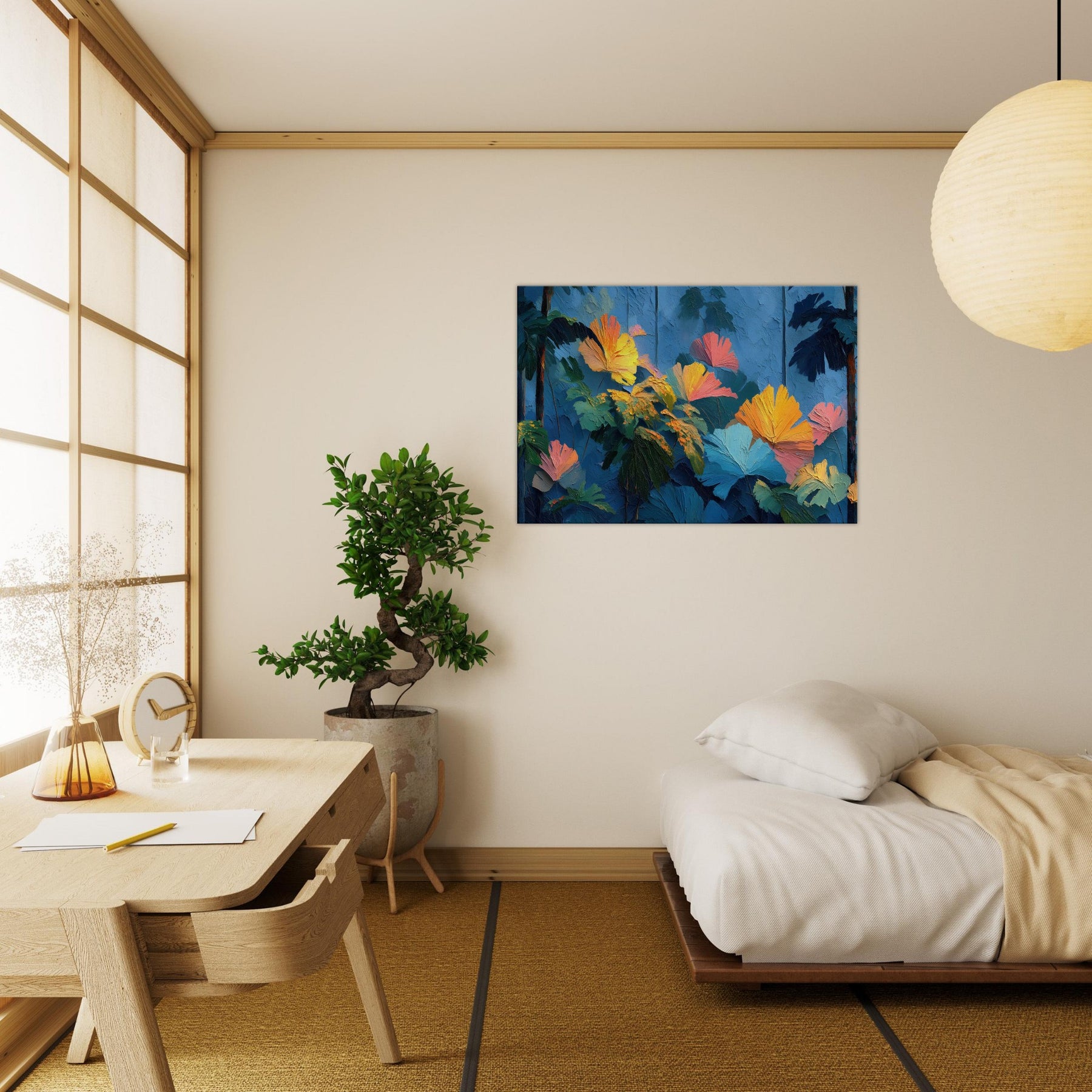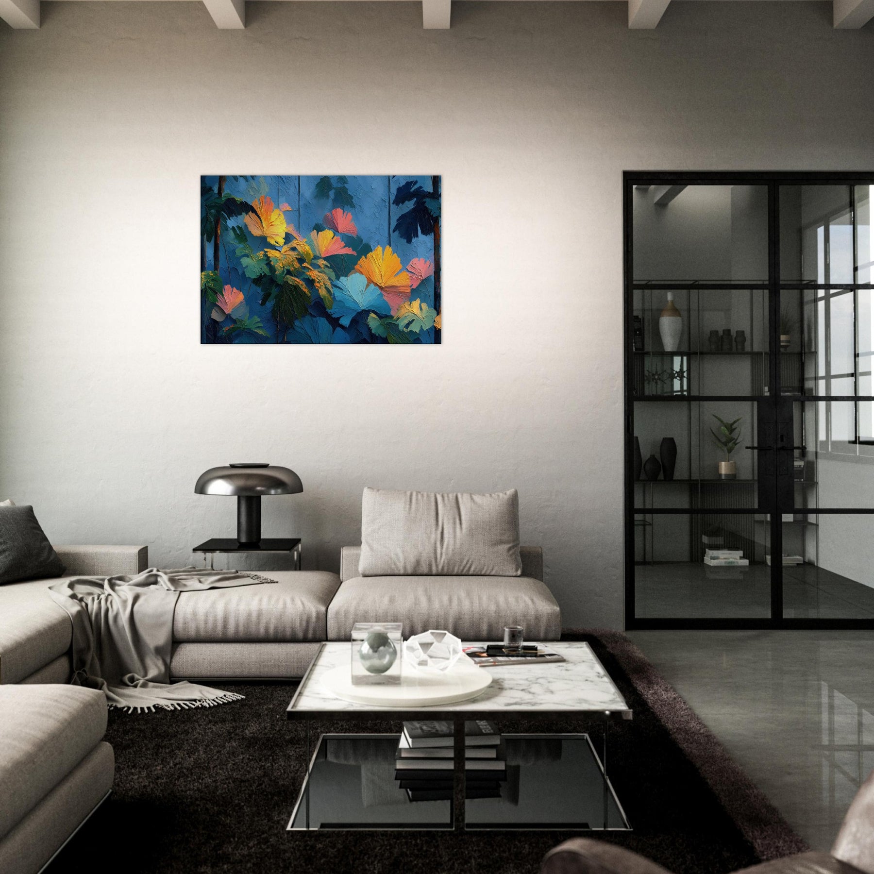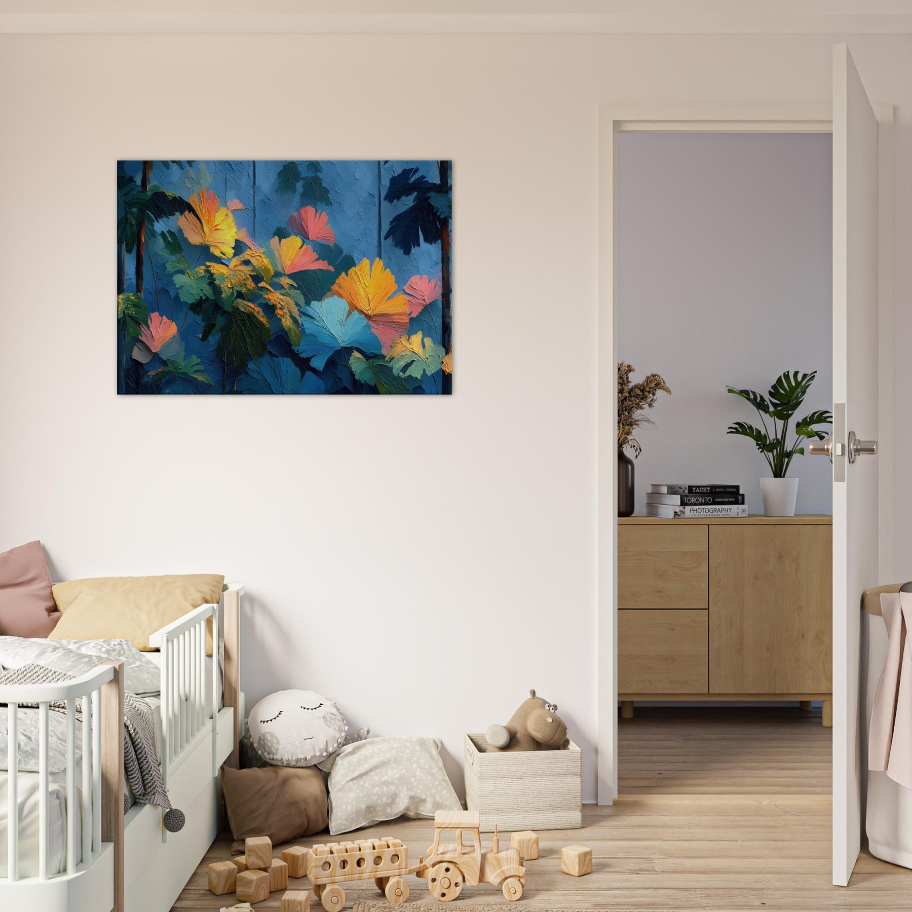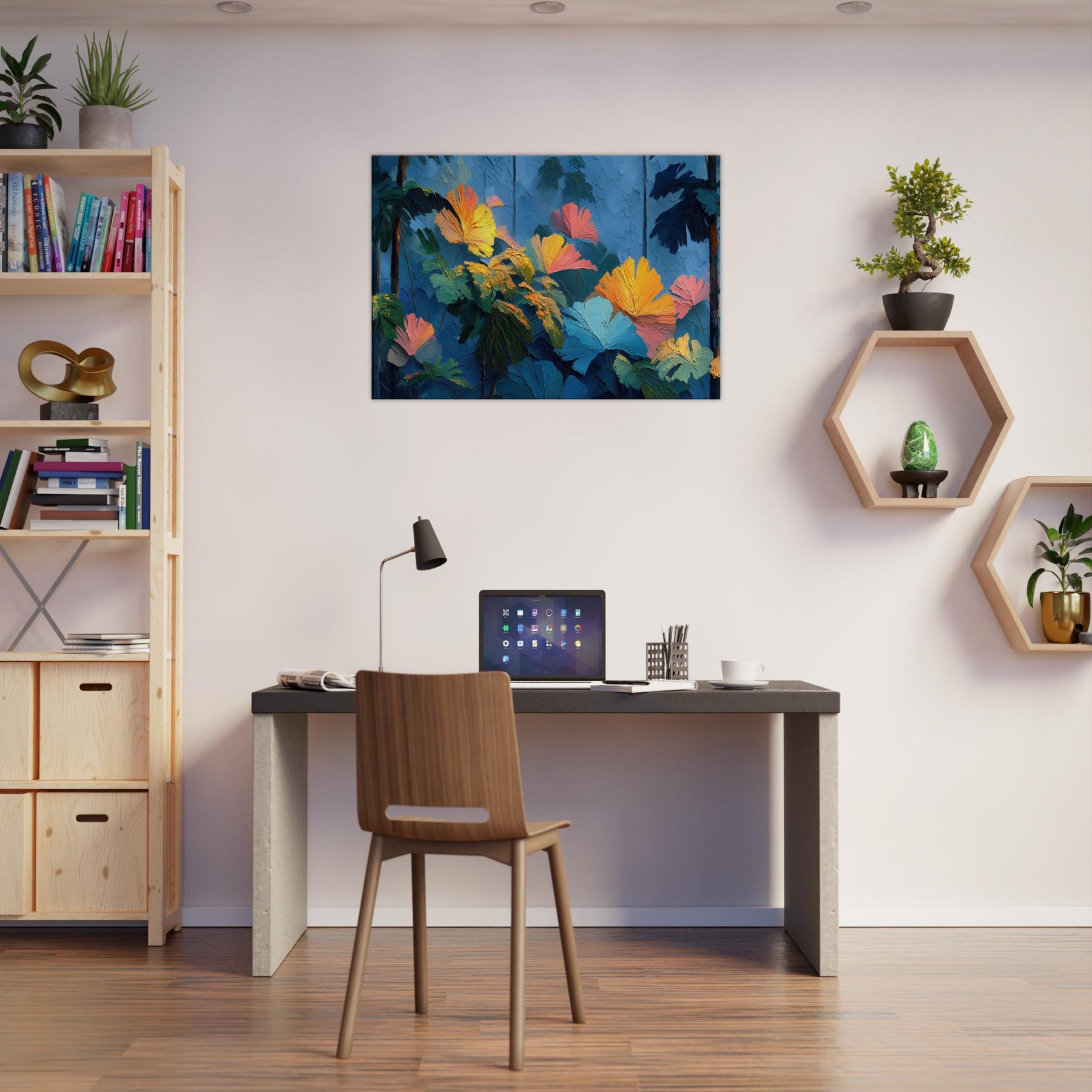 Let your space breathe with the Tropical Forest reimagined in lush, crystalline strokes. This abstract rich composition swells with cobalt skies, emerald leaves, and bursts of sunset orange that feel like sunlight pooled on a soft canvas. The texture invites a tactile glance, while the color chorus elevates a room with warmth and depth, turning a quiet corner into a sanctuary. Perfect above a sofa or in a reading nook, it whispers of distant jungles and the quiet pulse of nature indoors.