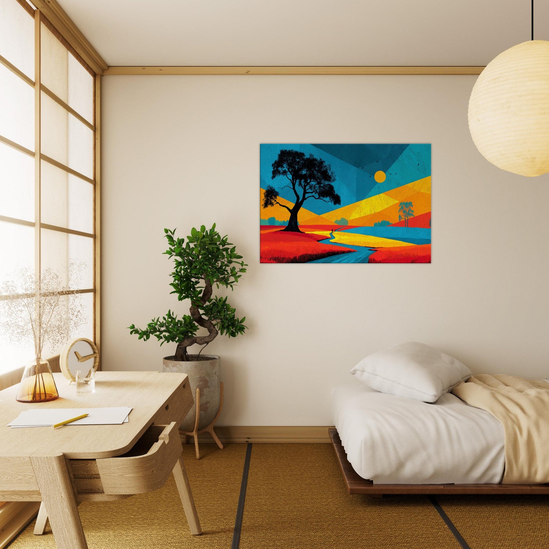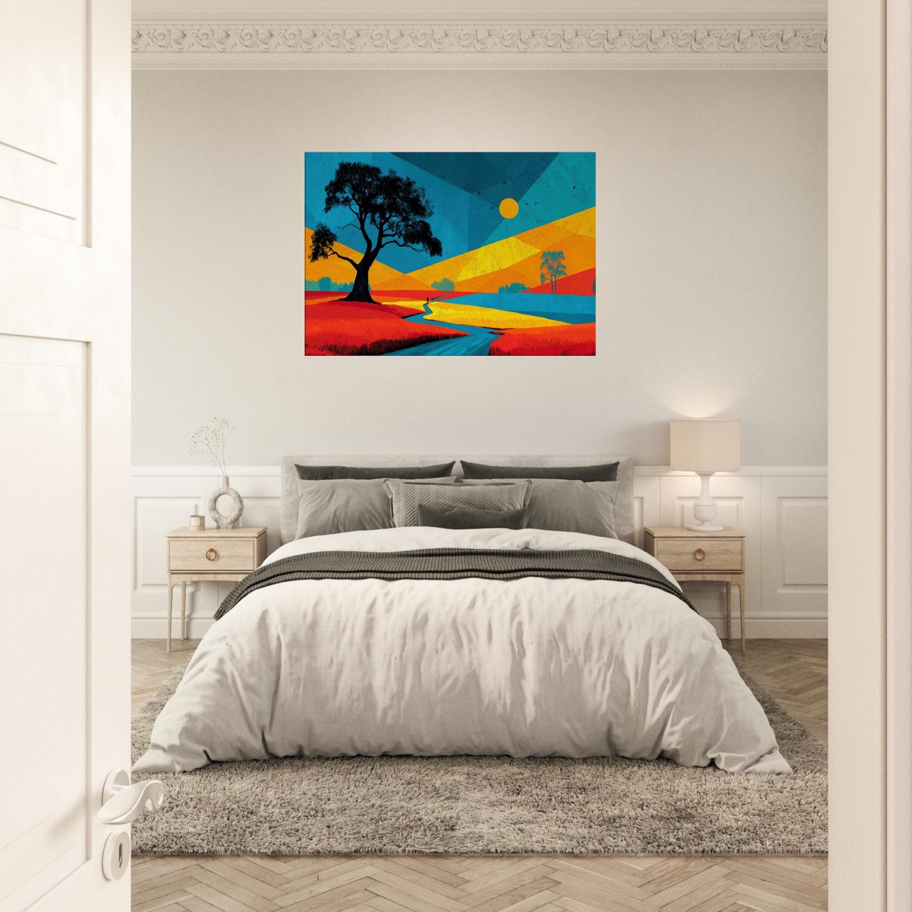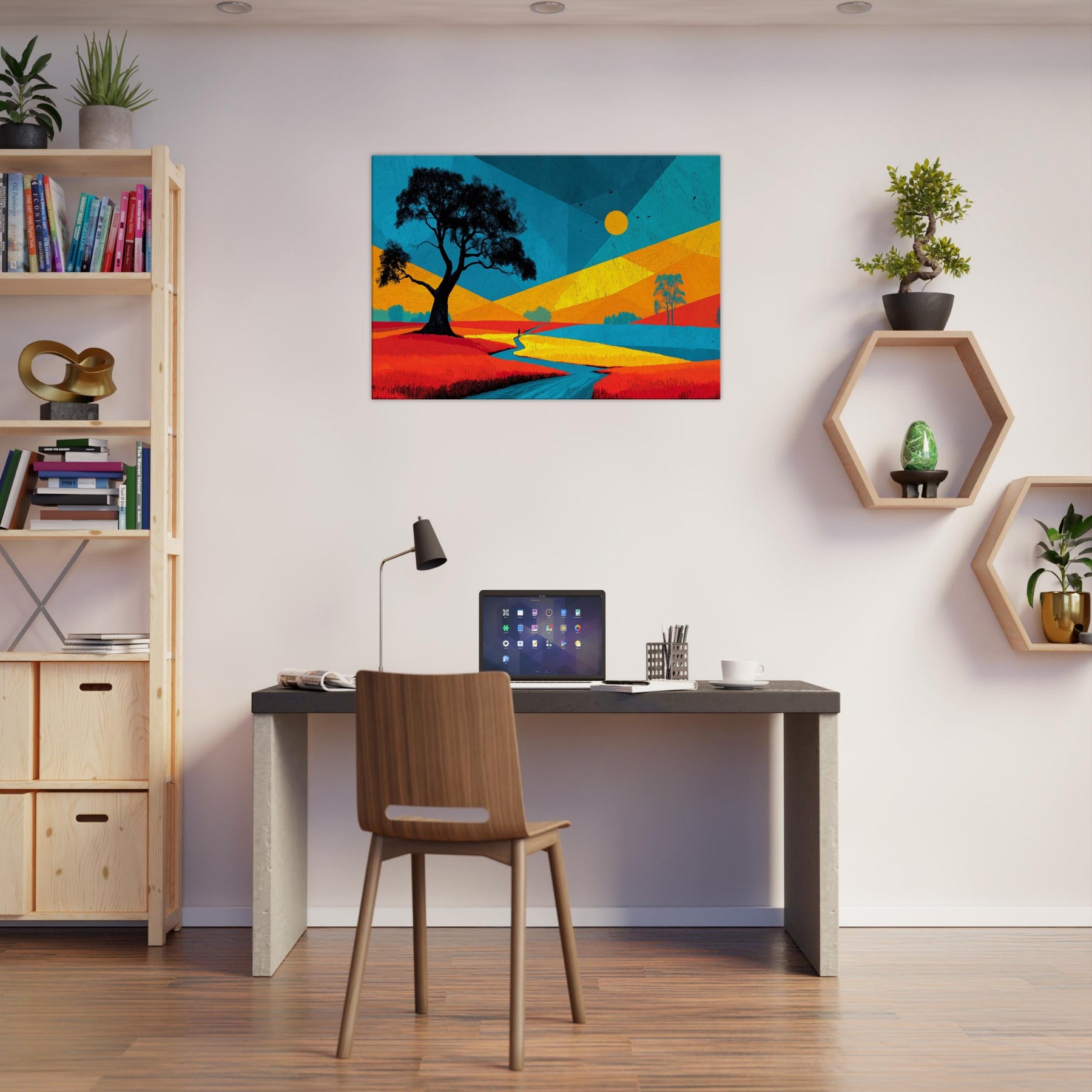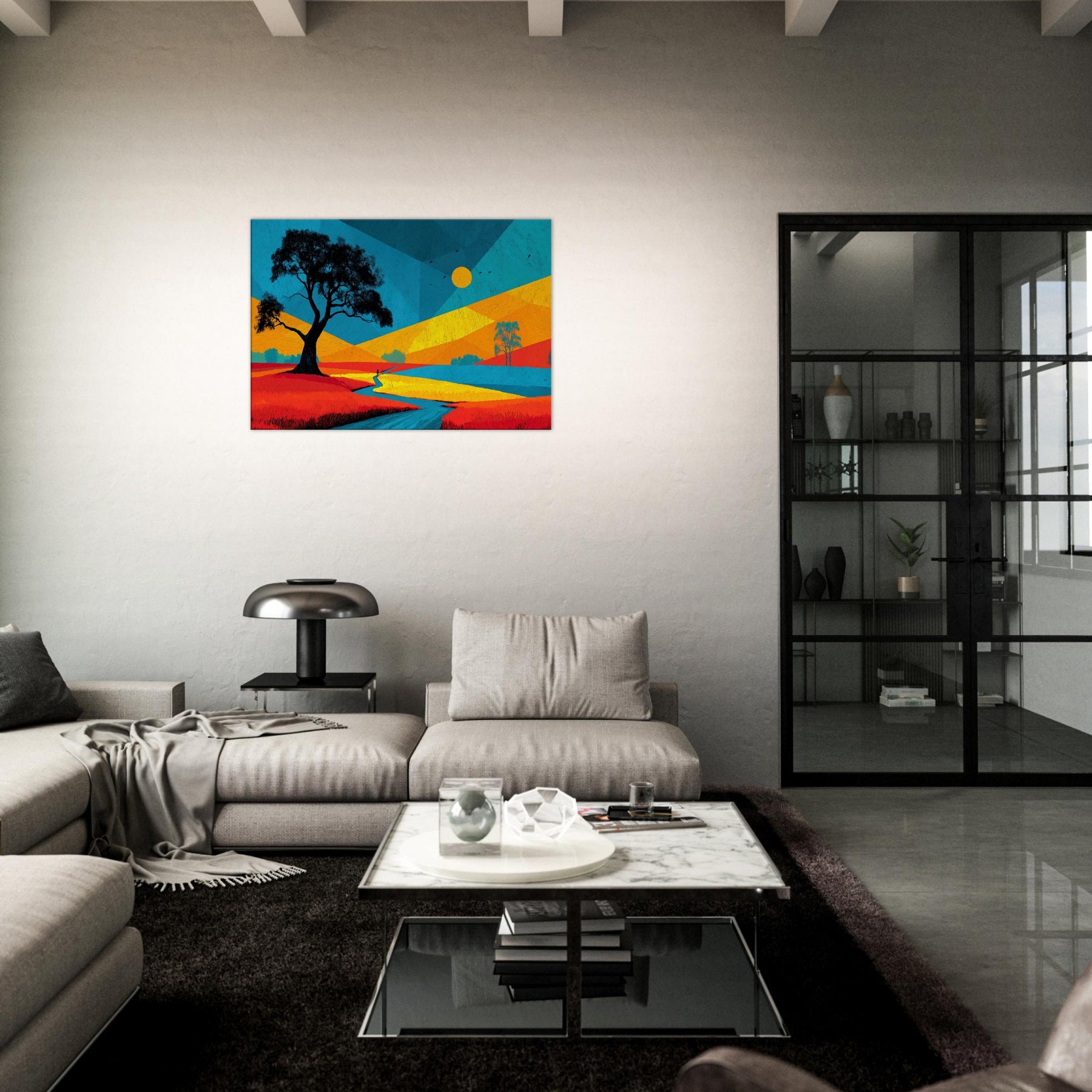 Step into a dreamlike realm where light and shadow stroll the rolling plains of a Foggy Forest depicted in bold, abstract color. This artwork dissolves edges into luminous bands of blue, gold, and red, inviting a quiet pulse of atmosphere into your living space. The piece breathes with you soft morning mist, distant treelines, and a winding river that glows with warmth transforming a room into a serene retreat of contemplation and cinema like mood.