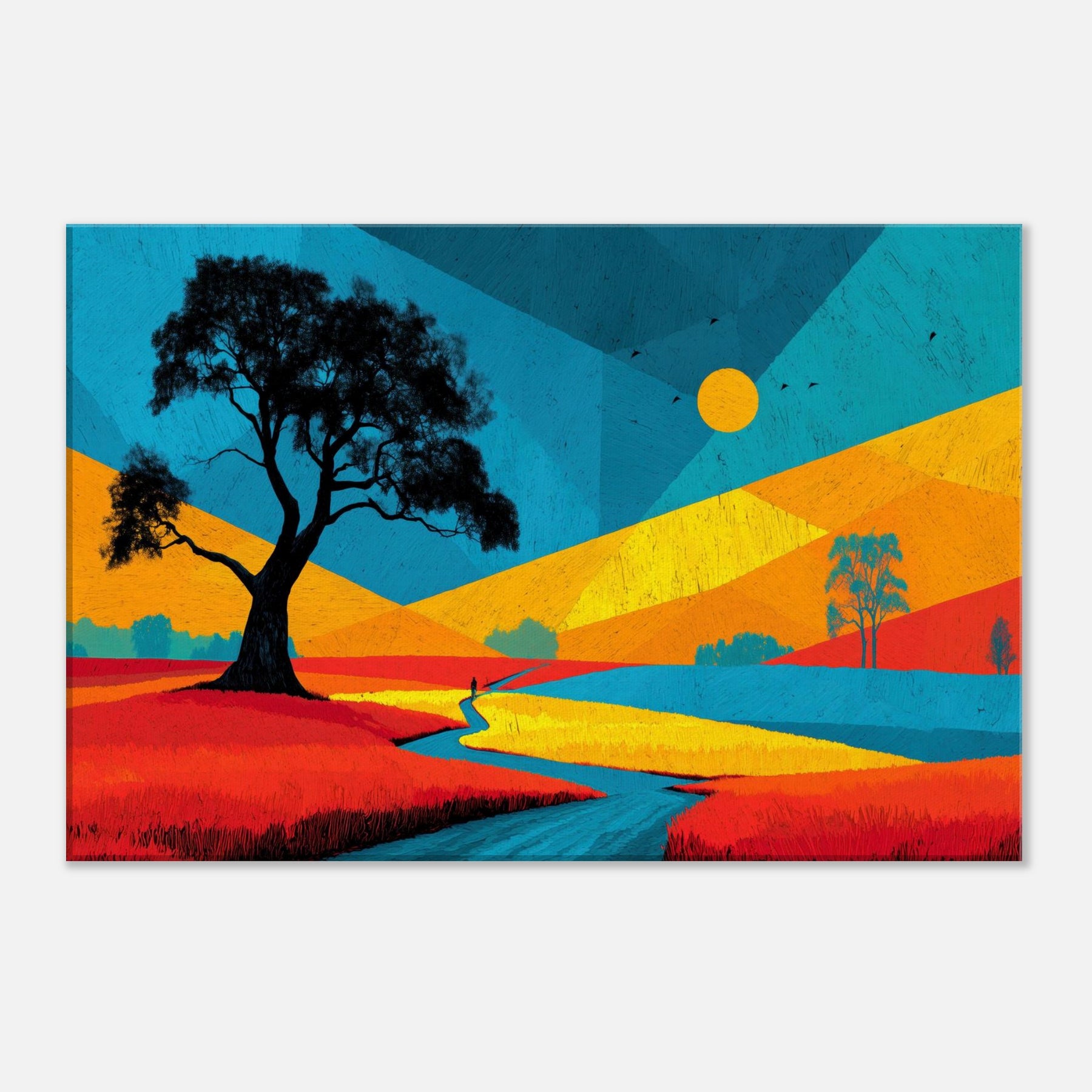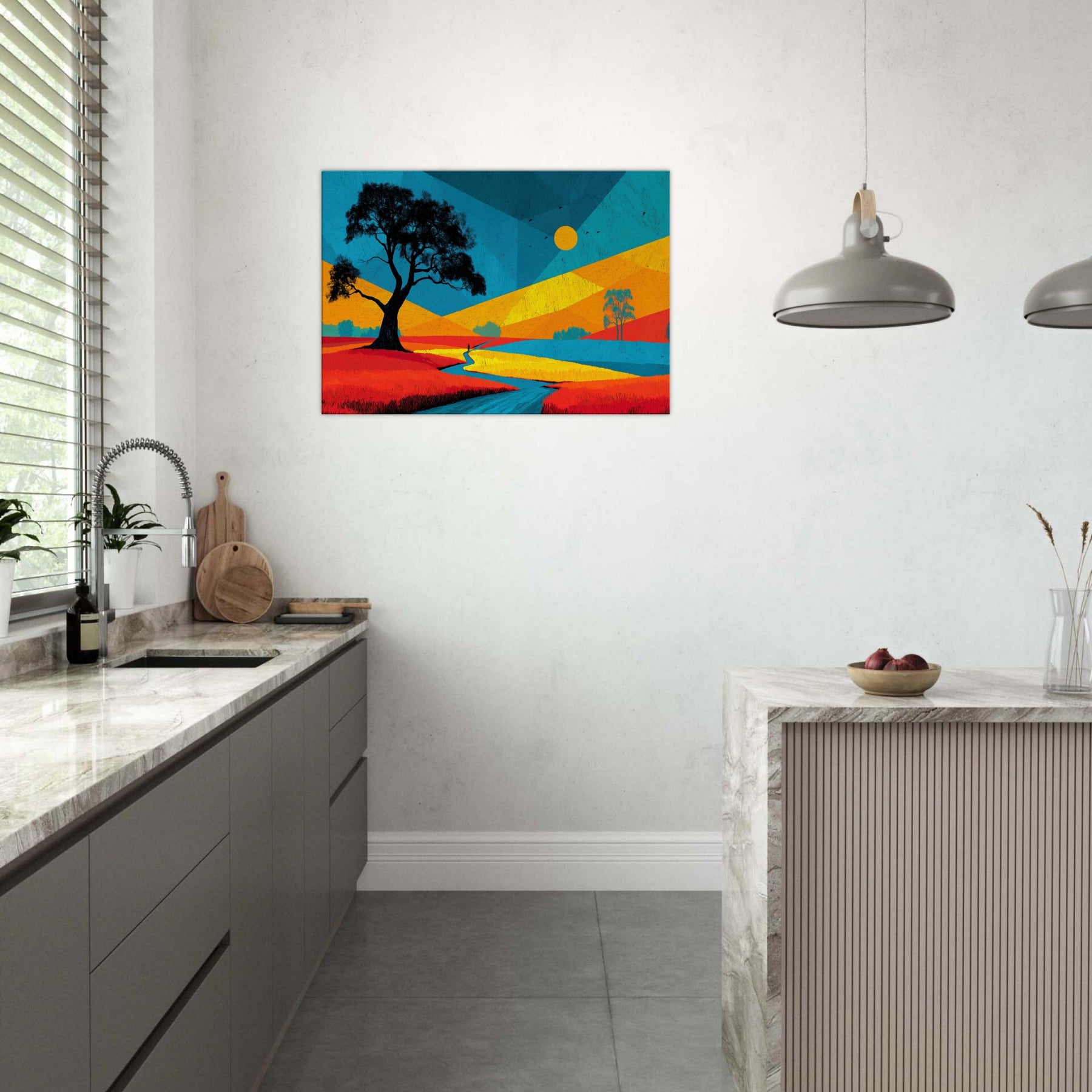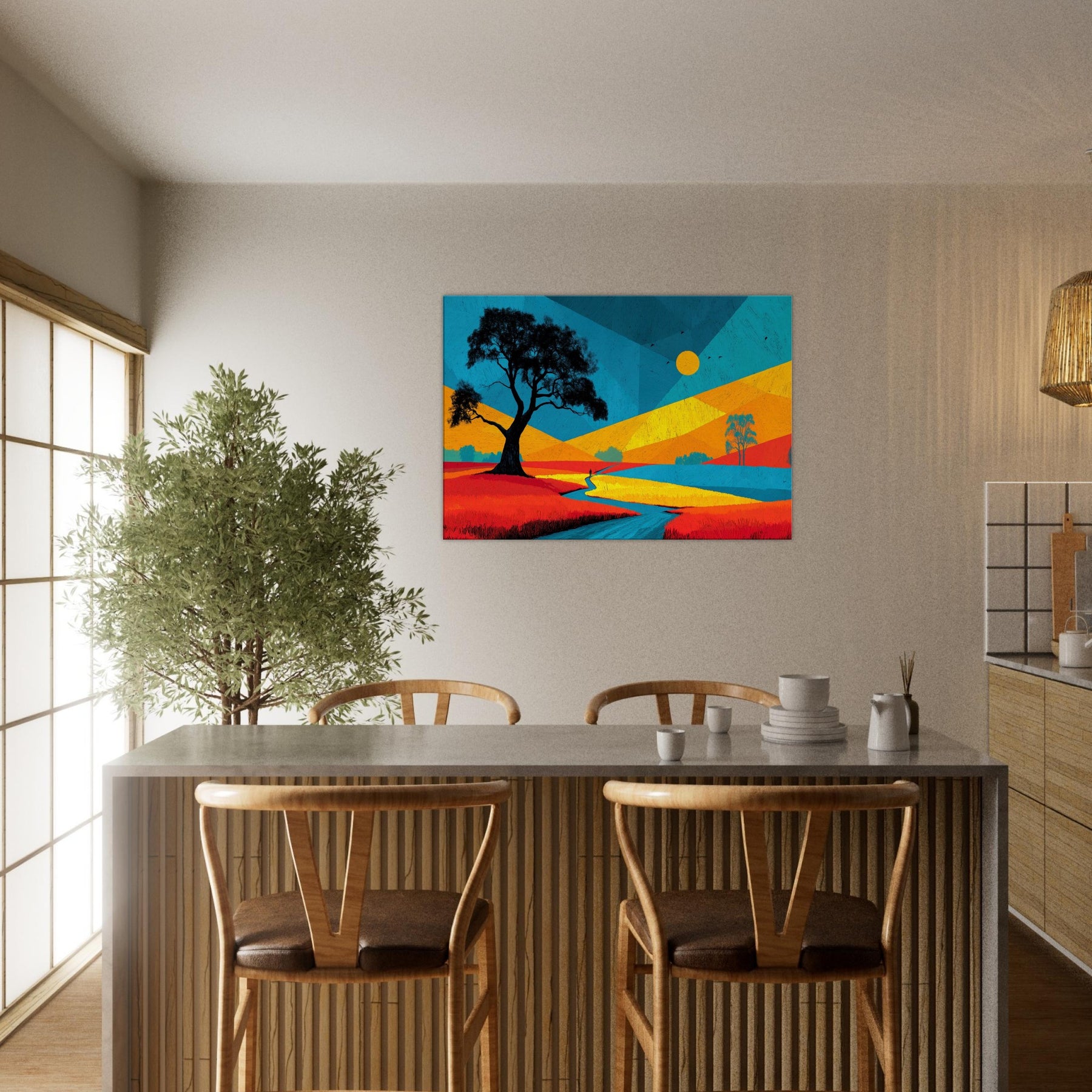 Step into a dreamlike realm where light and shadow stroll the rolling plains of a Foggy Forest depicted in bold, abstract color. This artwork dissolves edges into luminous bands of blue, gold, and red, inviting a quiet pulse of atmosphere into your living space. The piece breathes with you soft morning mist, distant treelines, and a winding river that glows with warmth transforming a room into a serene retreat of contemplation and cinema like mood.