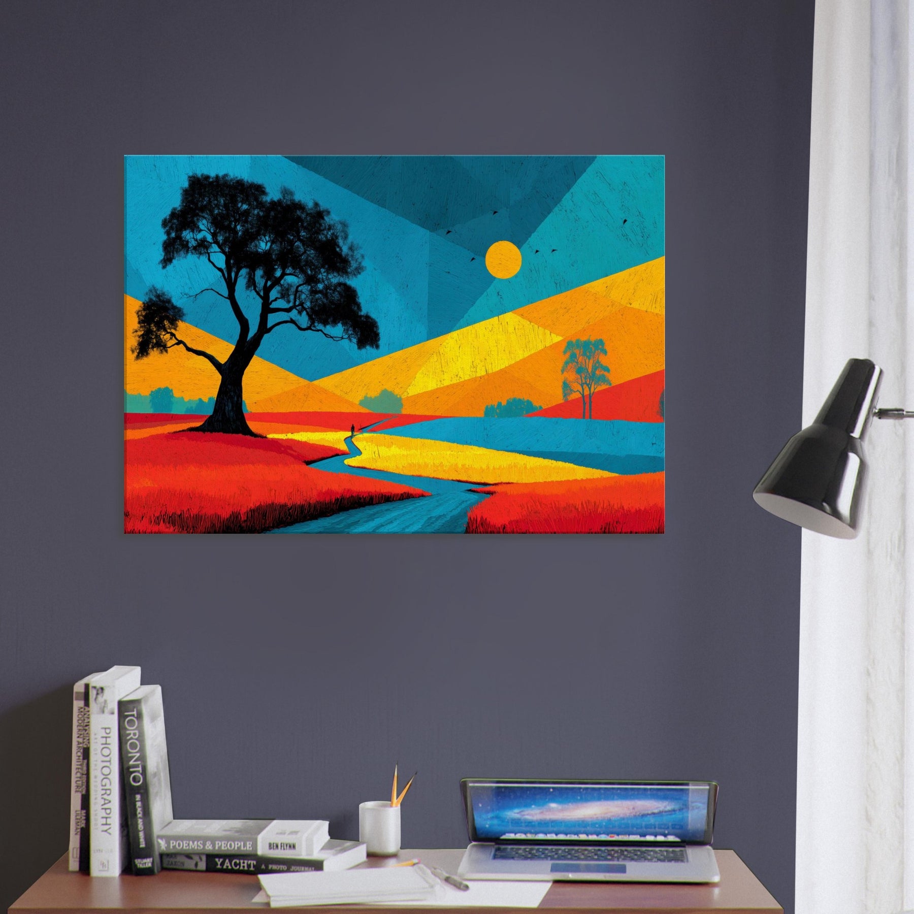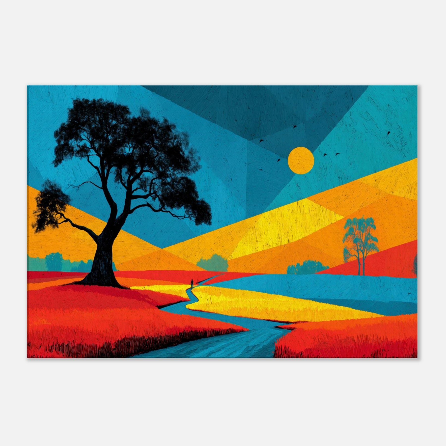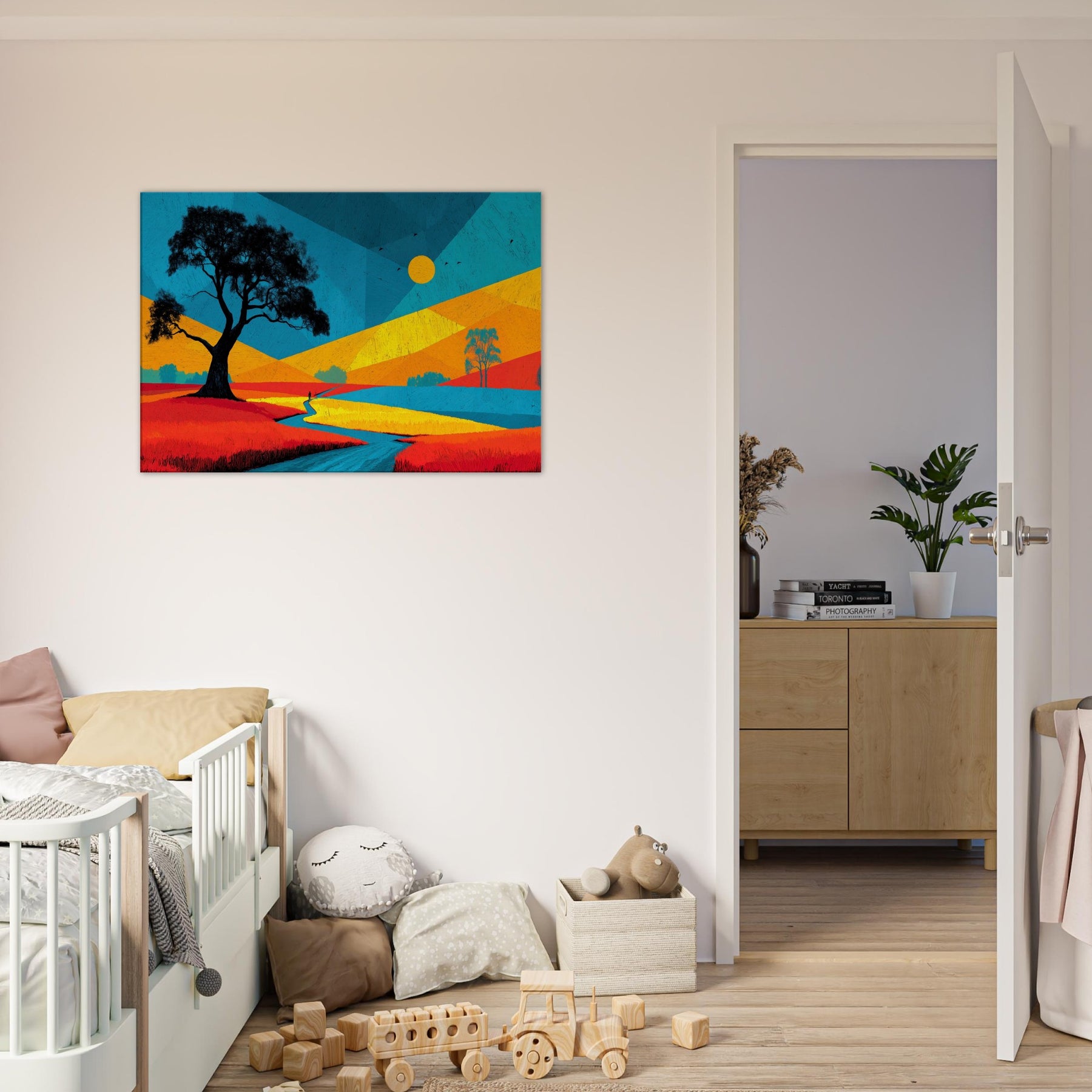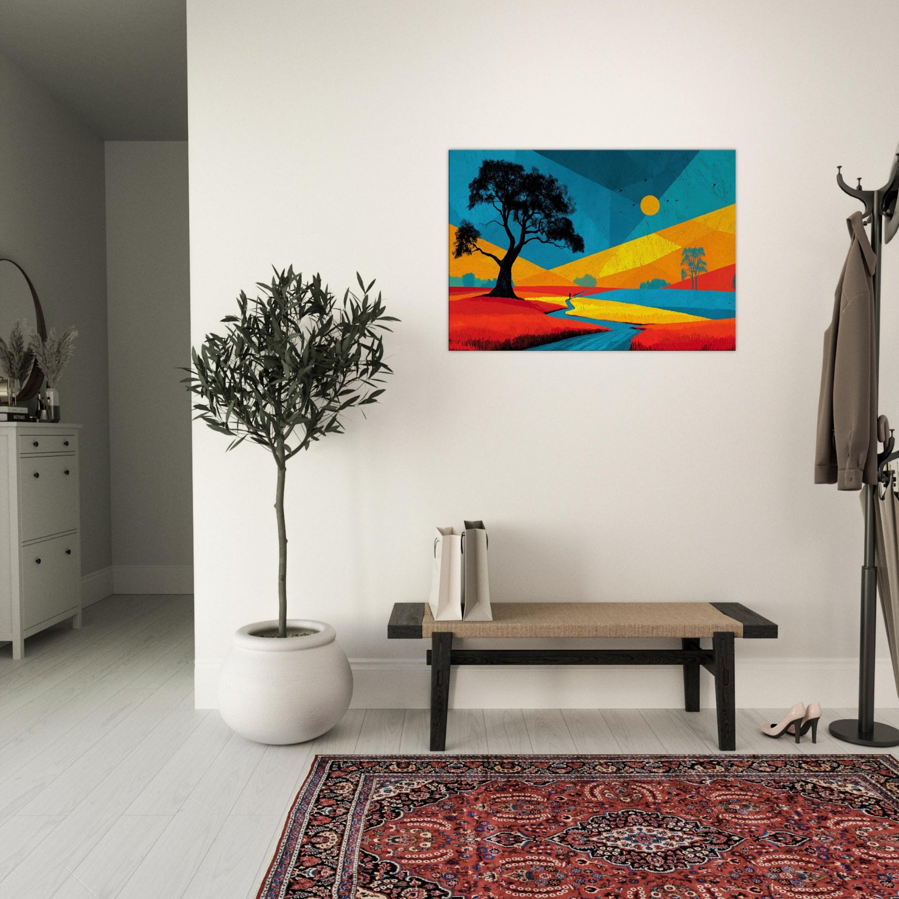 Step into a dreamlike realm where light and shadow stroll the rolling plains of a Foggy Forest depicted in bold, abstract color. This artwork dissolves edges into luminous bands of blue, gold, and red, inviting a quiet pulse of atmosphere into your living space. The piece breathes with you soft morning mist, distant treelines, and a winding river that glows with warmth transforming a room into a serene retreat of contemplation and cinema like mood.
