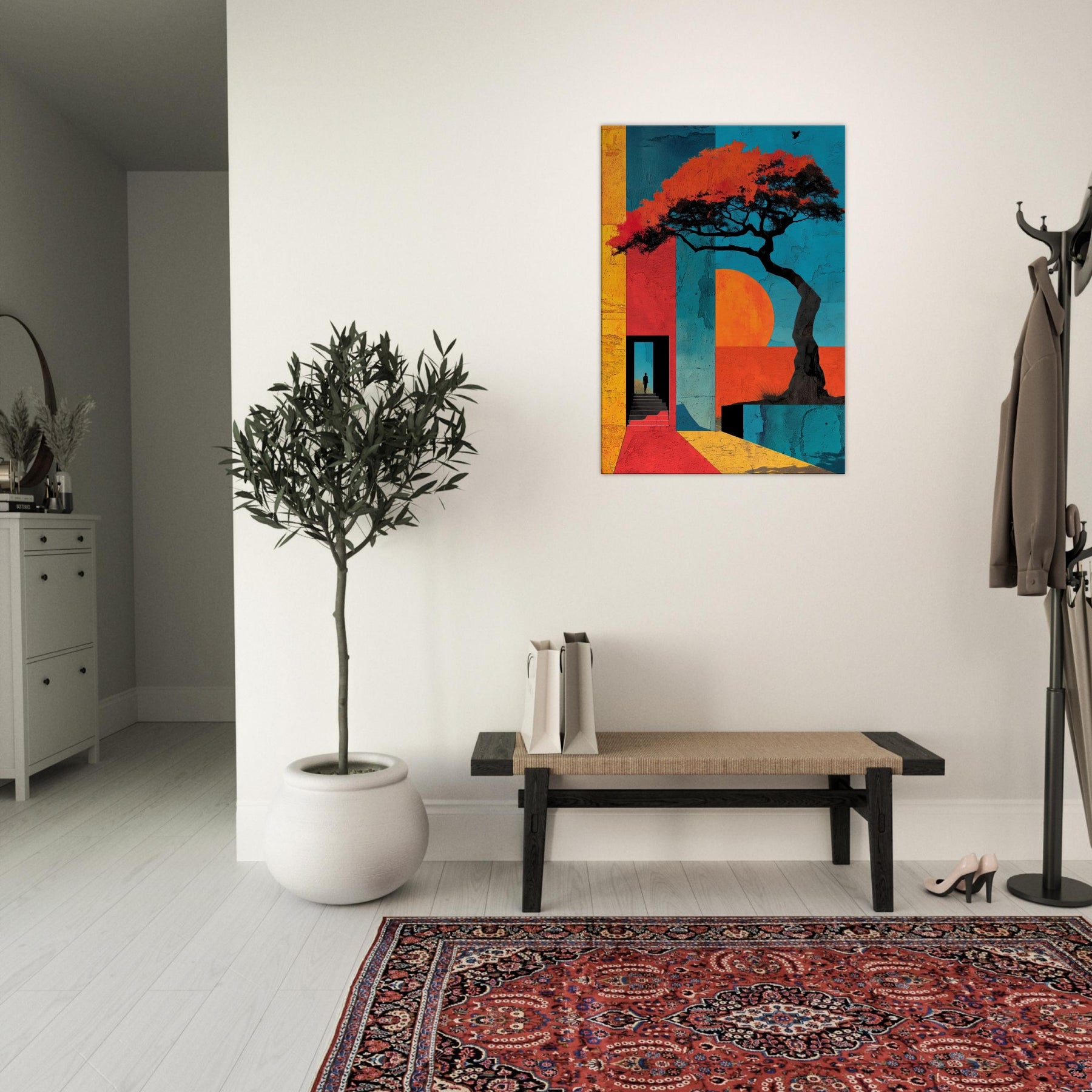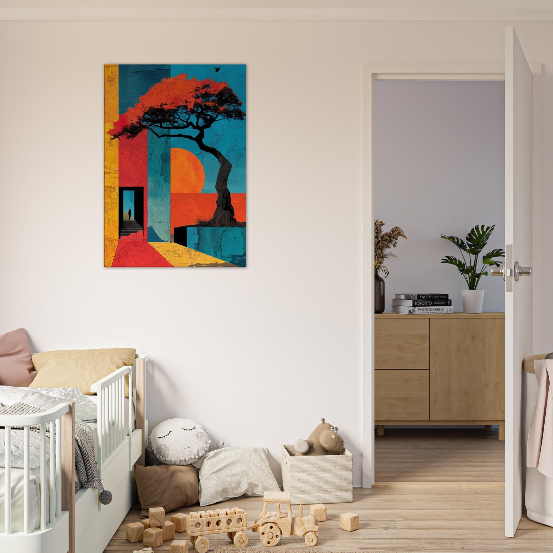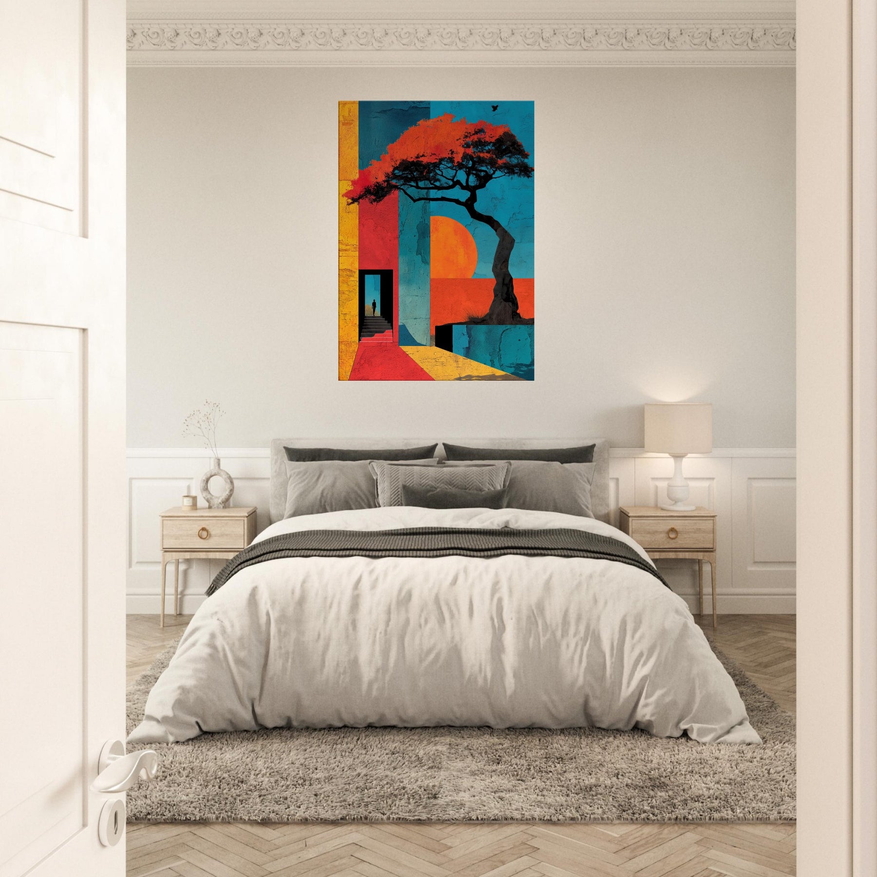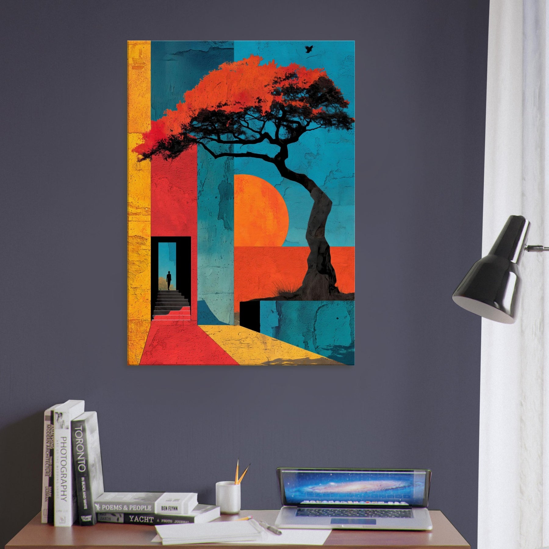 This Jungle inspired abstract scene sweeps color and form into a dreamlike , inviting the viewer to step through a doorway toward a sunlit terrace. Bold teal, orange, and ochre blocks coexist with a sculptural tree silhouette, its canopy a fire of coral. The atmosphere feels both serene and electric, like a whispered breeze and a heartbeat. Hang it in a living room or hallway to deepen textures, spark conversation, and warm the room with a sense of nature’s mystery and modern artistry.