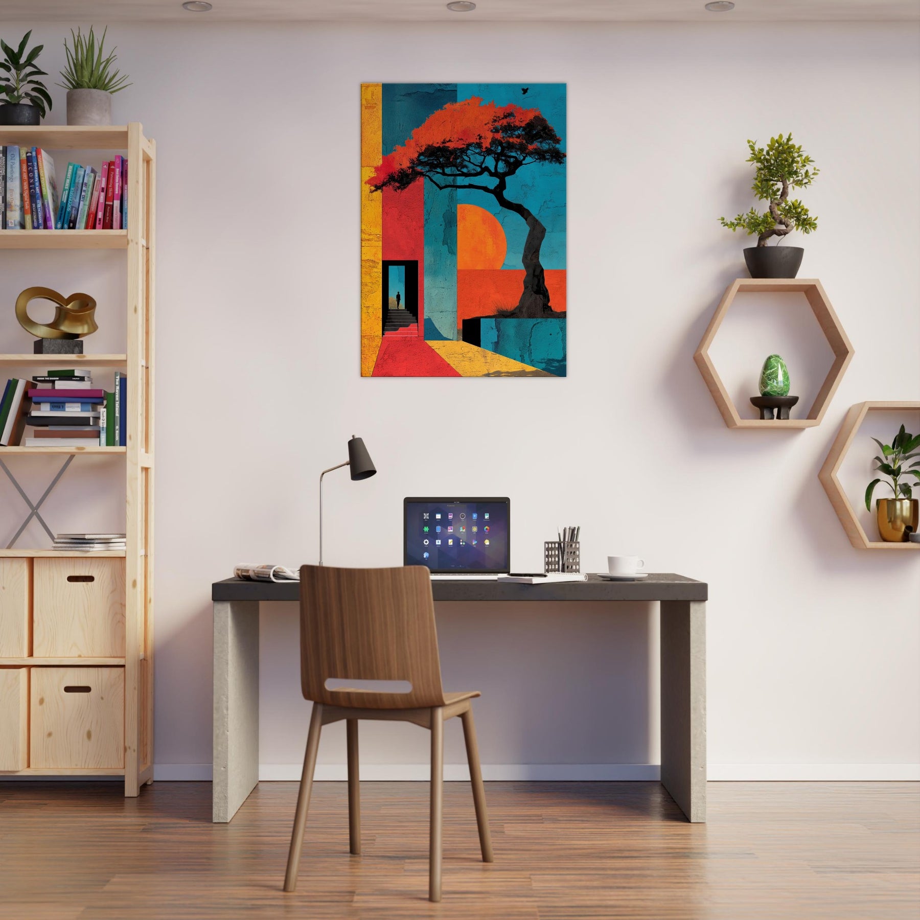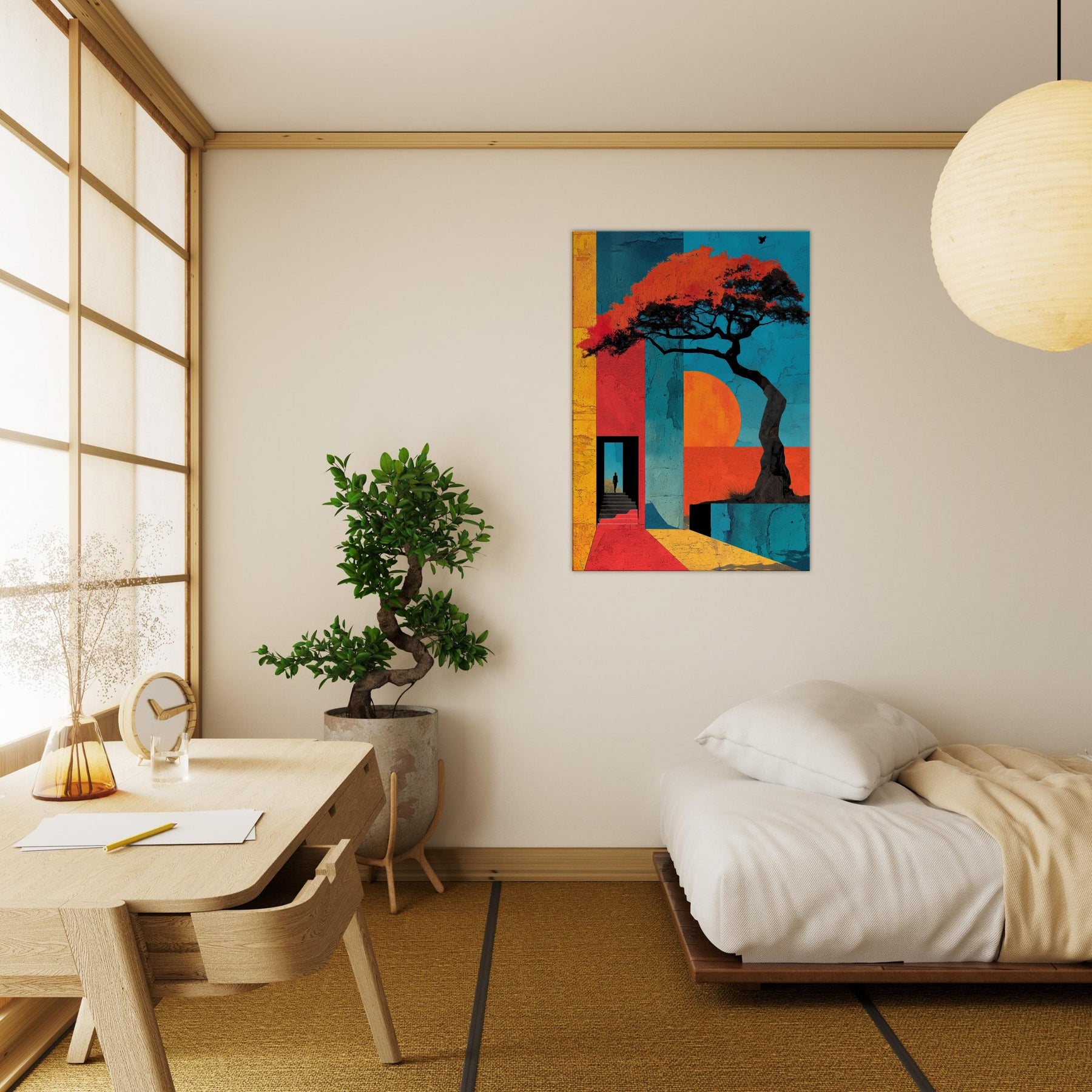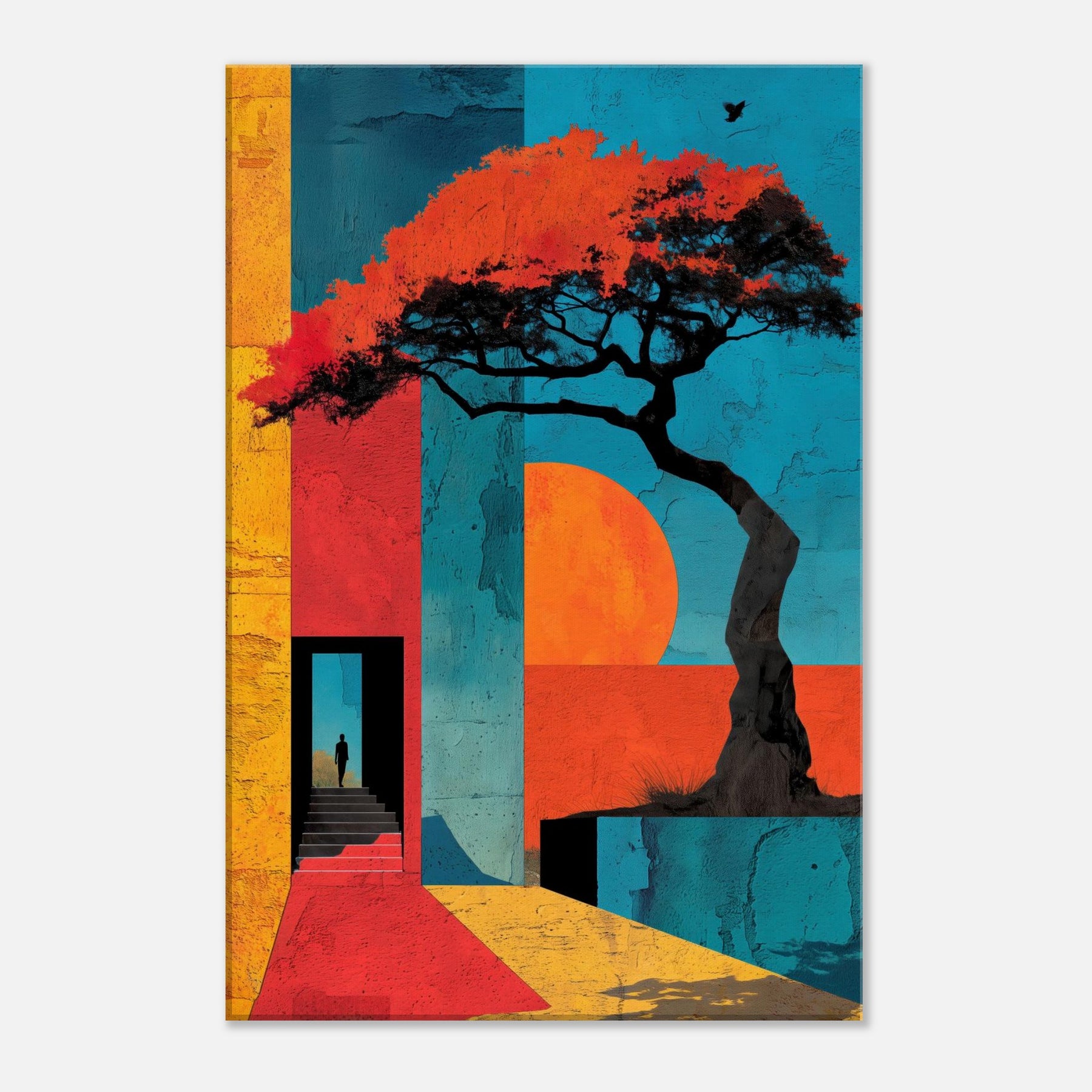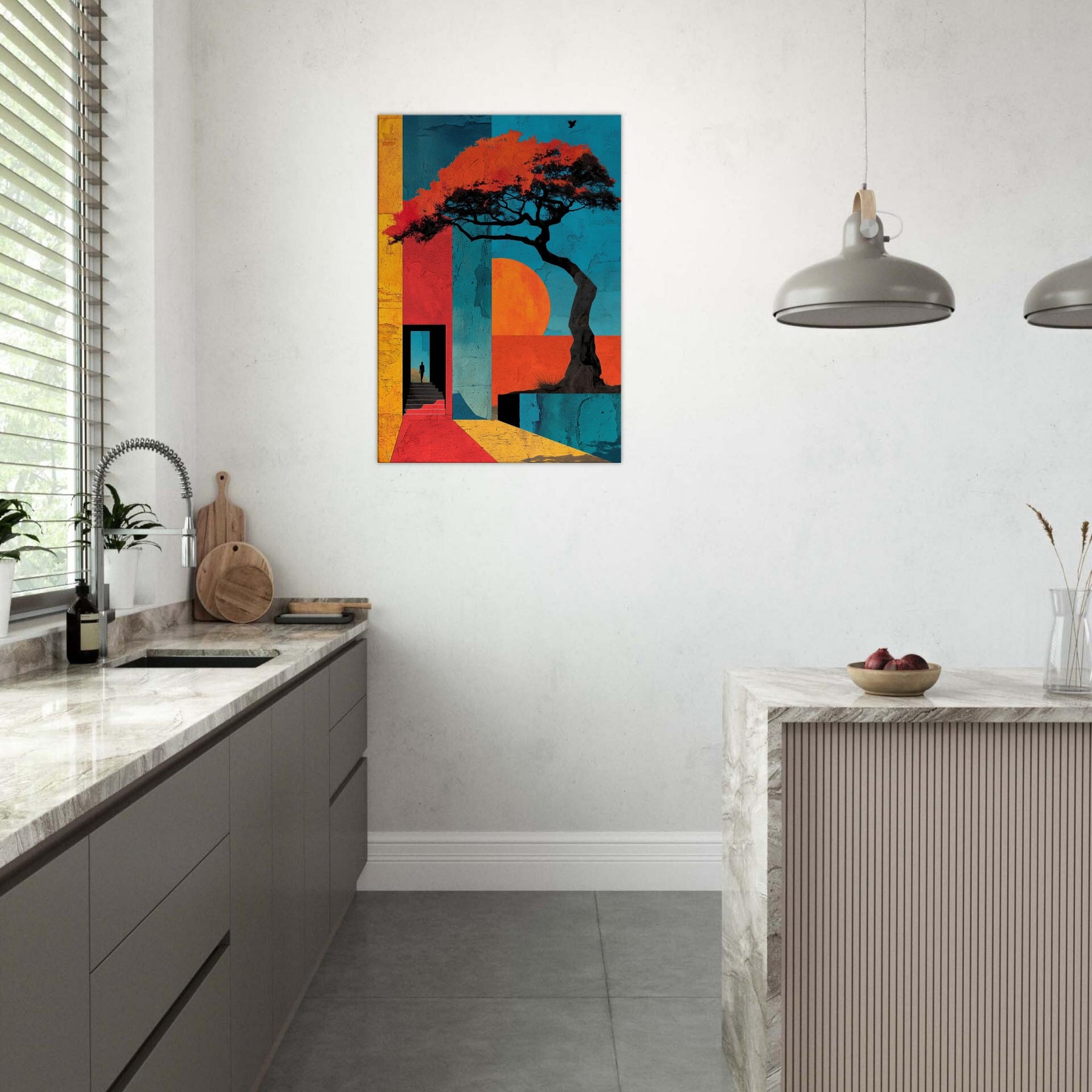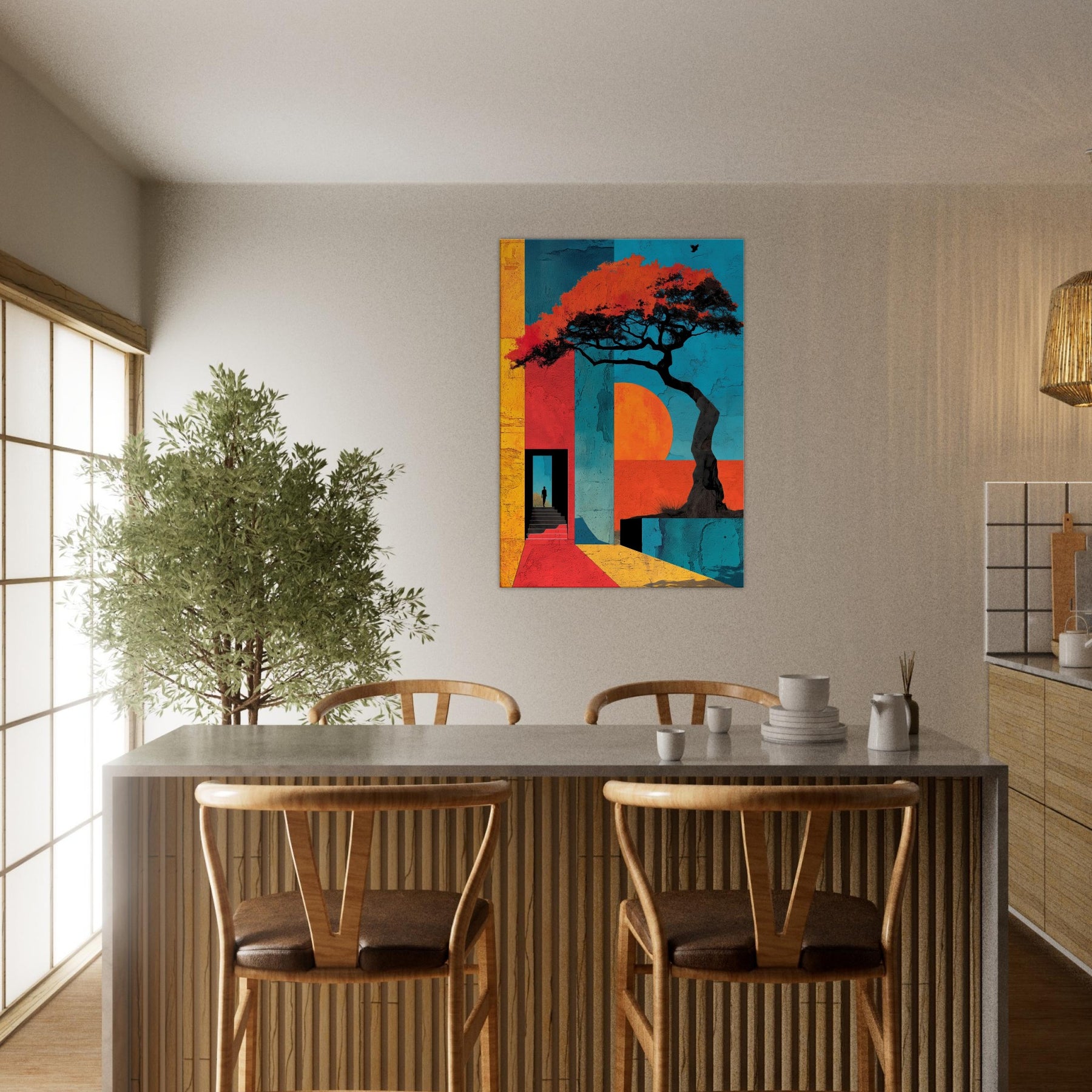 This Jungle inspired abstract scene sweeps color and form into a dreamlike , inviting the viewer to step through a doorway toward a sunlit terrace. Bold teal, orange, and ochre blocks coexist with a sculptural tree silhouette, its canopy a fire of coral. The atmosphere feels both serene and electric, like a whispered breeze and a heartbeat. Hang it in a living room or hallway to deepen textures, spark conversation, and warm the room with a sense of nature’s mystery and modern artistry.