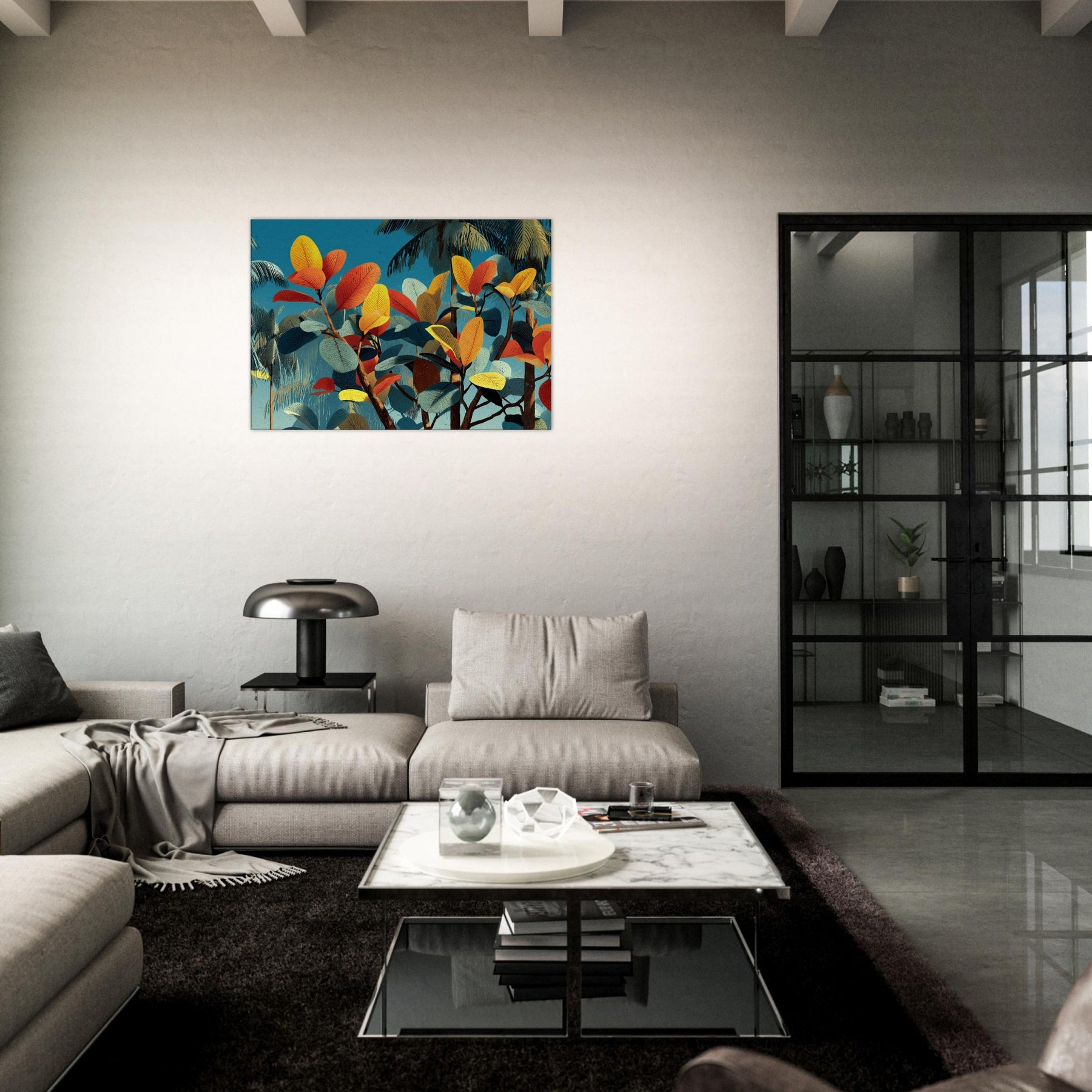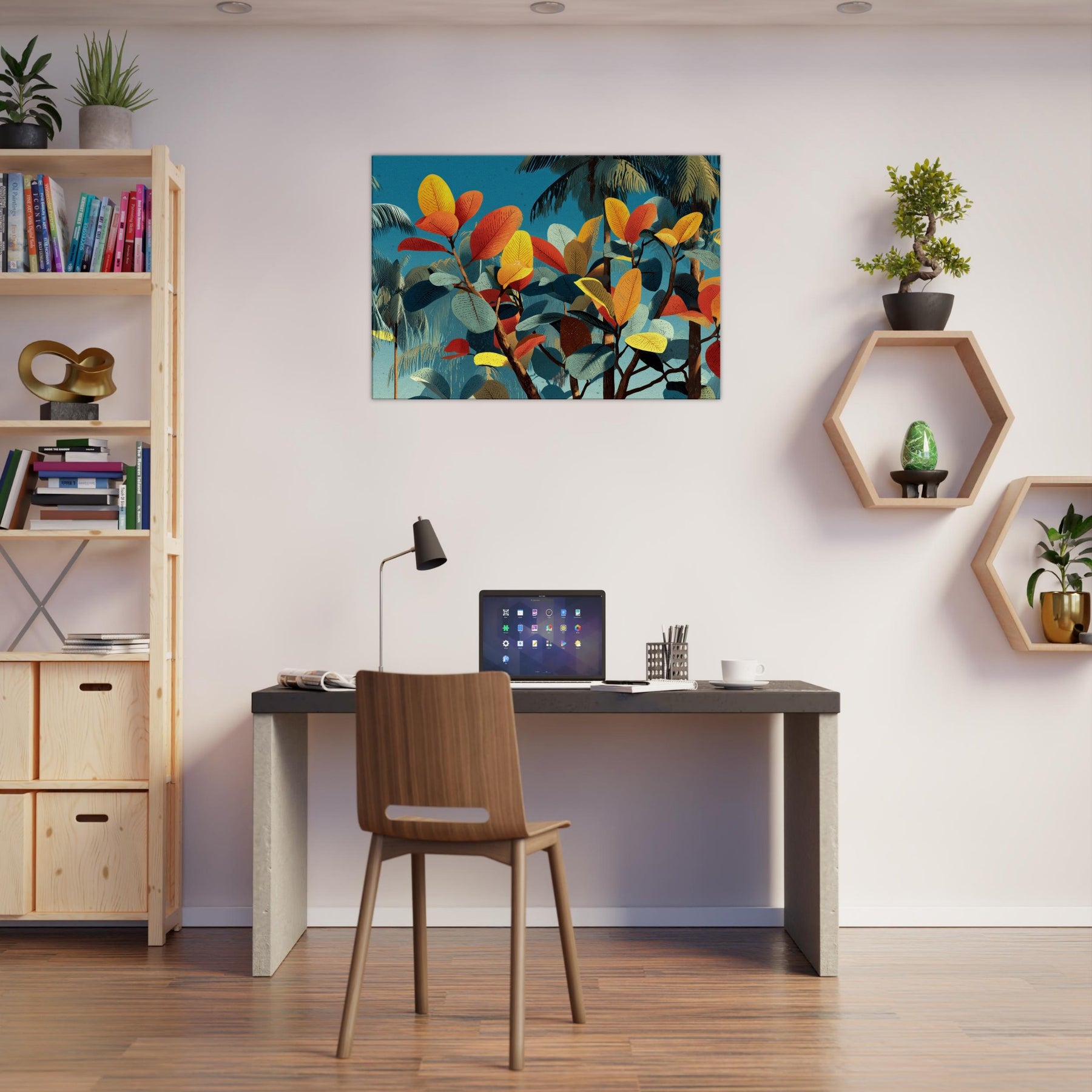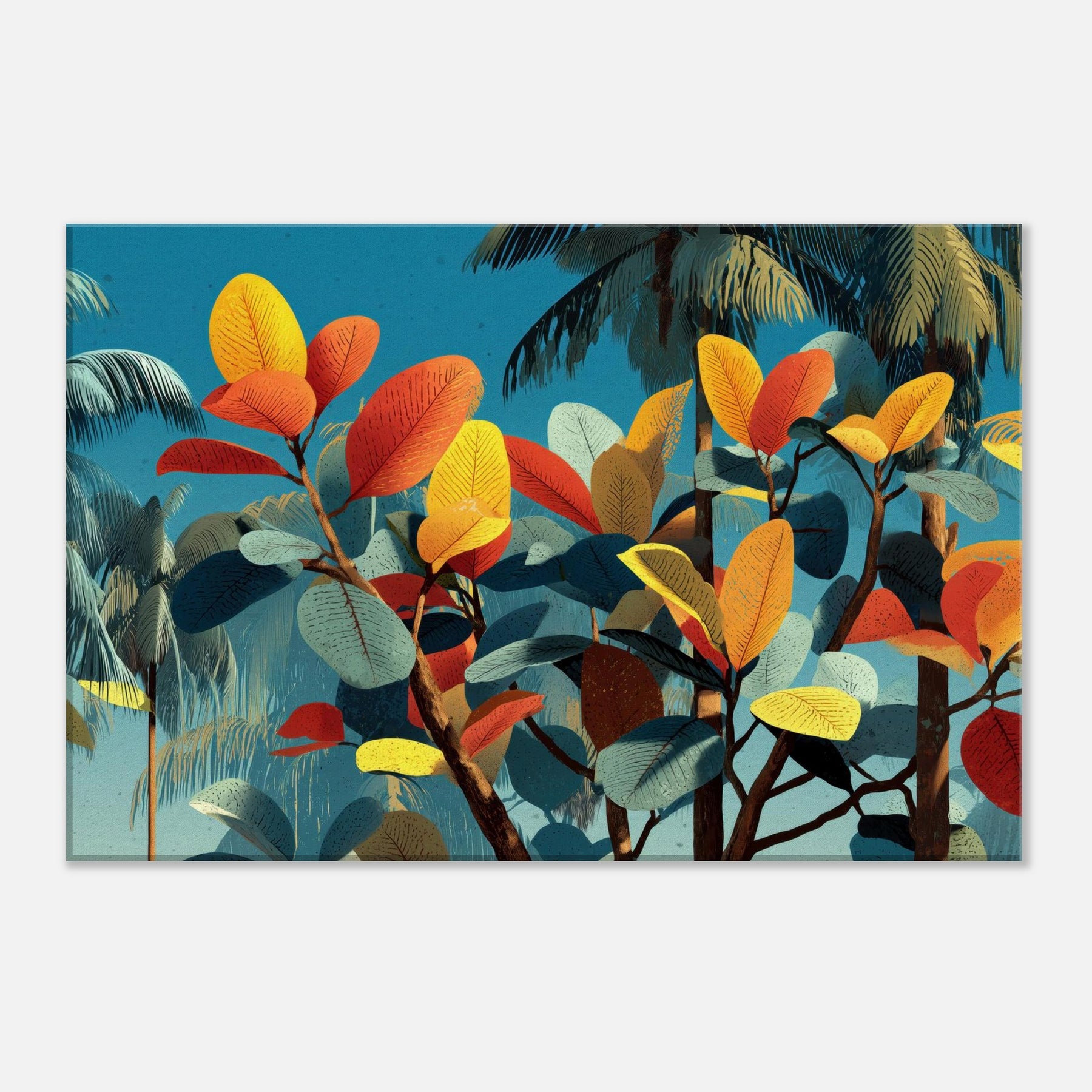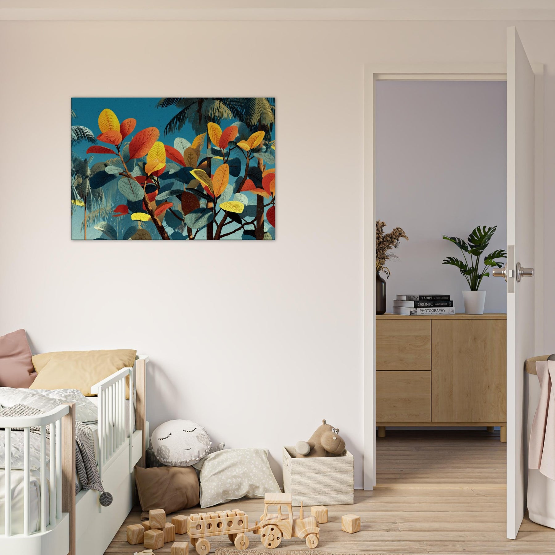 Immerse your space in a lush Jungle where color and form collide in cyan and sunlit shades. This abstract composition sweeps vibrant leaves across a twilight blue backdrop, inviting the eye to wander through a dreamlike canopy. The tactile textures and layered tones evoke a warm breeze and distant tropical light, turning any wall into a living center of mood. Perfect for a living room or bedroom, it adds depth, energy, and a refined, nature inspired elegance.
