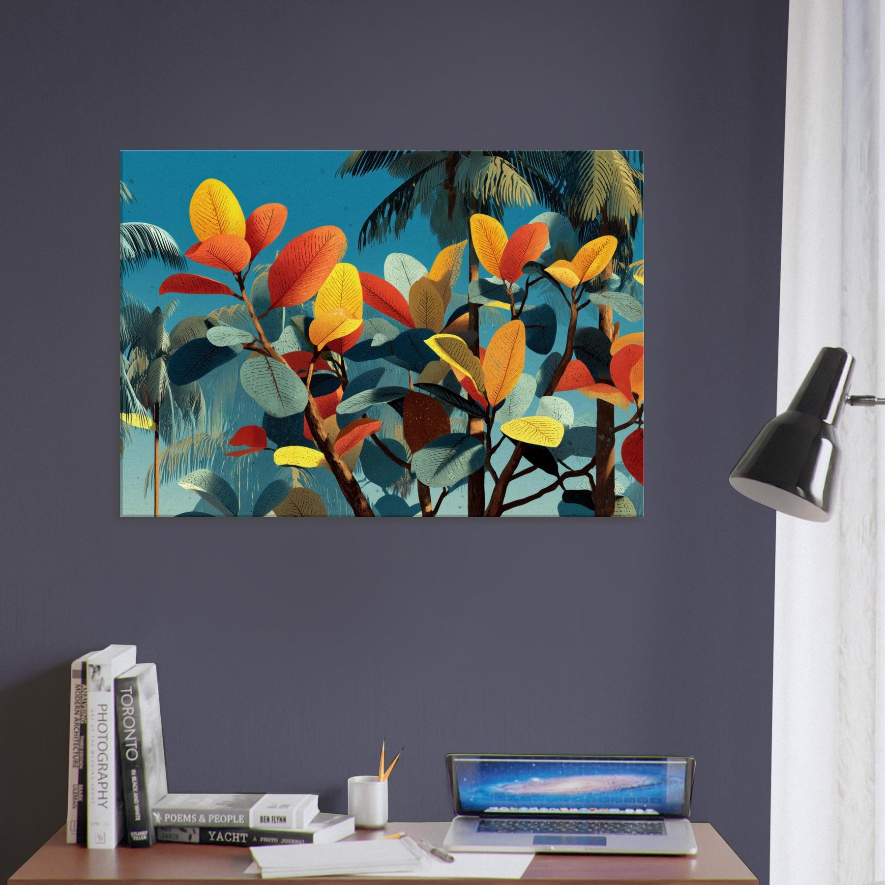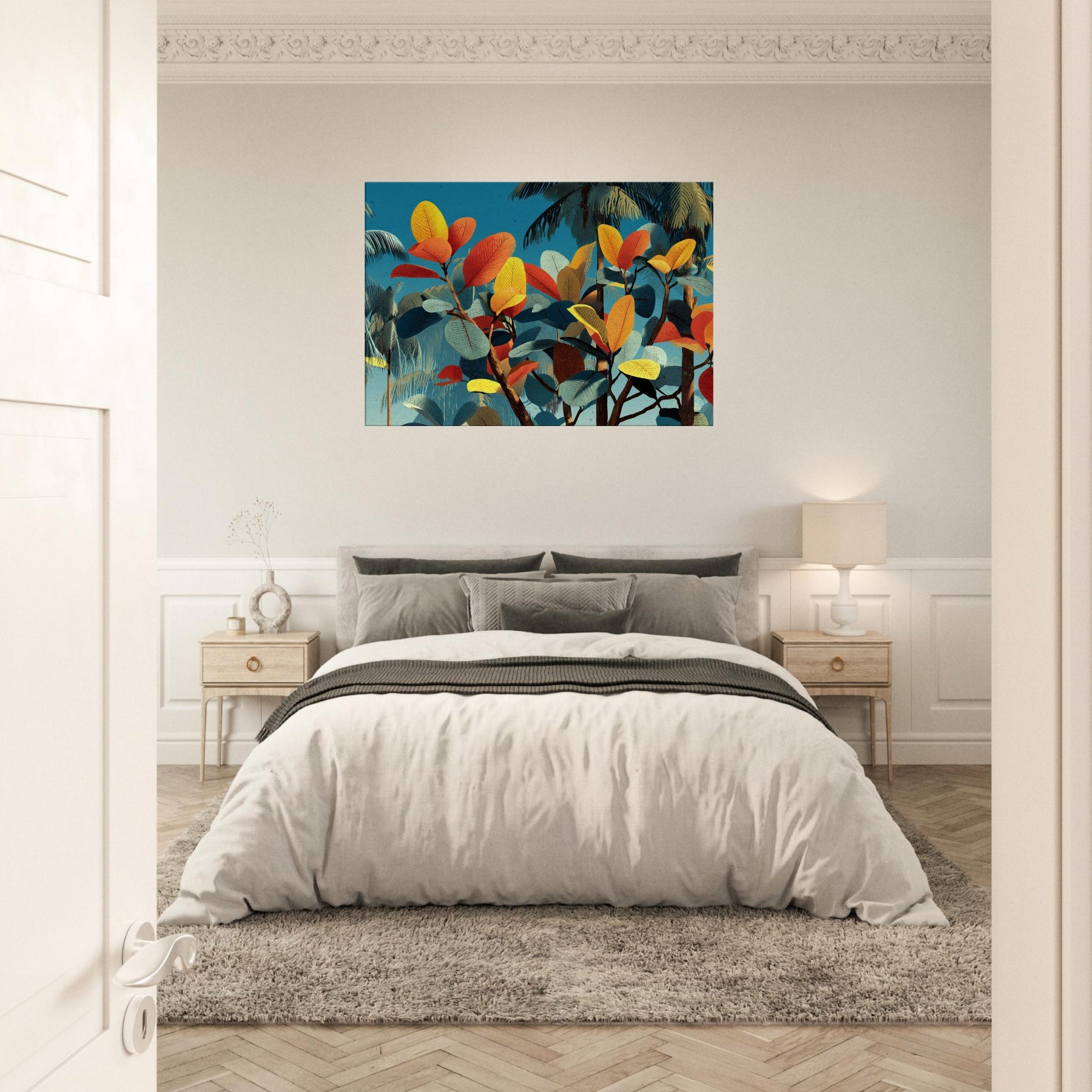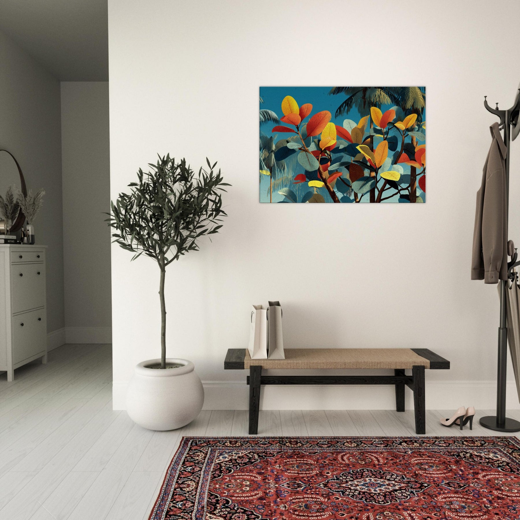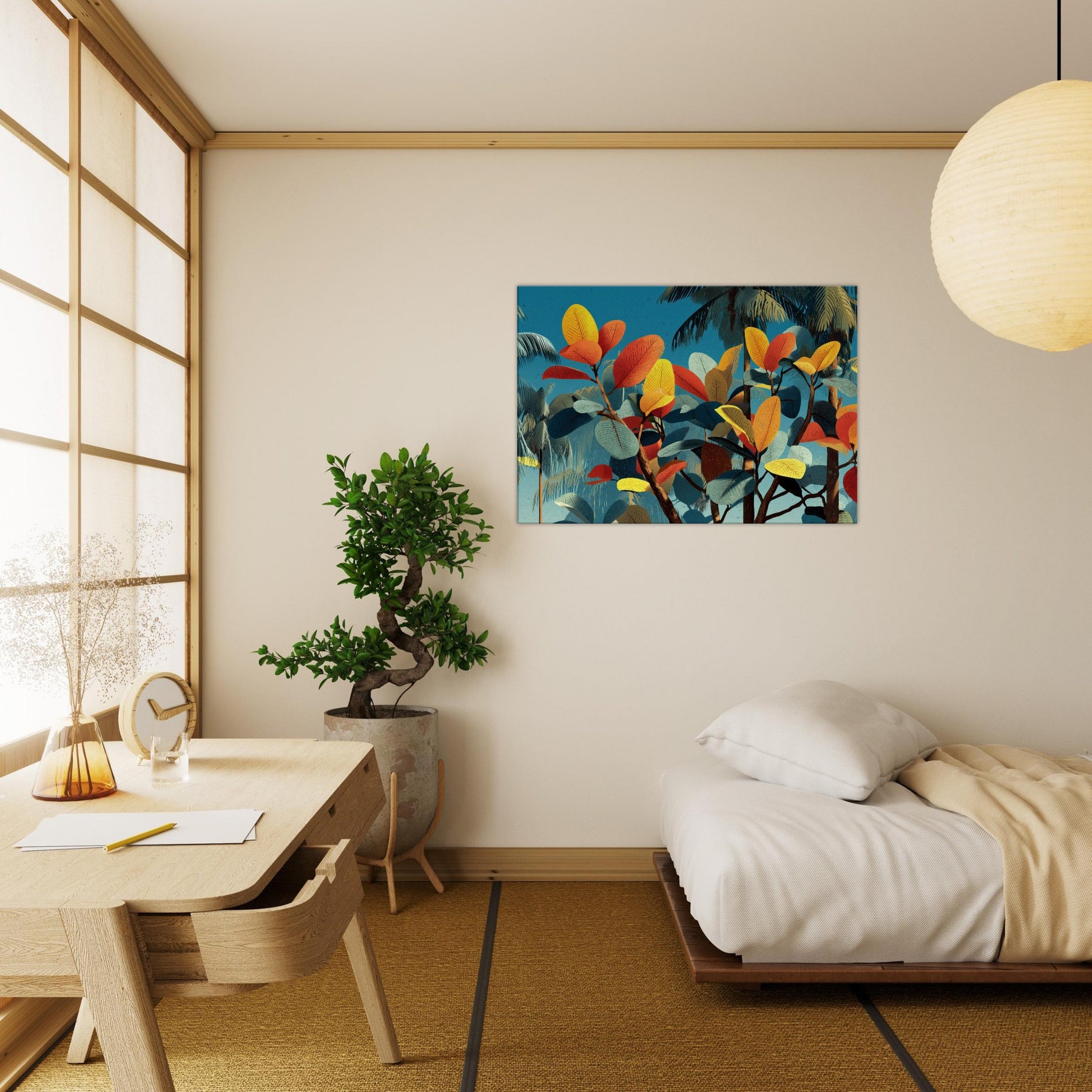 Immerse your space in a lush Jungle where color and form collide in cyan and sunlit shades. This abstract composition sweeps vibrant leaves across a twilight blue backdrop, inviting the eye to wander through a dreamlike canopy. The tactile textures and layered tones evoke a warm breeze and distant tropical light, turning any wall into a living center of mood. Perfect for a living room or bedroom, it adds depth, energy, and a refined, nature inspired elegance.