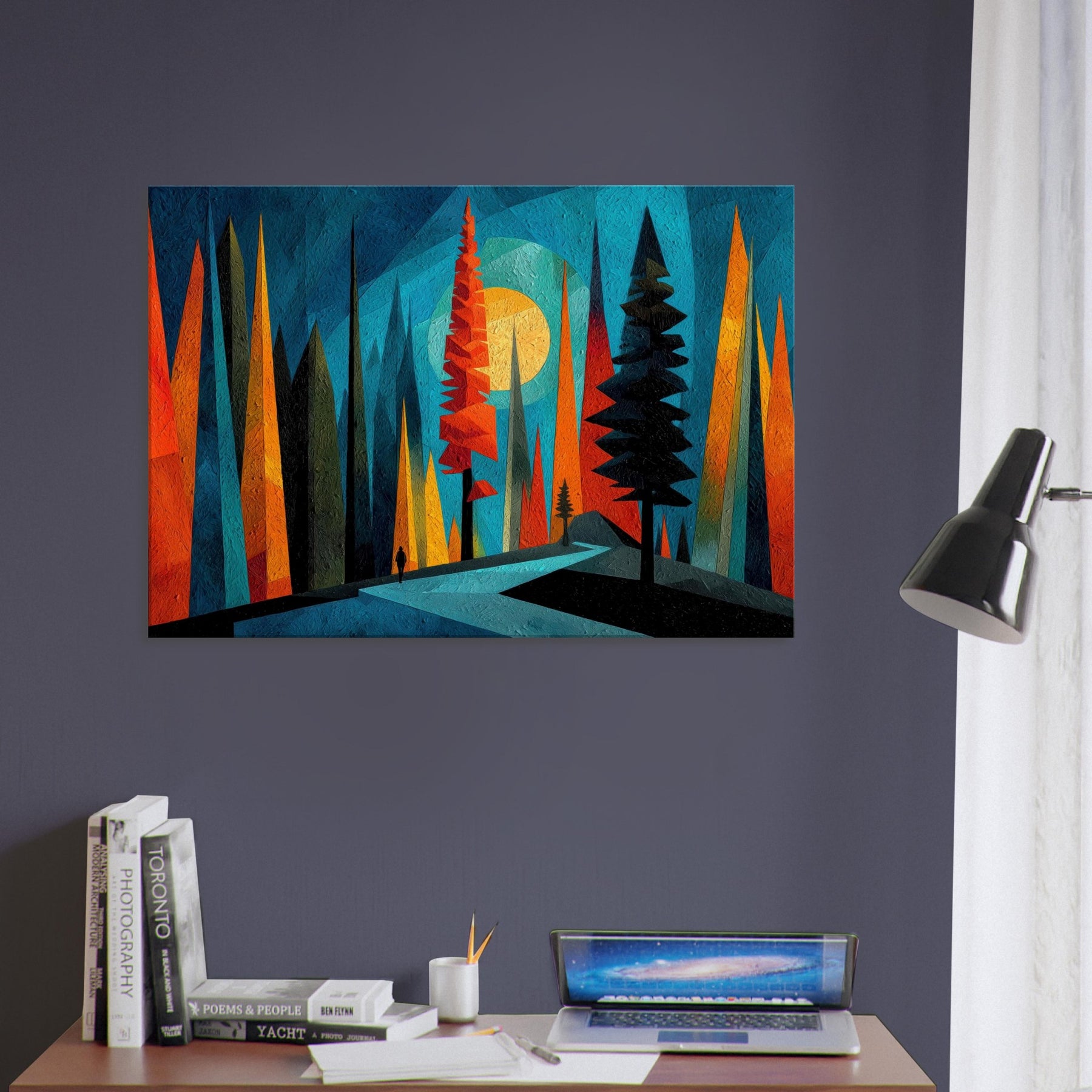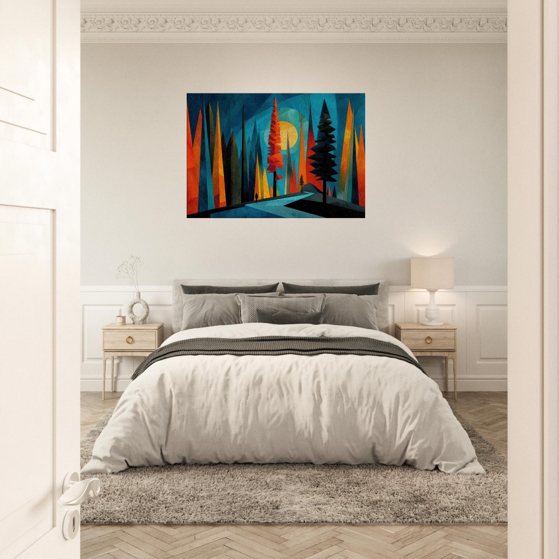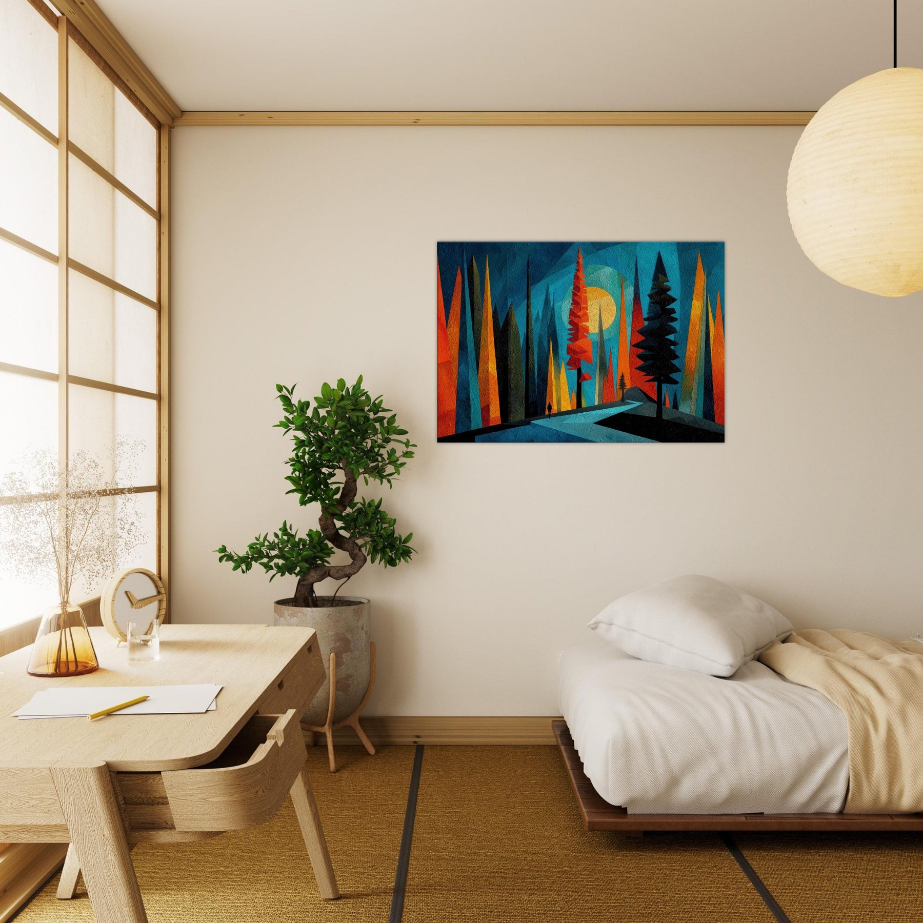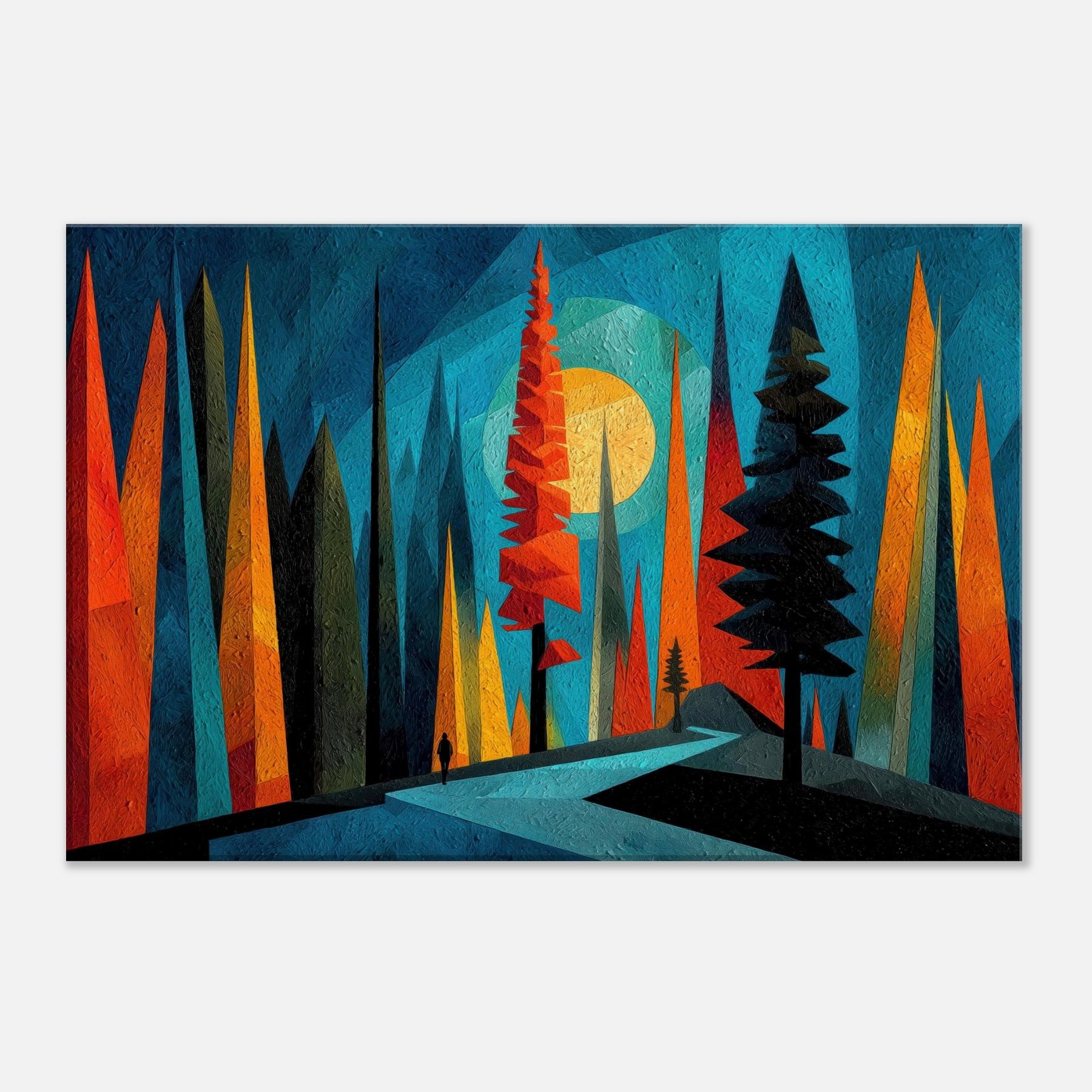 Let the Boreal Forest breathe across your wall. This abstract meditation gathers towering pines in saturated ribbons of teal, tangerine, and midnight, inviting a quiet walk through hush lit glades. The artwork hums with texture and depth, like a frost kissed dawn dissolving into color. In a living room or bedroom, it acts as a window to wonder an atmospheric backdrop that enhances conversation, slows the clock, and makes daily rituals feel ceremonial. A bold, calming anchor for modern interiors.