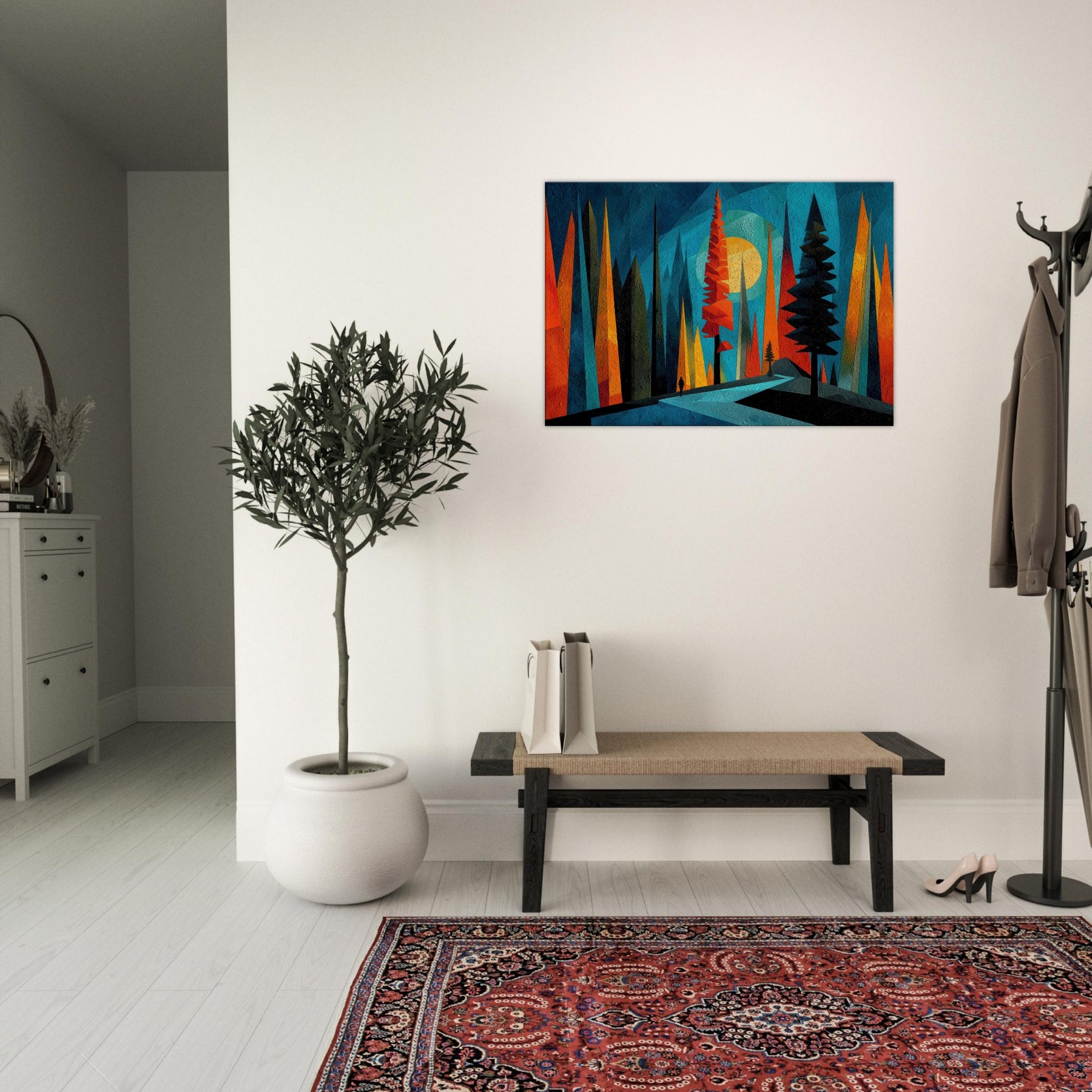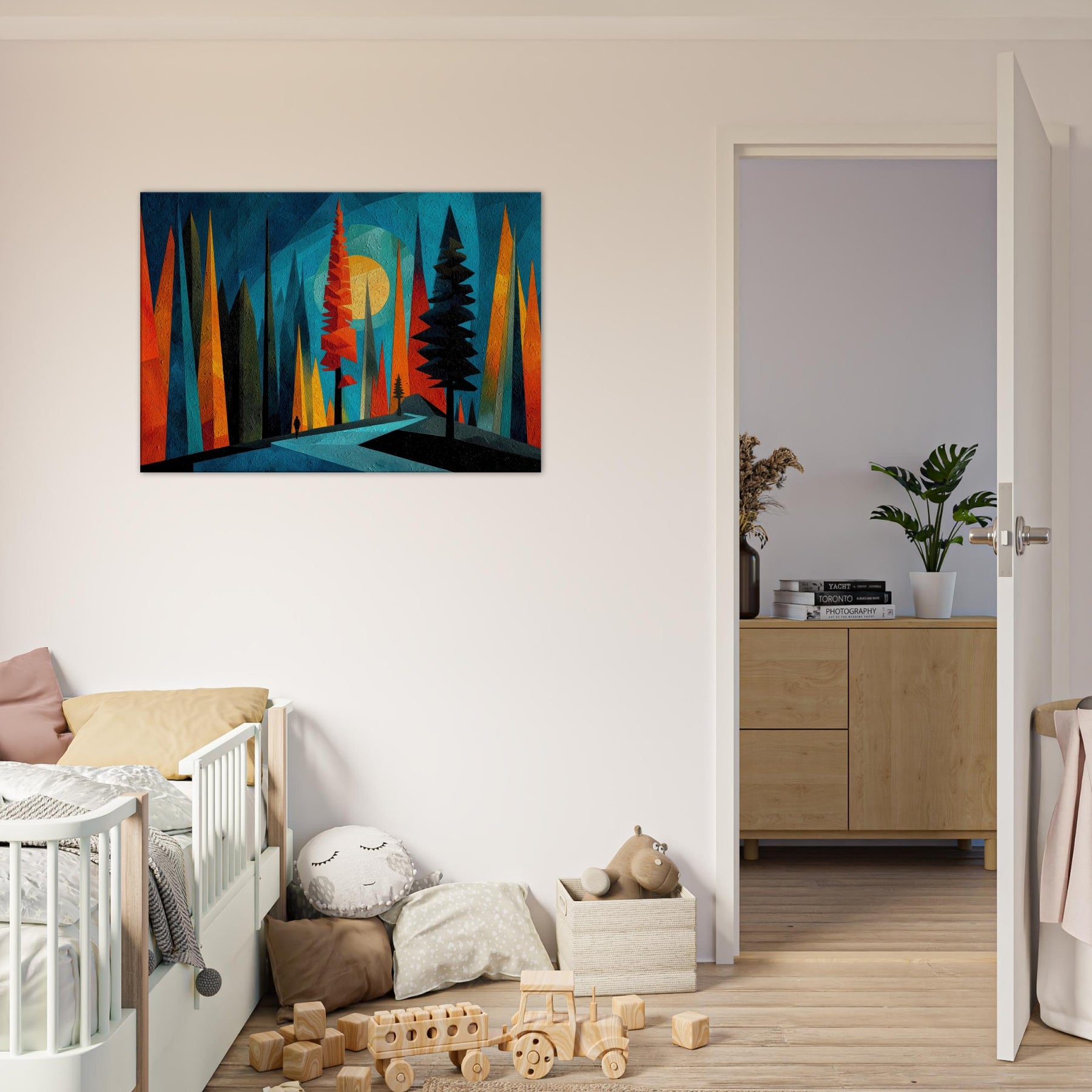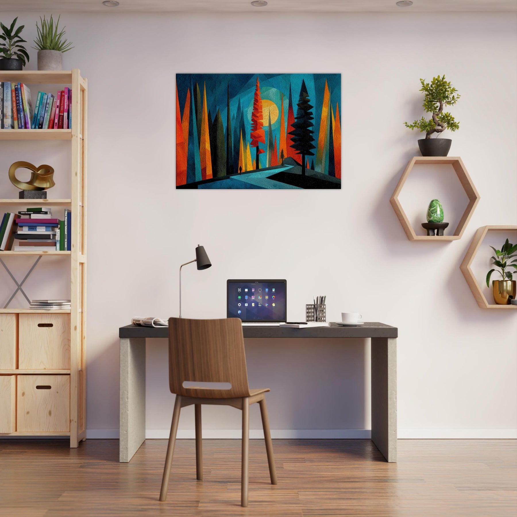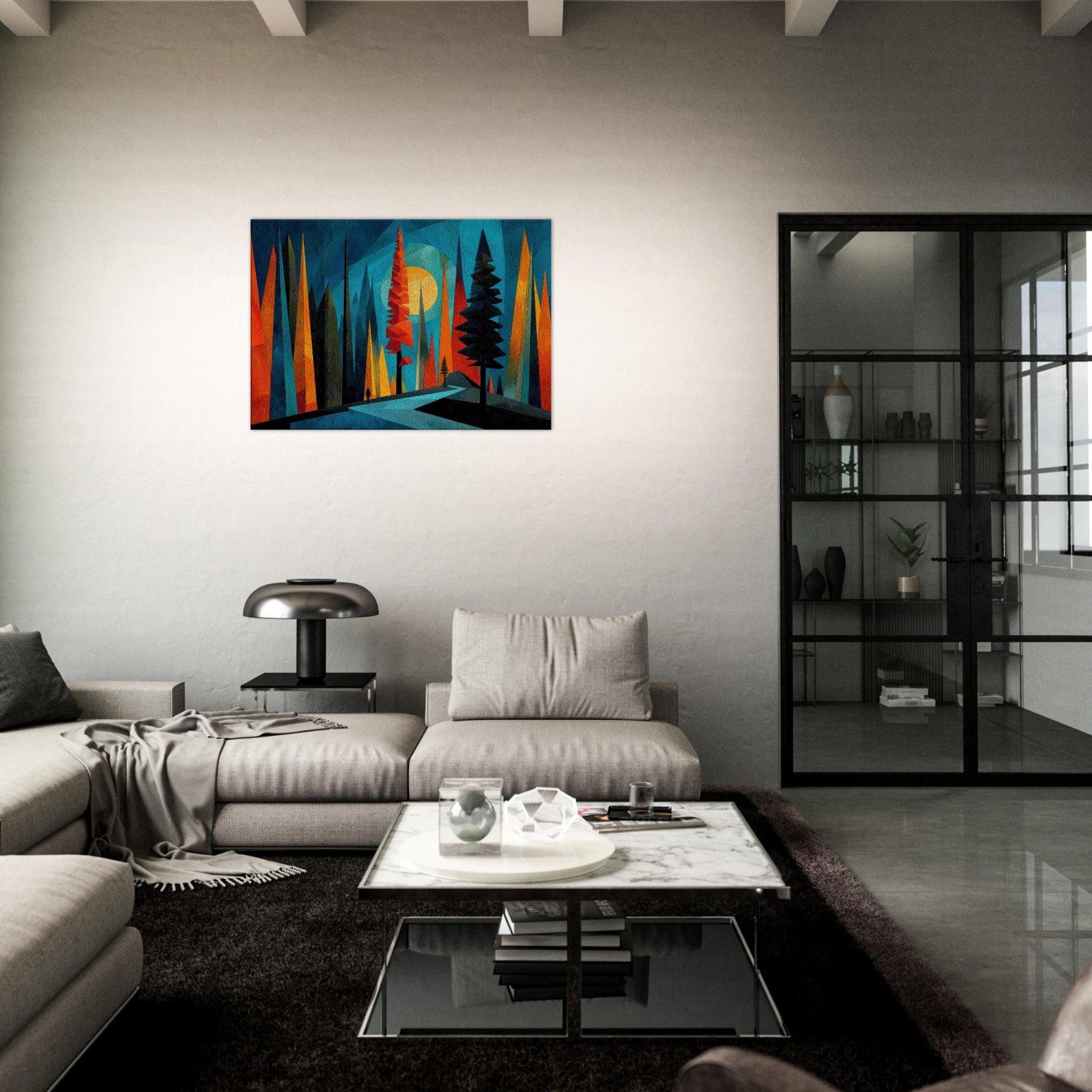 Let the Boreal Forest breathe across your wall. This abstract meditation gathers towering pines in saturated ribbons of teal, tangerine, and midnight, inviting a quiet walk through hush lit glades. The artwork hums with texture and depth, like a frost kissed dawn dissolving into color. In a living room or bedroom, it acts as a window to wonder an atmospheric backdrop that enhances conversation, slows the clock, and makes daily rituals feel ceremonial. A bold, calming anchor for modern interiors.