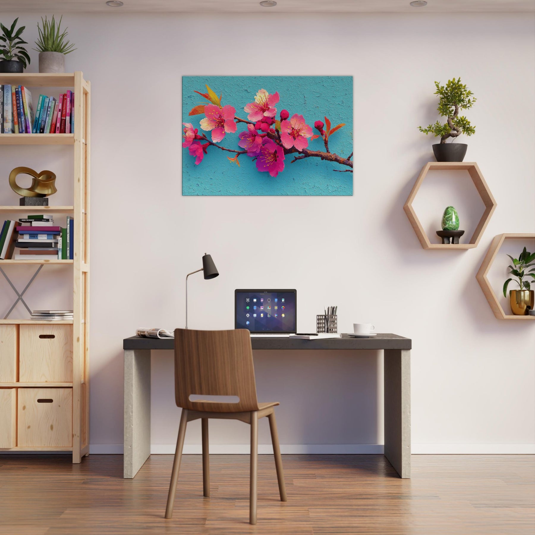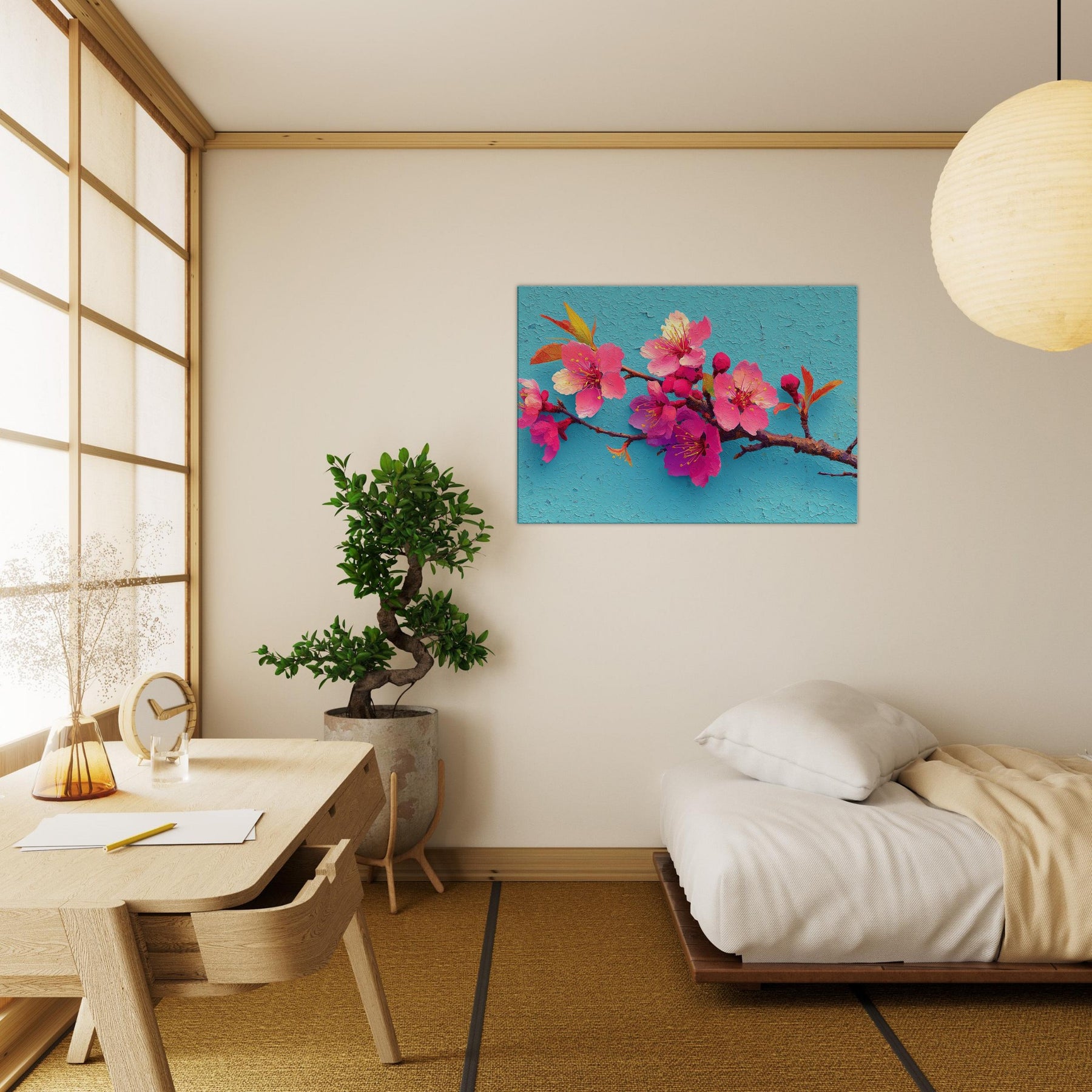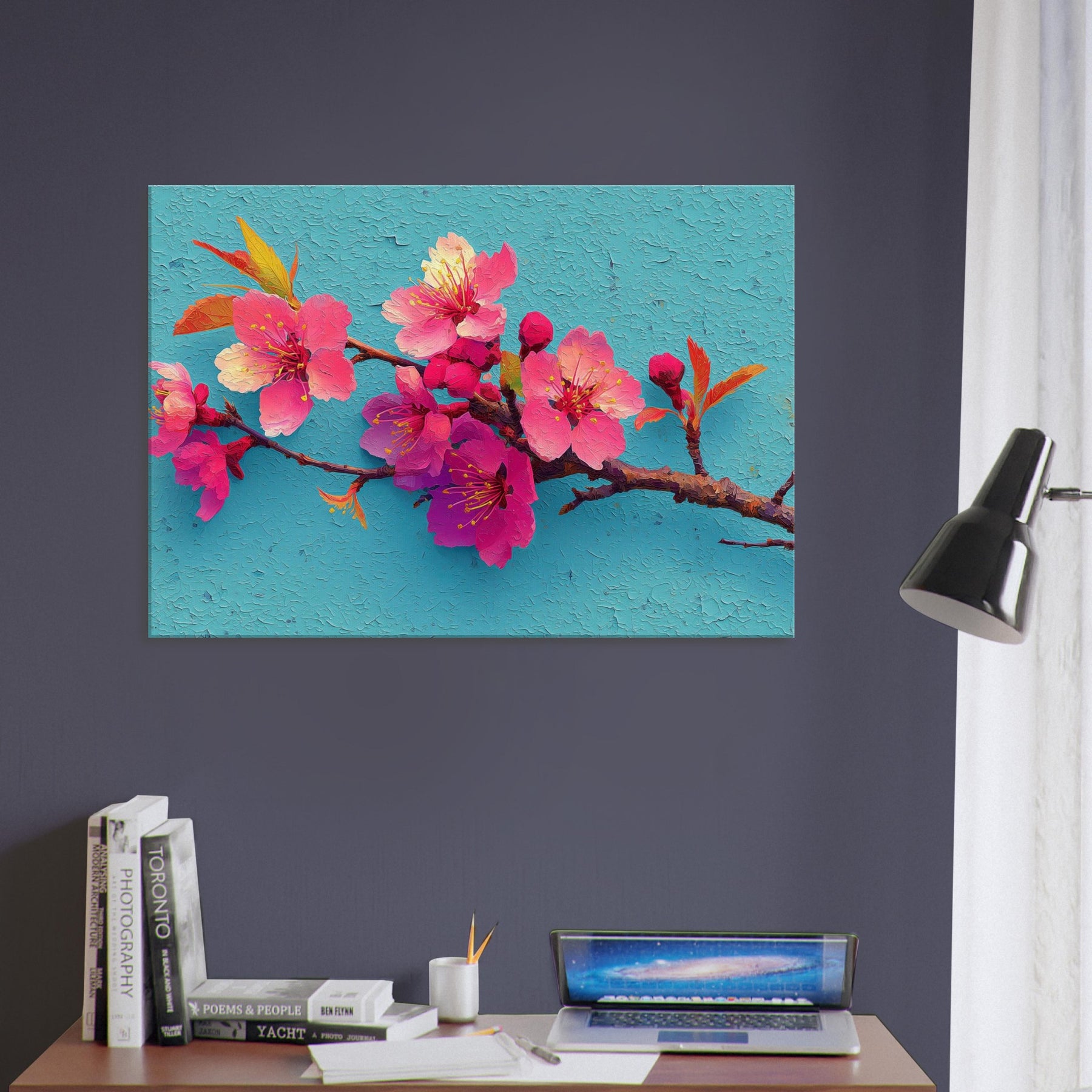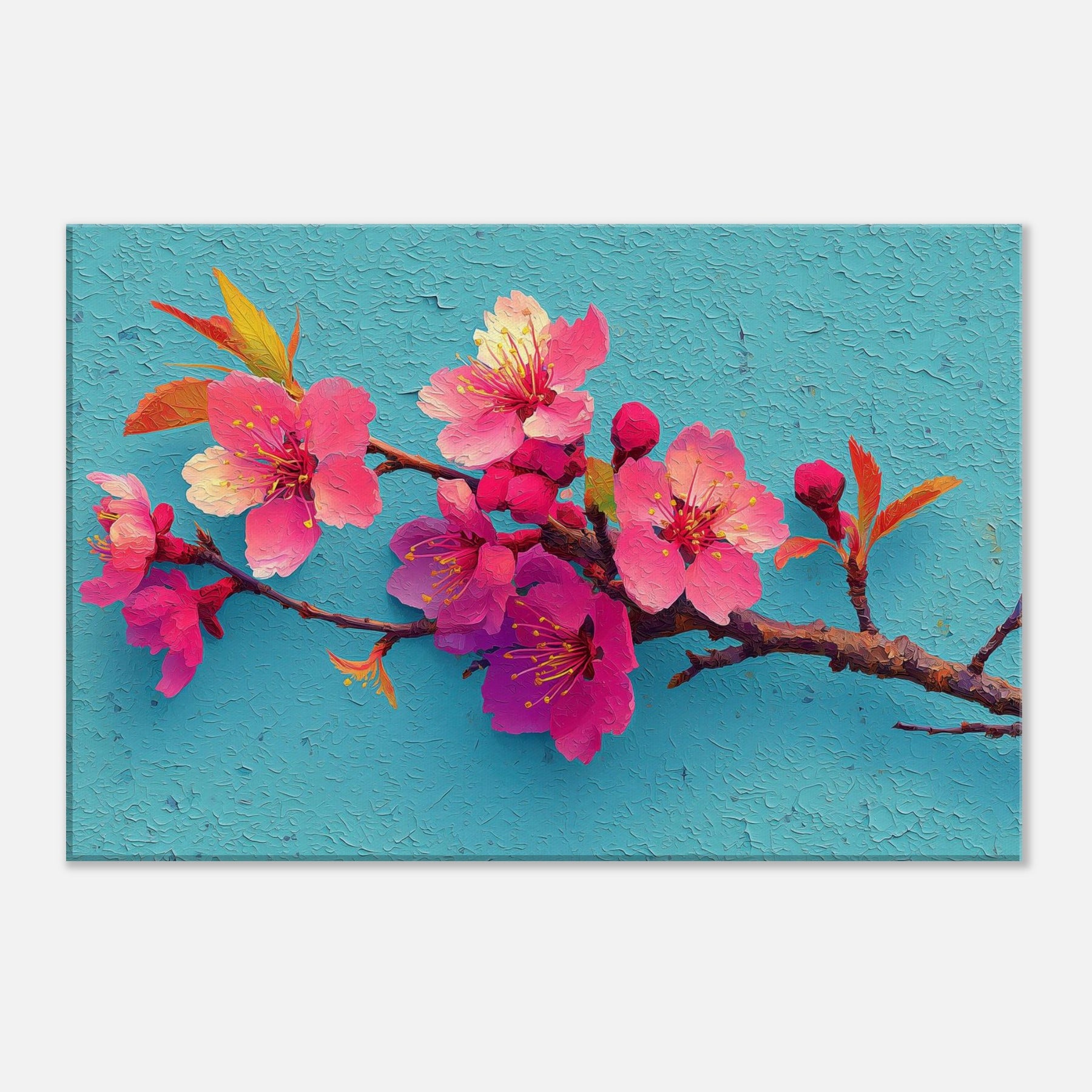 Immerse your space in a breath of spring with this Sakura Branch study, rendered as an abstract bouquet of luminous pinks and magentas. The blossoms seem to drift on a turquoise sky, their delicate stamens catching light like tiny suns. The textured surface suggests wind kissed petals and whispered movement, inviting slow, mindful gazing. Perfect over a sofa or console, it infuses rooms with warmth, optimism, and a touch of poetic calm a nature inspired centerpiece that makes everyday moments feel brighter and more spacious.