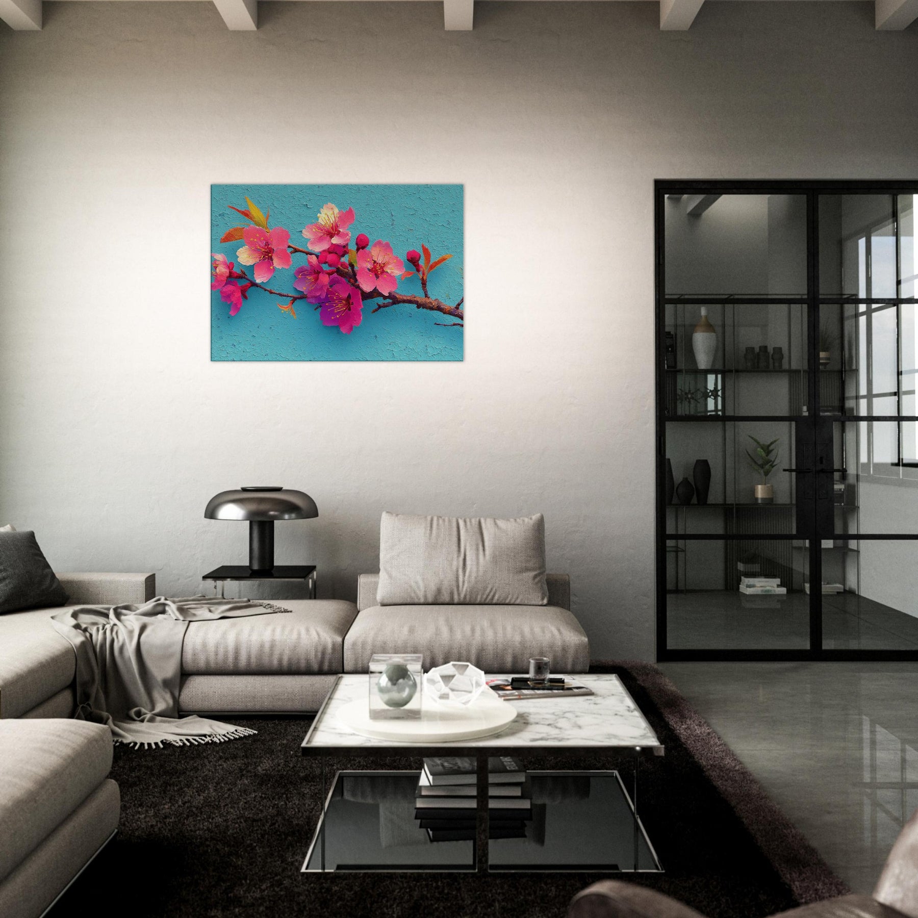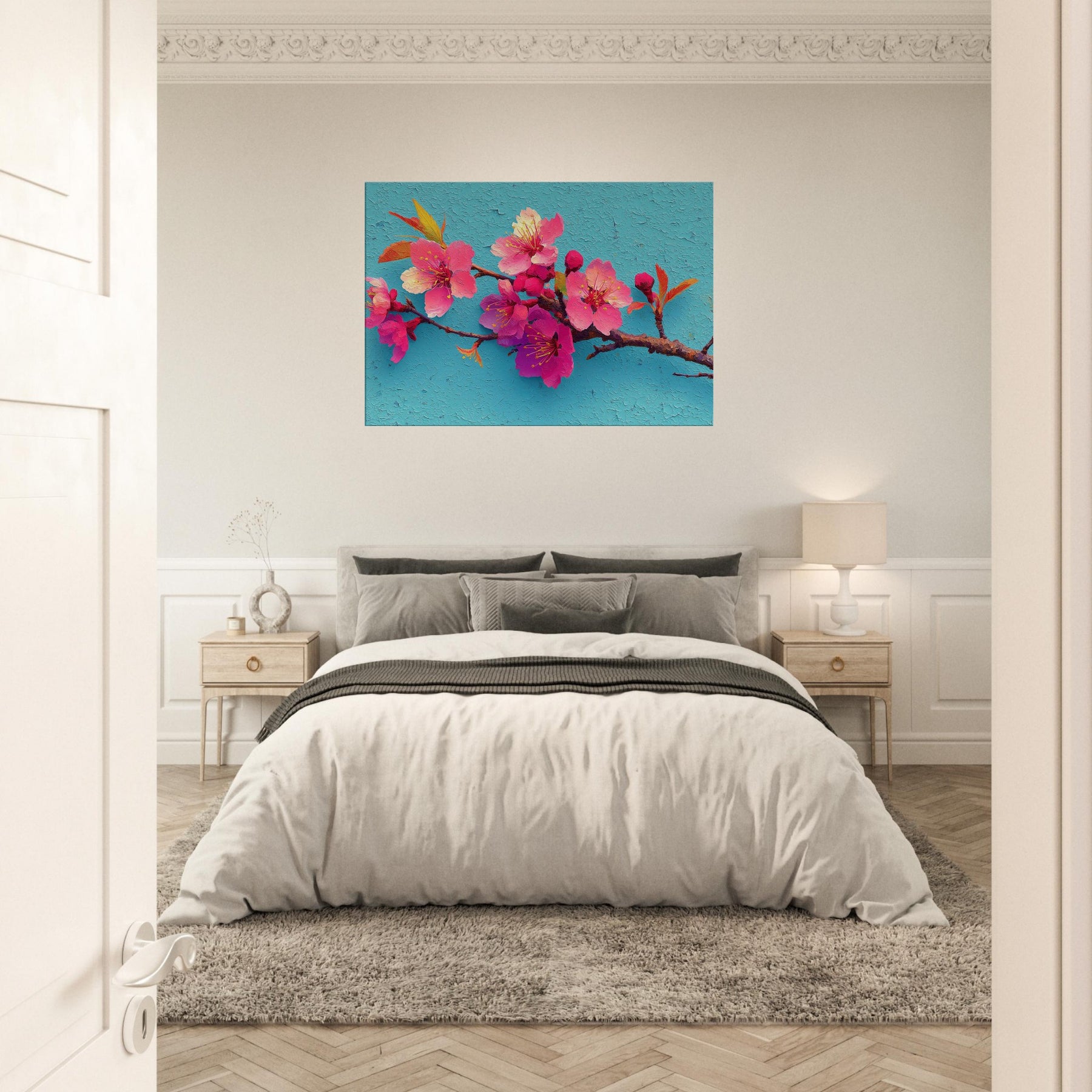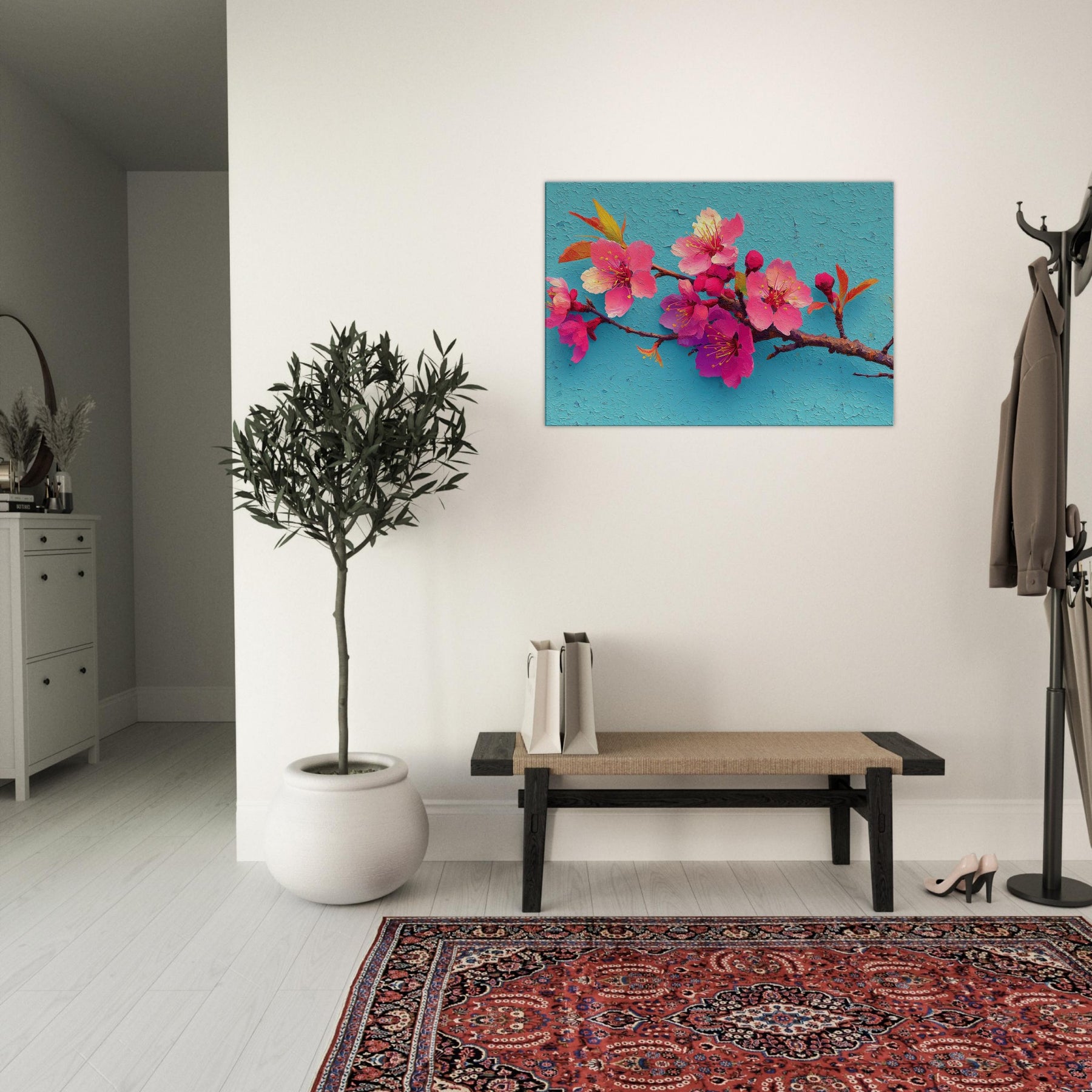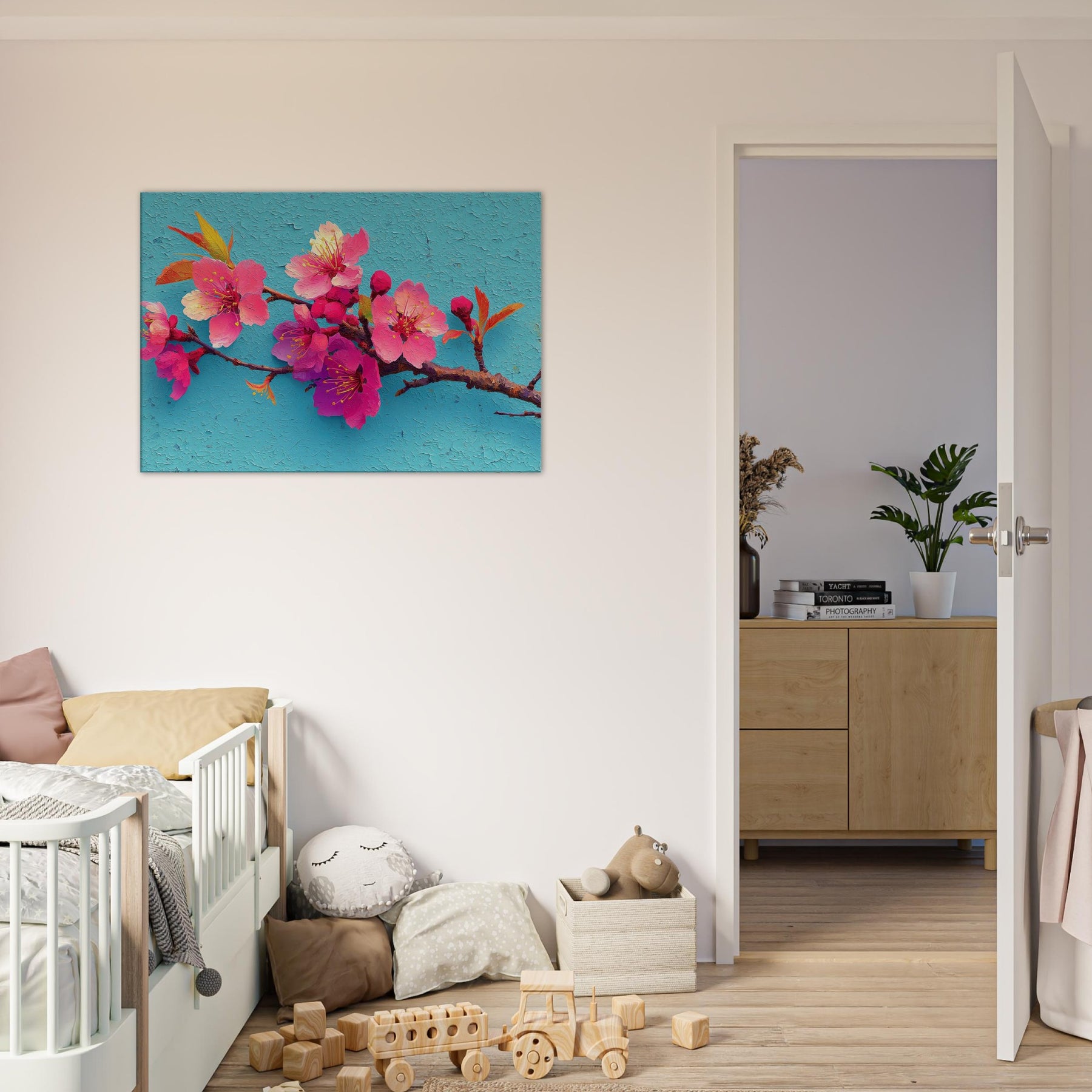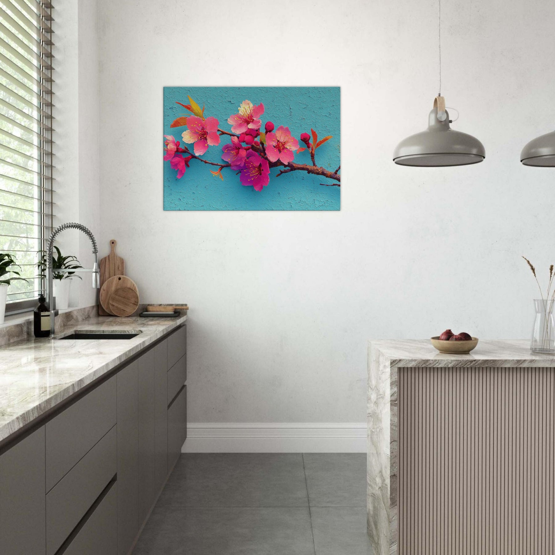 Immerse your space in a breath of spring with this Sakura Branch study, rendered as an abstract bouquet of luminous pinks and magentas. The blossoms seem to drift on a turquoise sky, their delicate stamens catching light like tiny suns. The textured surface suggests wind kissed petals and whispered movement, inviting slow, mindful gazing. Perfect over a sofa or console, it infuses rooms with warmth, optimism, and a touch of poetic calm a nature inspired centerpiece that makes everyday moments feel brighter and more spacious.