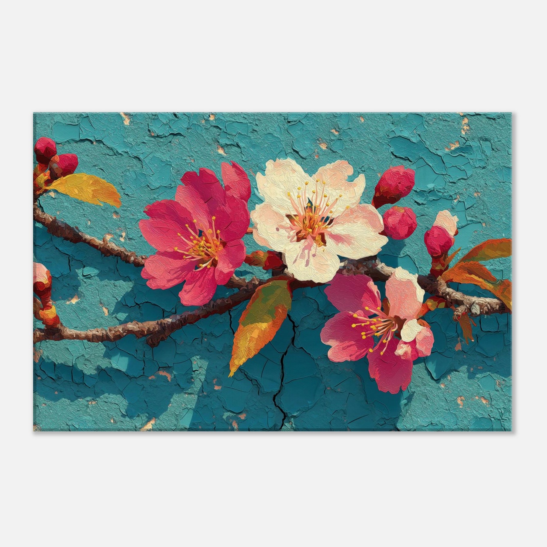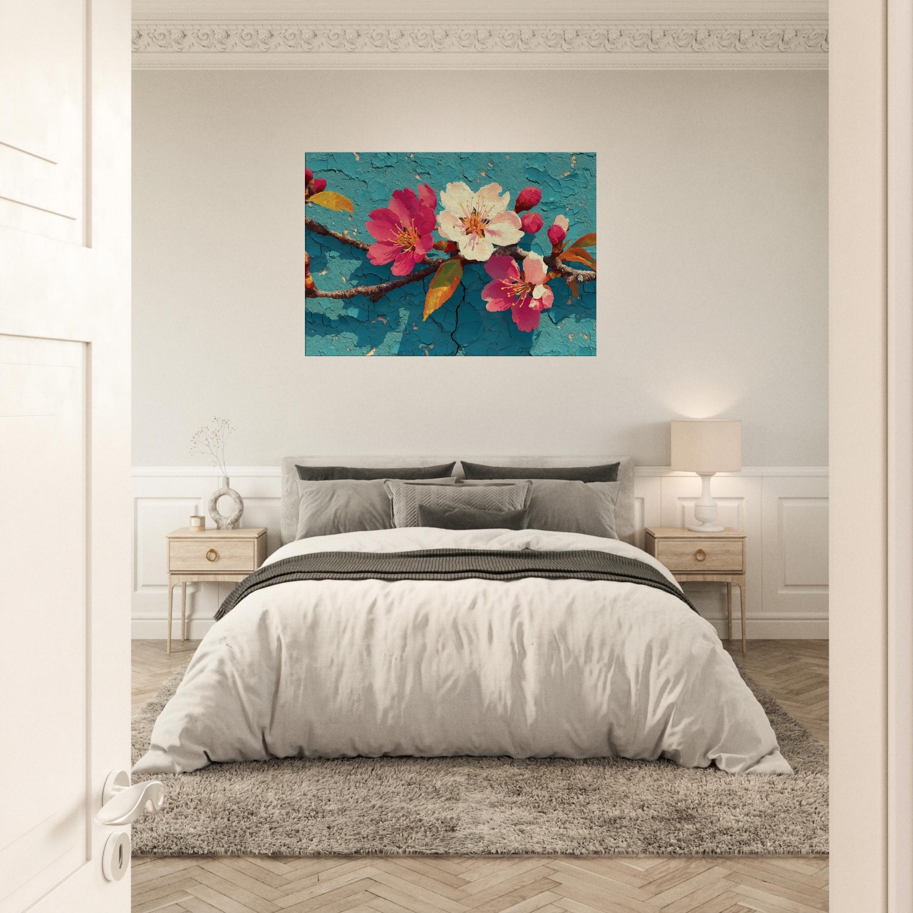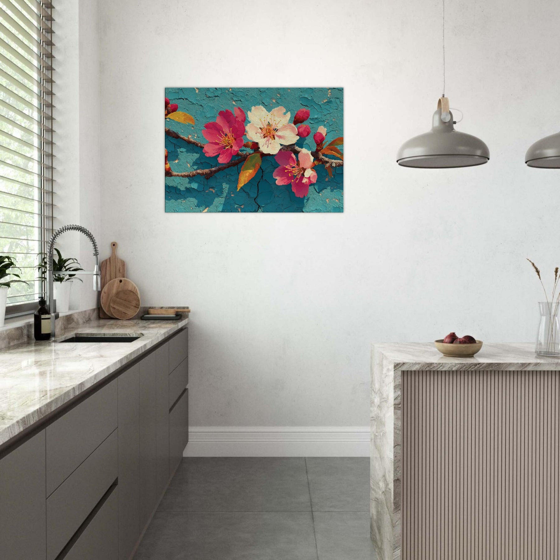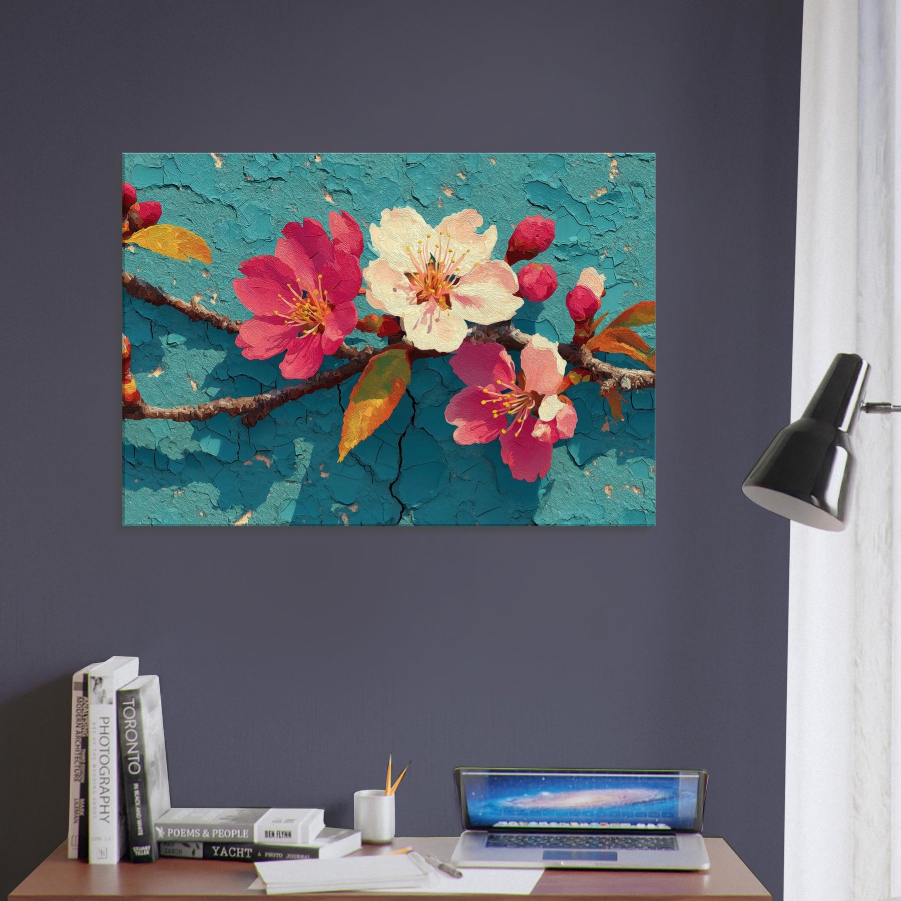 An intimate chorus of color unfolds on a sunlit wall. This Cherry Blossom study, rendered in fluid abstract forms, dissolves petals into radiant waves of pink and ivory against a moody teal, cracked texture backdrop. The piece hums with quiet energy, inviting a room to breathe soft light on delicate florals, cool air from distant seas, and a sense of renewal. Perfect for a living room or entryway, it steadies space with elegant restraint while awakening the senses to nature's grace and modern color.