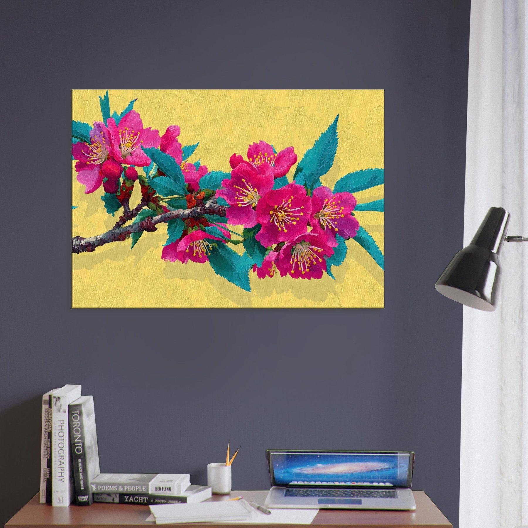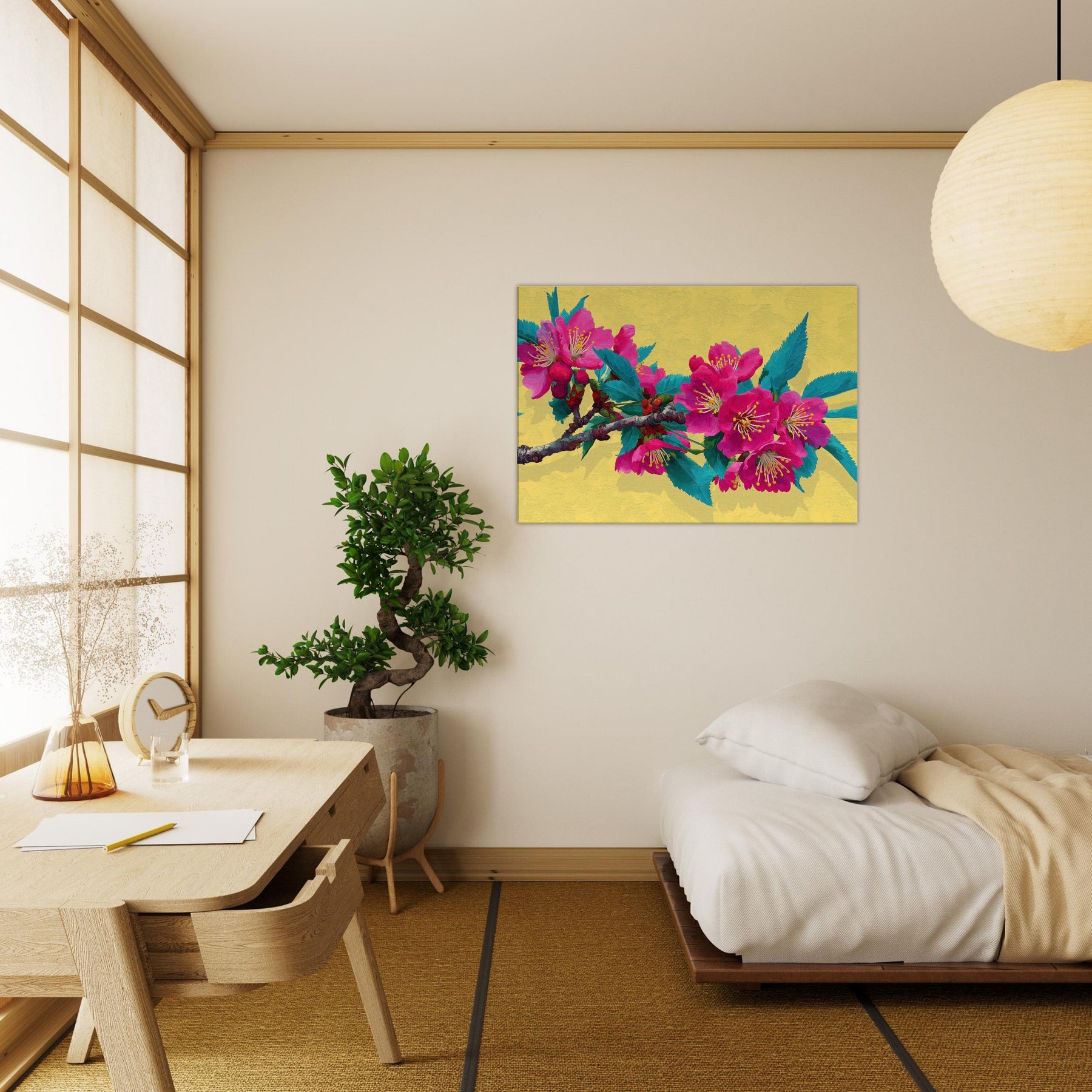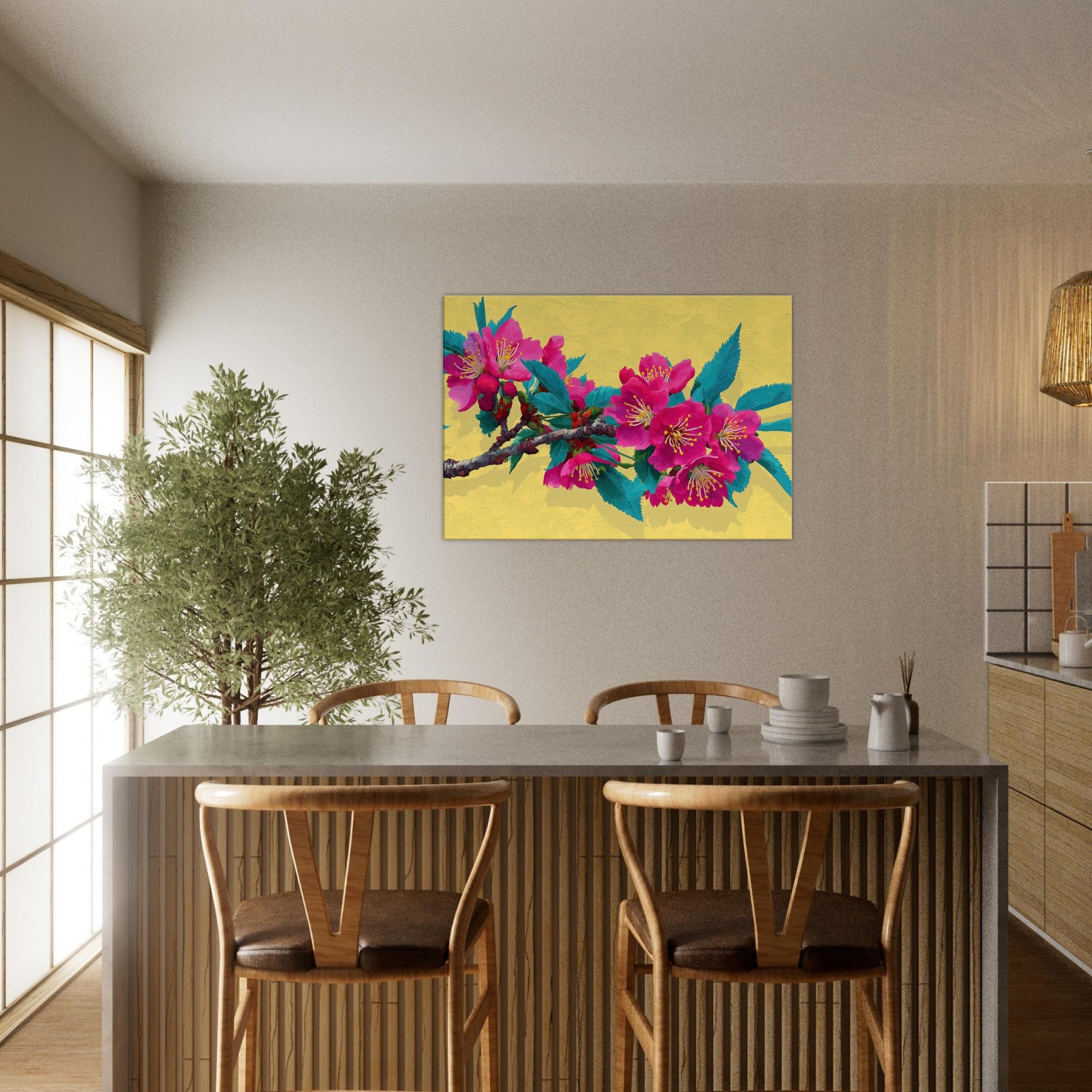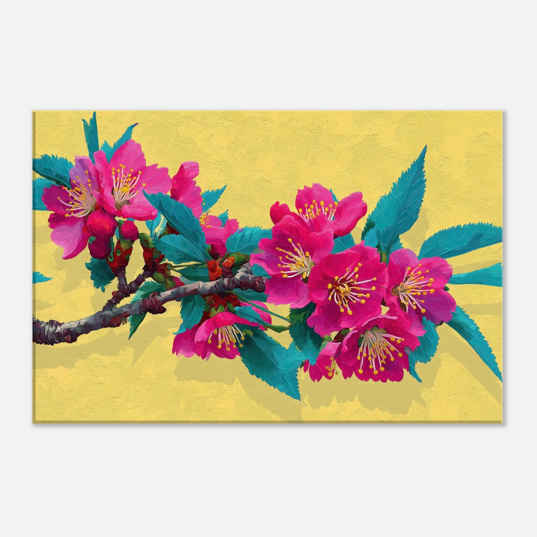 Let this Sakura Branch wash the room in a whisper of color and quiet energy. The abstract rendering dissolves form into luminous strokes of pink and jade, inviting the senses to drift along the branch as if you were standing beneath a blooming canopy. The warm yellow backdrop glows like morning light, enriching walls with a soft radiance. A contemplative centerpiece, it breathes nature into living spaces, weaving calm, joy, and a touch of drama into your everyday sanctuary.
