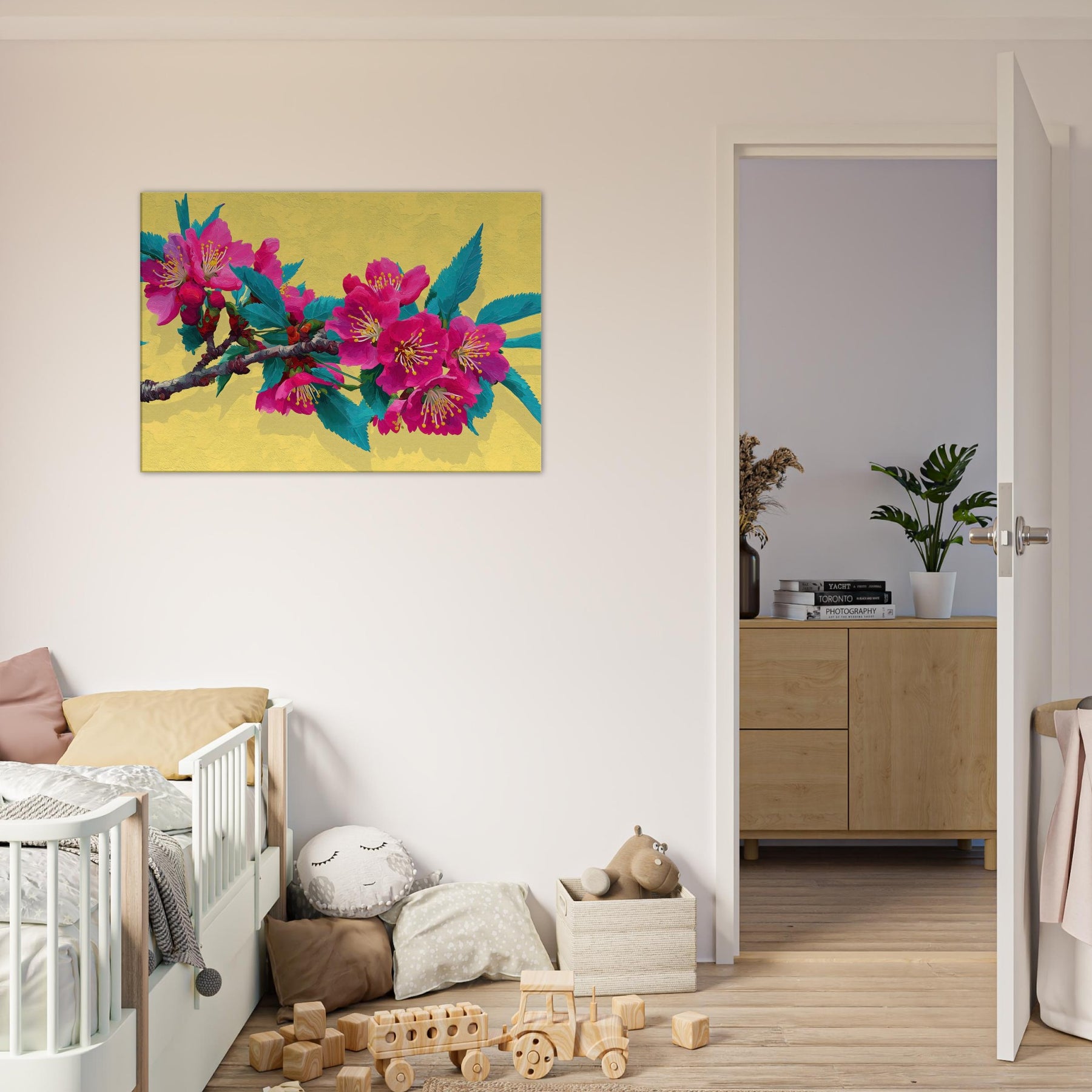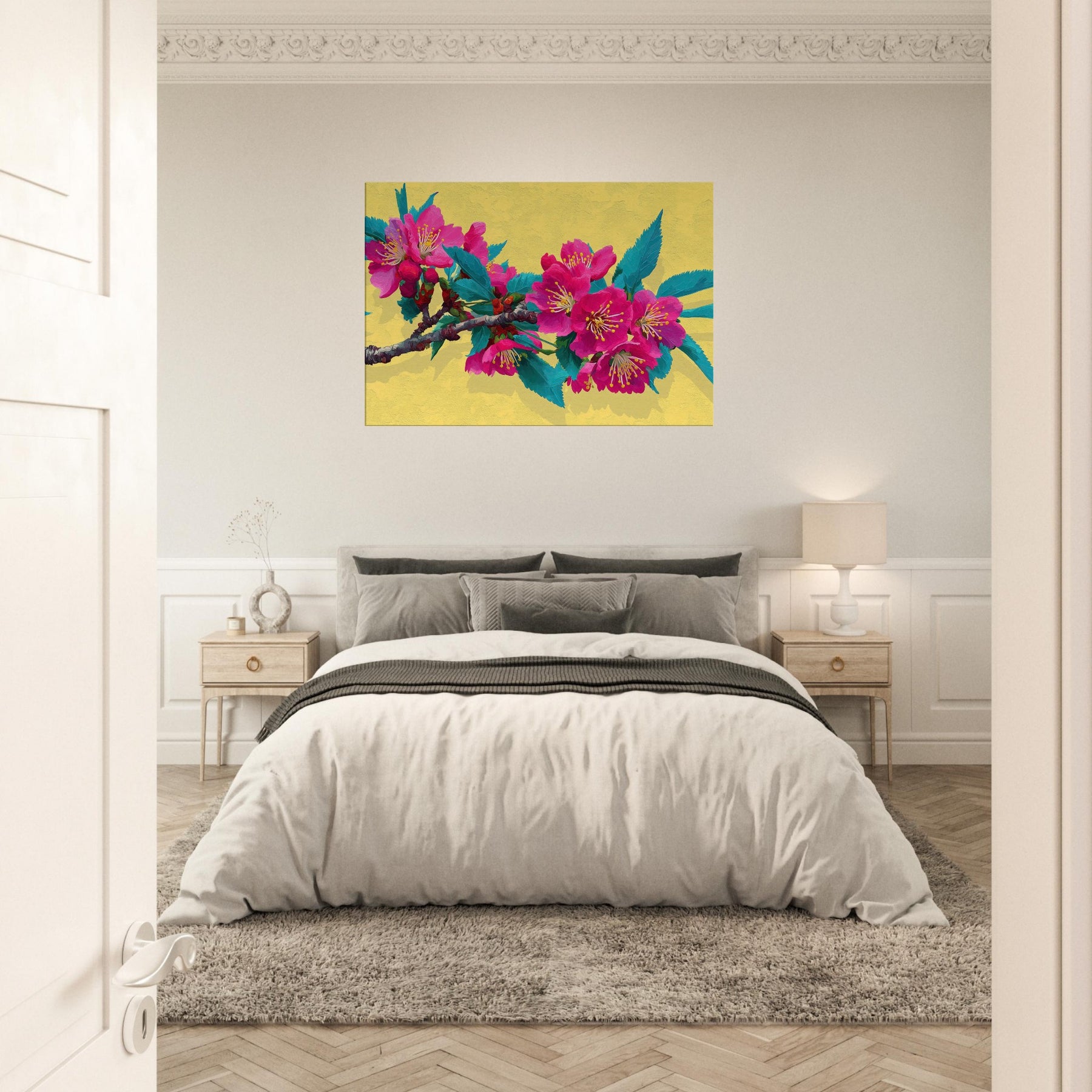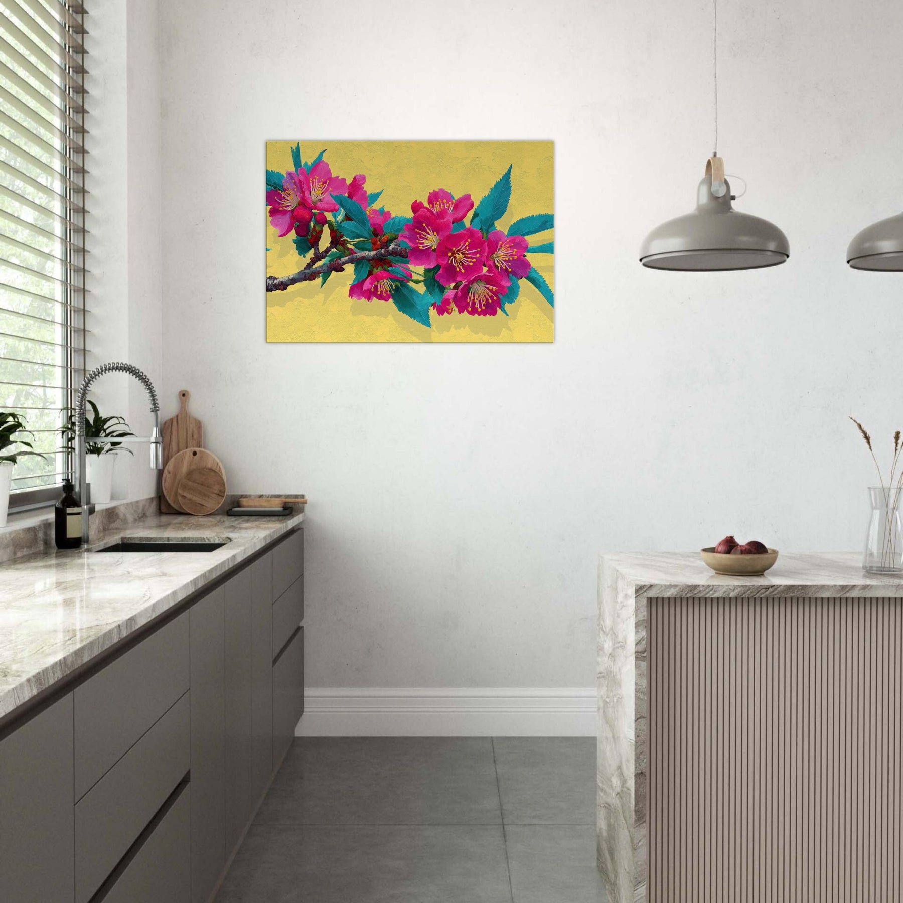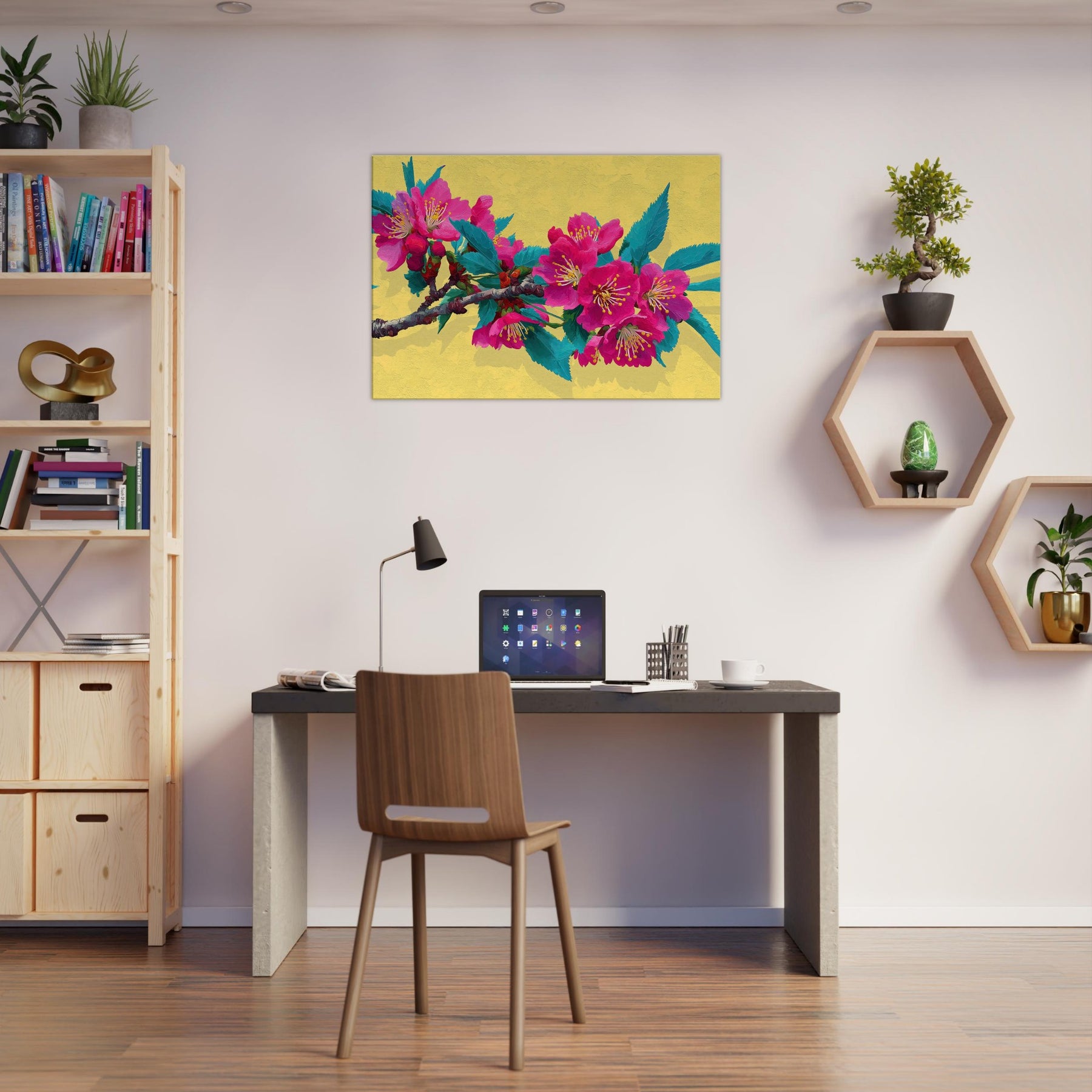 Let this Sakura Branch wash the room in a whisper of color and quiet energy. The abstract rendering dissolves form into luminous strokes of pink and jade, inviting the senses to drift along the branch as if you were standing beneath a blooming canopy. The warm yellow backdrop glows like morning light, enriching walls with a soft radiance. A contemplative centerpiece, it breathes nature into living spaces, weaving calm, joy, and a touch of drama into your everyday sanctuary.
