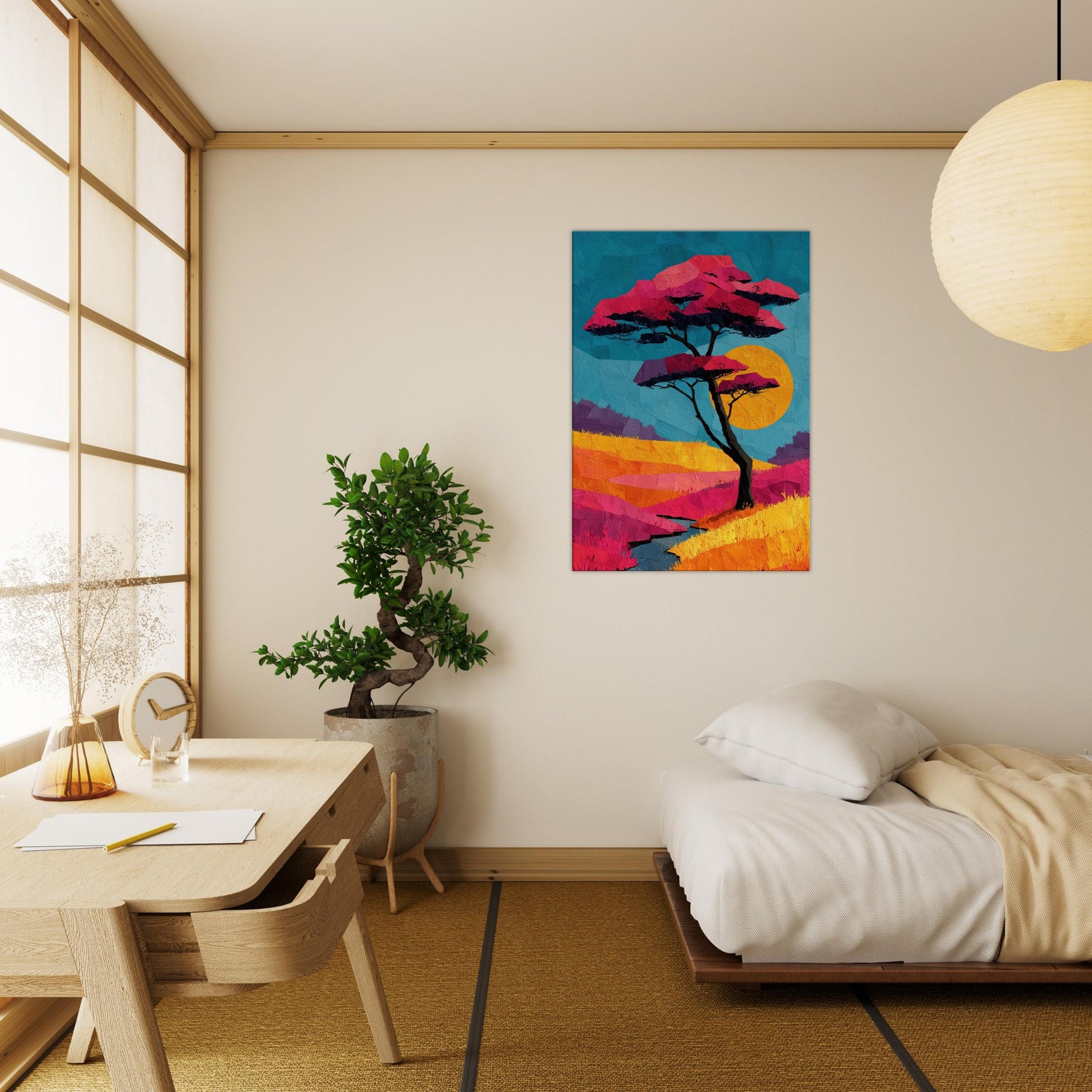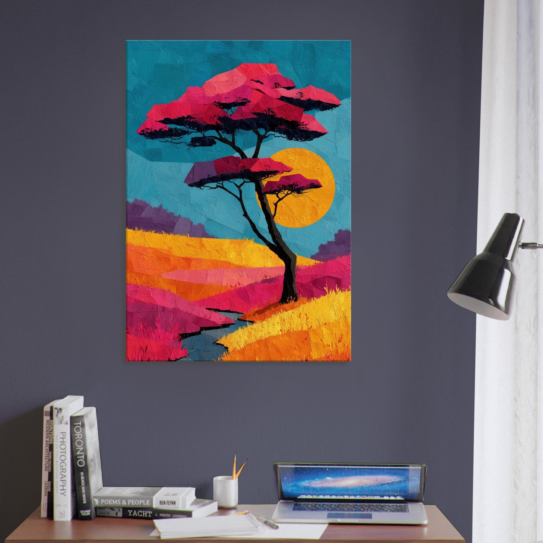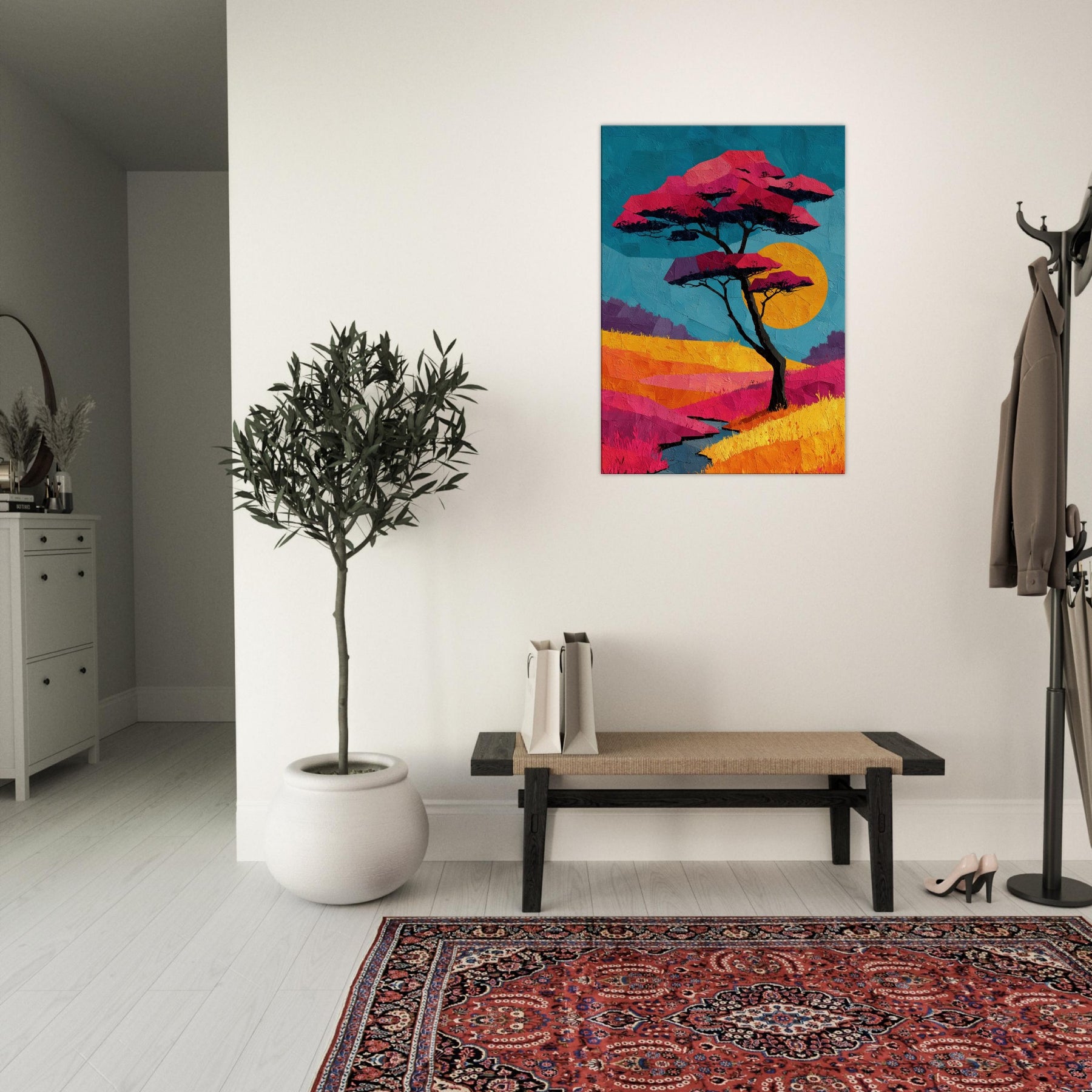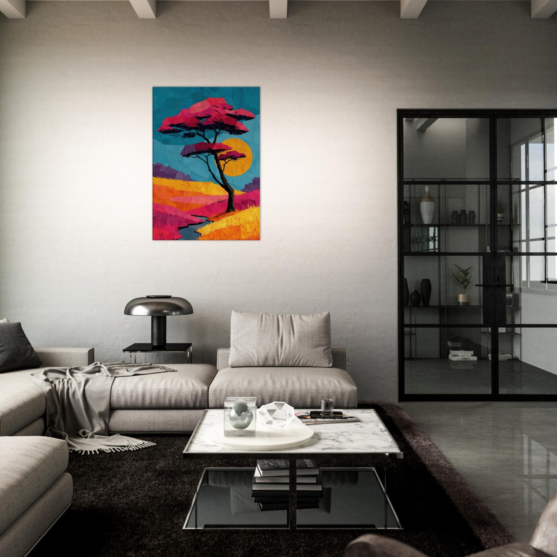 Let this Savannah scene drift into your living room like a warm breeze: a sculpted tree crowned with magenta and pink foliage, bending toward a molten sun. The color field hums with turquoise sky and layered ochre, inviting quiet energy and imagination. In this space between land and light, every glance reveals texture and depth, turning cushions and conversations into a shared moment. This piece harnesses nature's drama to elevate modern rooms, inviting calm, wonder, and a subtle, sunlit glow into your home.