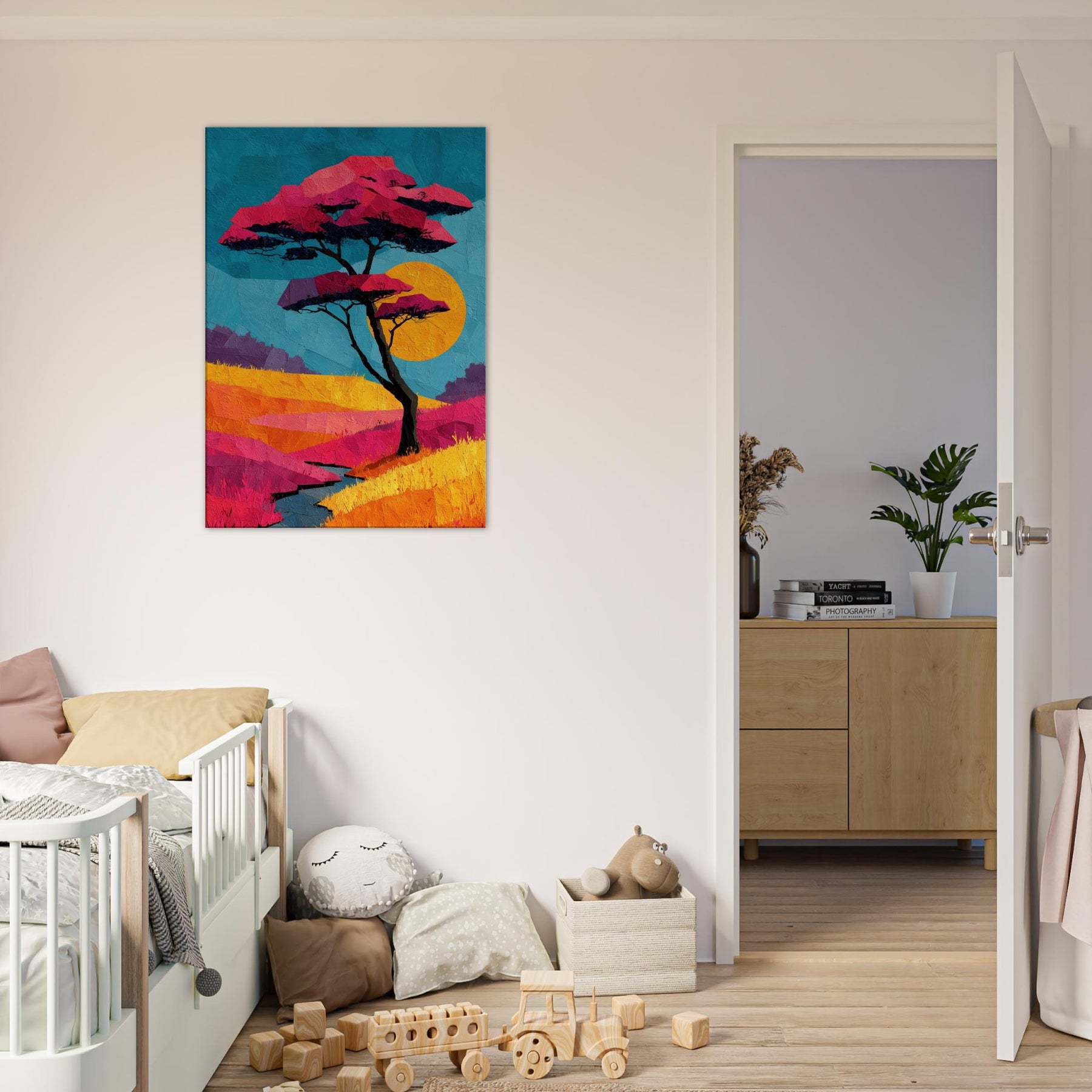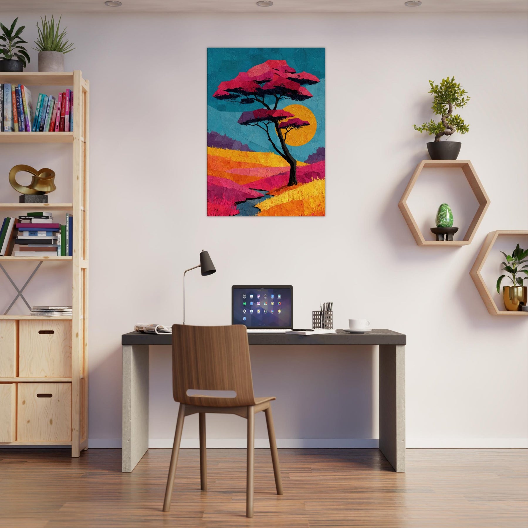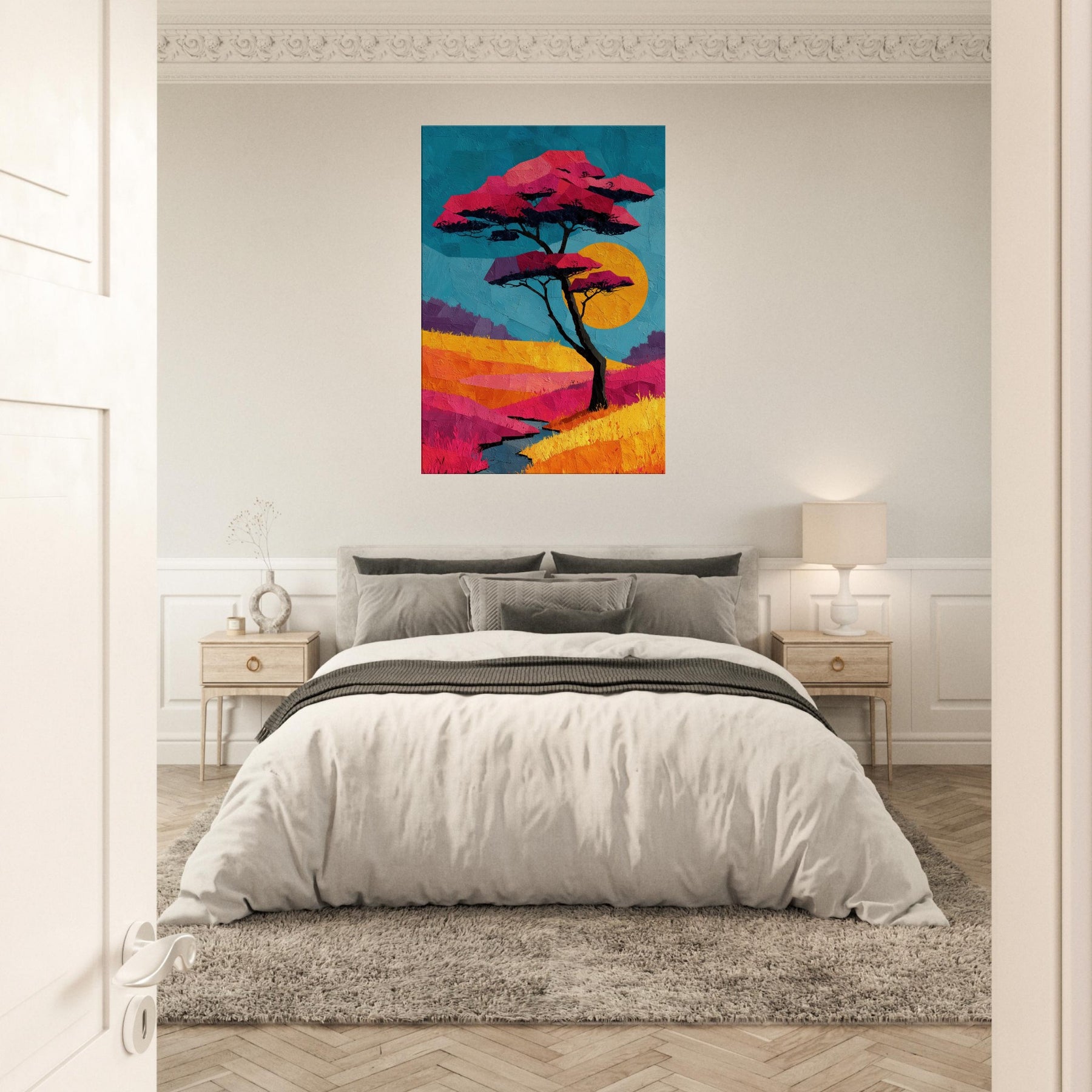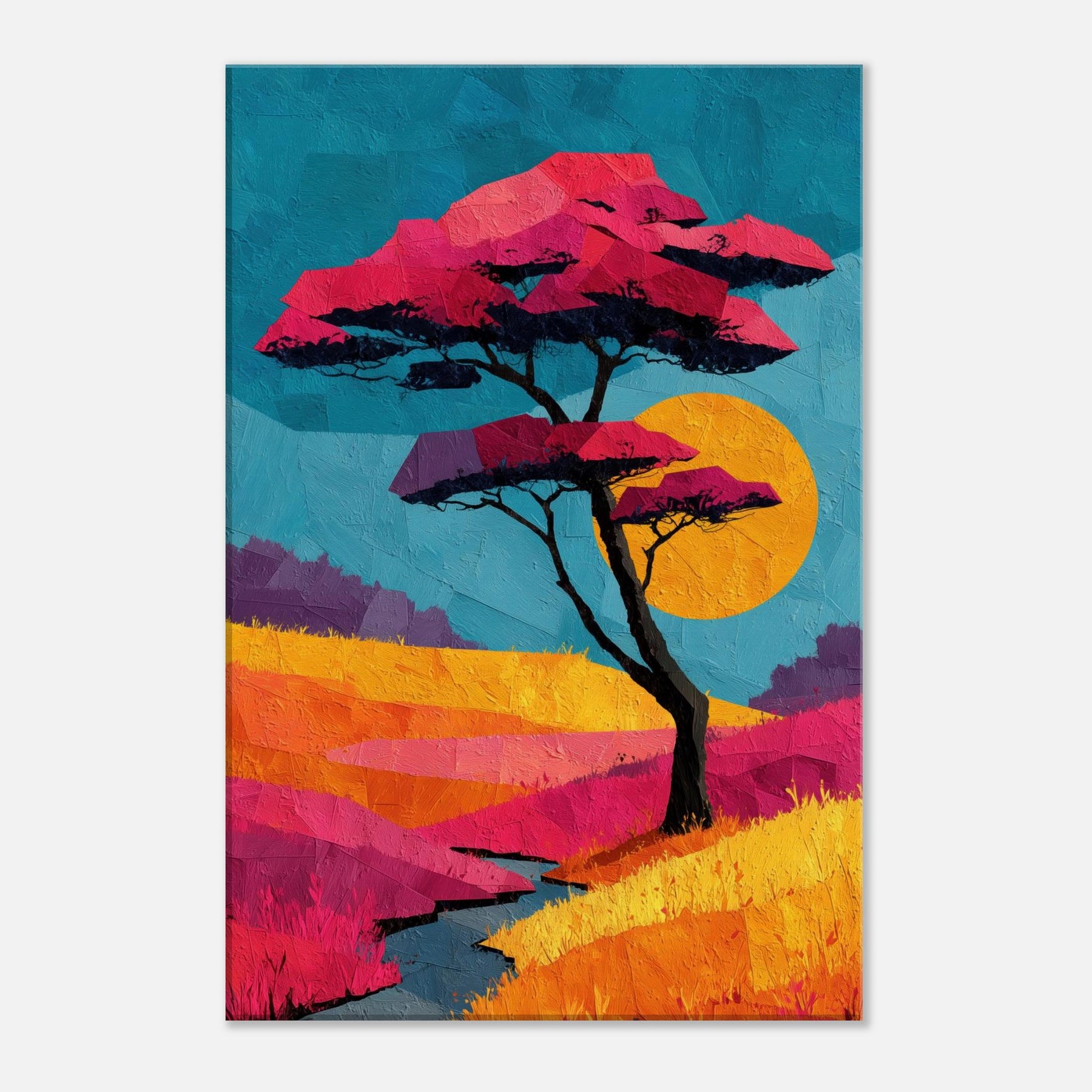 Let this Savannah scene drift into your living room like a warm breeze: a sculpted tree crowned with magenta and pink foliage, bending toward a molten sun. The color field hums with turquoise sky and layered ochre, inviting quiet energy and imagination. In this space between land and light, every glance reveals texture and depth, turning cushions and conversations into a shared moment. This piece harnesses nature's drama to elevate modern rooms, inviting calm, wonder, and a subtle, sunlit glow into your home.