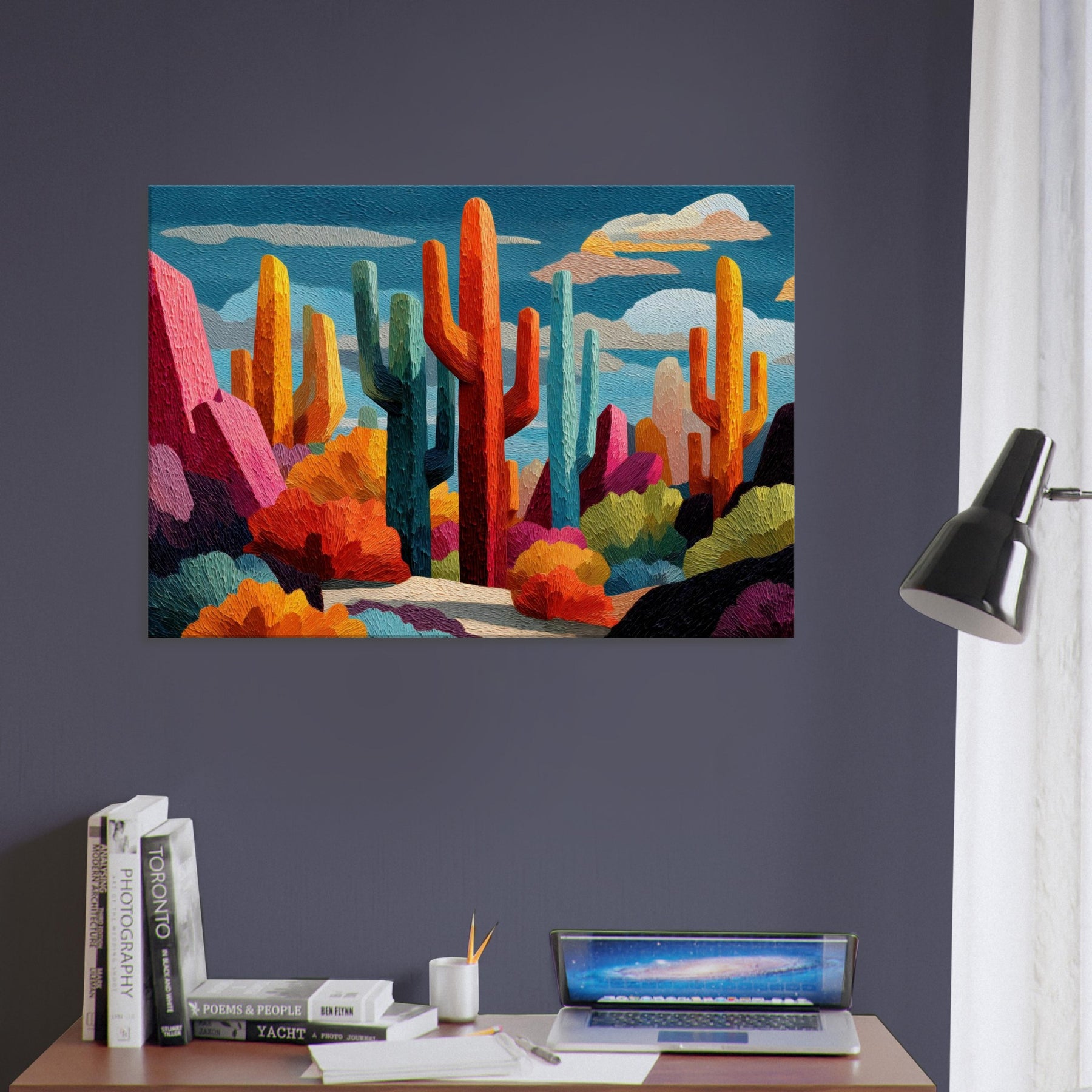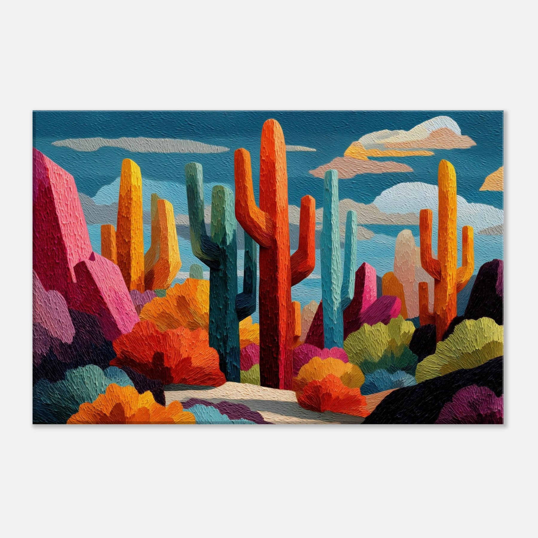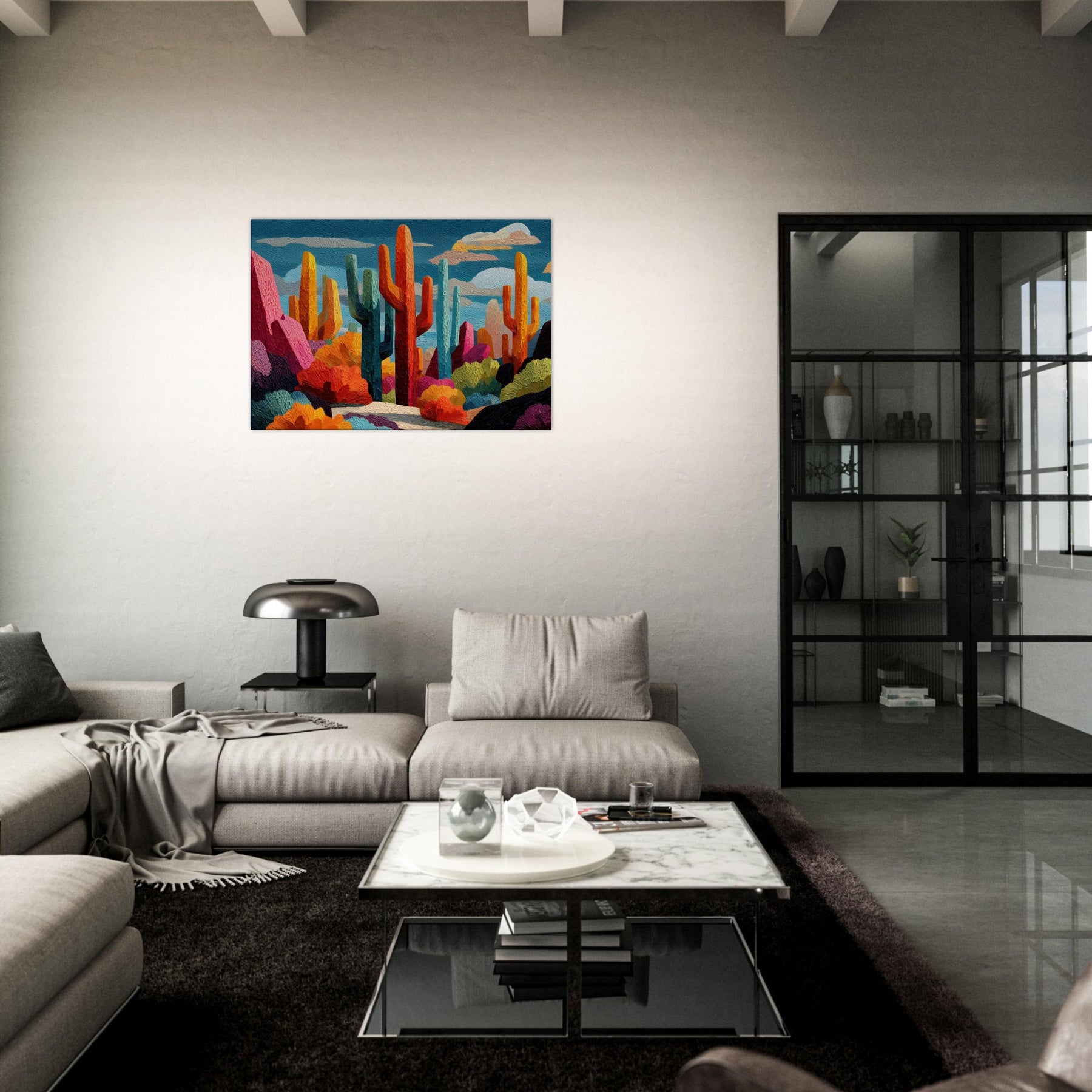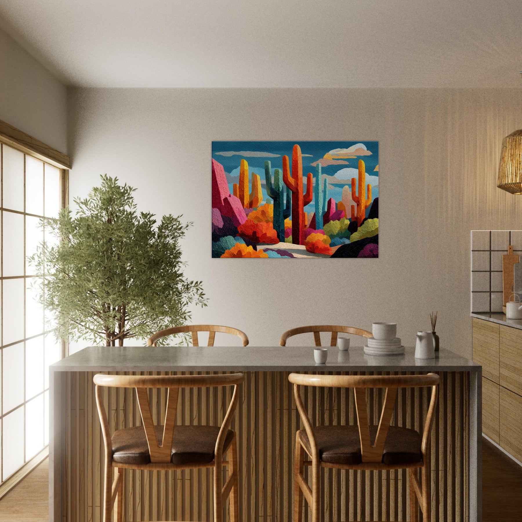 An oasis of color unfolds across the canvas, where the Desert blooms in sculpted silhouettes of cactus and sunlit horizons. Abstract forms ripple with heat and breeze, inviting you to pause and breathe in the warmth. The piece bathes a room in sunset textures crimson, teal, gold while the desert air seems to swirl through its valleys of color. Hang it in a living area or study to spark conversation and create a tranquil, luminous mood that invites quiet reflection.