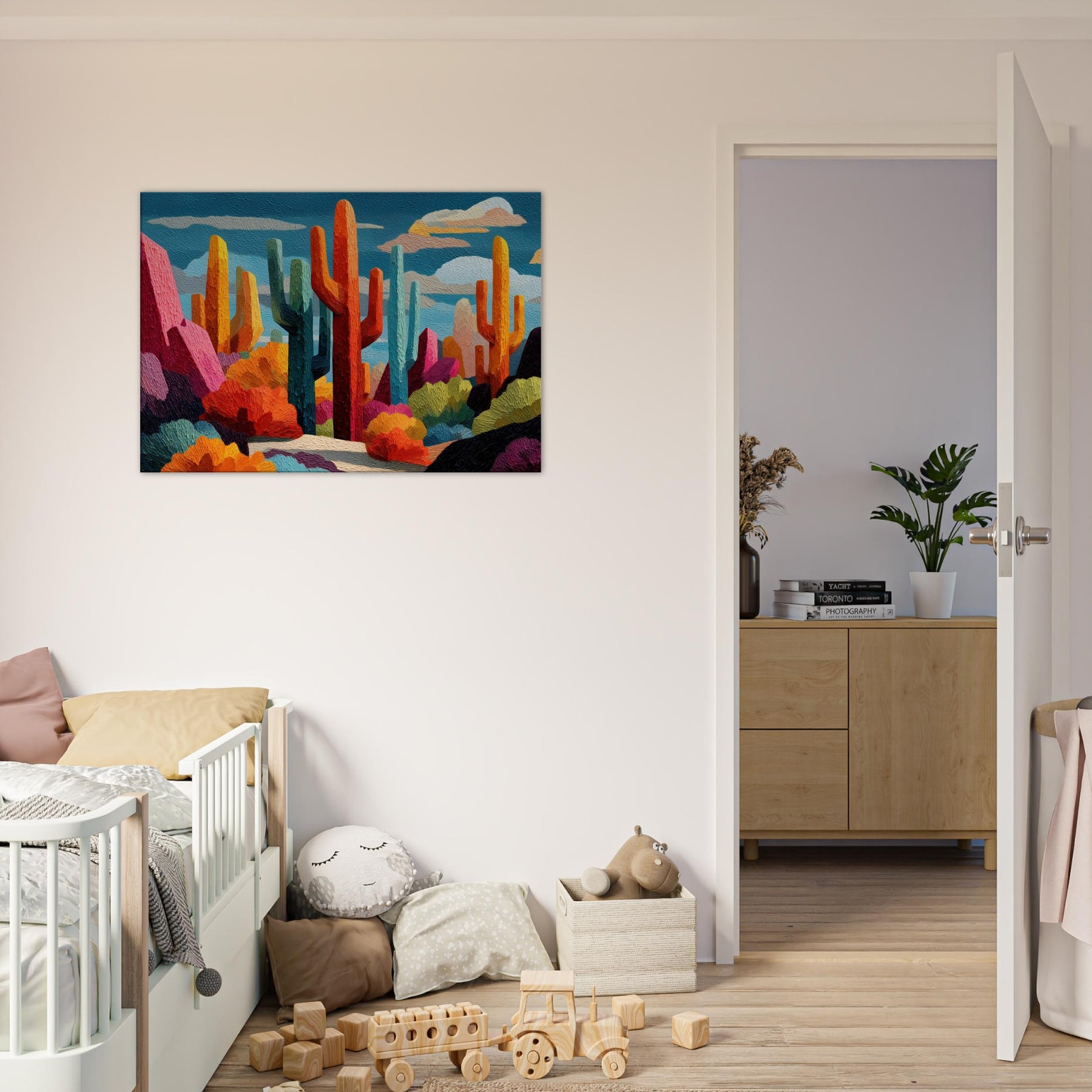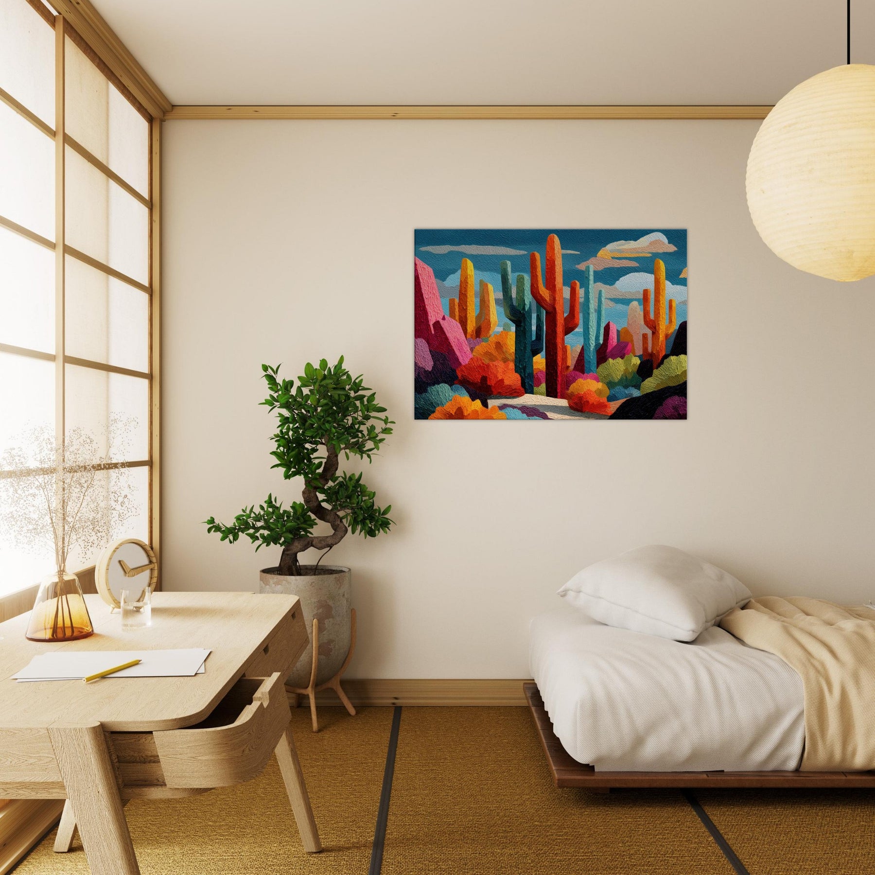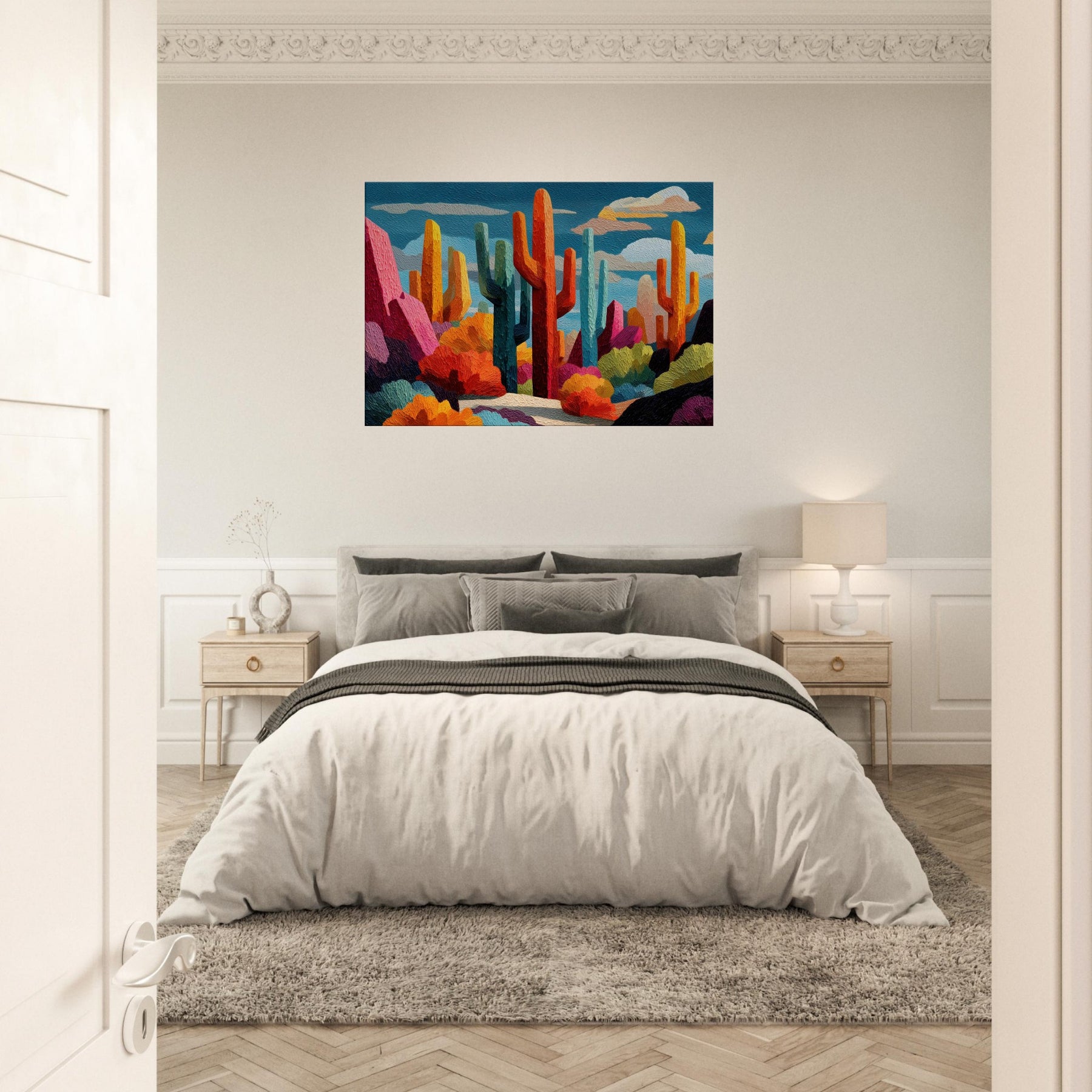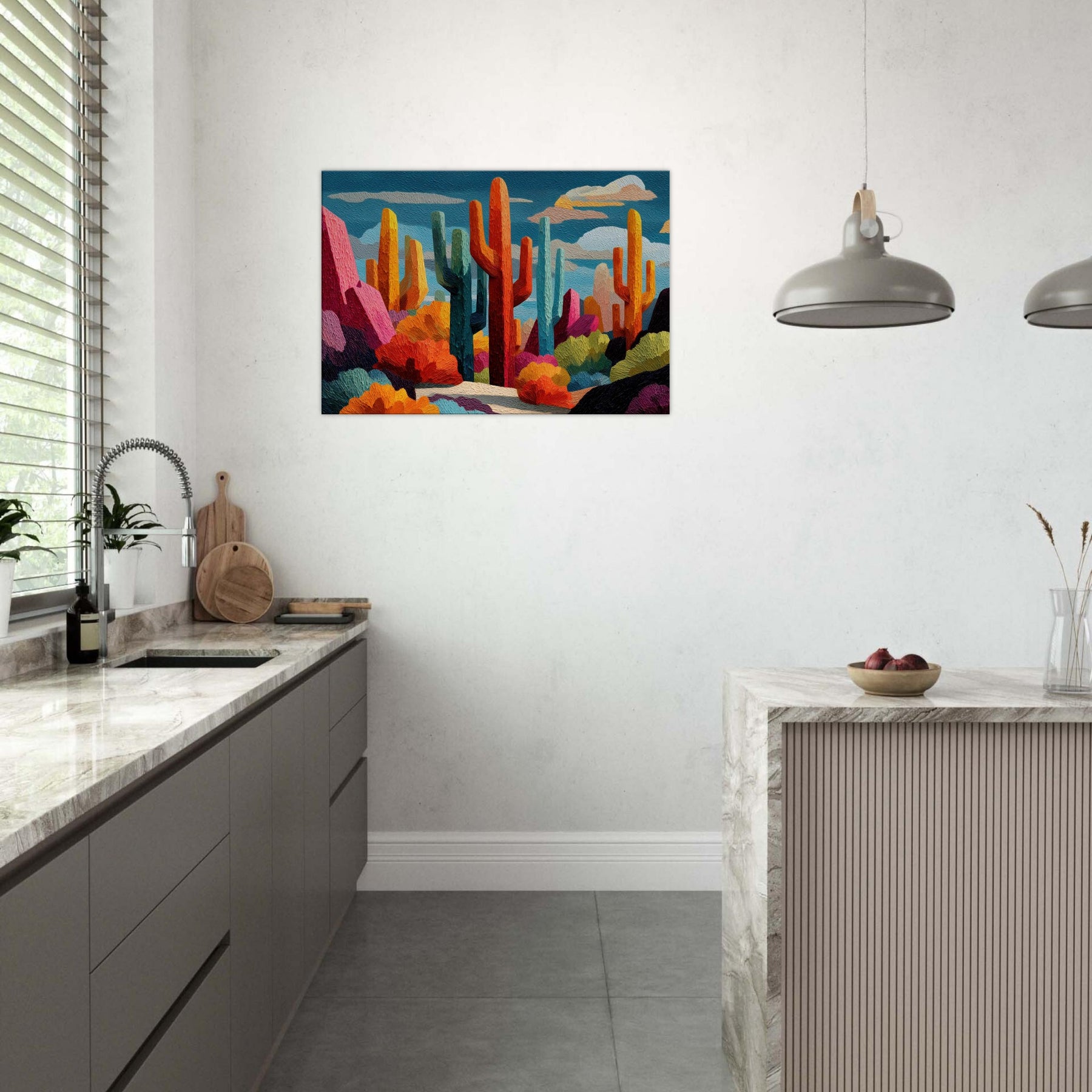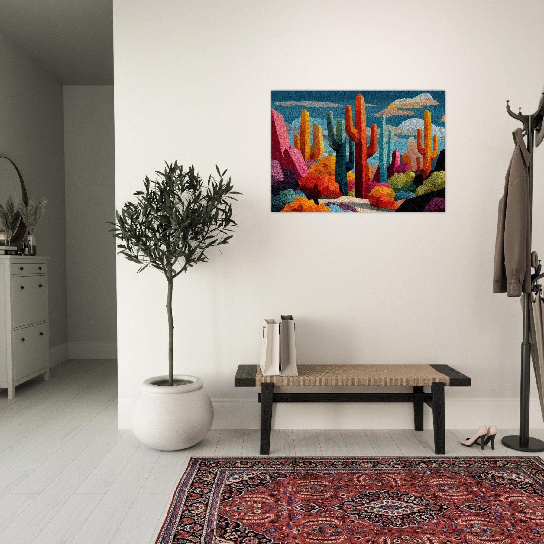 An oasis of color unfolds across the canvas, where the Desert blooms in sculpted silhouettes of cactus and sunlit horizons. Abstract forms ripple with heat and breeze, inviting you to pause and breathe in the warmth. The piece bathes a room in sunset textures crimson, teal, gold while the desert air seems to swirl through its valleys of color. Hang it in a living area or study to spark conversation and create a tranquil, luminous mood that invites quiet reflection.