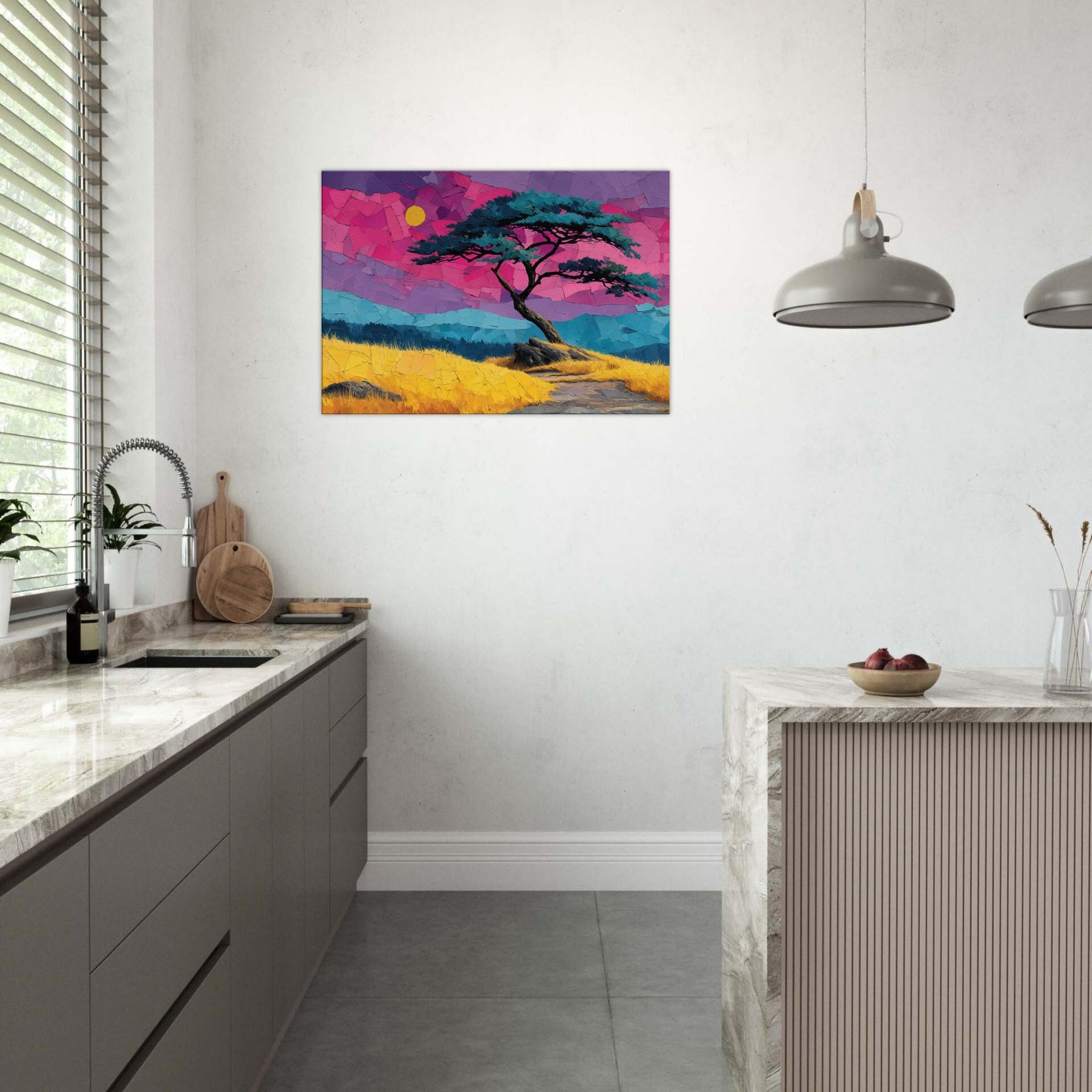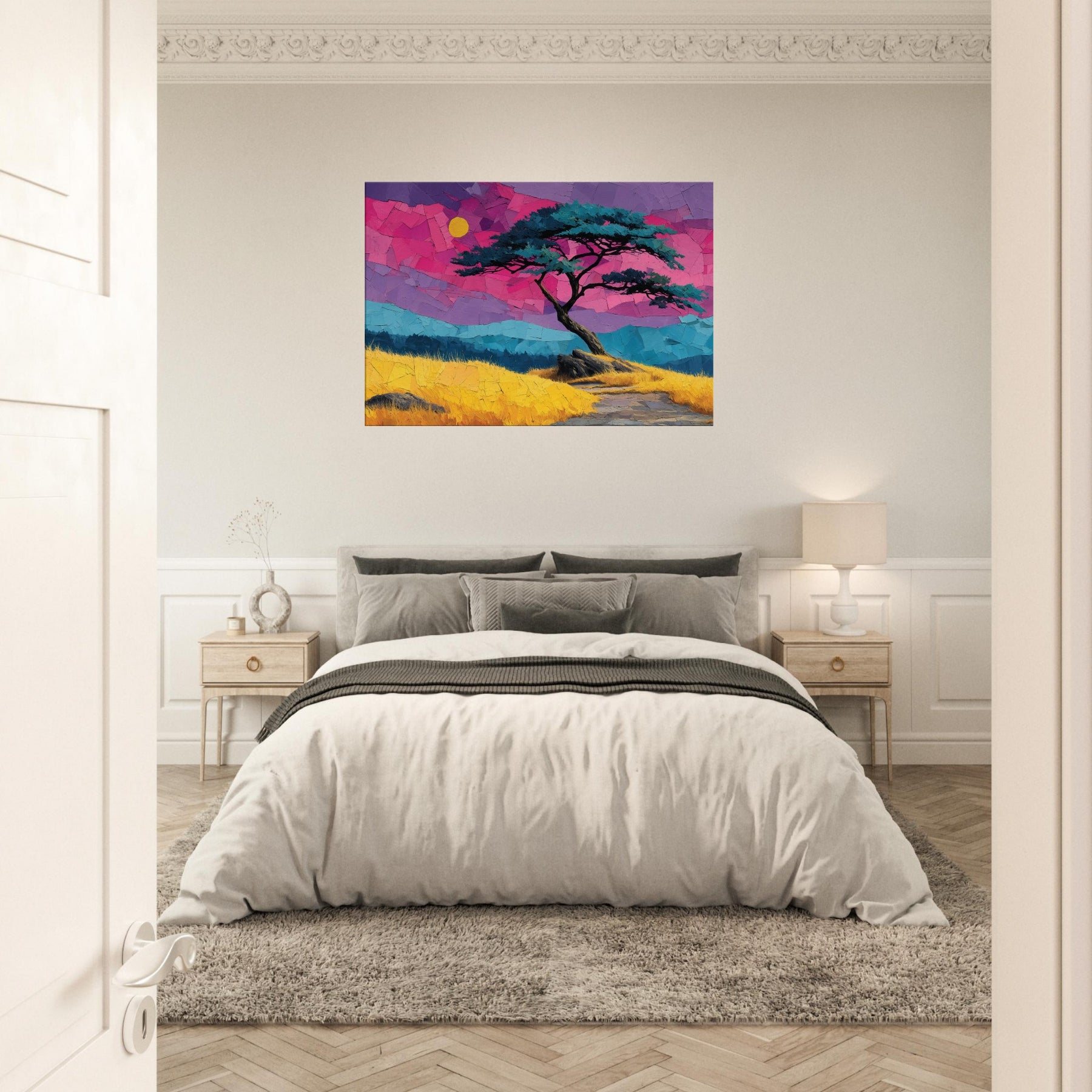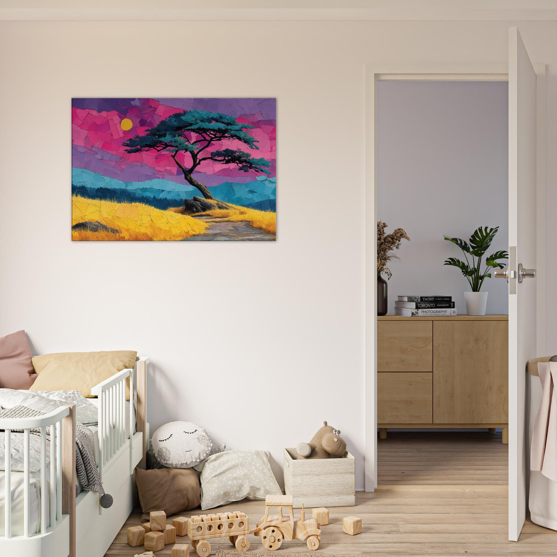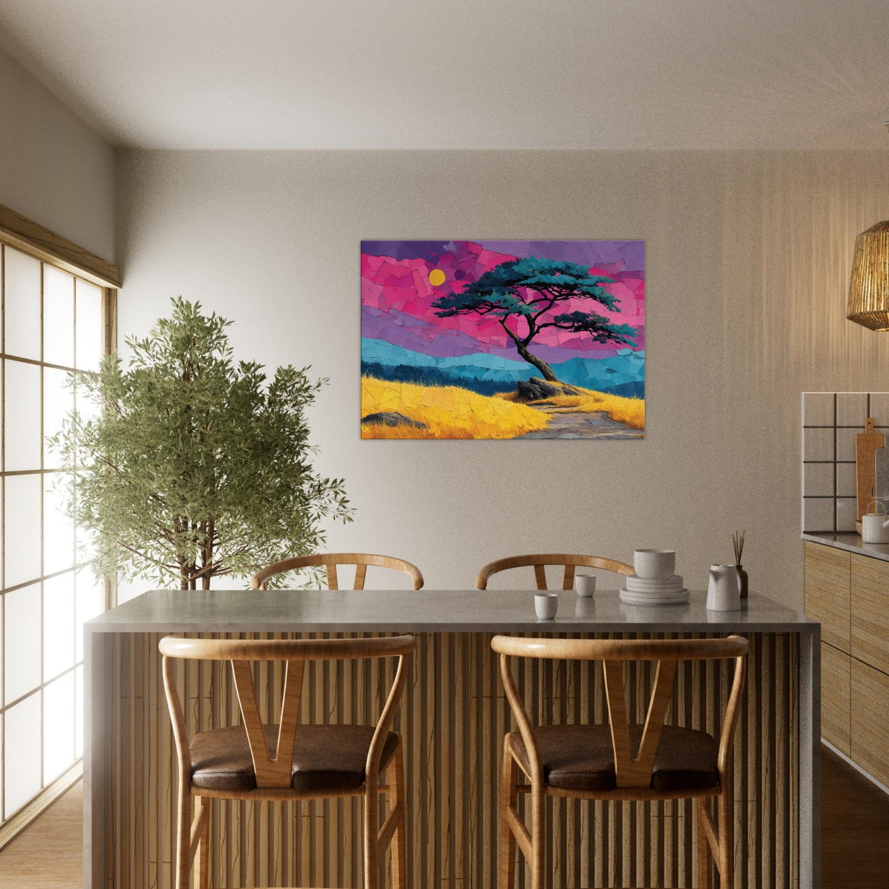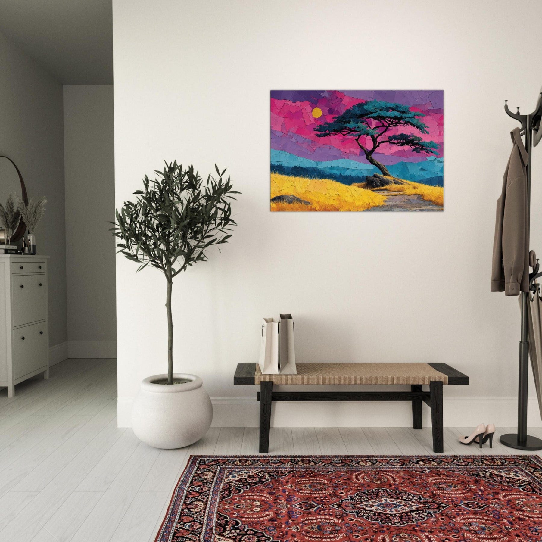 Savannah comes to your wall as a wind swept romance of color. This piece invites the room to breathe: an ache of yellow grasses, a solitary tree leaning into the horizon, and a sky stitched from pinks, purples, and turquoise. The atmosphere is warm yet electric, turning a quiet corner into a destination. Hang it where light meets shadow, and watch everyday moments glow with the scent of sun warmed earth and distant thunder.