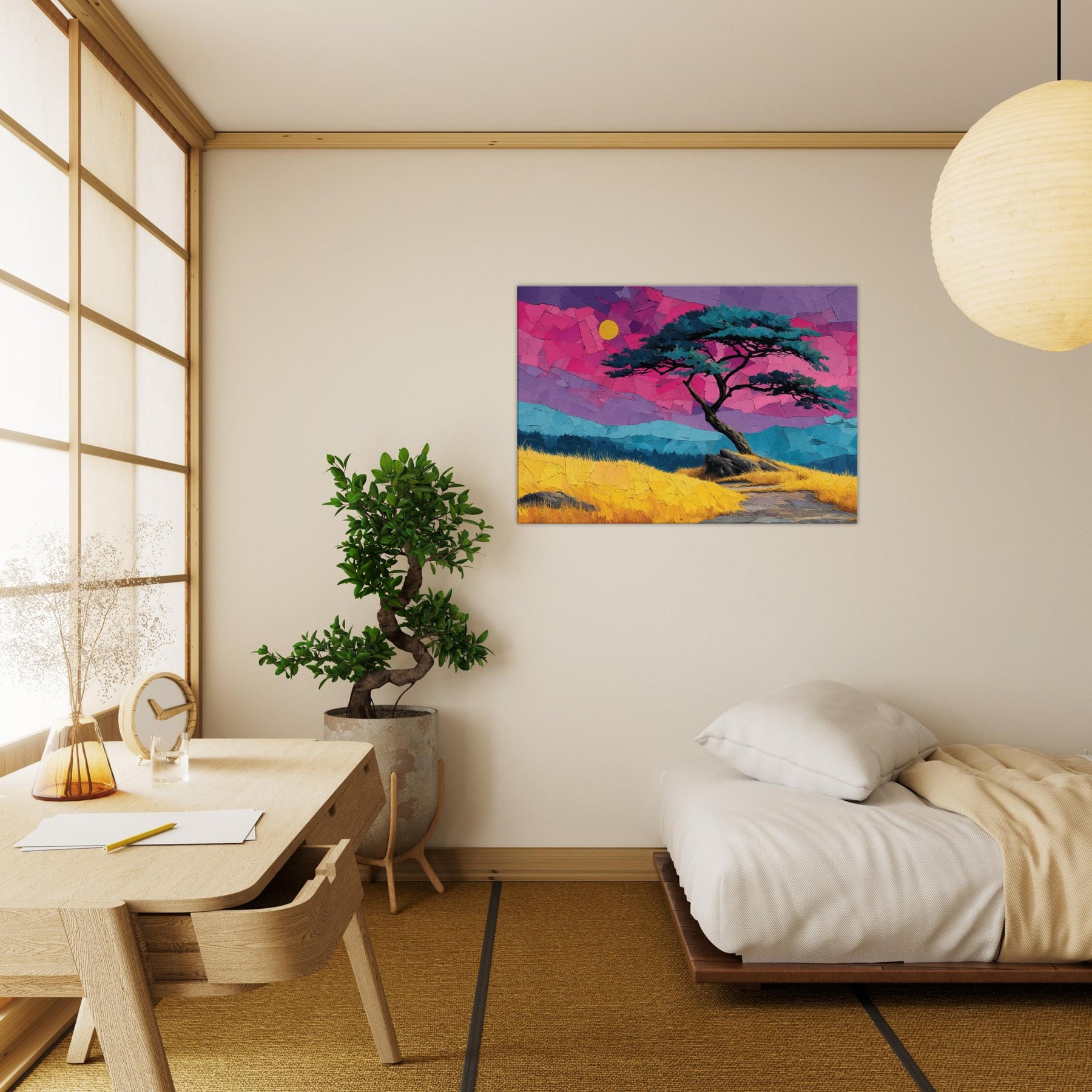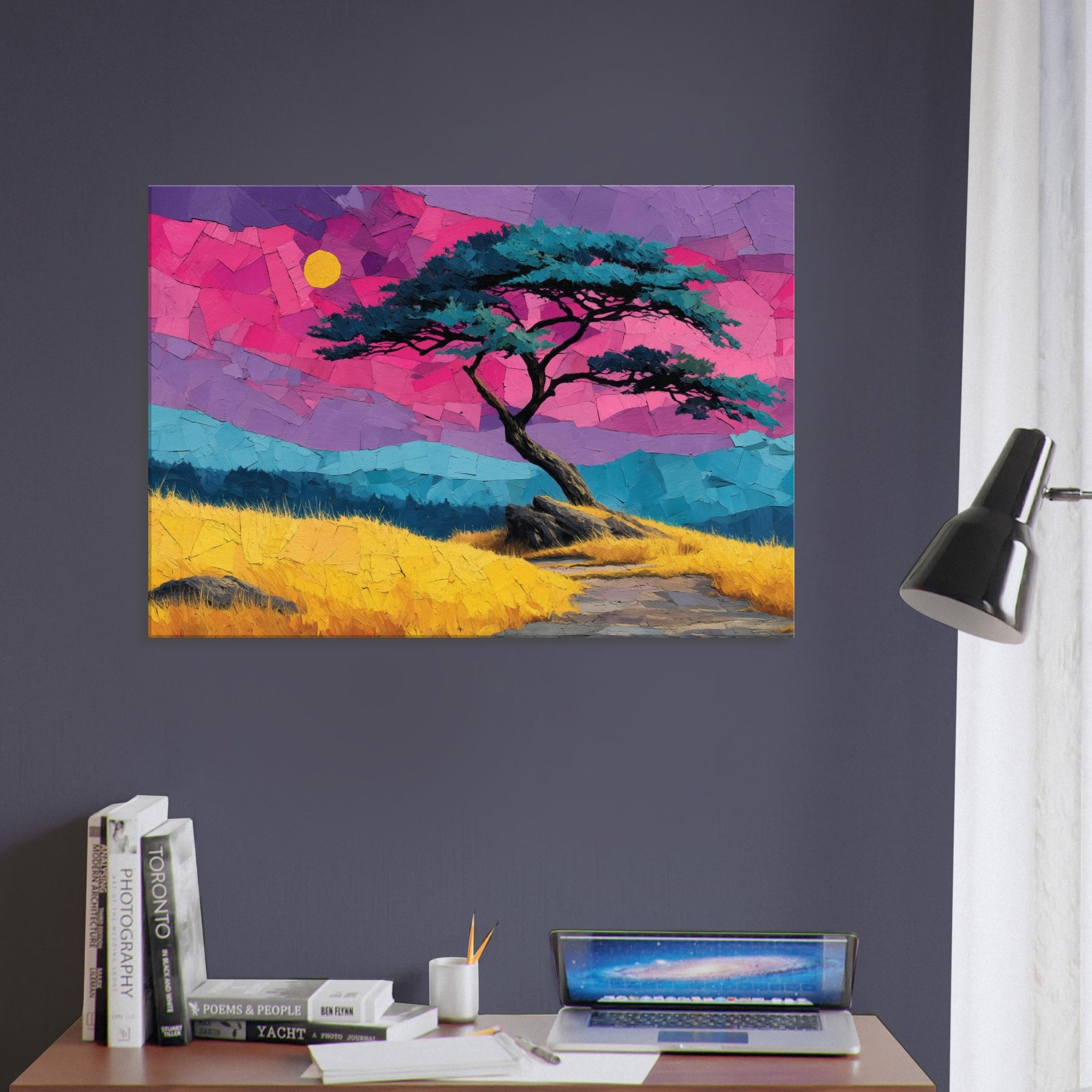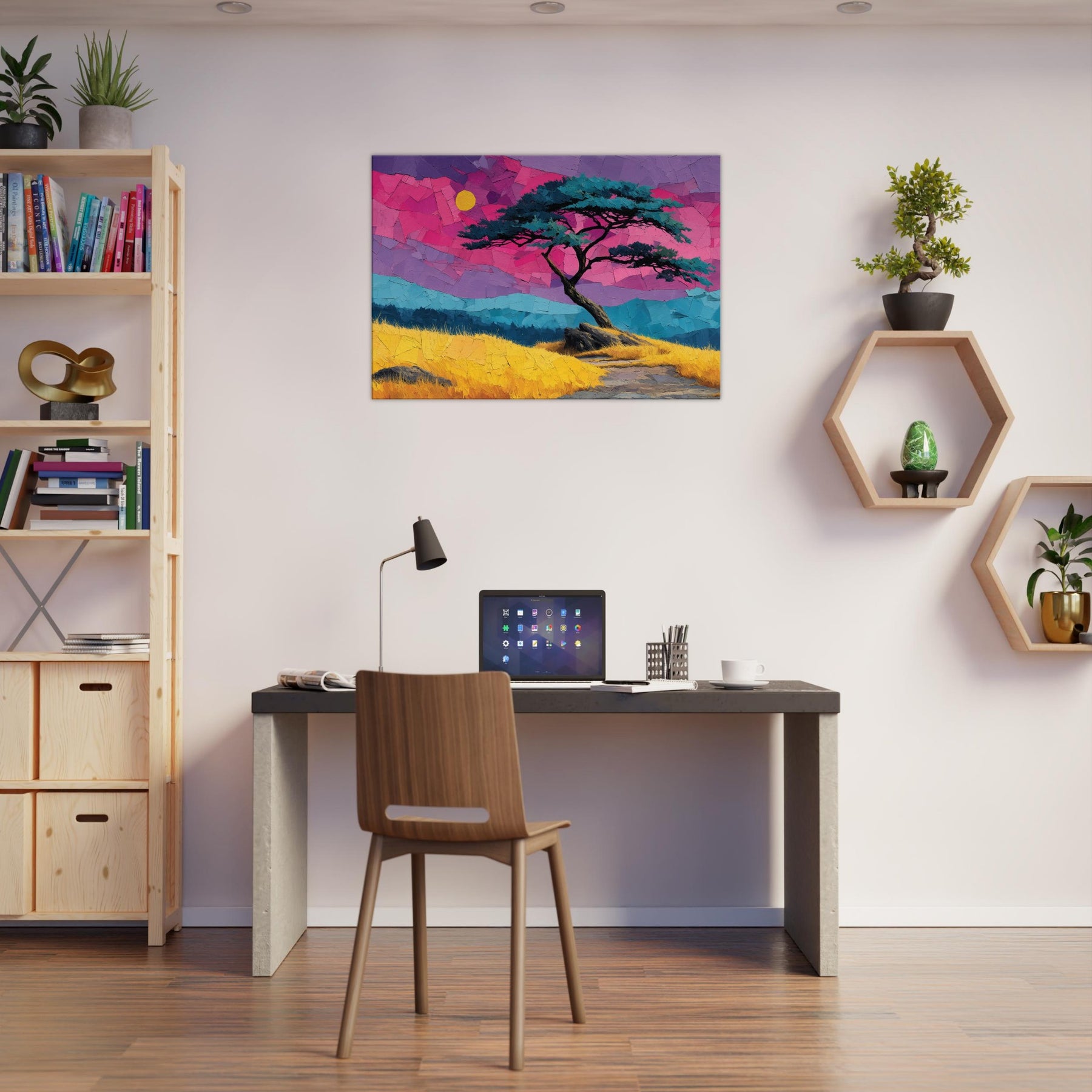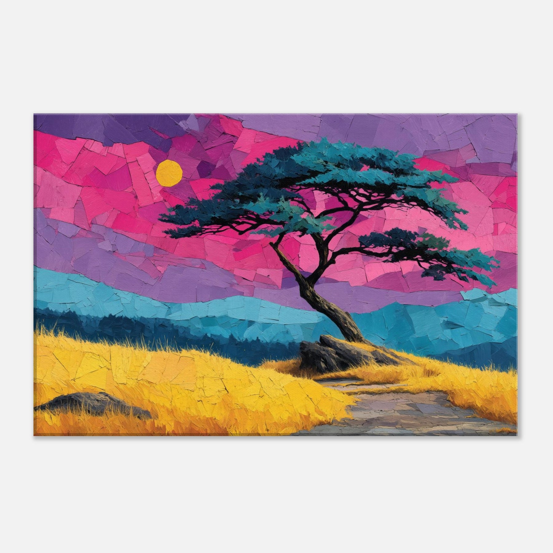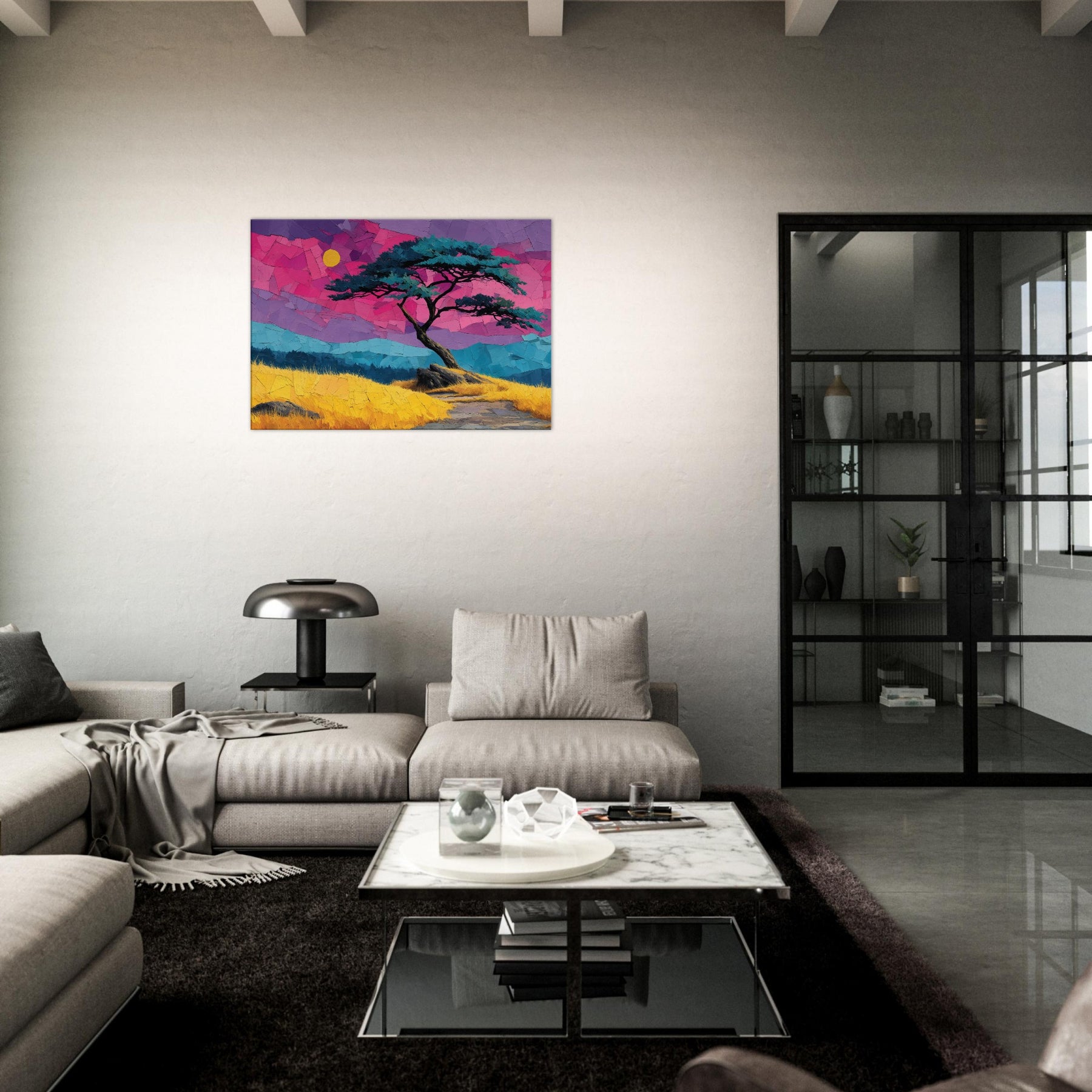 Savannah comes to your wall as a wind swept romance of color. This piece invites the room to breathe: an ache of yellow grasses, a solitary tree leaning into the horizon, and a sky stitched from pinks, purples, and turquoise. The atmosphere is warm yet electric, turning a quiet corner into a destination. Hang it where light meets shadow, and watch everyday moments glow with the scent of sun warmed earth and distant thunder.