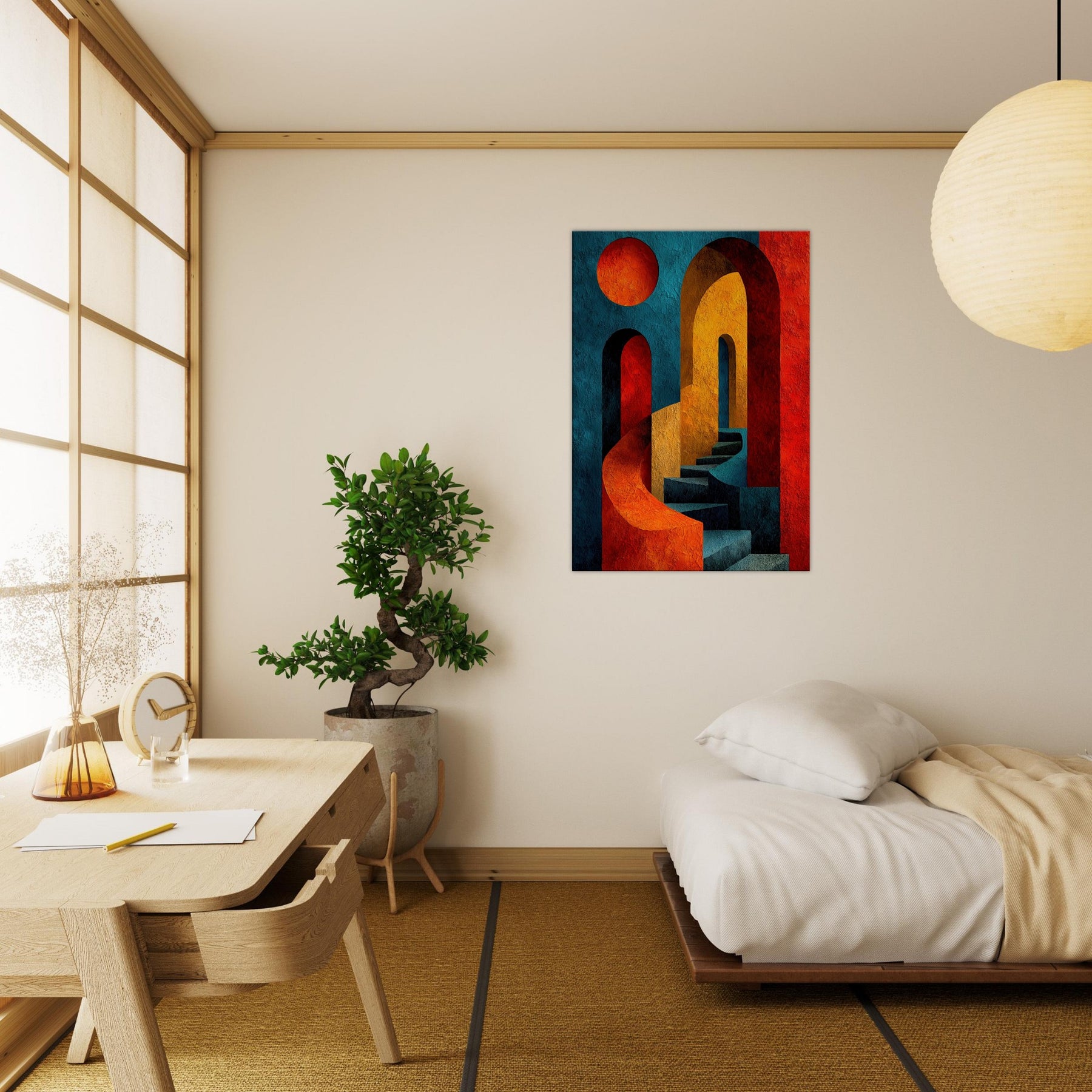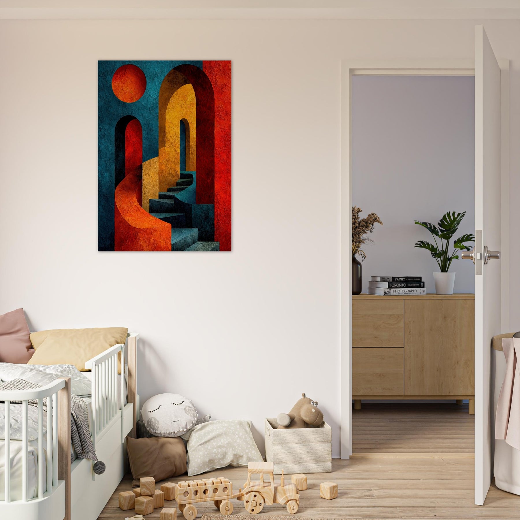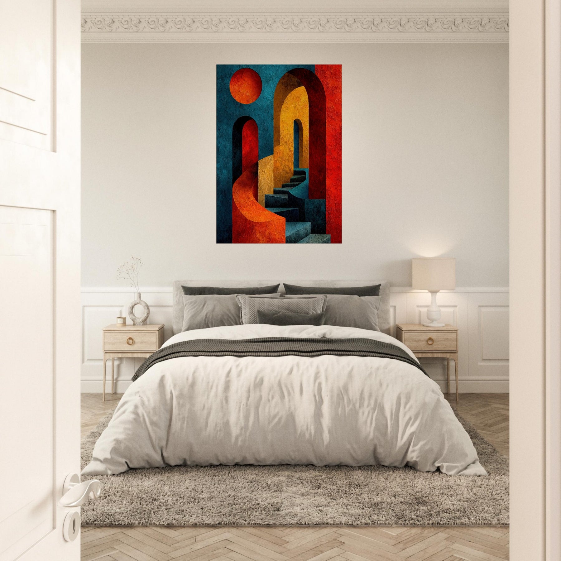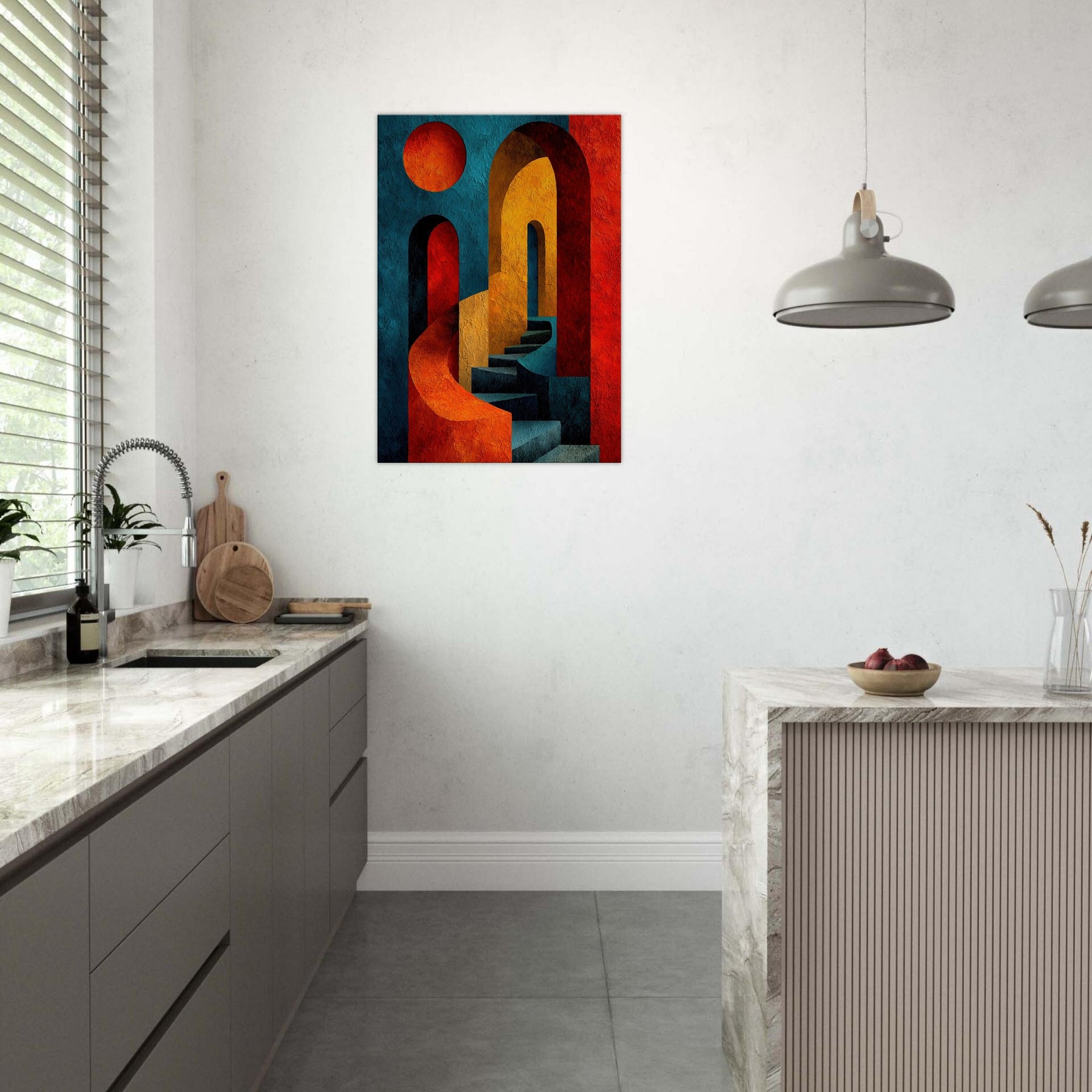 Arches Composition drifts through a chamber of color and light, inviting the eye to wander along curved corridors and shadowed arches. This abstract arrangement hums with warmth and depth, twisting teal and coral into a living sculpture that breathes with you. The surface texture evokes sun warmed plaster and twilight velvet, making a room feel both intimate and expansive. Perfect as a calming focal point, it pairs beautifully with warm woods or cool metals, transforming an ordinary wall into a contemplative horizon. Arches Composition invites quiet curiosity into any living space.
