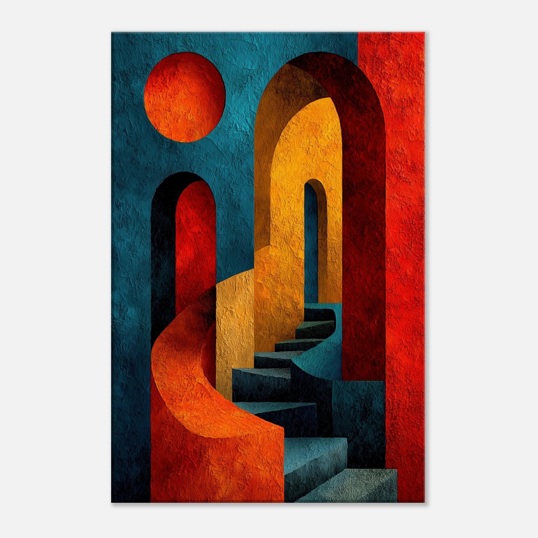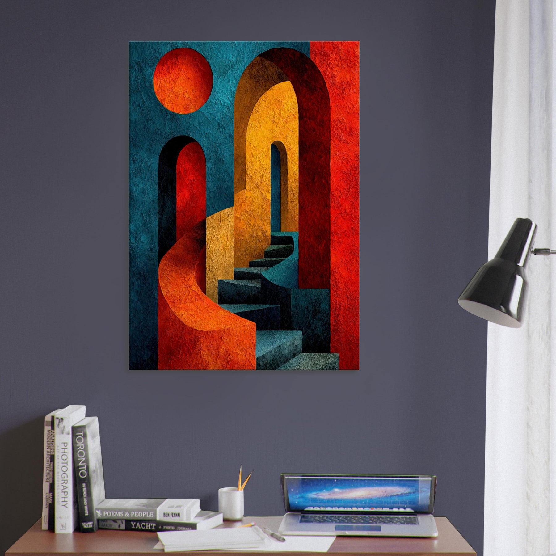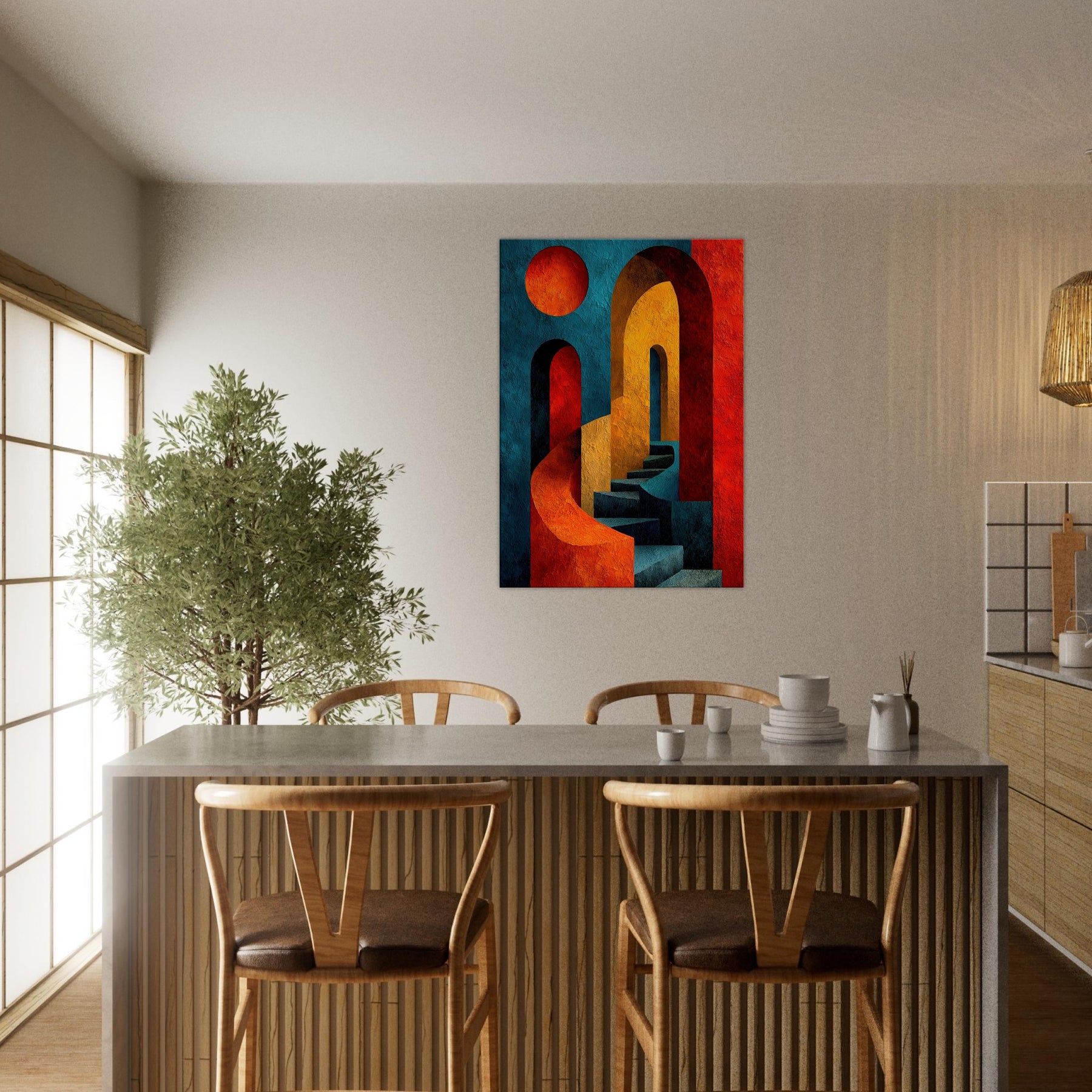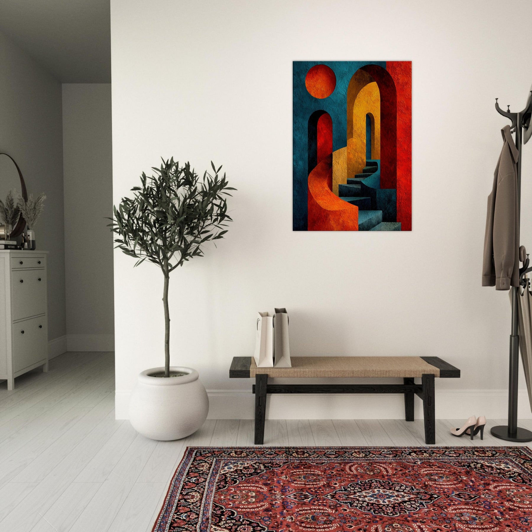 Arches Composition drifts through a chamber of color and light, inviting the eye to wander along curved corridors and shadowed arches. This abstract arrangement hums with warmth and depth, twisting teal and coral into a living sculpture that breathes with you. The surface texture evokes sun warmed plaster and twilight velvet, making a room feel both intimate and expansive. Perfect as a calming focal point, it pairs beautifully with warm woods or cool metals, transforming an ordinary wall into a contemplative horizon. Arches Composition invites quiet curiosity into any living space.