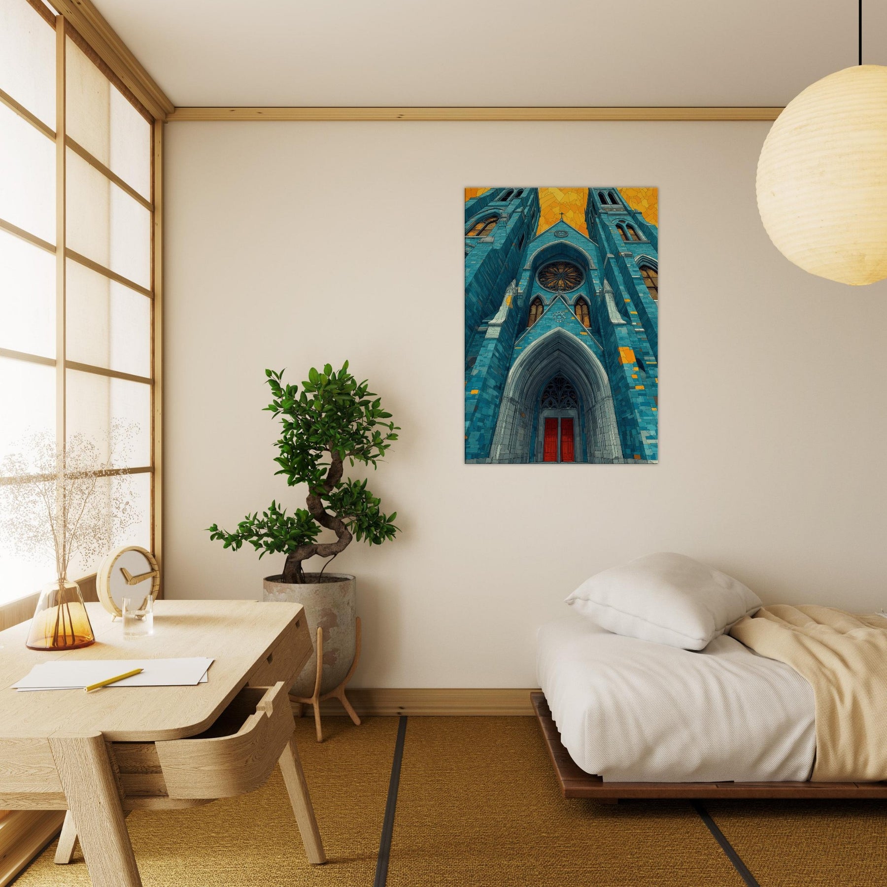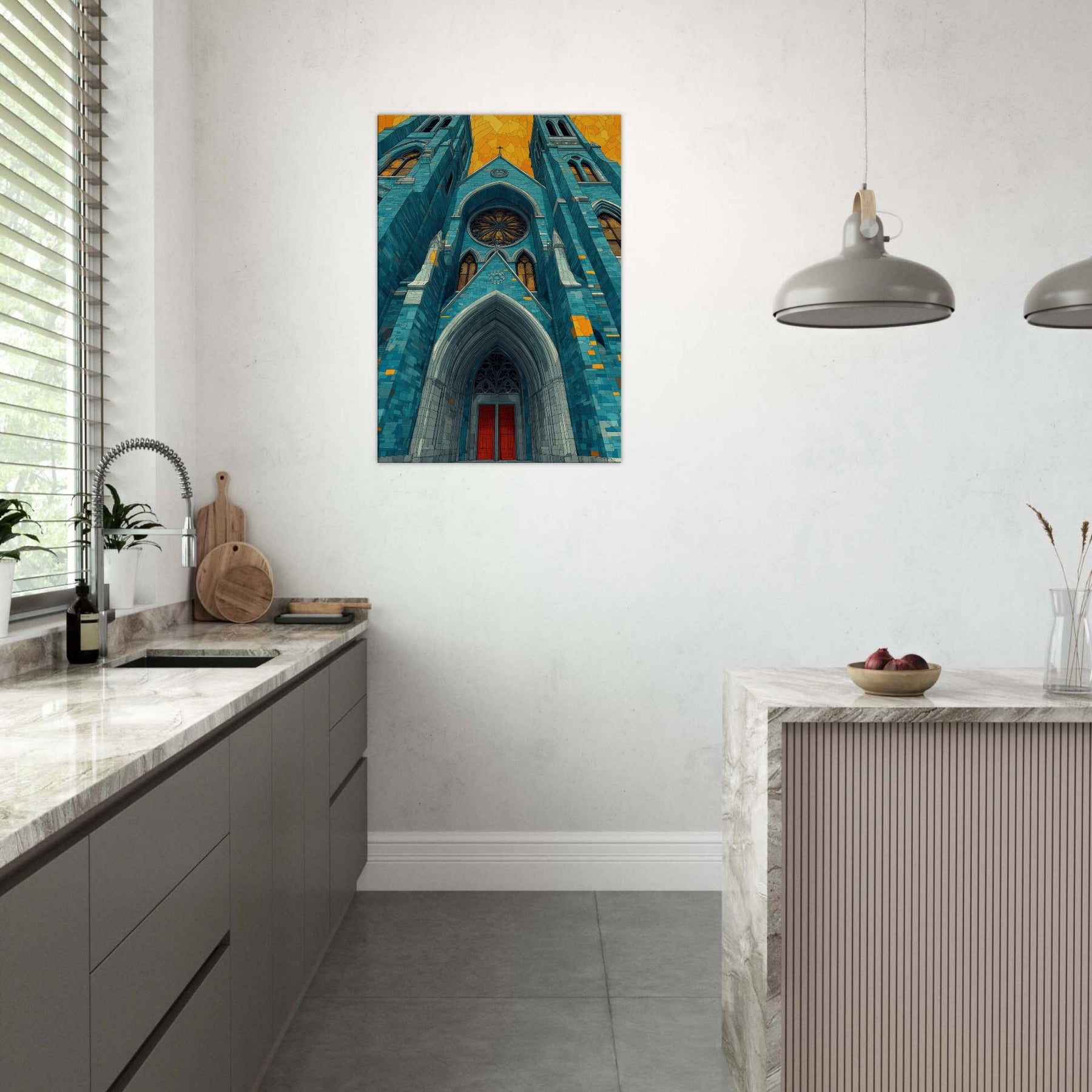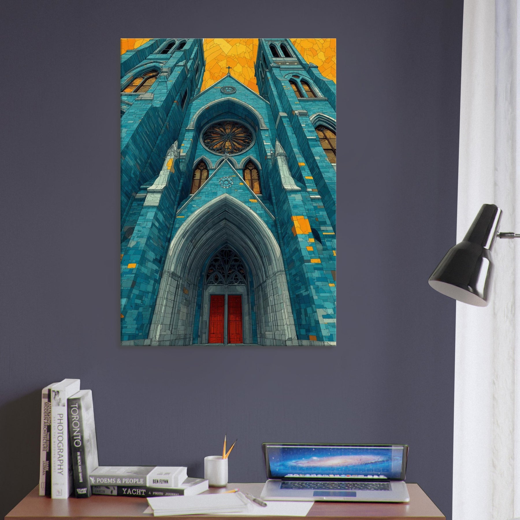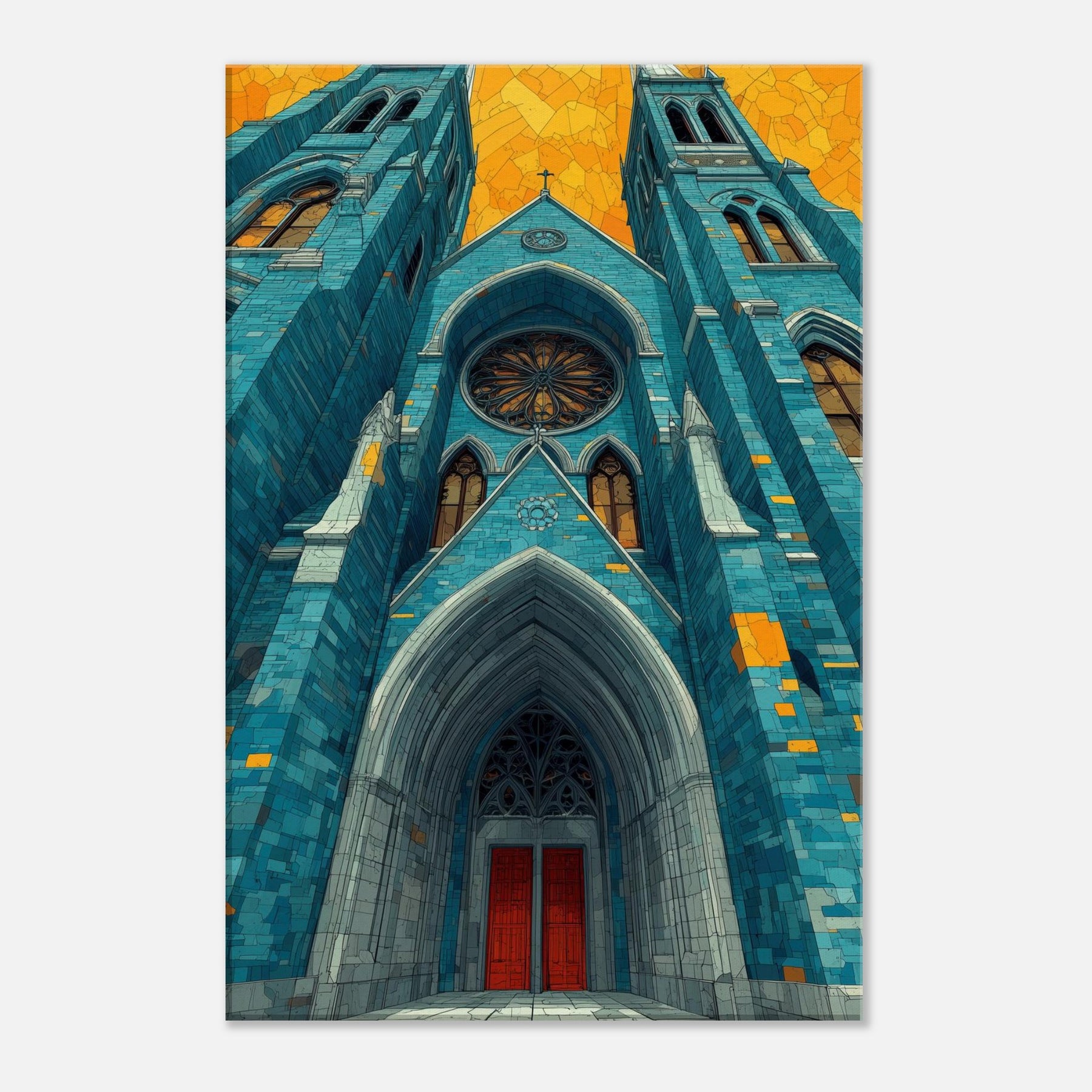 Within this dreamlike rendering, the Gothic Cathedral rises in serene, cerulean tones its arches carved in light and shadow, stitched with amber glints. The abstract composition invites quiet reflection, turning a grand exterior into a mood setting focal point that warms a living space and slows the pace of a busy day. Imagine mornings bathed in blue firelight, evenings softened by gold echoes, as this artwork lends timeless hush and architectural poetry to your home.