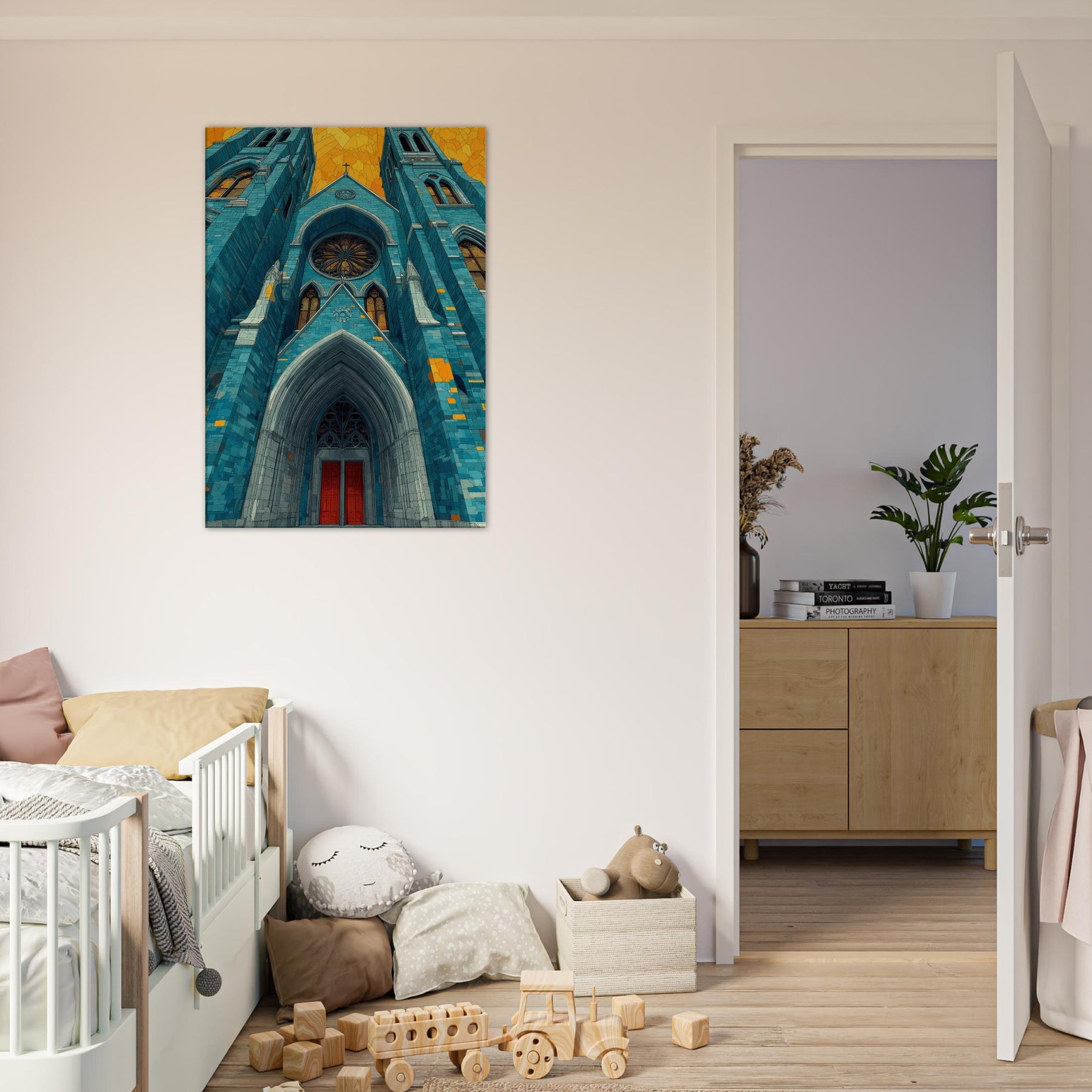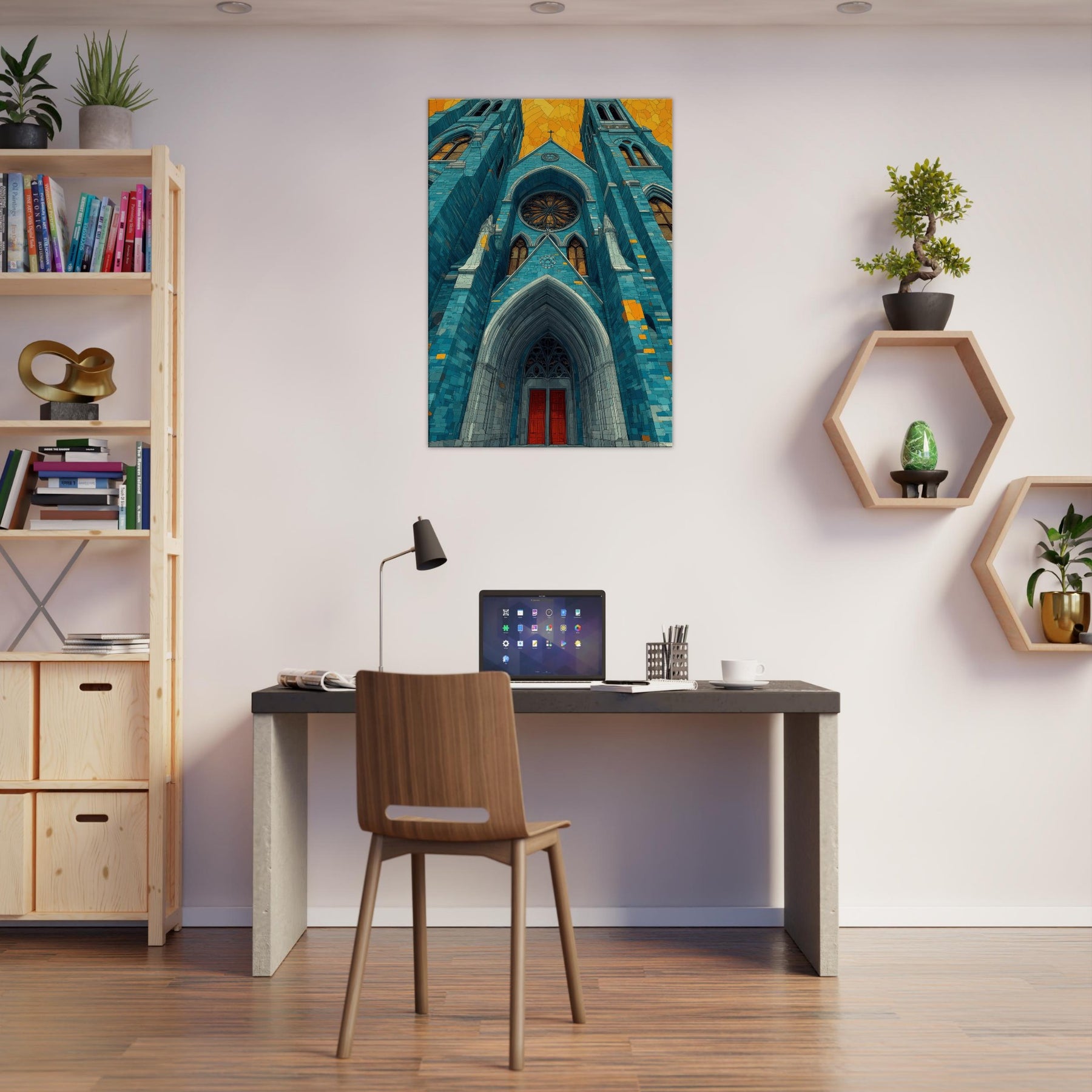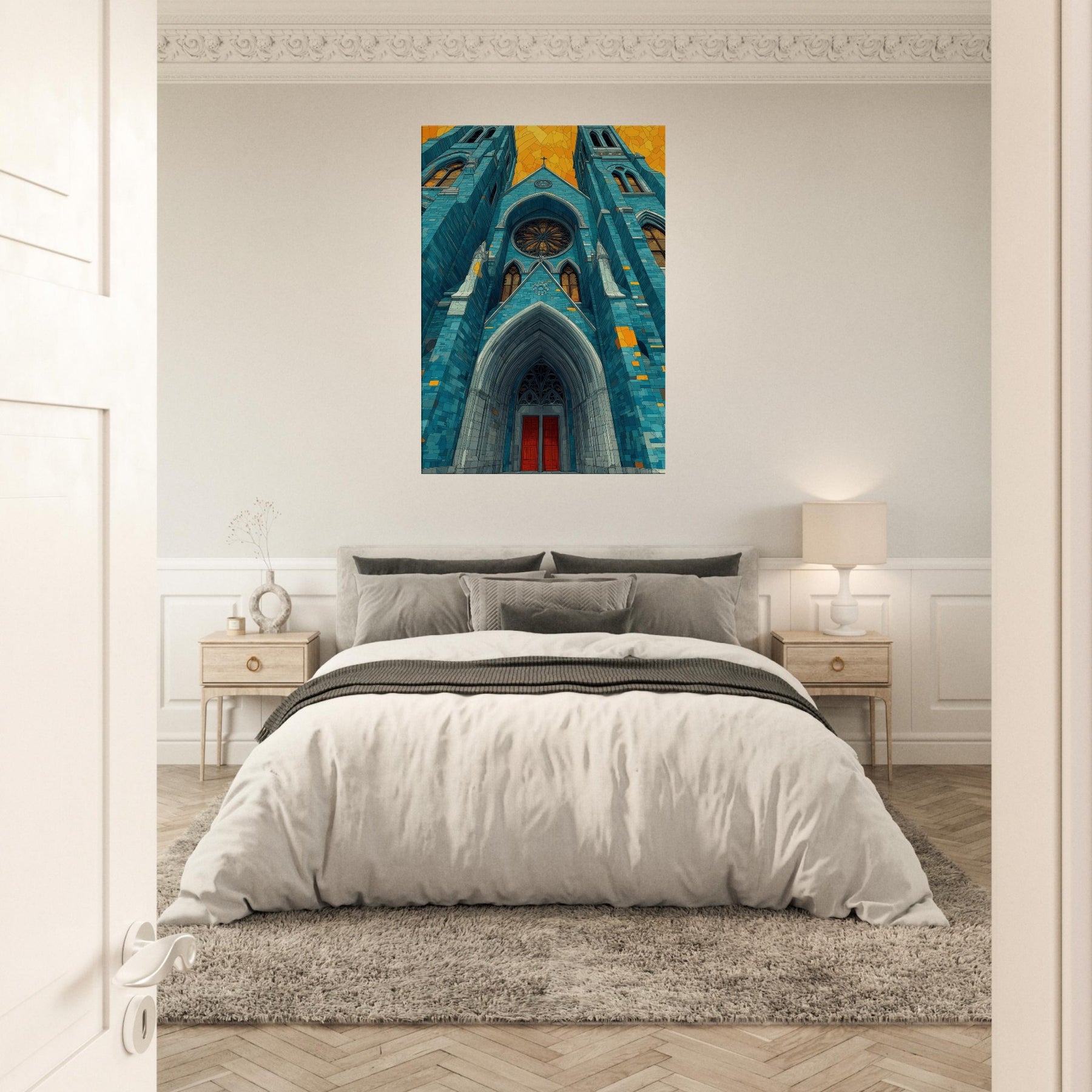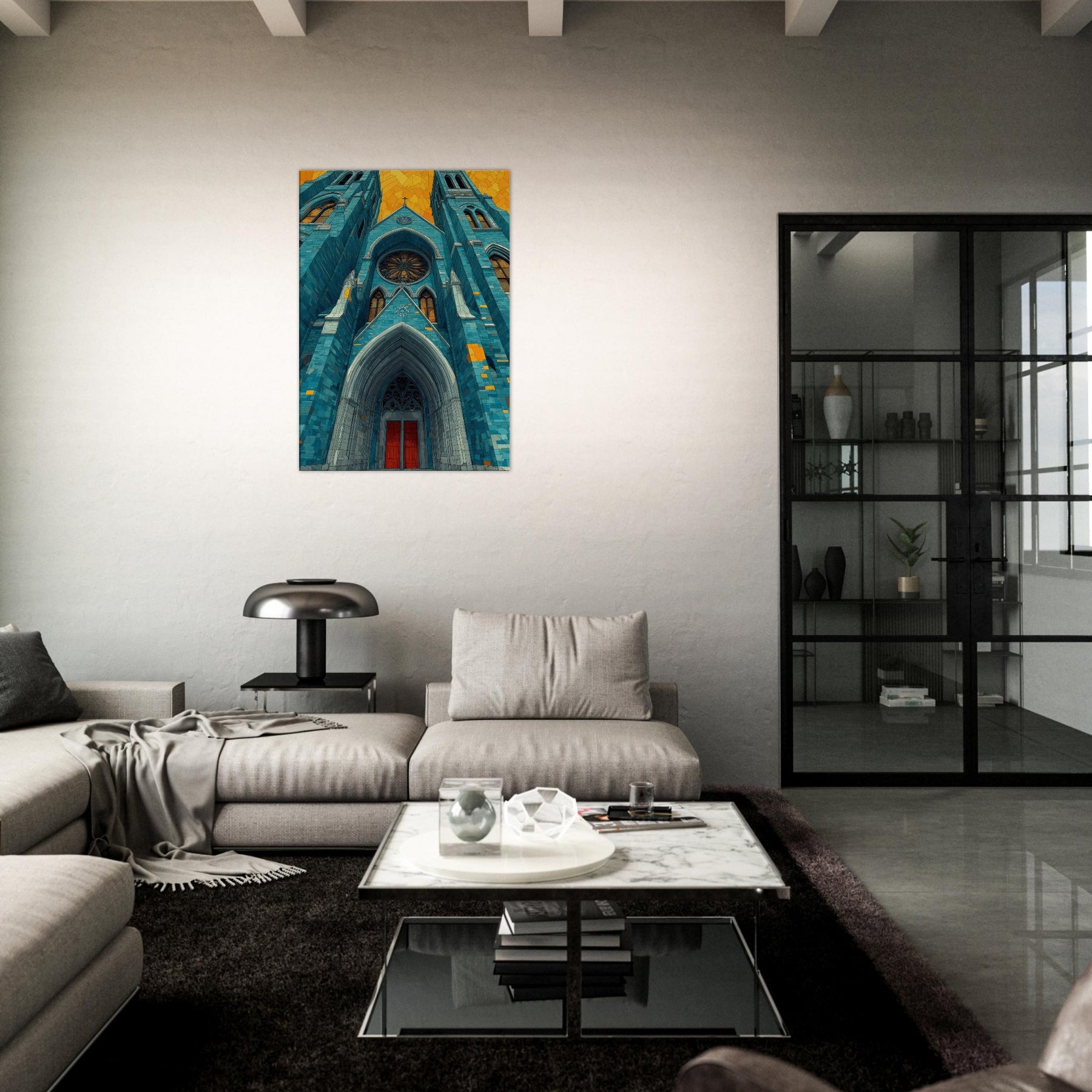 Within this dreamlike rendering, the Gothic Cathedral rises in serene, cerulean tones its arches carved in light and shadow, stitched with amber glints. The abstract composition invites quiet reflection, turning a grand exterior into a mood setting focal point that warms a living space and slows the pace of a busy day. Imagine mornings bathed in blue firelight, evenings softened by gold echoes, as this artwork lends timeless hush and architectural poetry to your home.