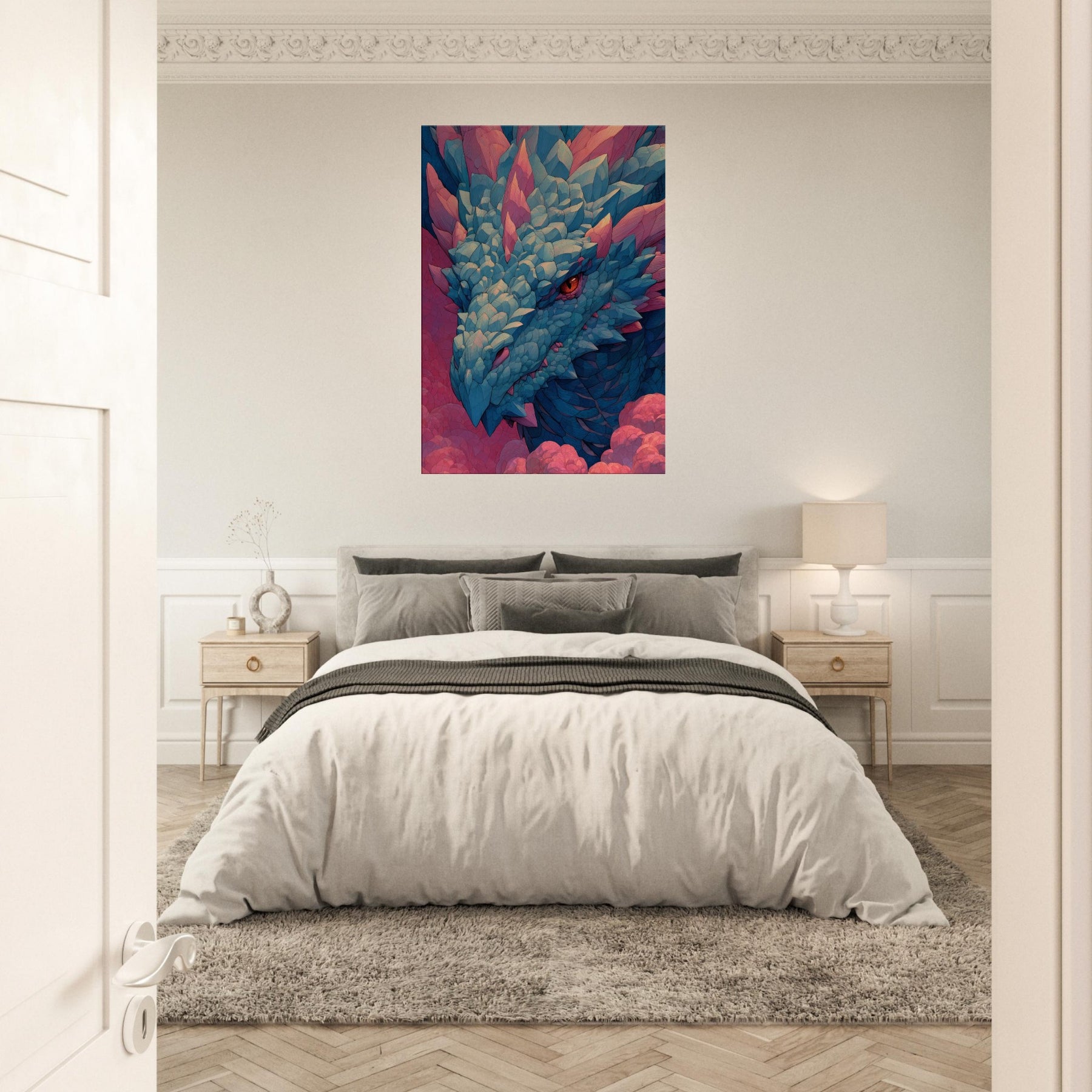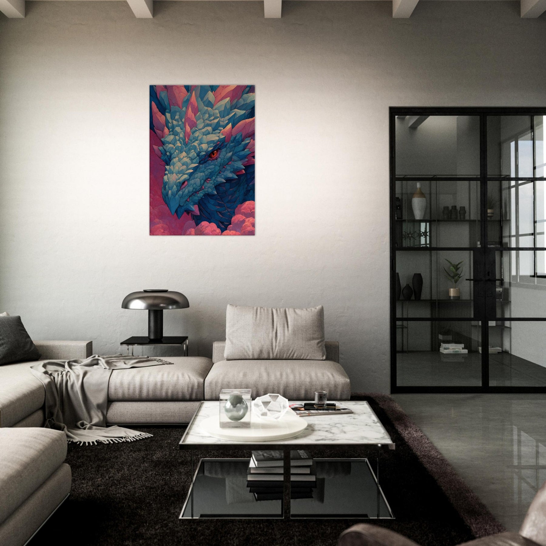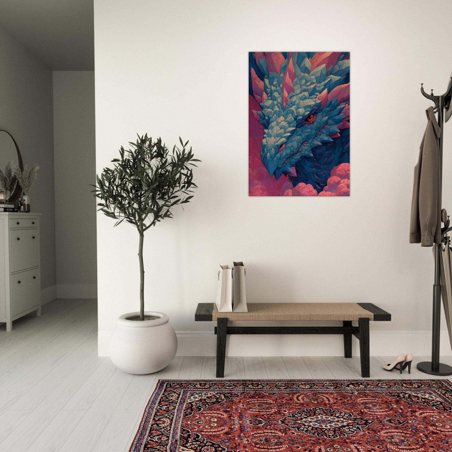 Azure Dragon of the East Flying Through Thunderous Skies glides across a storm lit horizon, inviting a living space into legend. Its azure scales shimmer with electric blues and pink rose highlights, while jagged shapes suggest wind and lightning. The composition hums with motion, balancing calm with seismic energy. Hang this piece in a sunlit living room or a moody study to spark imagination, invite conversation, and elevate your space with a bold, mythical aura.