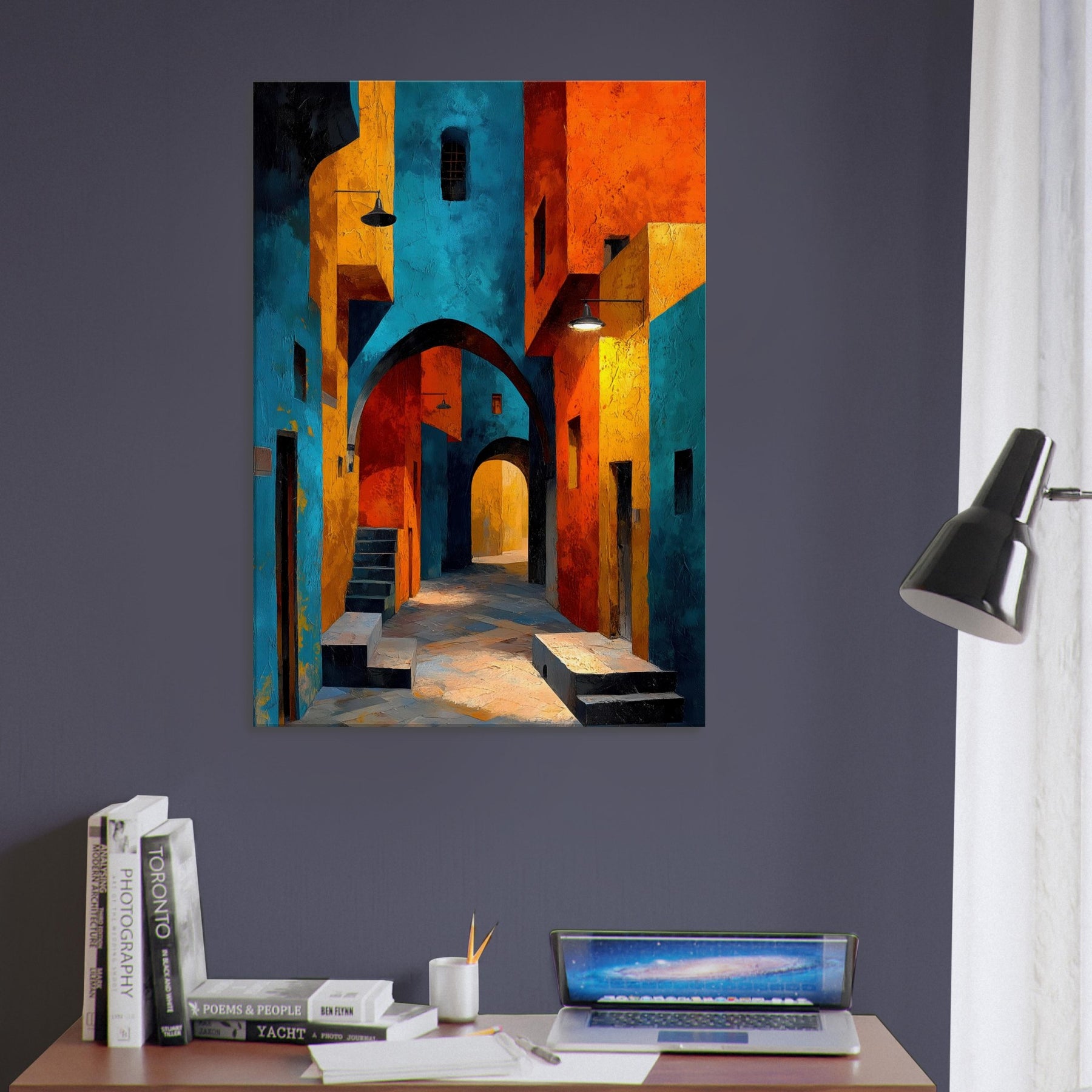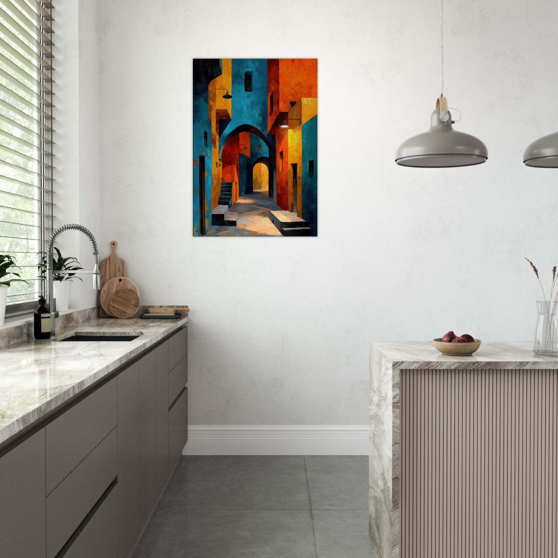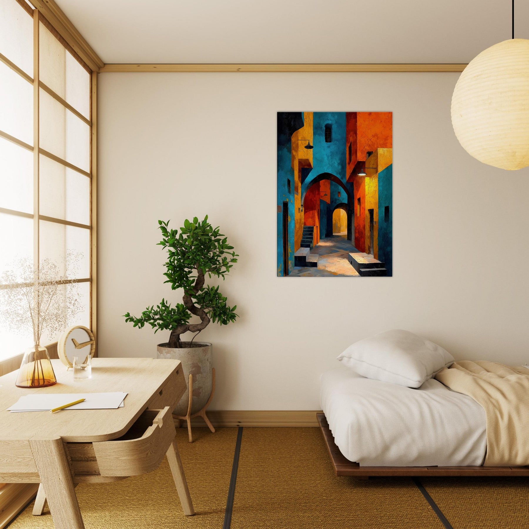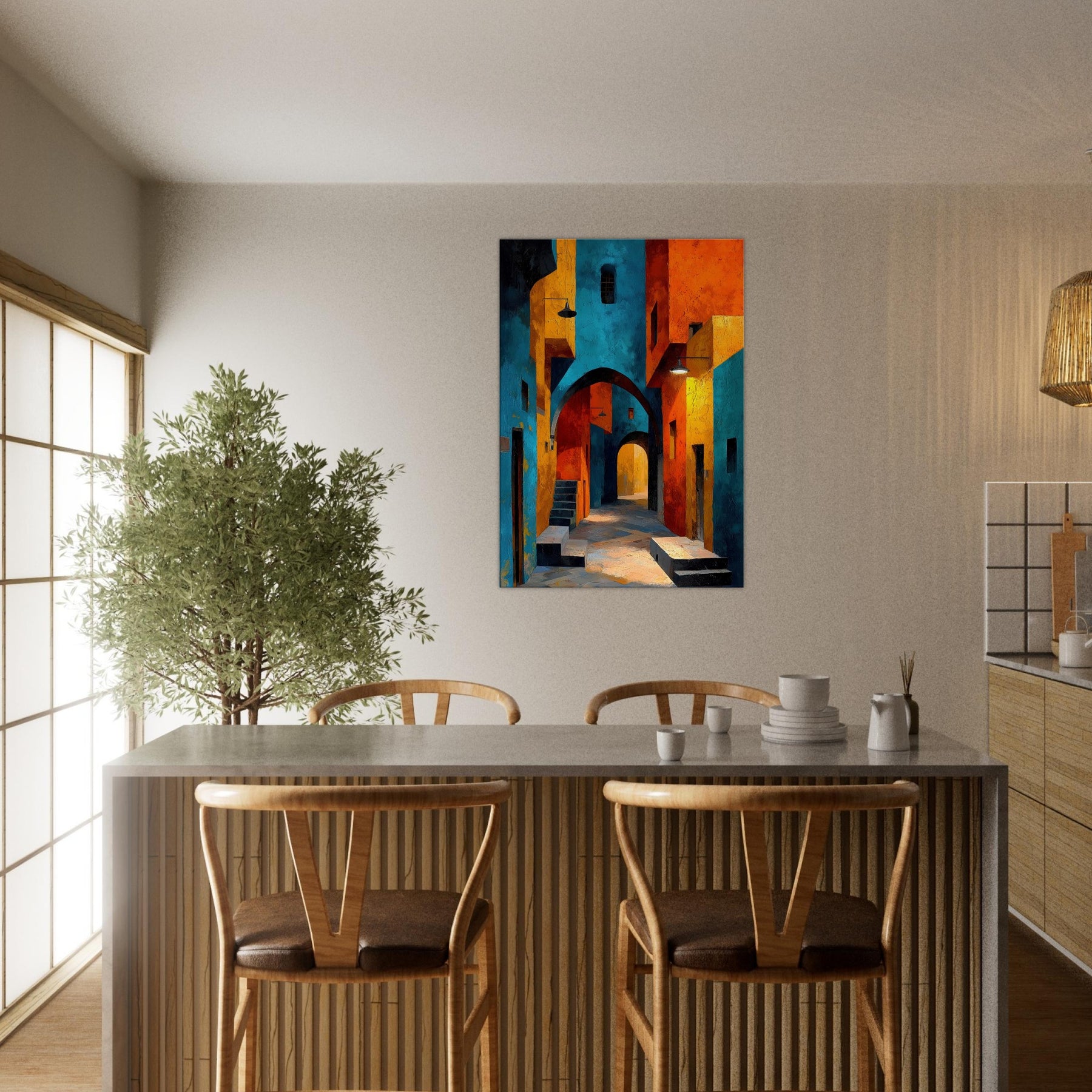 Step into an evening market where walls breathe with electric blues and warm saffron, as if the Arabian Bazaar were drawn into another plane. This abstract composition folds streets into arches and light, inviting the eye to wander from shade to glow, from stair to doorway. The layered hues, tactile textures, and quiet rhythm evoke the scents of spice and rain washed stone, adding depth and warmth to a living room or study. A contemporary focal point that transforms space into a sensorial journey.