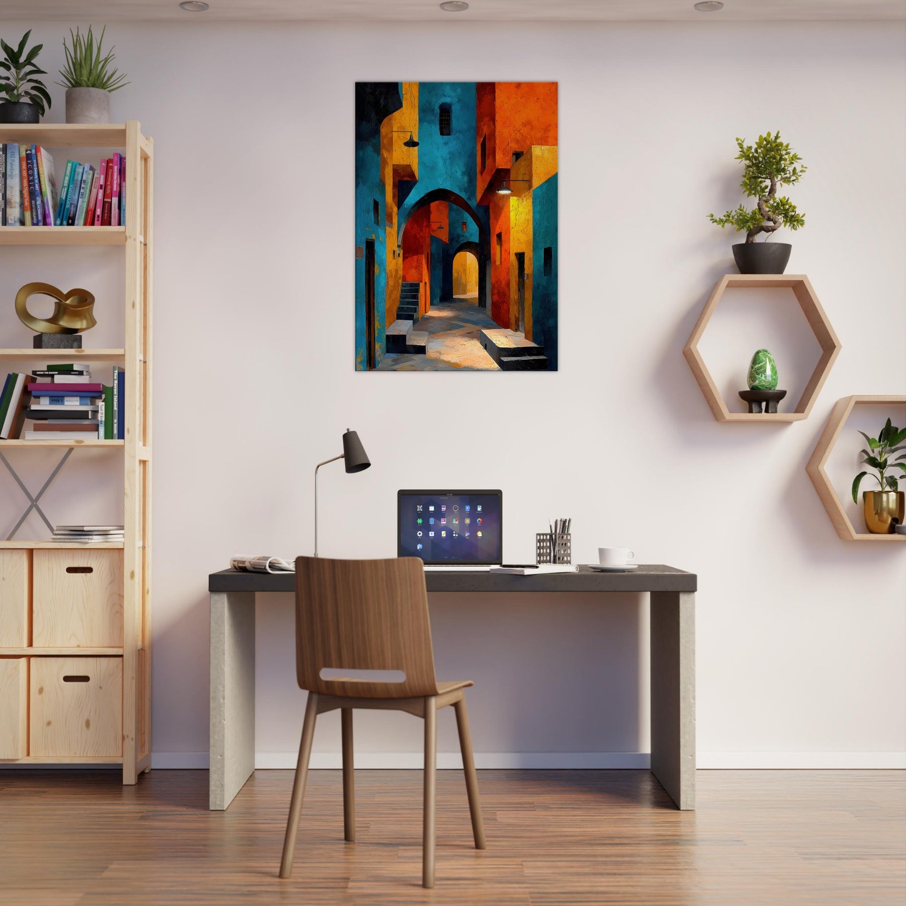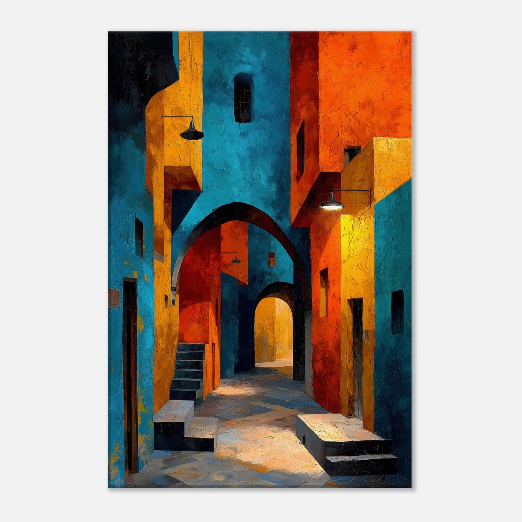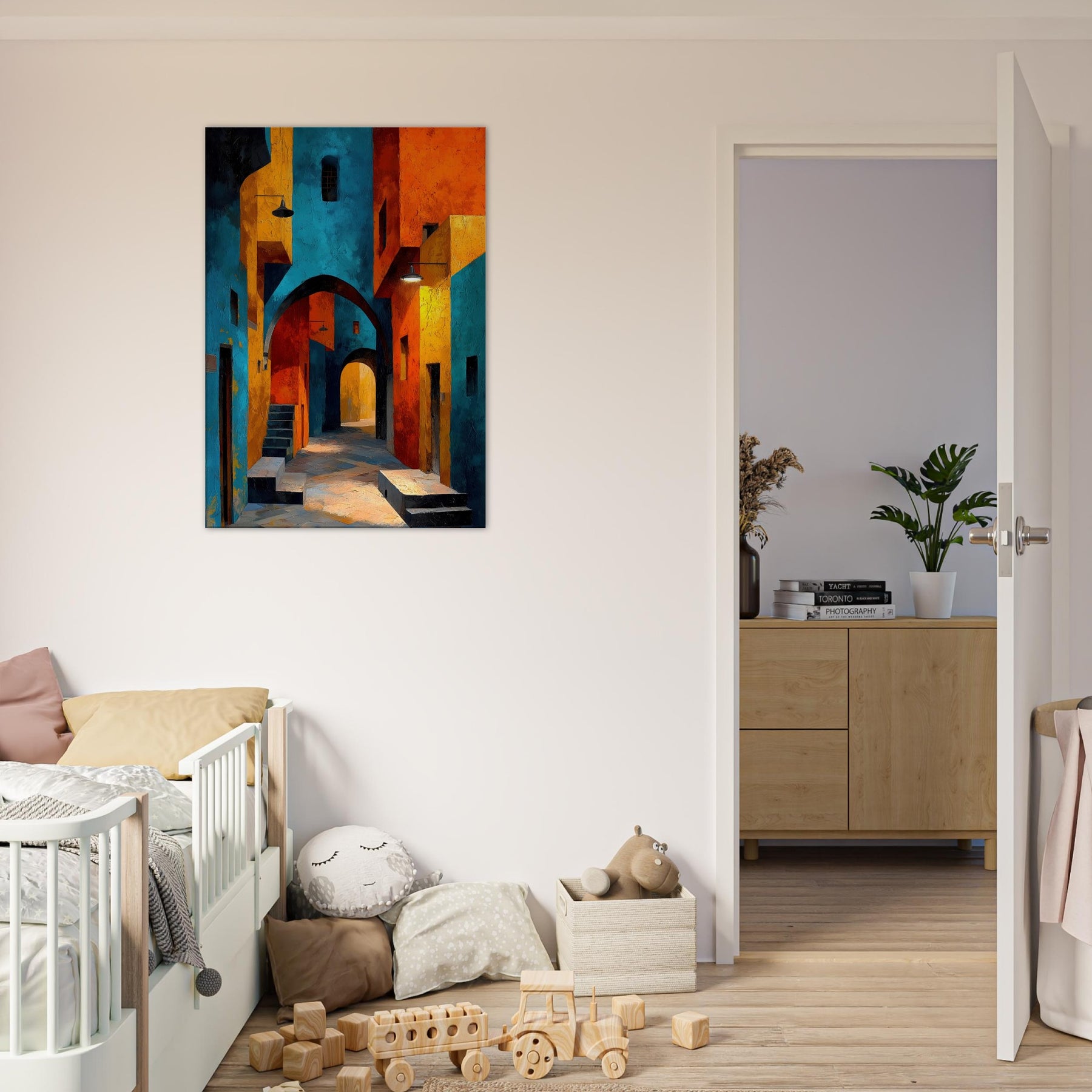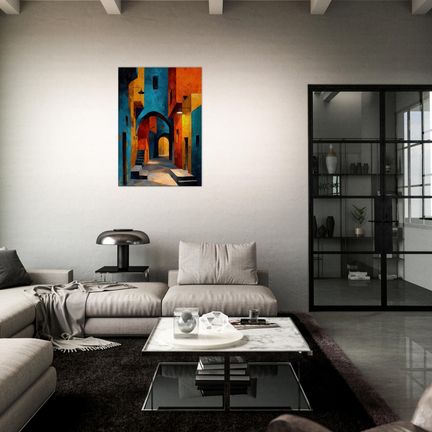 Step into an evening market where walls breathe with electric blues and warm saffron, as if the Arabian Bazaar were drawn into another plane. This abstract composition folds streets into arches and light, inviting the eye to wander from shade to glow, from stair to doorway. The layered hues, tactile textures, and quiet rhythm evoke the scents of spice and rain washed stone, adding depth and warmth to a living room or study. A contemporary focal point that transforms space into a sensorial journey.