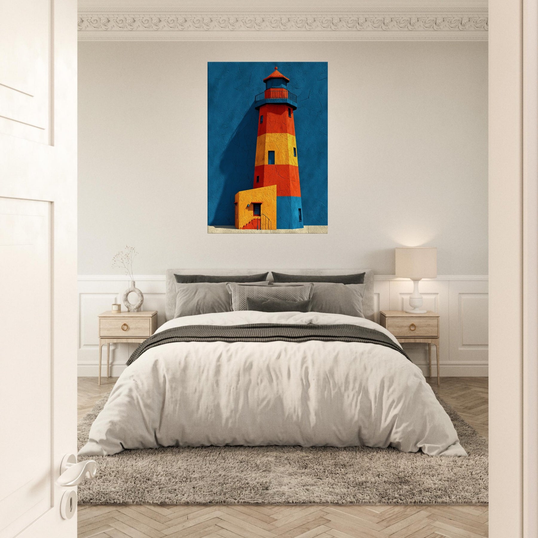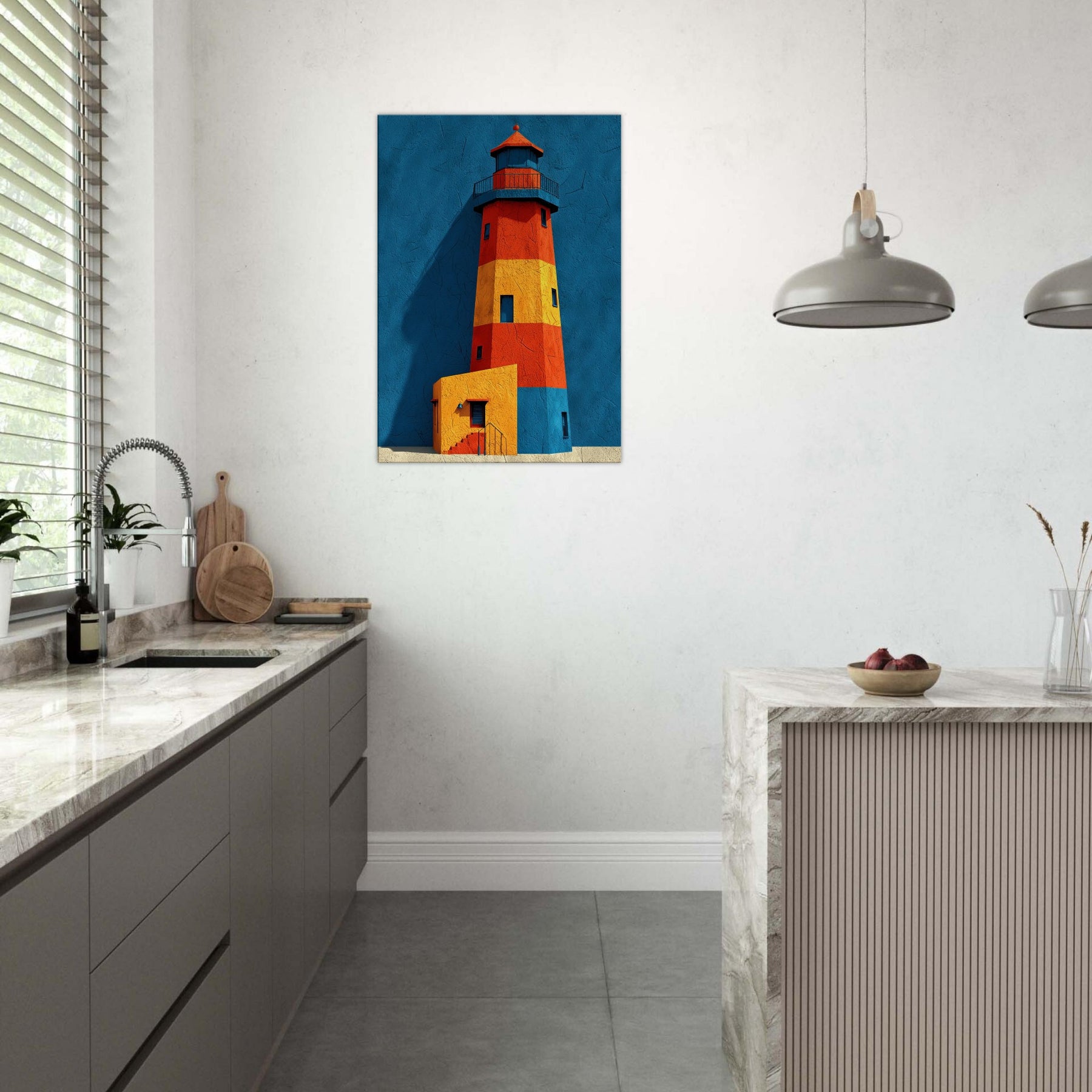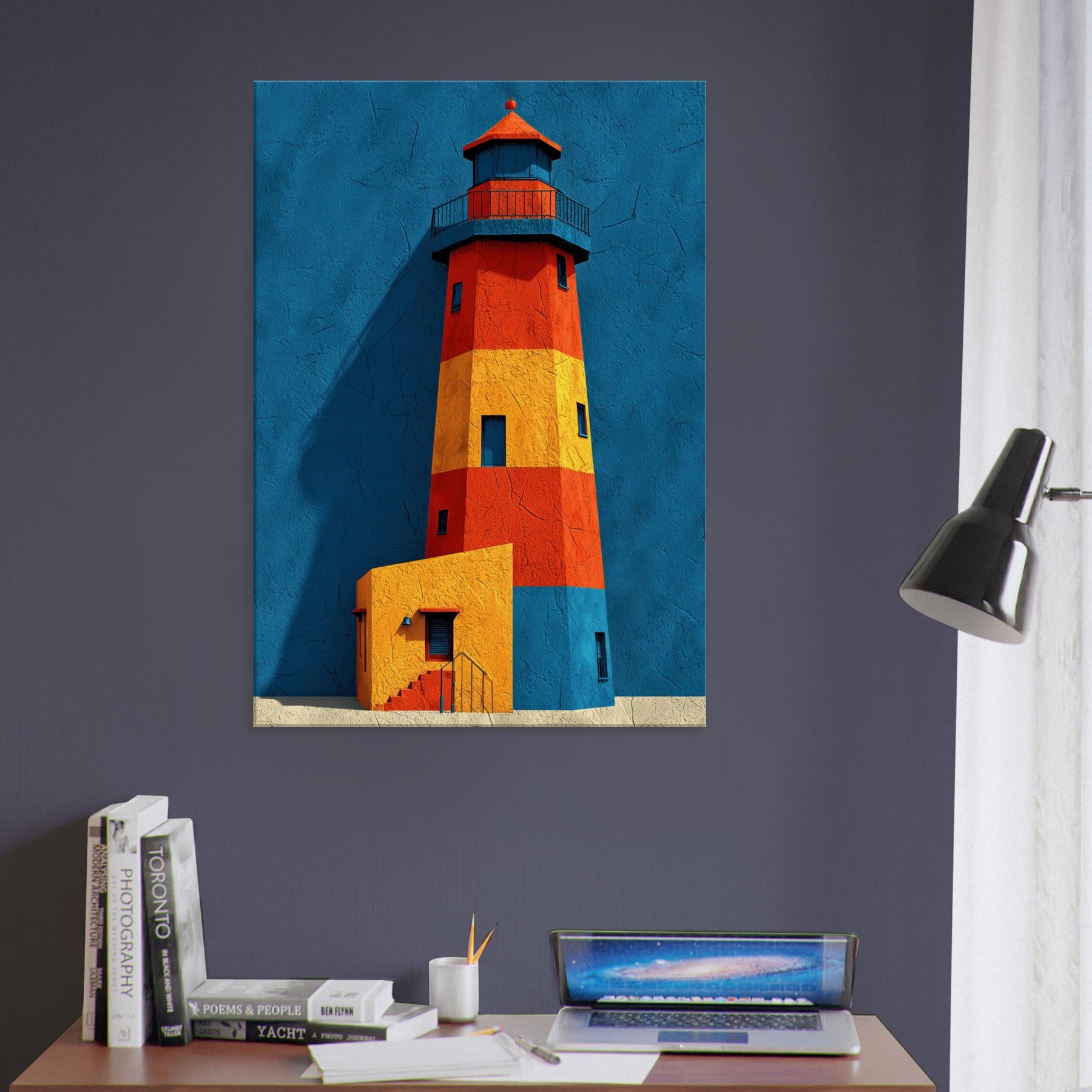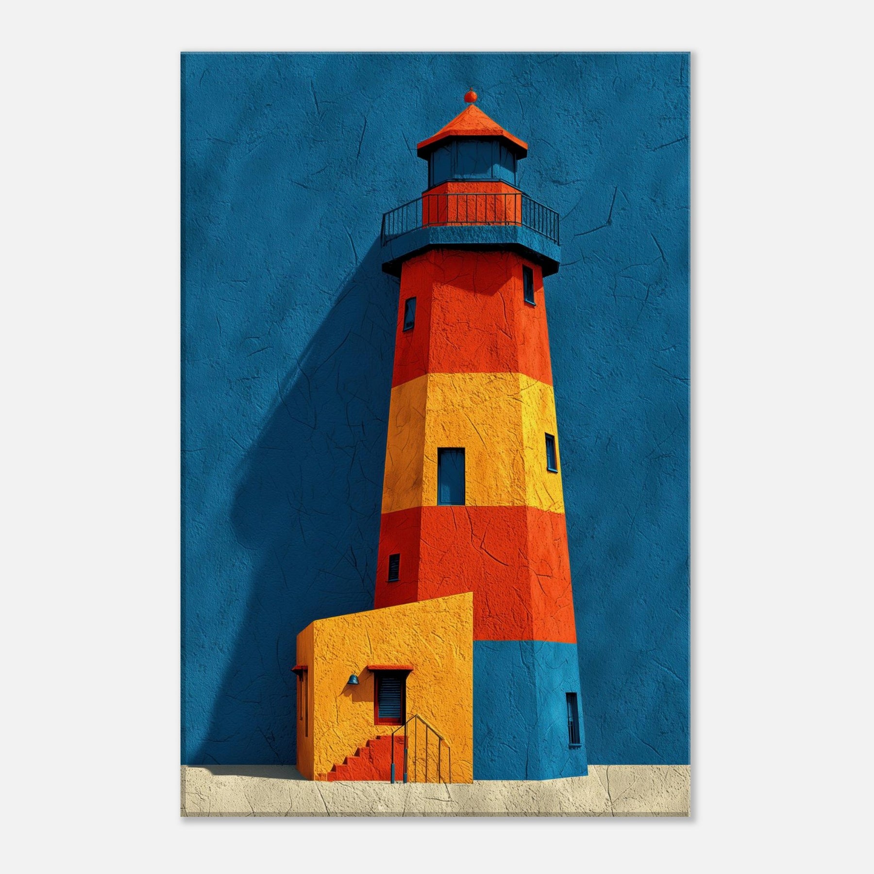 An arresting lighthouse rises in bold color against a deep blue backdrop, its silhouette refracted into blocks of red, orange, and sunlit yellow. This abstract interpretation invites the eye to wander, as if walking a harbor at dawn and feeling the tang of salt and wind. The Lighthouse, a beacon of guidance, becomes a sculptural form that anchors a living room with calm energy and architectural rhythm. Hang it where conversation meets contemplation, and let your space glow with coastal memory.