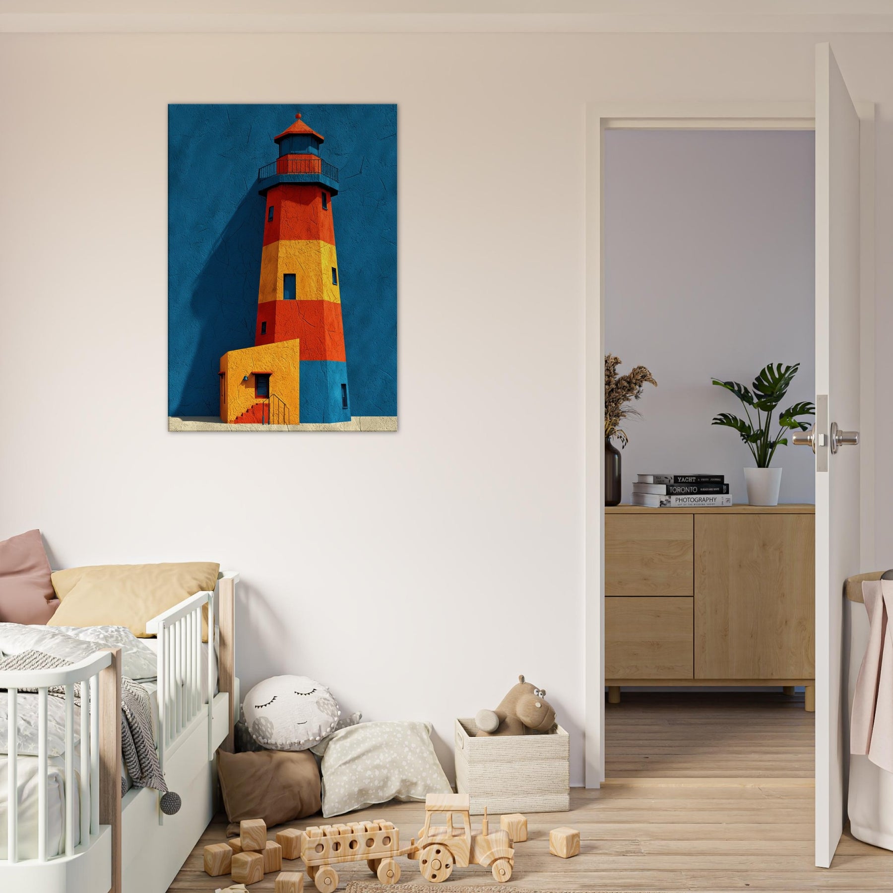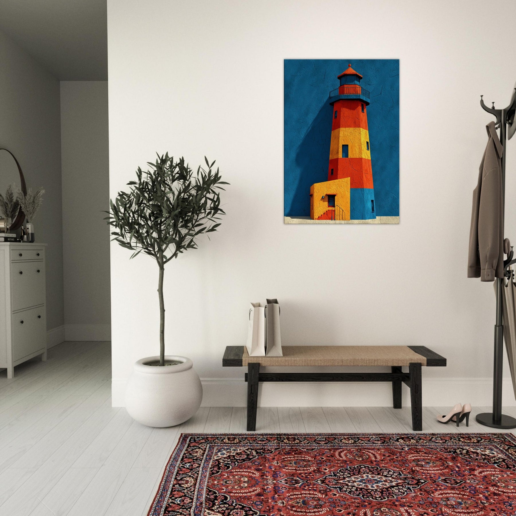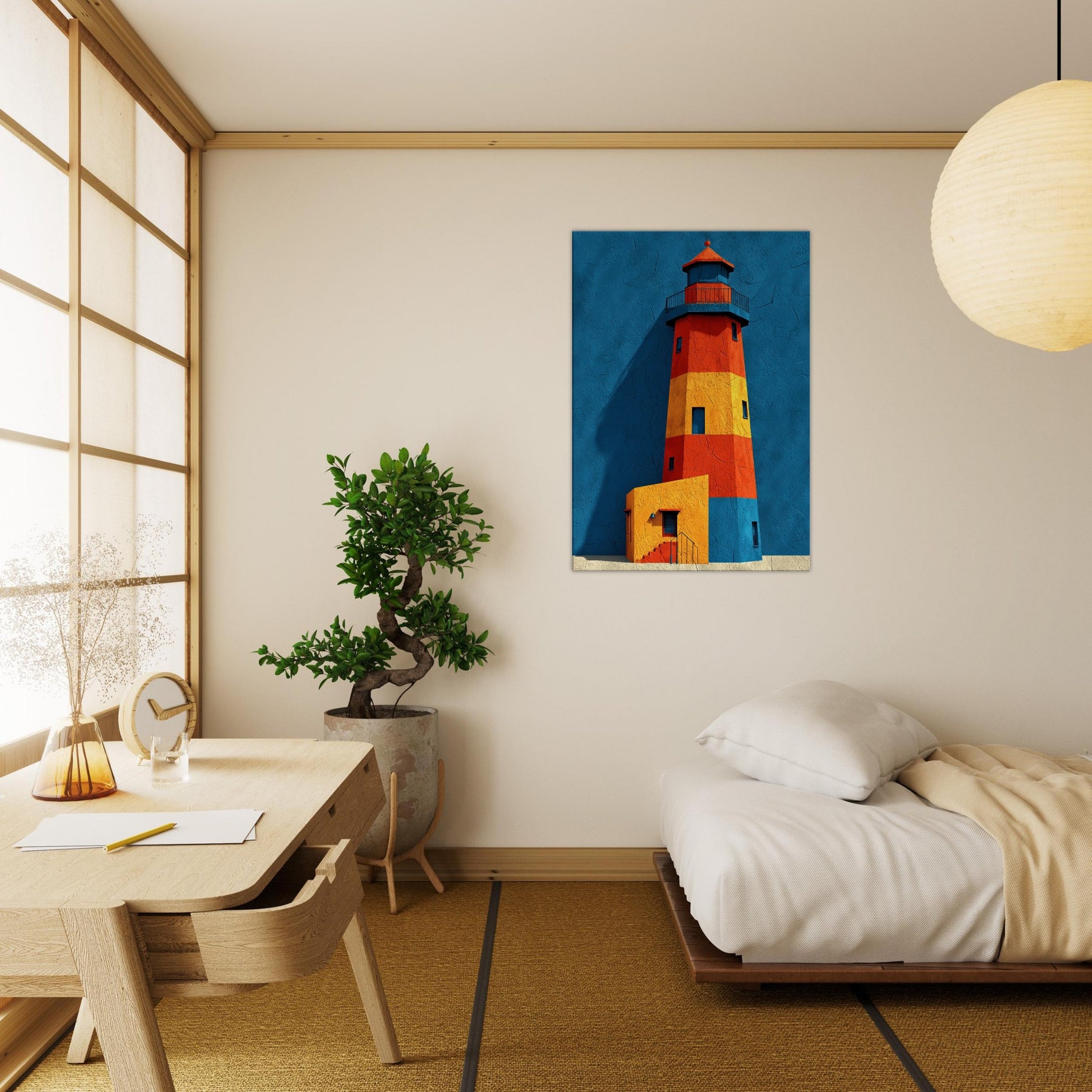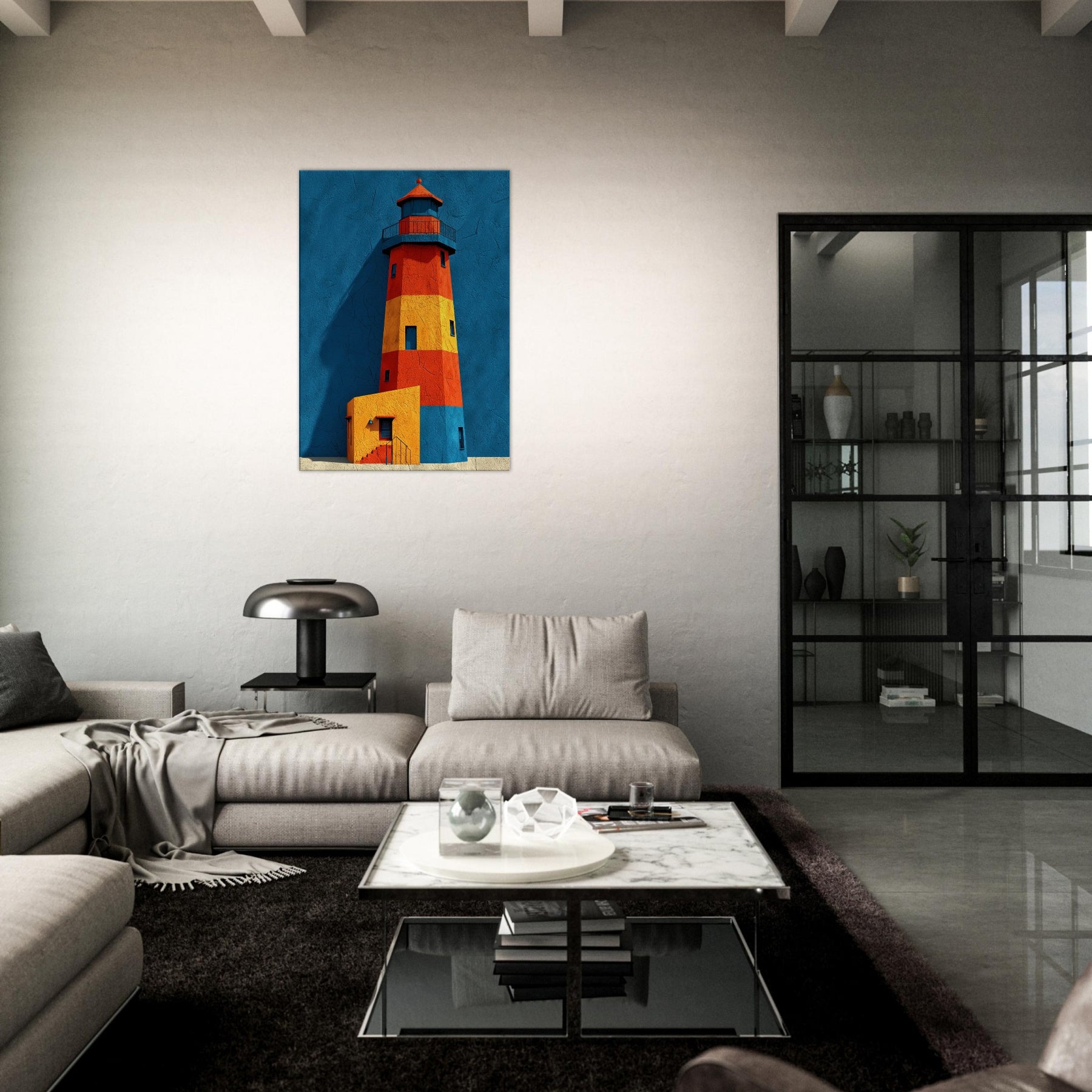 An arresting lighthouse rises in bold color against a deep blue backdrop, its silhouette refracted into blocks of red, orange, and sunlit yellow. This abstract interpretation invites the eye to wander, as if walking a harbor at dawn and feeling the tang of salt and wind. The Lighthouse, a beacon of guidance, becomes a sculptural form that anchors a living room with calm energy and architectural rhythm. Hang it where conversation meets contemplation, and let your space glow with coastal memory.