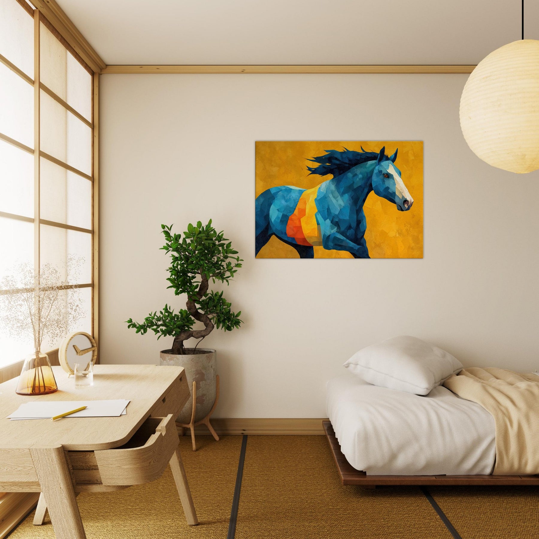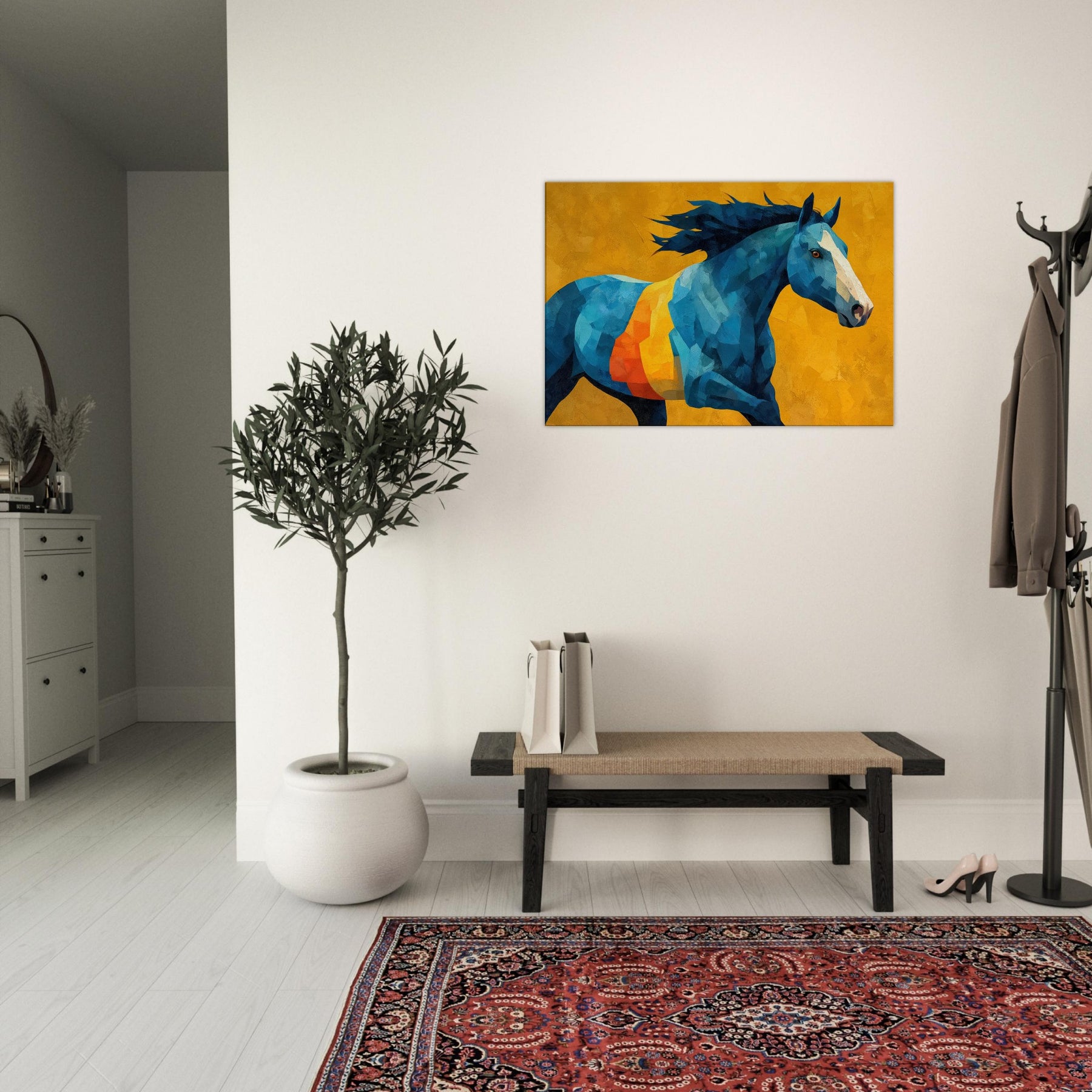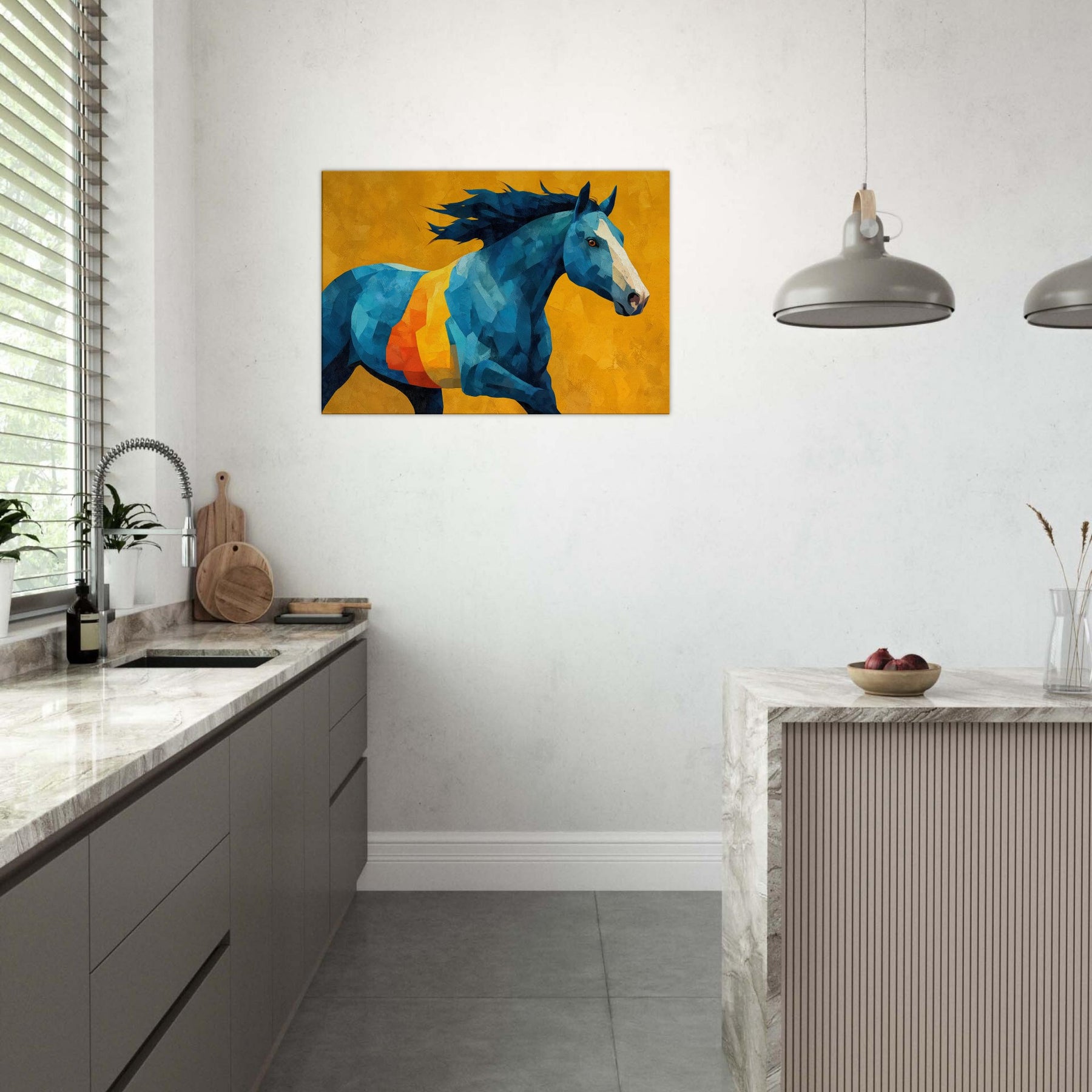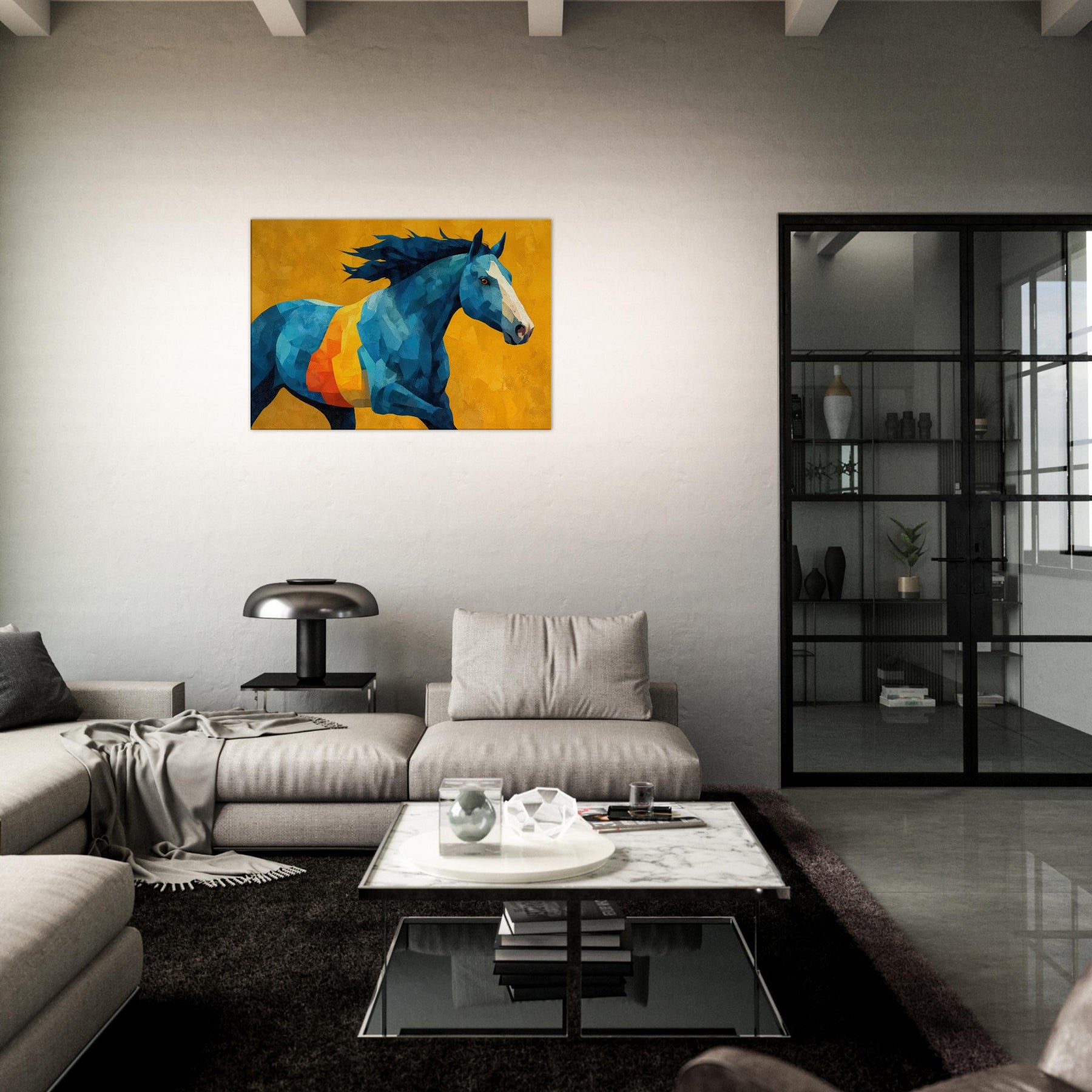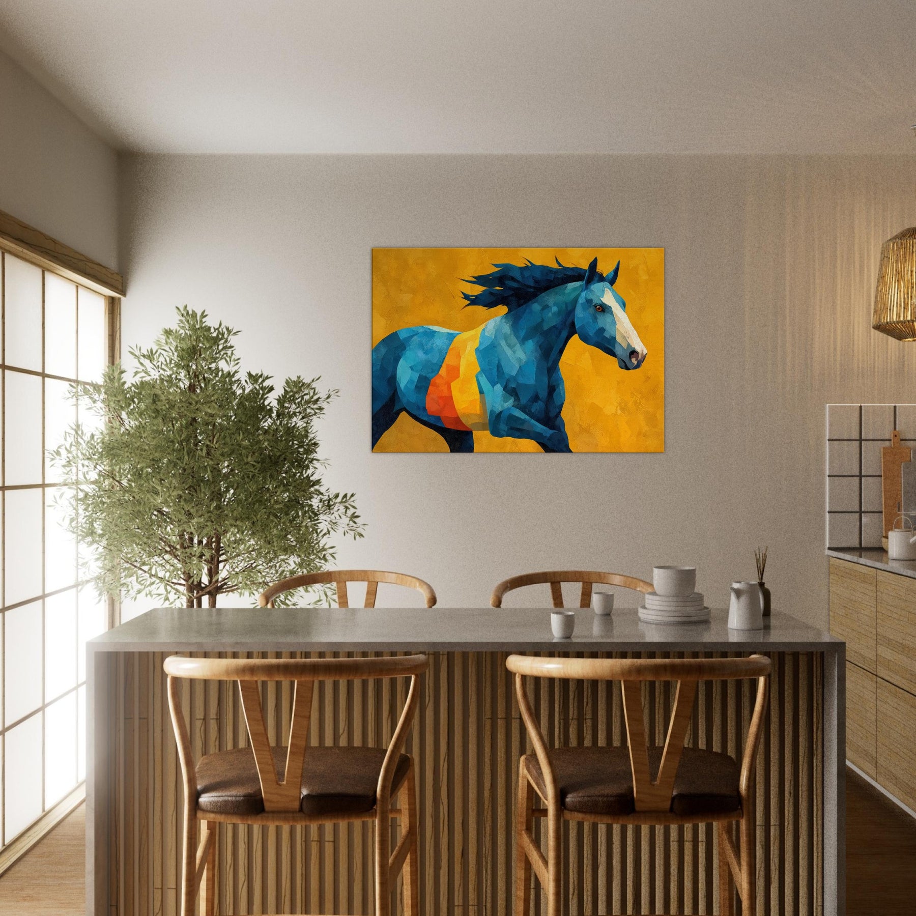 This Horse becomes a lyric of motion, its blue facets catching light and breaking into warm orange shards. Against a sunlit backdrop, it radiates energy and grace, inviting your room to breathe with every glance. The abstract form suggests speed, patience, and a wild heart, turning walls into a gallery of courage and color. Place it where daylight or lamps trace its contours, and let the space feel alive, modern, and endlessly evocative.