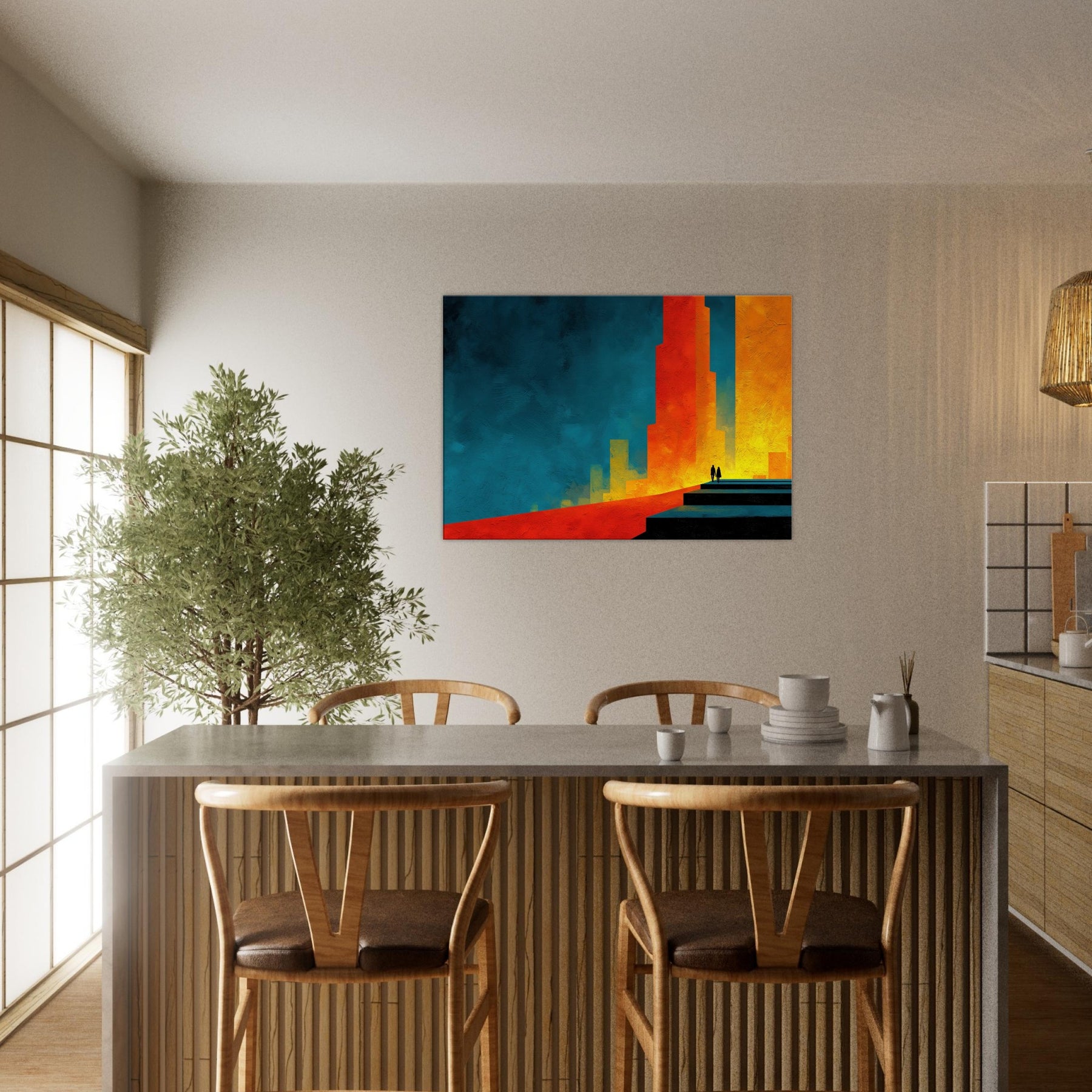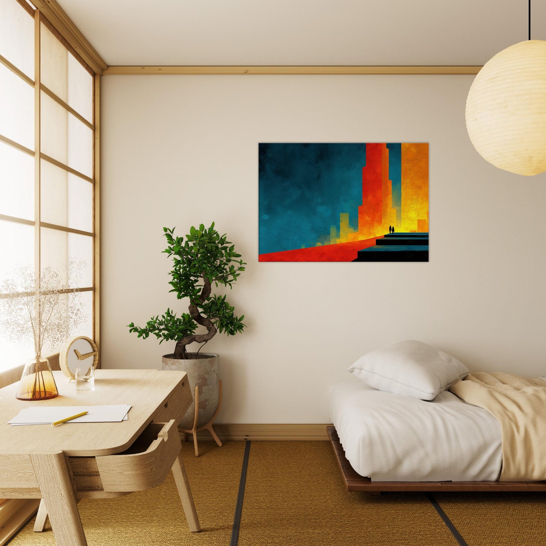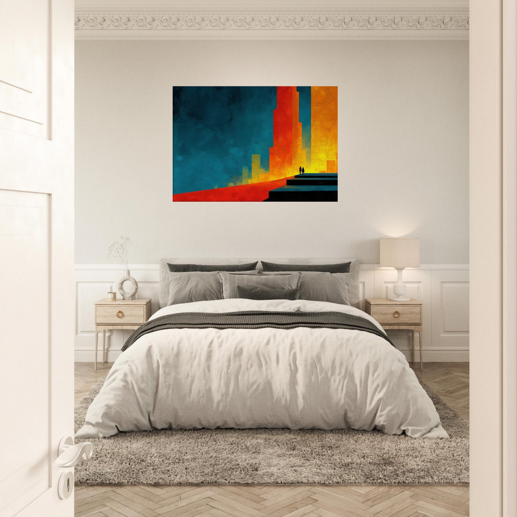 Immerse yourself in a sunrise tinged cityscape where the Burj Khalifa dissolves into a fever of color. This abstract study pools warmth and shadow, with towering coral blocks brushing a teal sky and a red ramp guiding the eye toward two silhouettes; the scene hums with quiet wonder. A living room becomes a horizon where warmth, memory, and modernity converge perfect for a statement piece that invites conversation and calm.