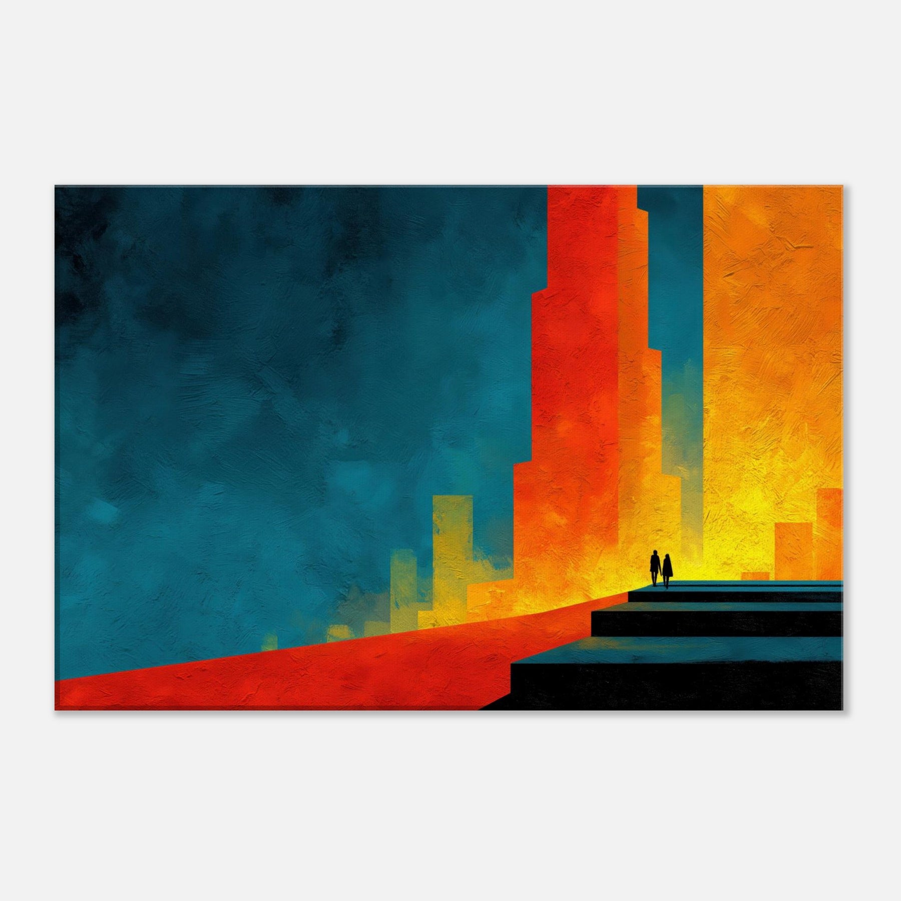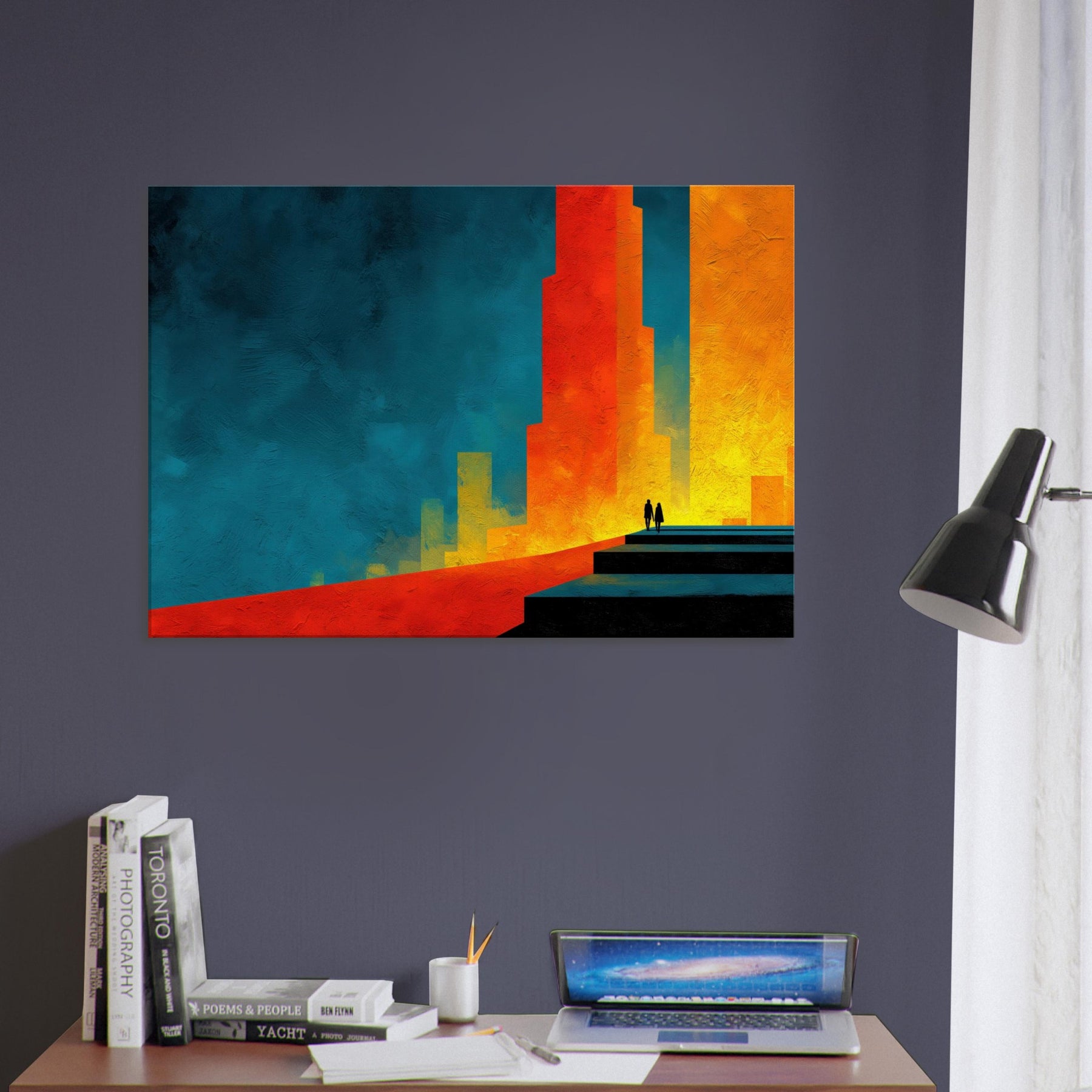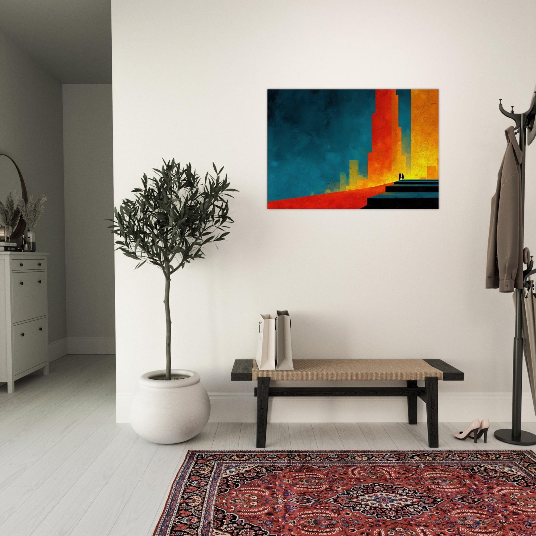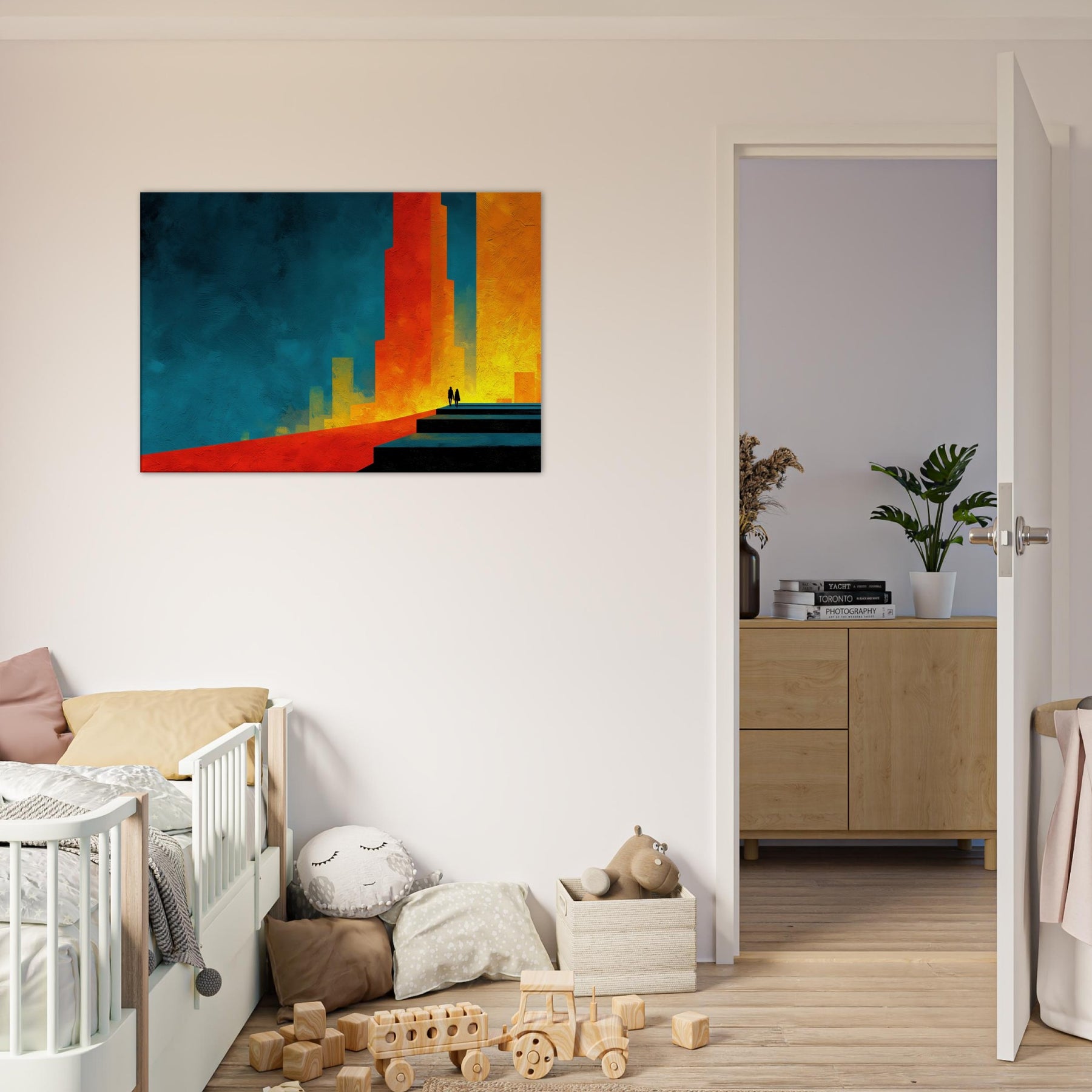 Immerse yourself in a sunrise tinged cityscape where the Burj Khalifa dissolves into a fever of color. This abstract study pools warmth and shadow, with towering coral blocks brushing a teal sky and a red ramp guiding the eye toward two silhouettes; the scene hums with quiet wonder. A living room becomes a horizon where warmth, memory, and modernity converge perfect for a statement piece that invites conversation and calm.