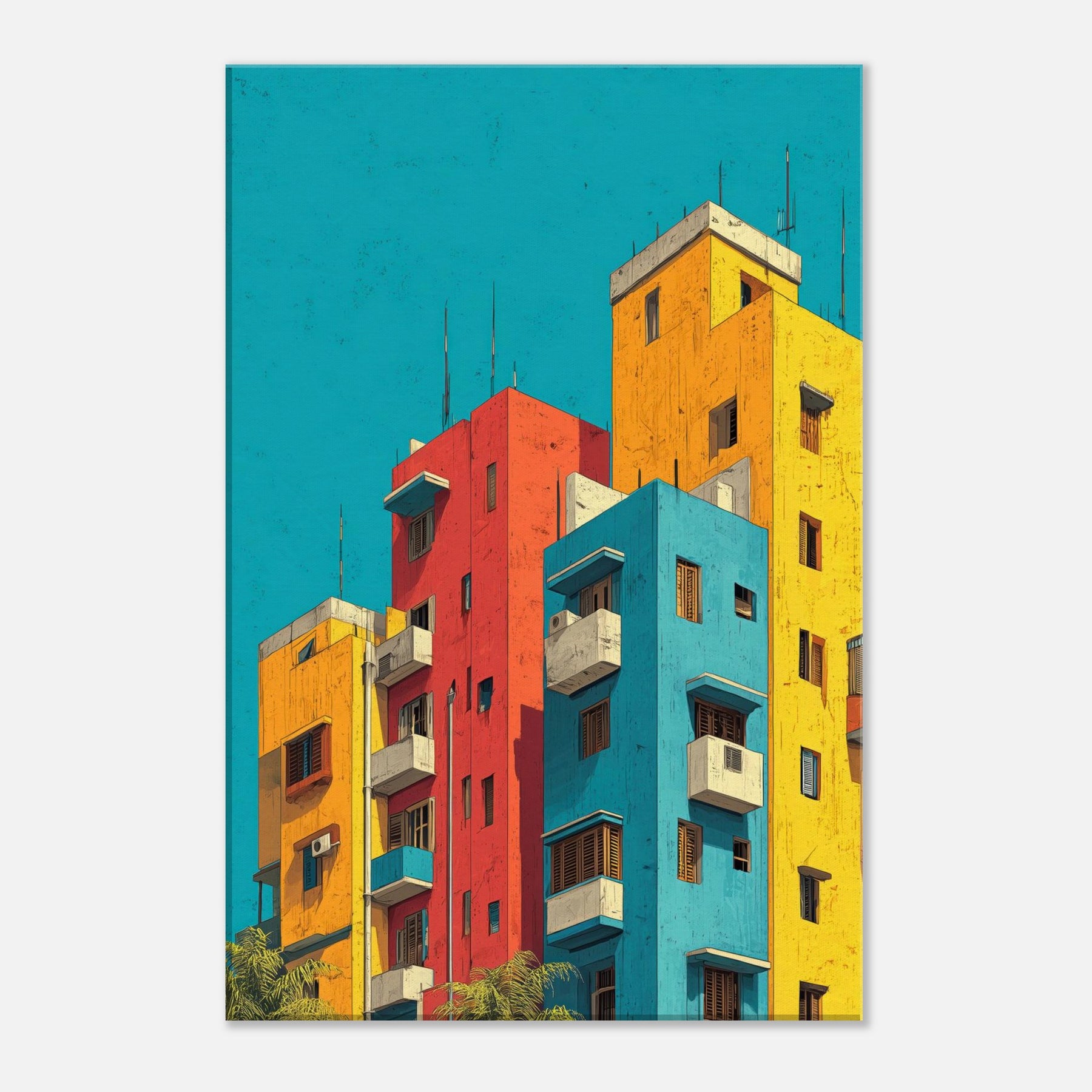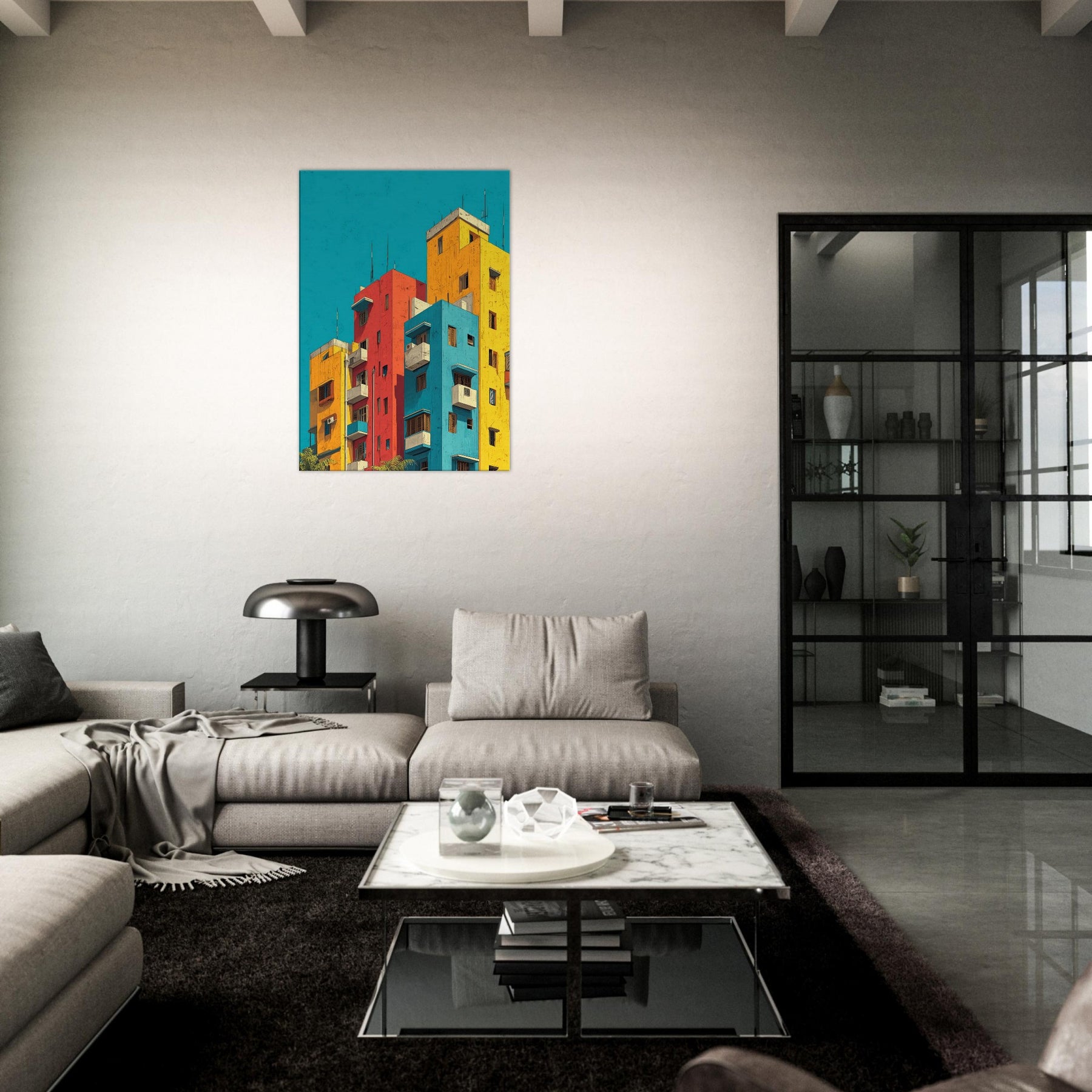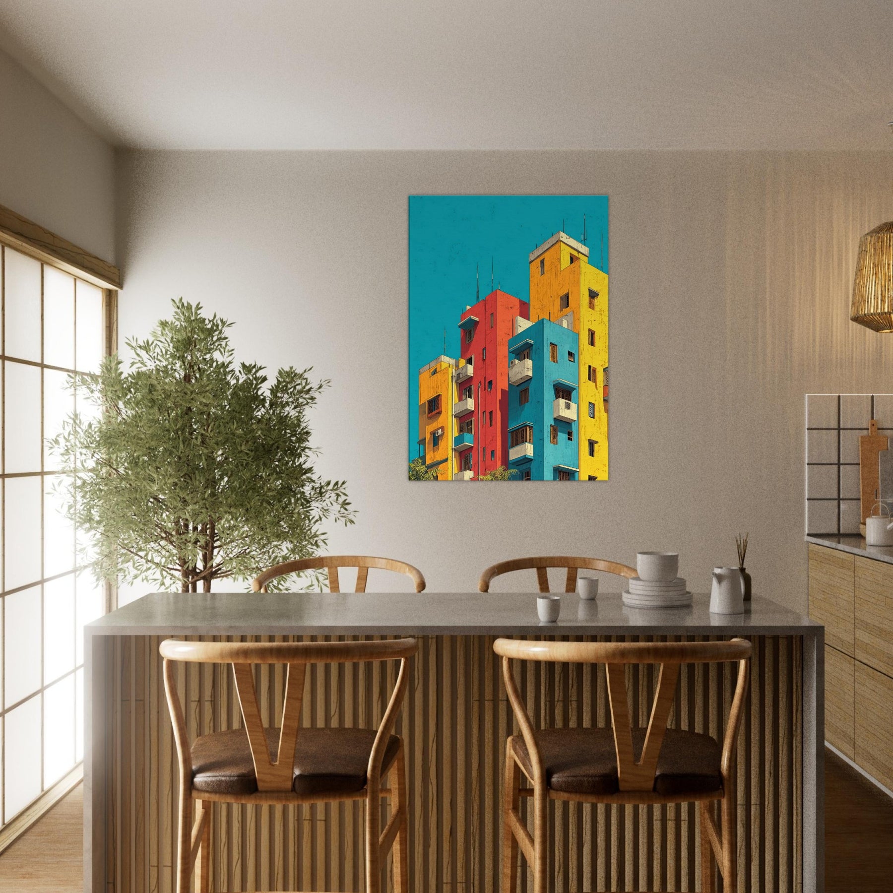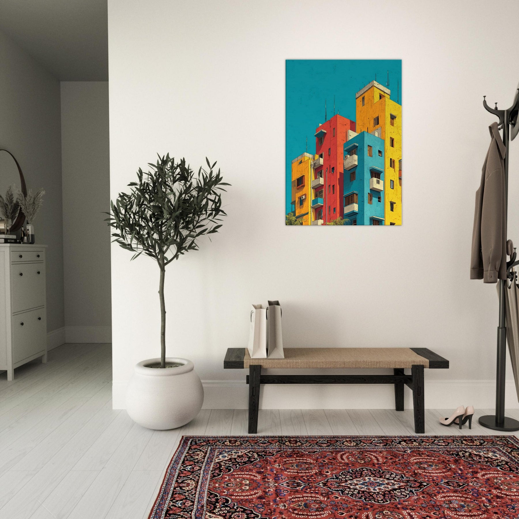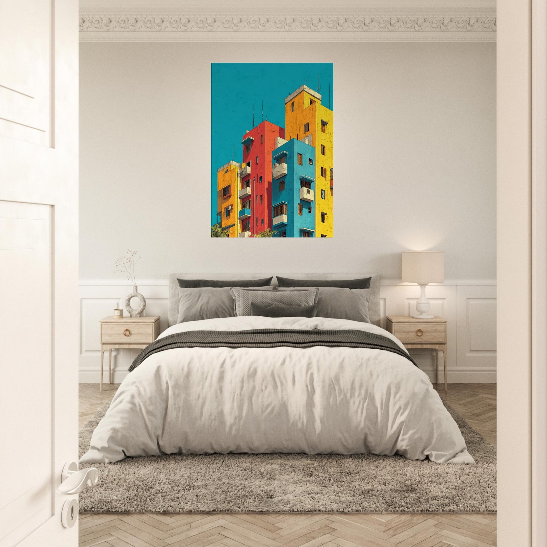 Across the canvas, Cairo unfurls in radiant blocks of sunlit yellow, electric blue, and warm red, a cityscape reimagined as a lyric of form. This piece invites the eye to wander through layered façades, catching a breeze of spice laden streets and evening light. Perfect for a living room or study, it adds kinetic energy and a sense of place without crowding the room. Let Cairo’s pulse become the mood of your home.