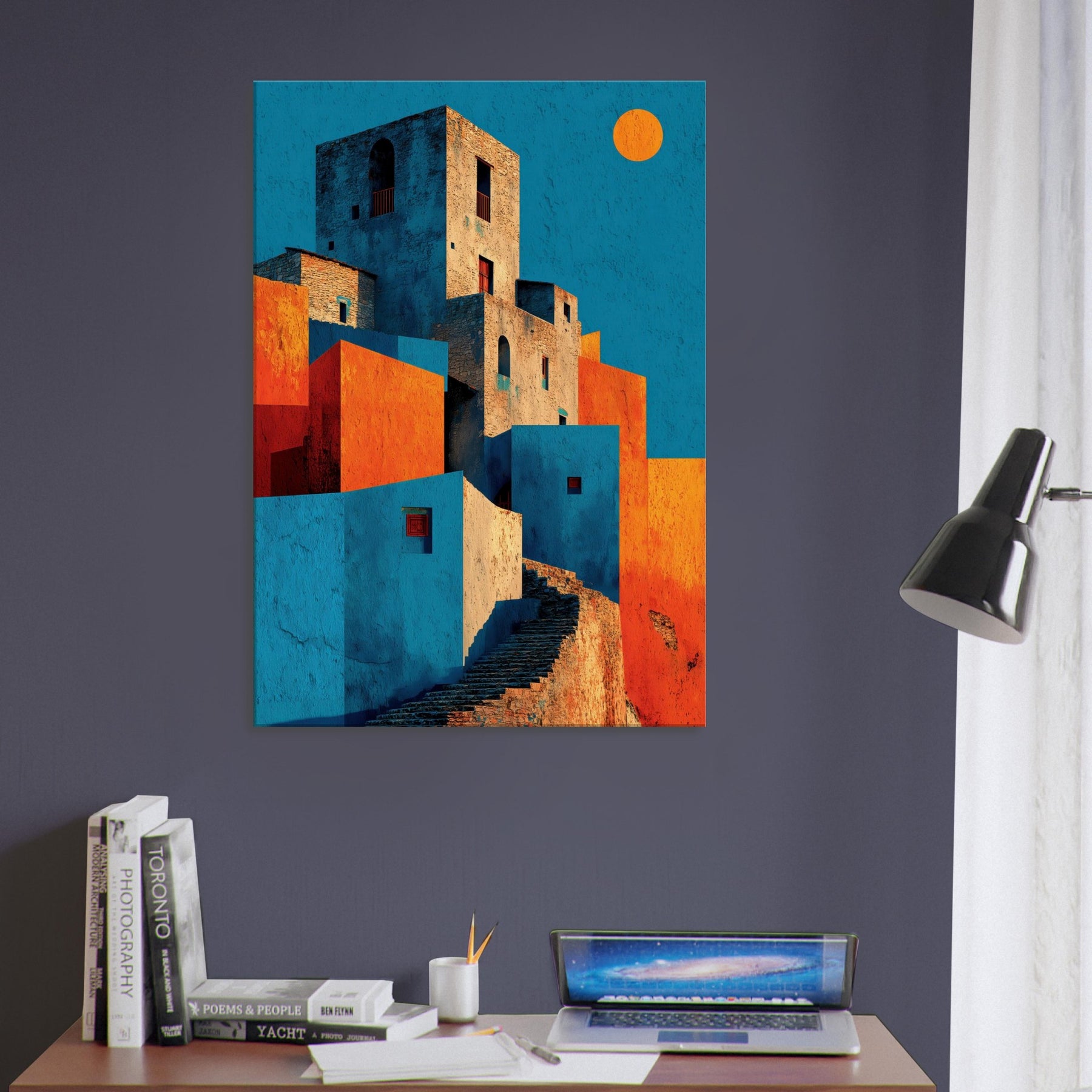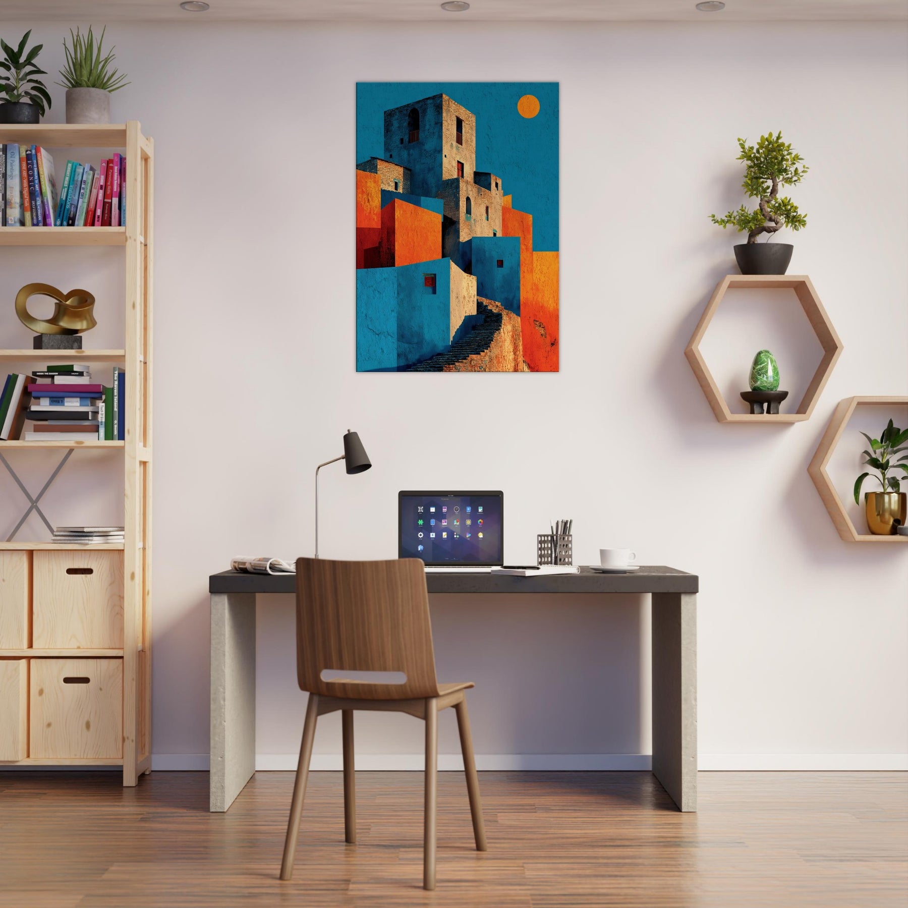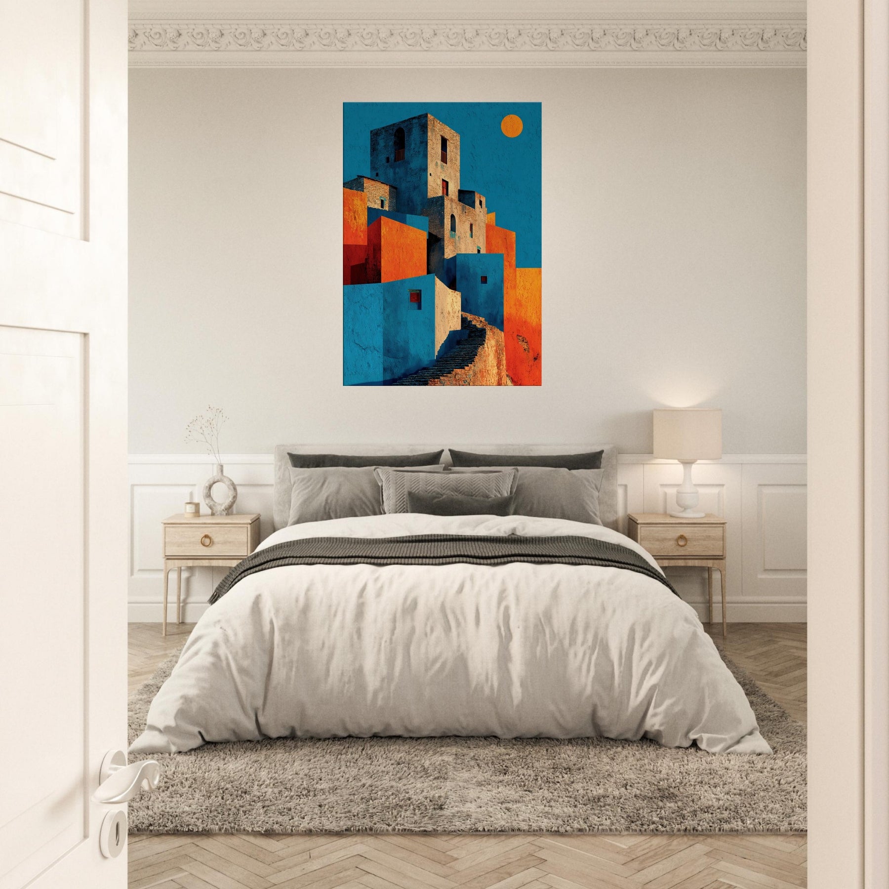 This piece centers on a Medieval Castle, reimagined in bold color blocks and fluid abstraction. Sun warmed stone meets electric blue shadows, while coral ochre walls ripple with light that shifts with the day. The composition invites the eye to wander along curving stairs and tucked windows, evoking quiet courtyards and old stone hallways. Hung in a living room or study, it adds drama without noise, painting the air with history and horizon a tactile, immersive backdrop for conversation, contemplation, and peaceful evenings.