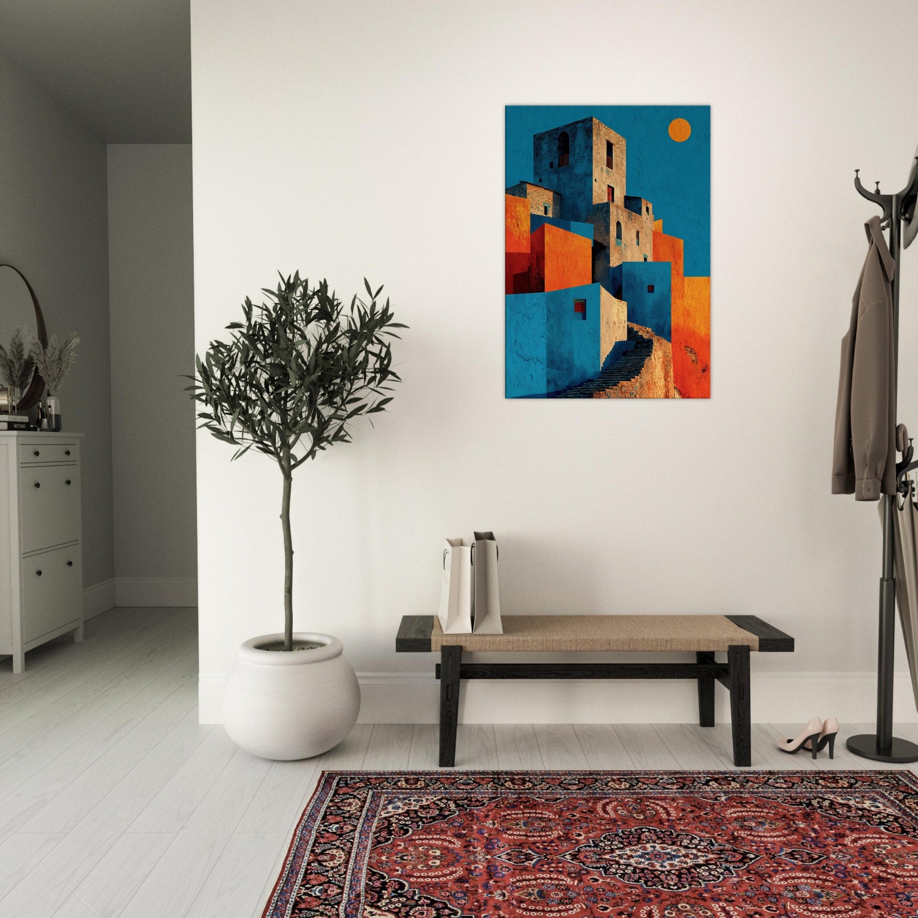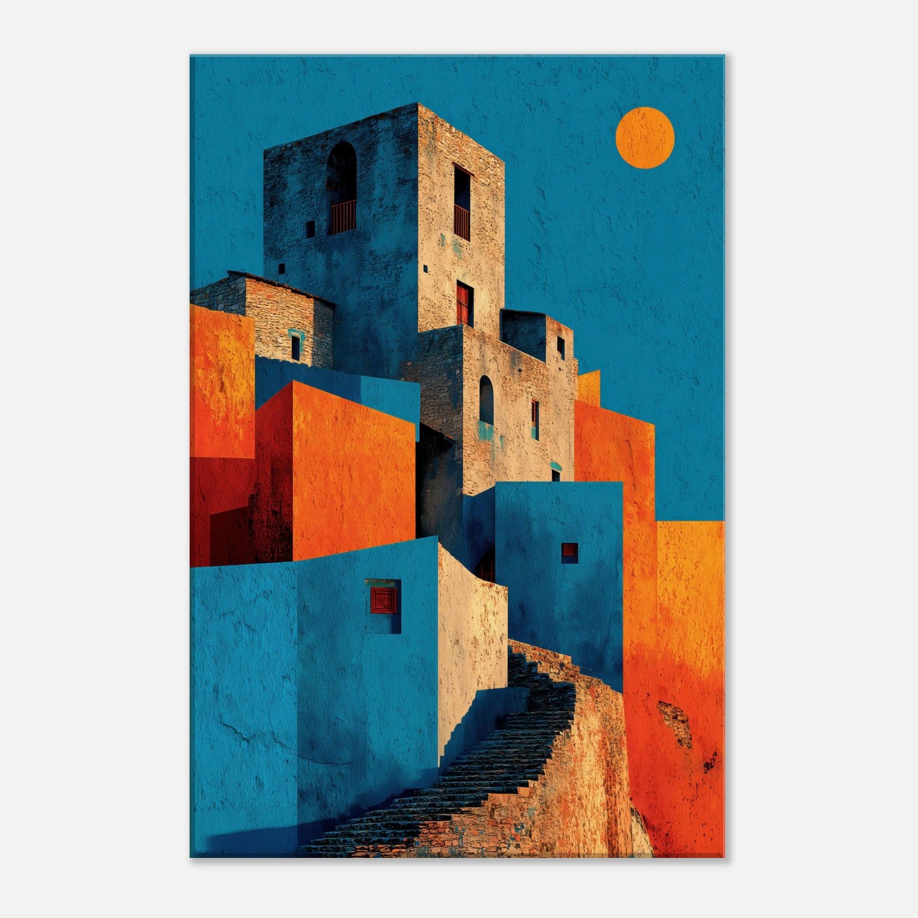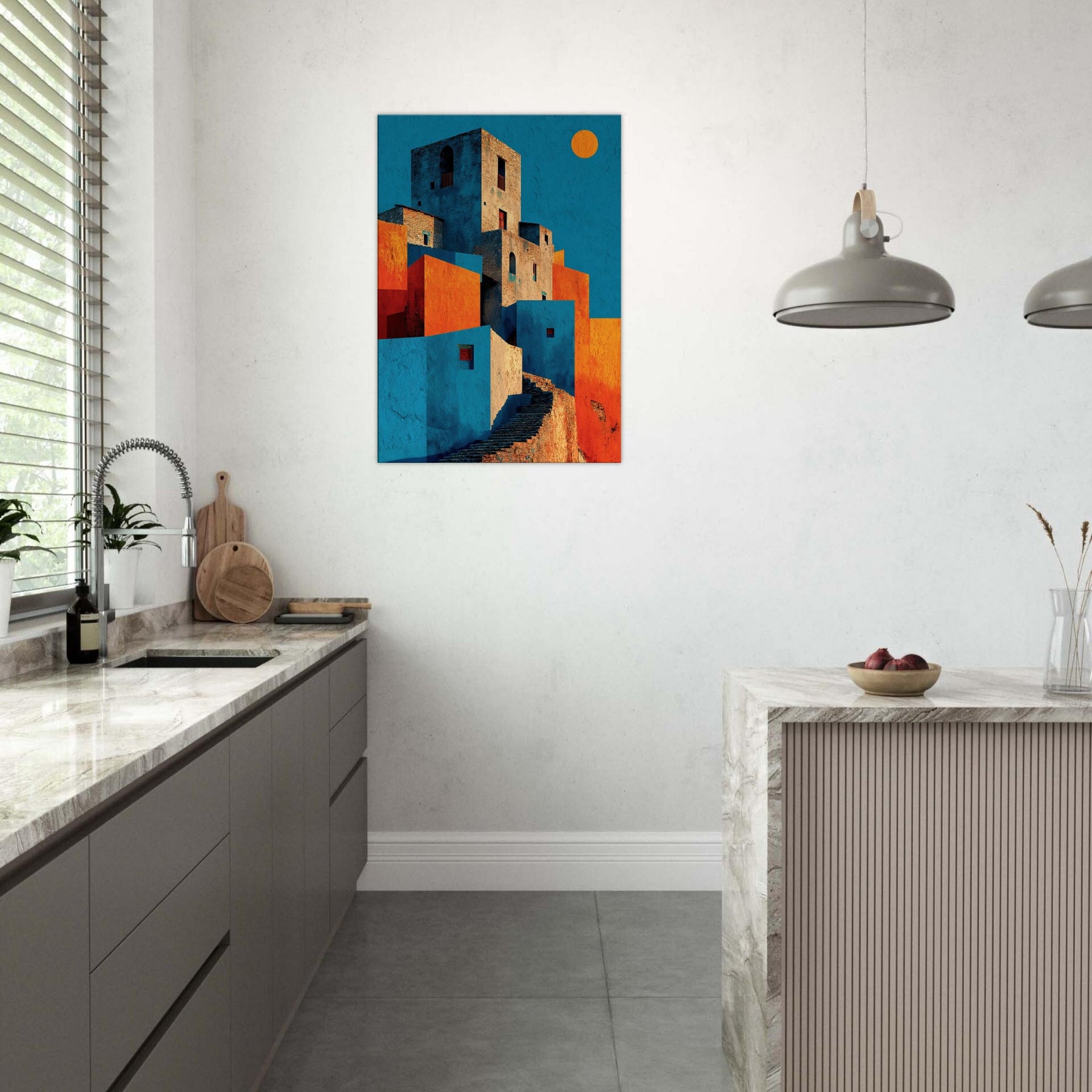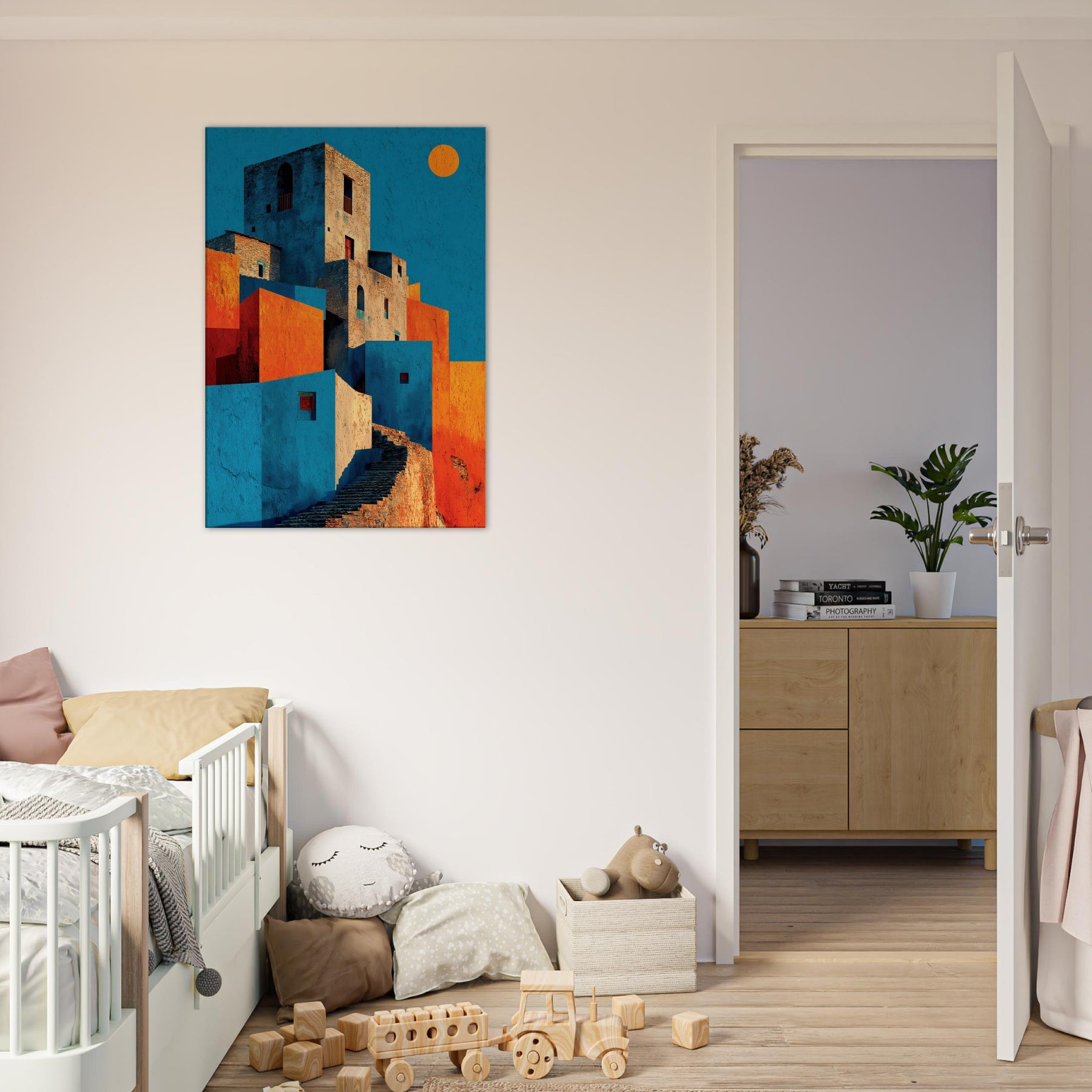 This piece centers on a Medieval Castle, reimagined in bold color blocks and fluid abstraction. Sun warmed stone meets electric blue shadows, while coral ochre walls ripple with light that shifts with the day. The composition invites the eye to wander along curving stairs and tucked windows, evoking quiet courtyards and old stone hallways. Hung in a living room or study, it adds drama without noise, painting the air with history and horizon a tactile, immersive backdrop for conversation, contemplation, and peaceful evenings.